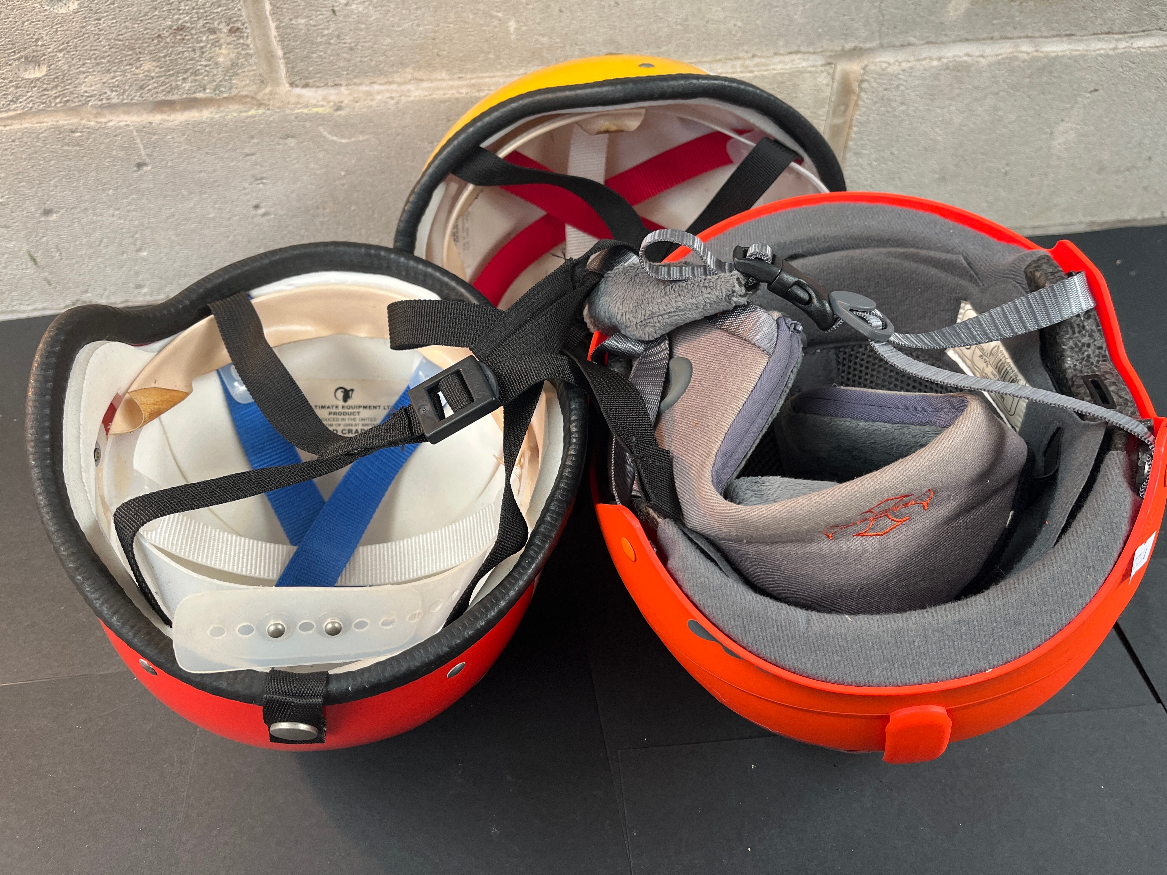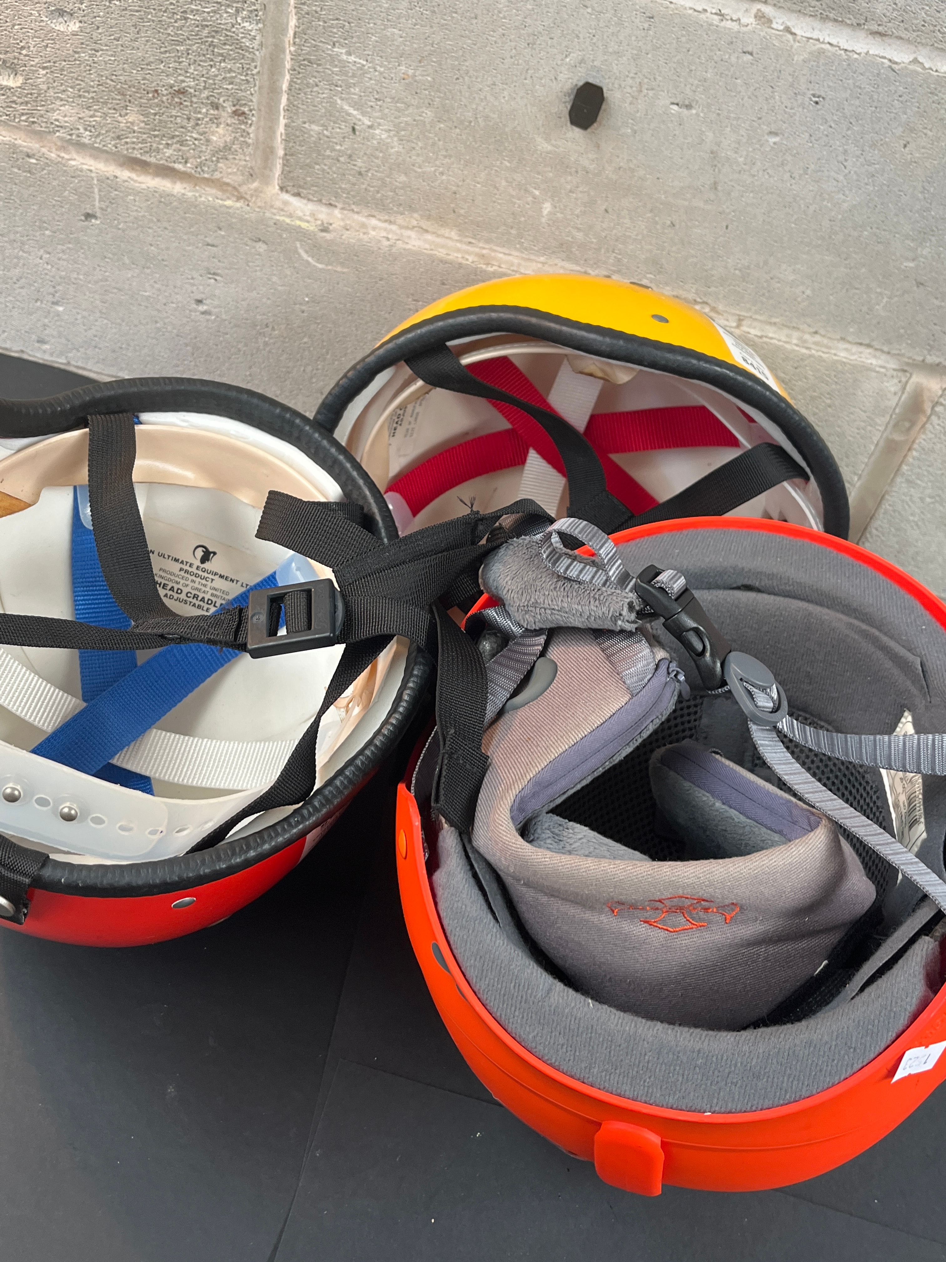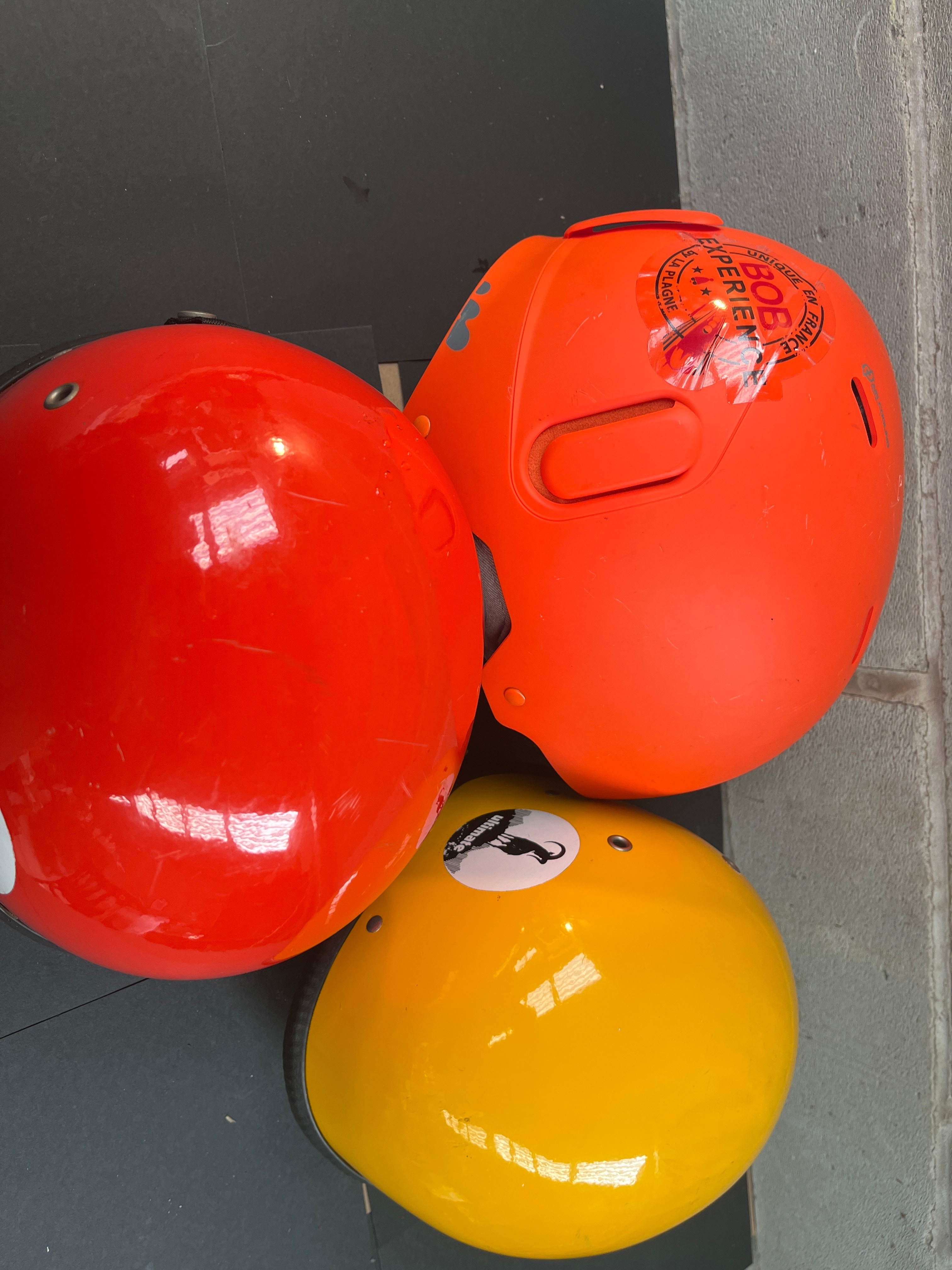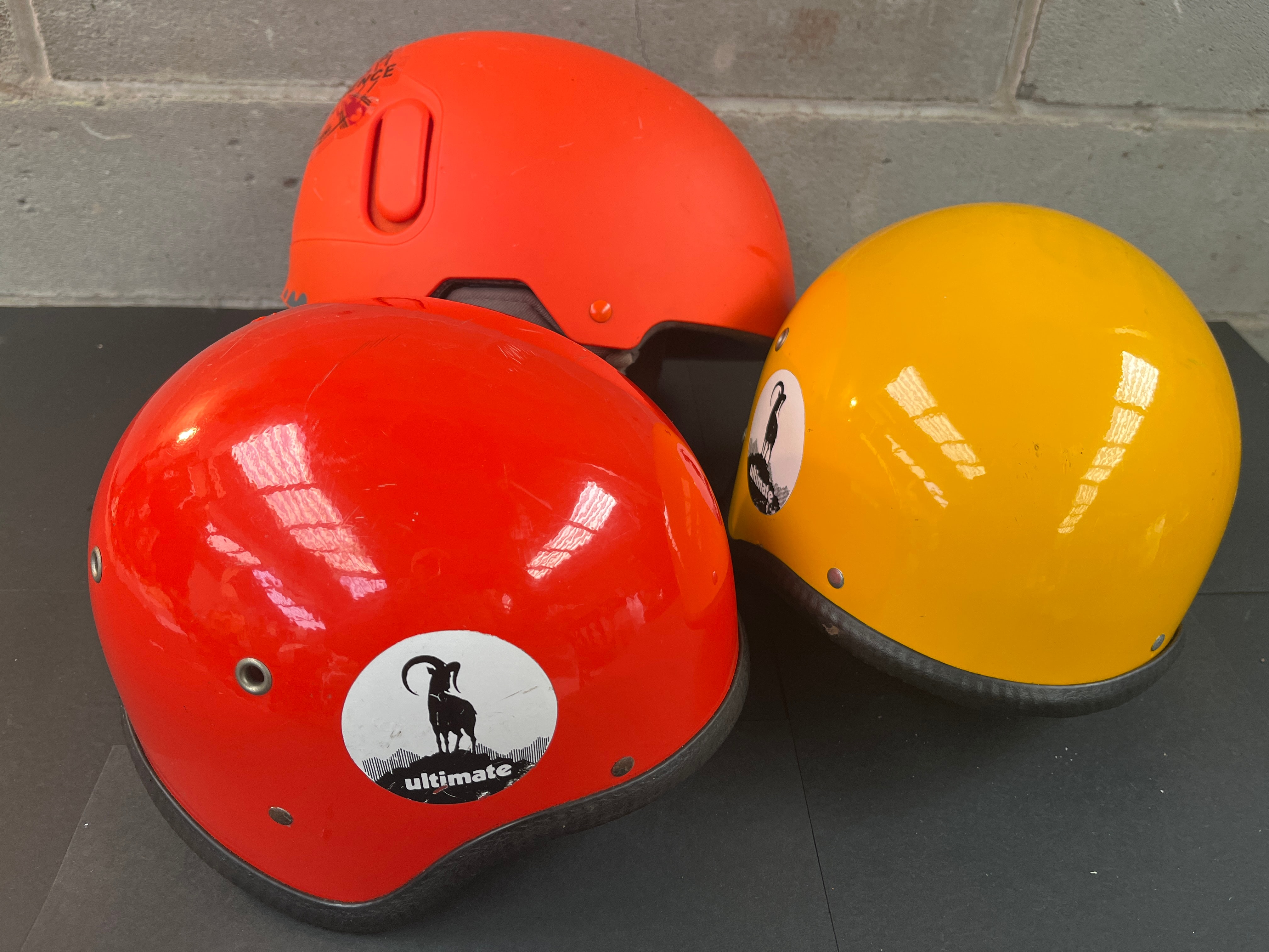 A lot of three modern sports or recreational helmets, consisting of one glossy red, one glossy yellow, and one matte orange example. The helmets are constructed from hard plastic or composite outer shells with various textile and plastic interior components including padding and adjustable straps. The red helmet features a circular white sticker with a black silhouette of an ibex-like animal and the word “ultimate,” with an interior label also visible reading “ULTIMATE EQUIPMENT LTD” and “HEAD CRACKER.” The yellow helmet bears a similar circular white sticker depicting a stylized head with a mustache. The orange helmet has several stickers, most prominently a red one with partially legible white text, including “BOB EXPERIENCE.”