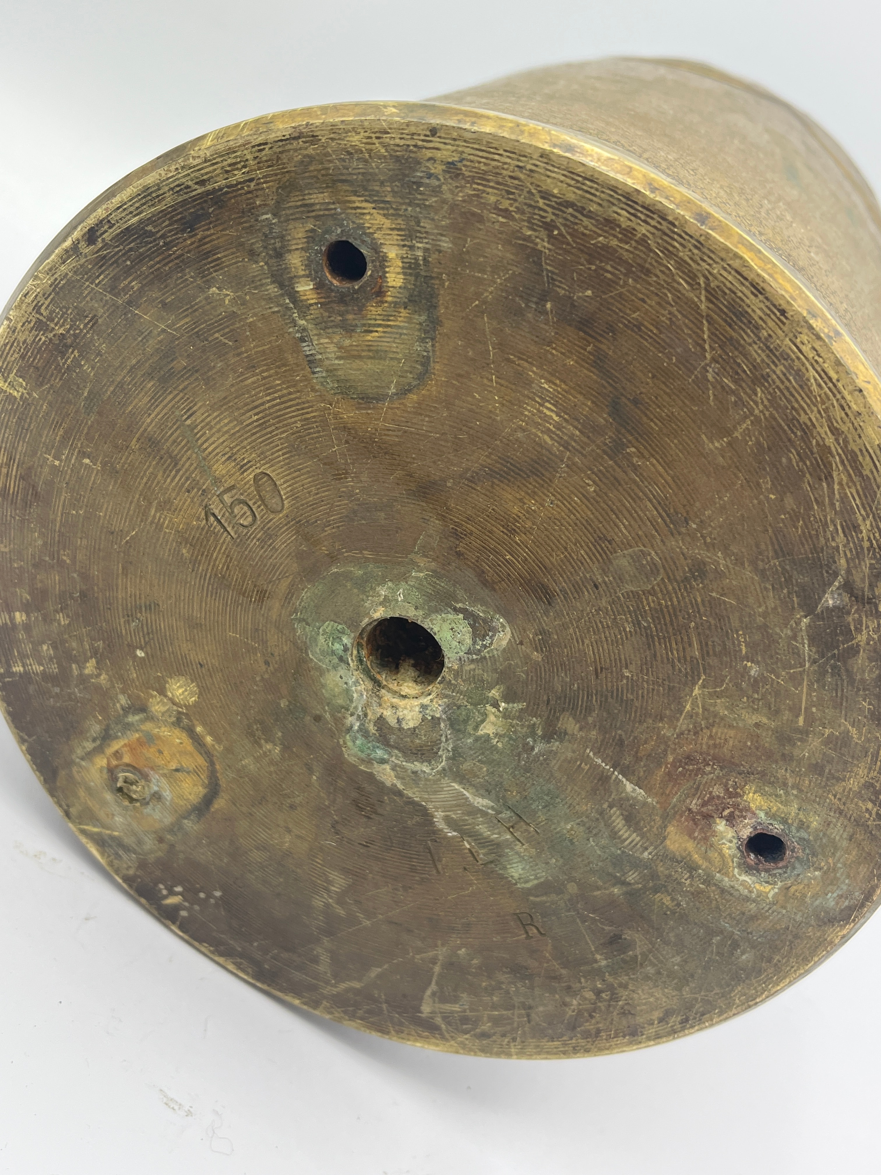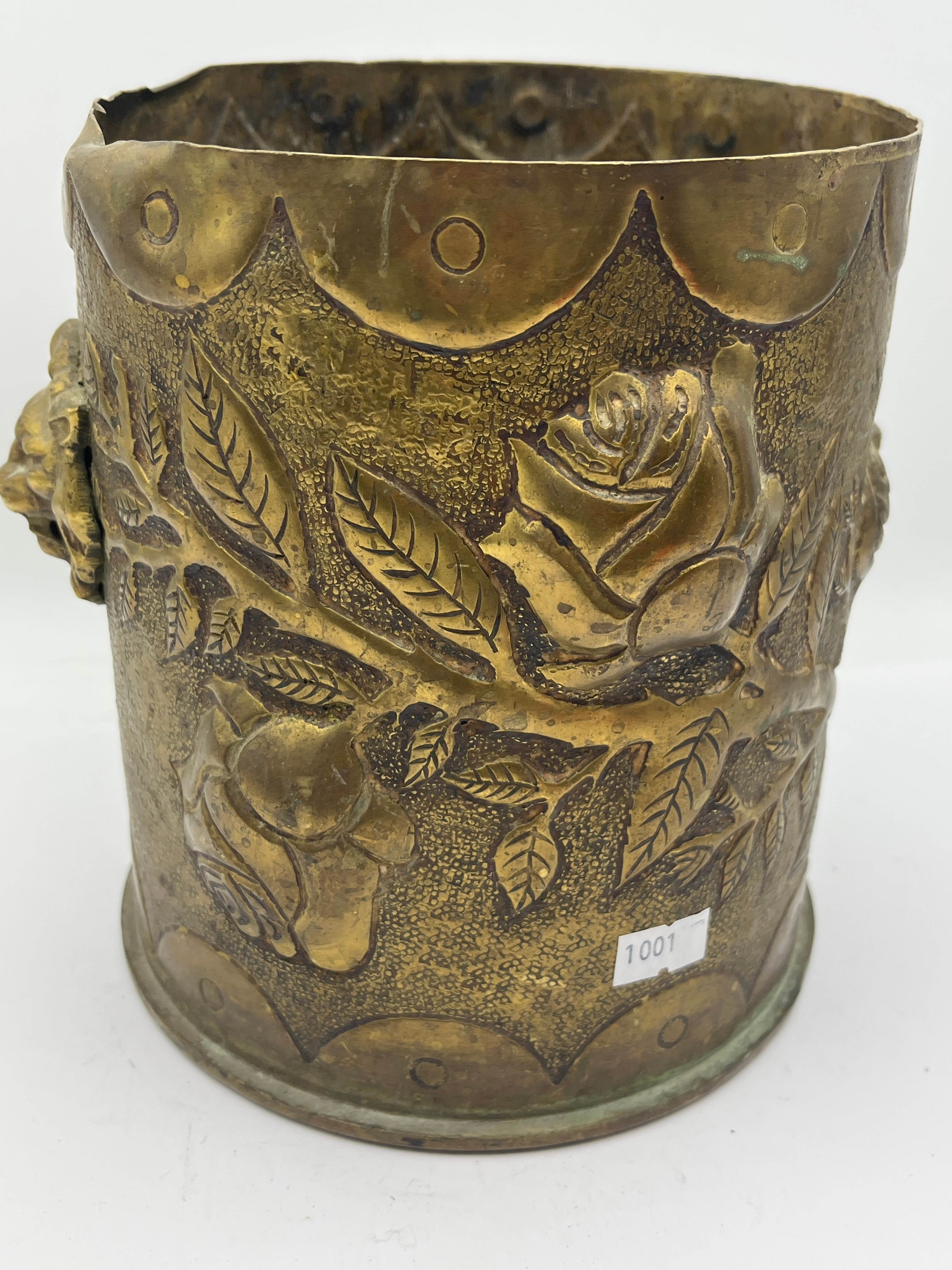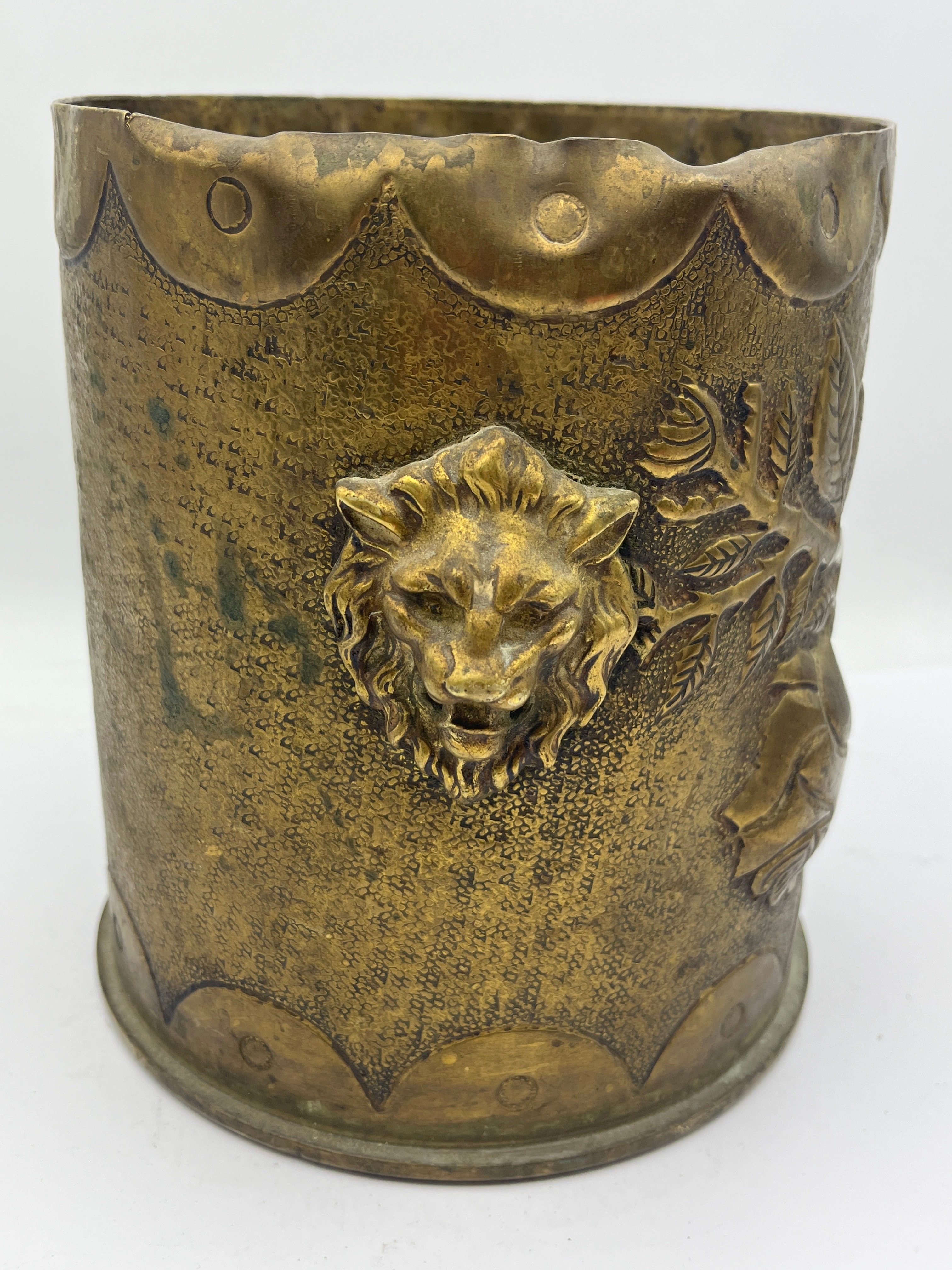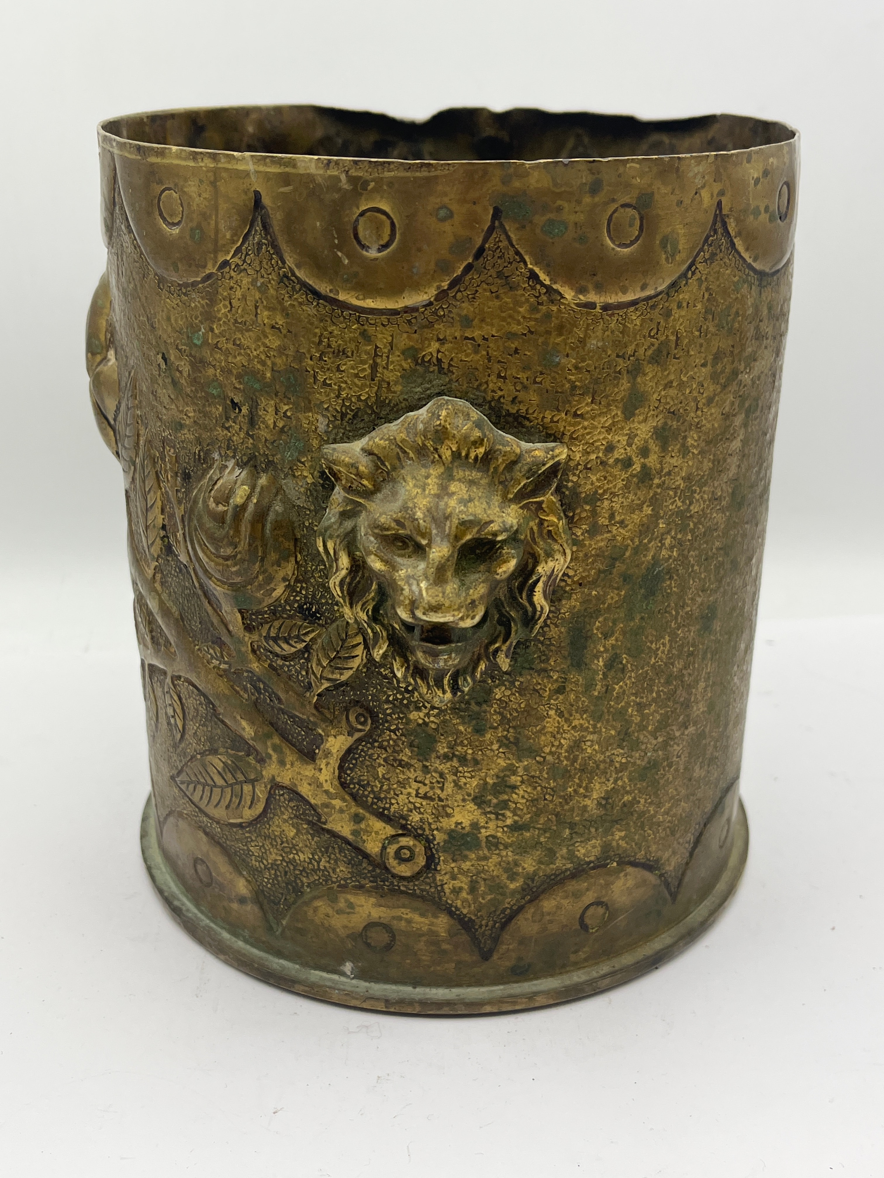 A cylindrical brass or bronze vessel, likely intended as a planter or jardiniere, featuring extensive repoussé or embossed decoration. The body is adorned with prominent lion masks in high relief, interspersed with naturalistic rose vines and blossoms set against a textured, stippled background. The upper rim is finished with a scalloped band featuring simple circular motifs. The base is marked “150” and includes three drilled holes, with additional faint, partially illegible markings visible.