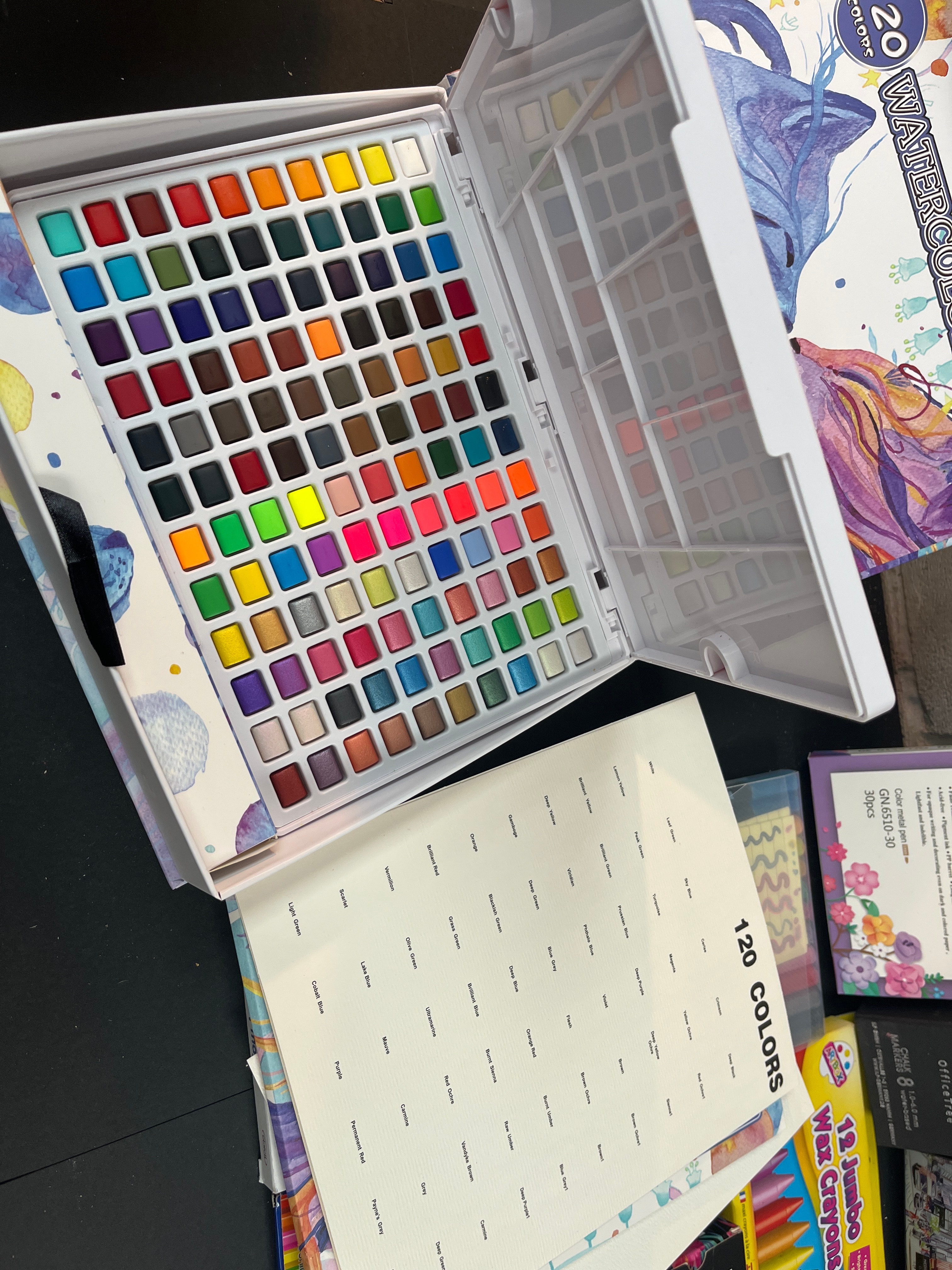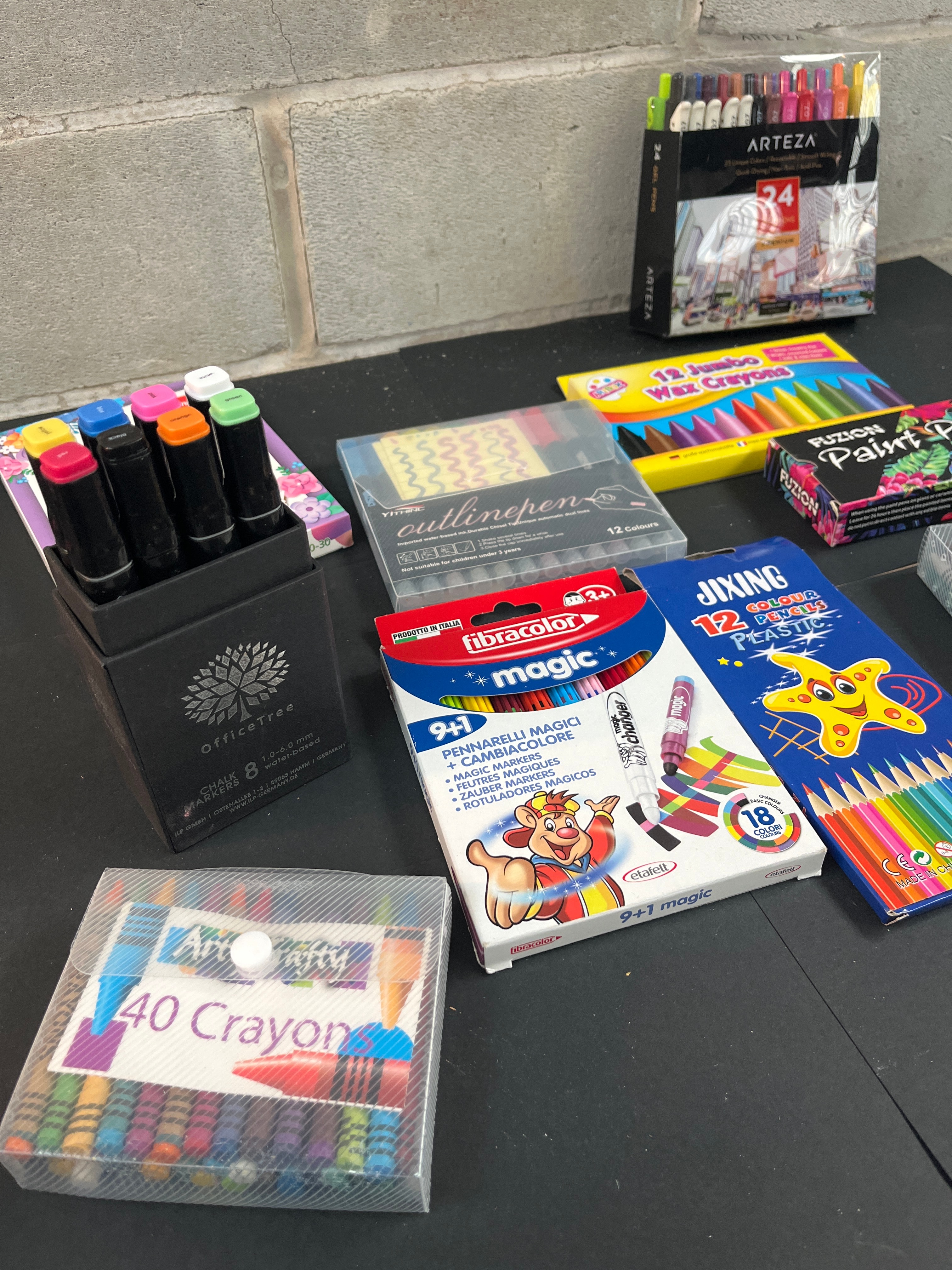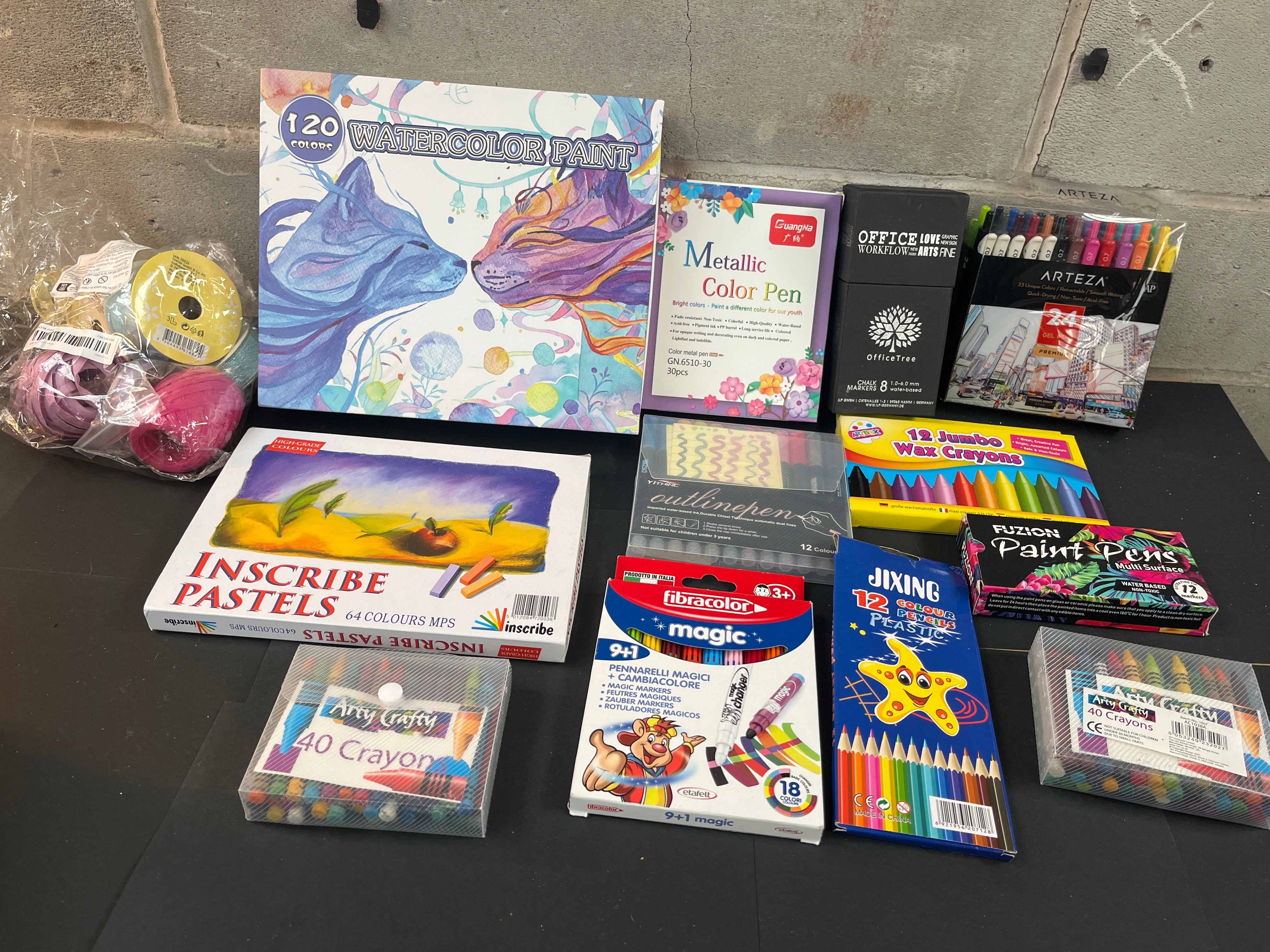 A diverse collection of contemporary, mass-produced art and craft supplies. The lot includes a 120-color watercolor paint set (observed open to reveal its full palette and a comprehensive color chart), a 64-color set of Inscribe pastels, and two sets of 40 Arty Crafty crayons. Also present are a 12-color set of Chaoguangyi metallic pens, 8 OfficeTree chalk markers, a 12-color set of Cullinepen fineliner pens, 12 jumbo wax crayons, a 12-color set of Fuzion multi-surface paint pens, 12 Jixing plastic pencils, a 24-count set of Arteza markers, and a Fibracolor 9+1 set of “PENNARRELLI MAGICI CAMBIACOLORE” (Italian for ‘Magic color-changing markers’). Materials are primarily plastic, cardboard, and various artistic pigments or inks. Packaging text is predominantly in English, with Italian, French, German, and Spanish visible on certain products.