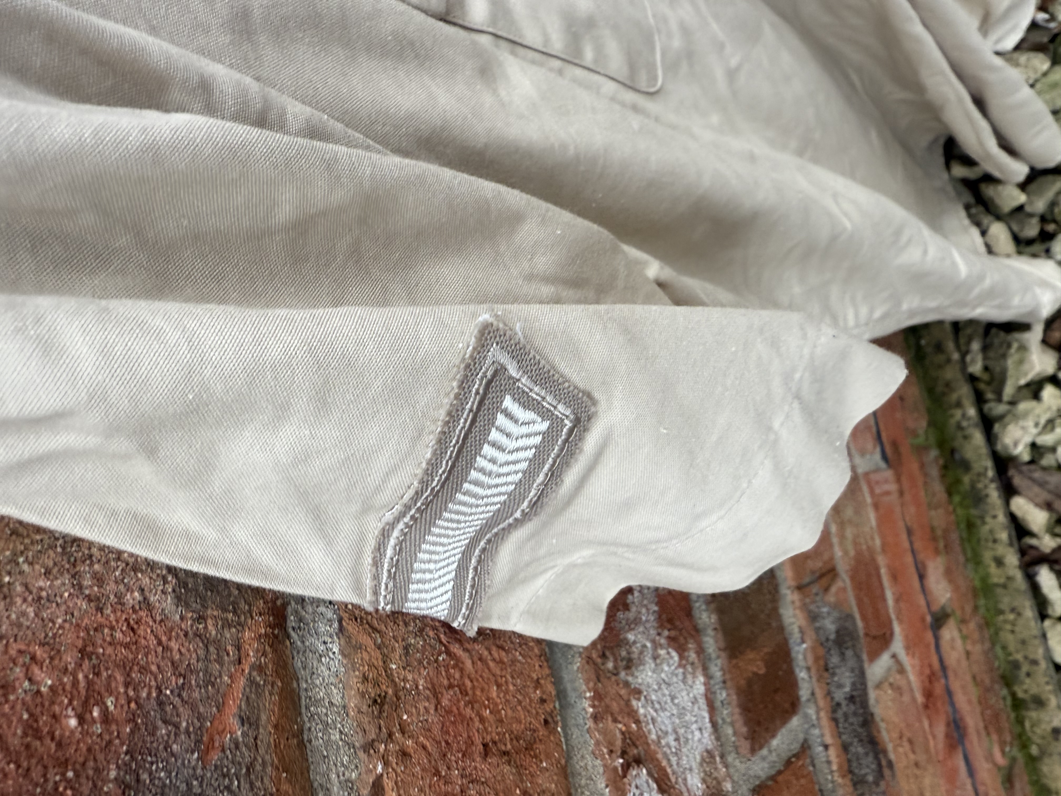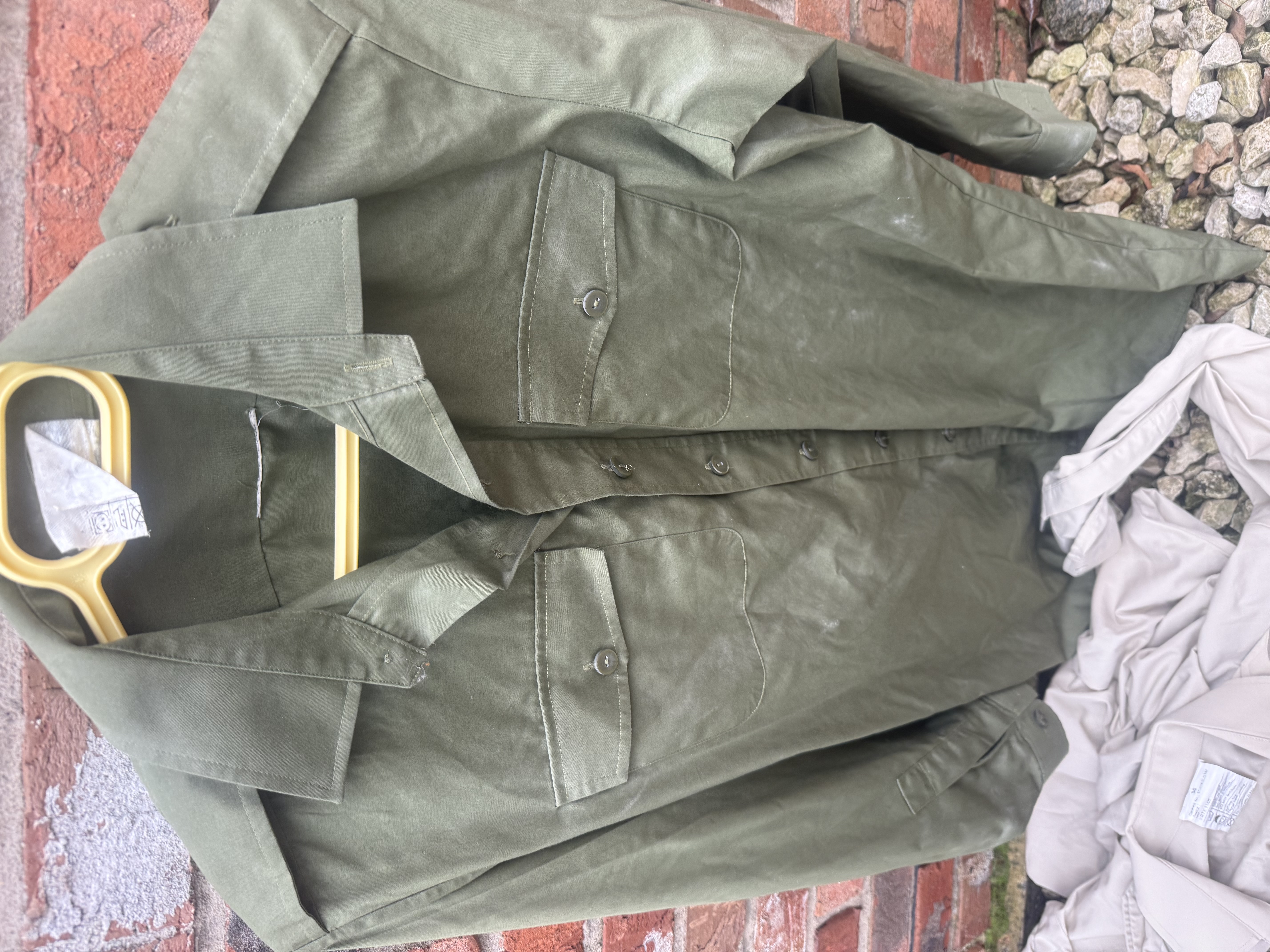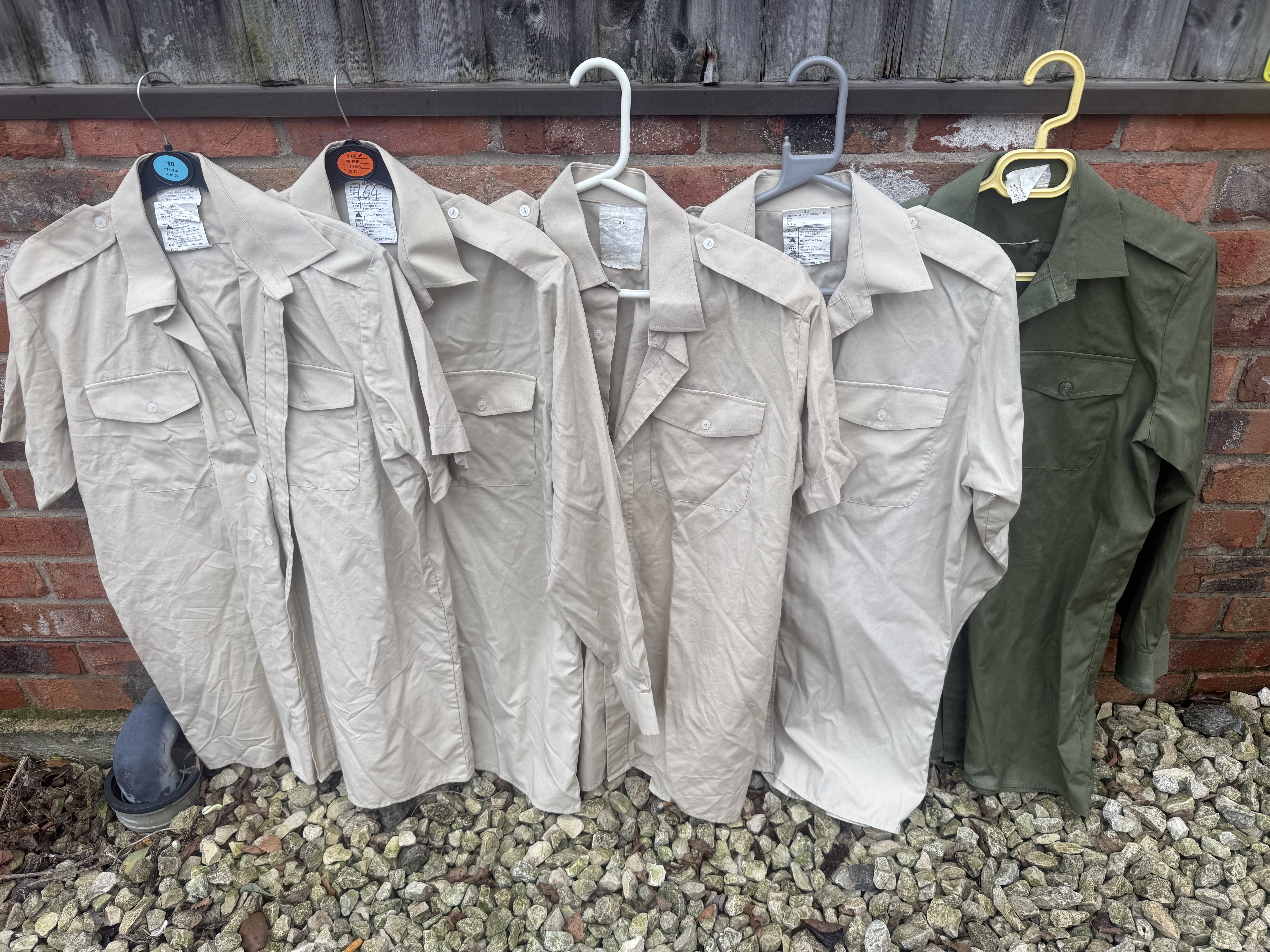** A group of five vintage military-style shirts, including four short-sleeve khaki shirts and one long-sleeve olive green shirt, all with front pockets.