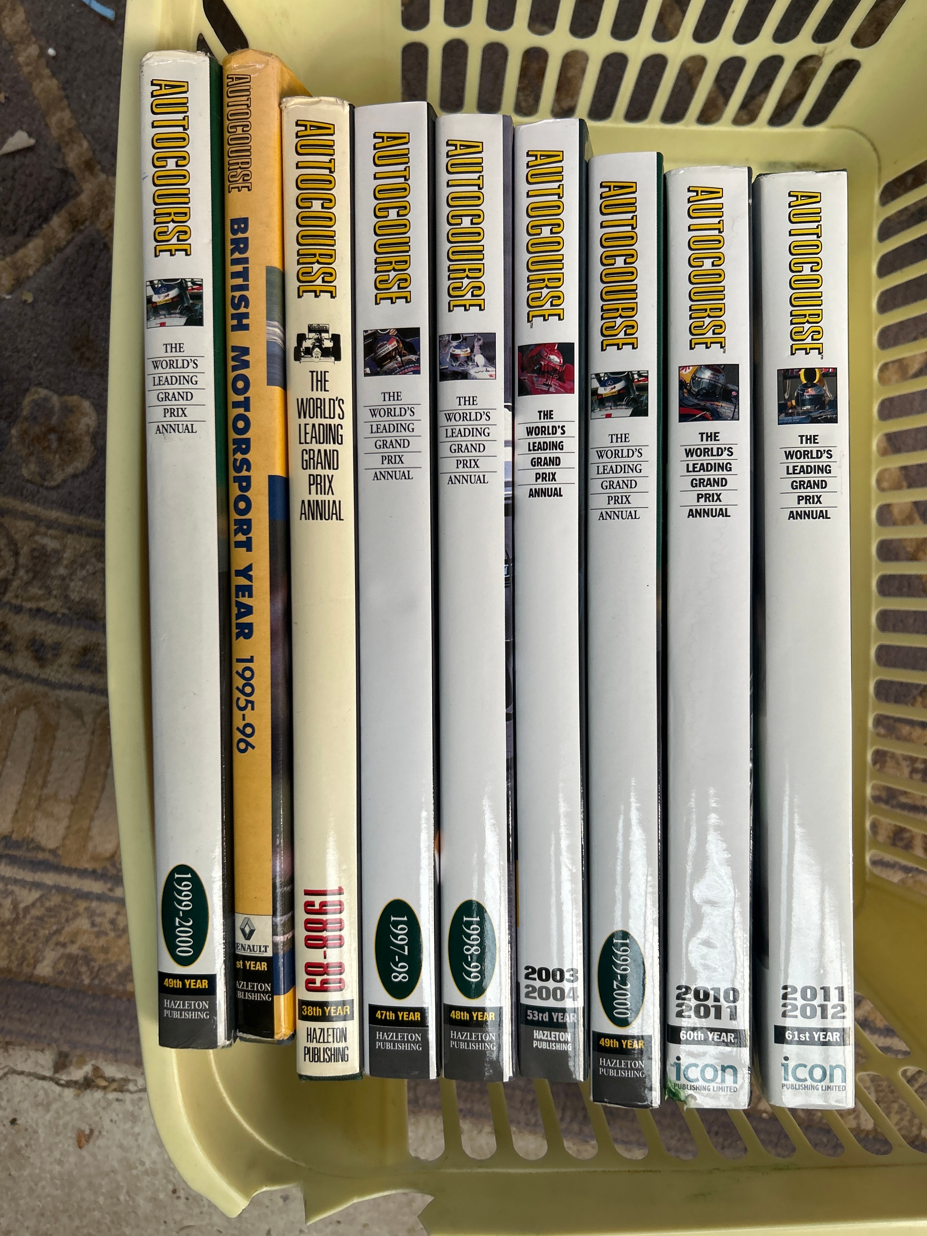 A collection of ten hardcover annual books, predominantly from the ‘Autocourse: The World’s Leading Grand Prix Annual’ series, alongside one volume titled ‘Autocourse British Motorsport Year 1995-96’. The volumes span publication years from 1995-96 up to 2011-2012, encompassing edition numbers from the 38th Year through to the 61st Year. Publishers include Hazleton Publishing and Icon Publishing Limited. The majority of the books feature a consistent design with ‘AUTOGCOURSE’ prominently lettered in yellow, often above a small photographic image of a racing car or driver.