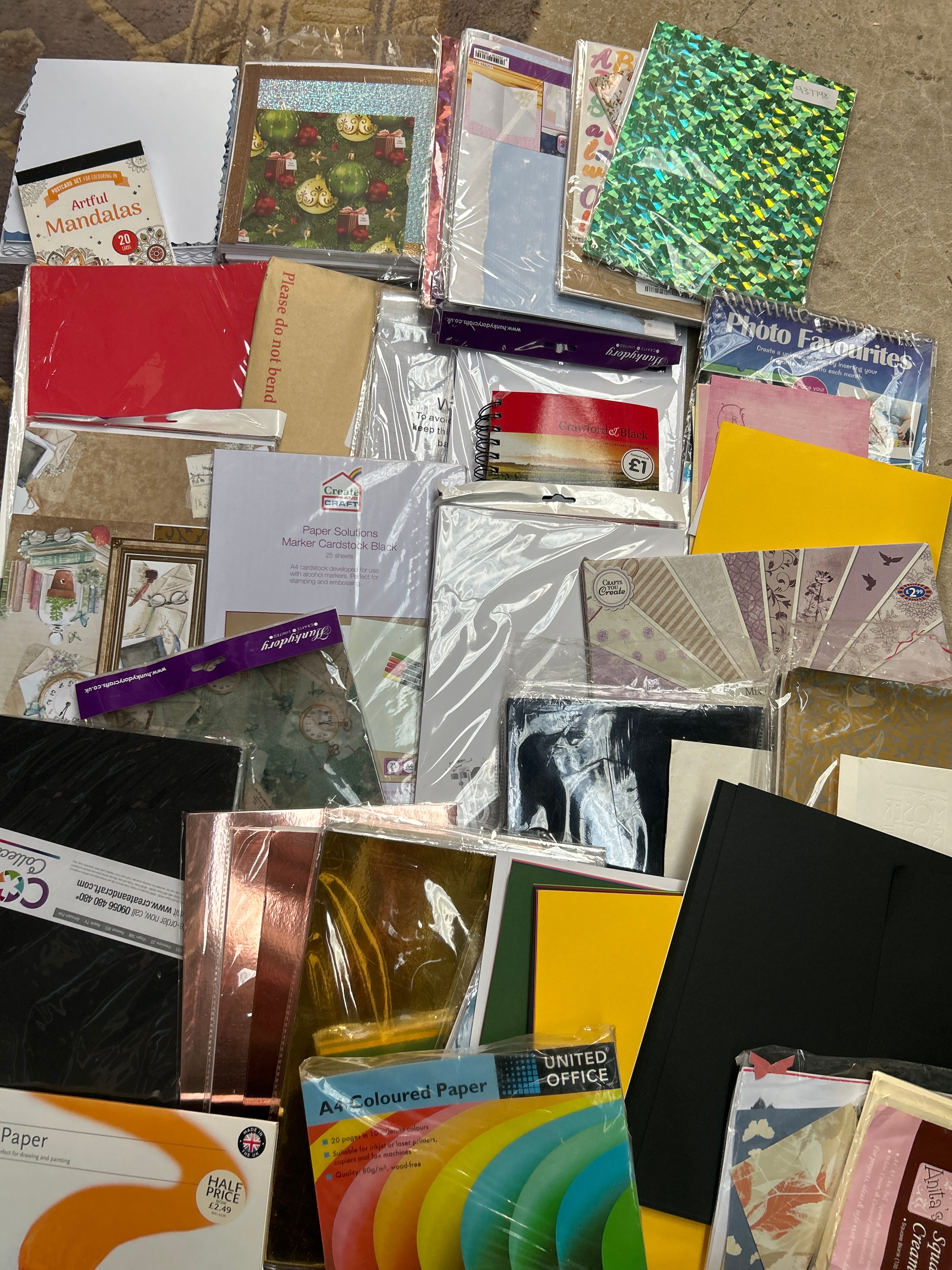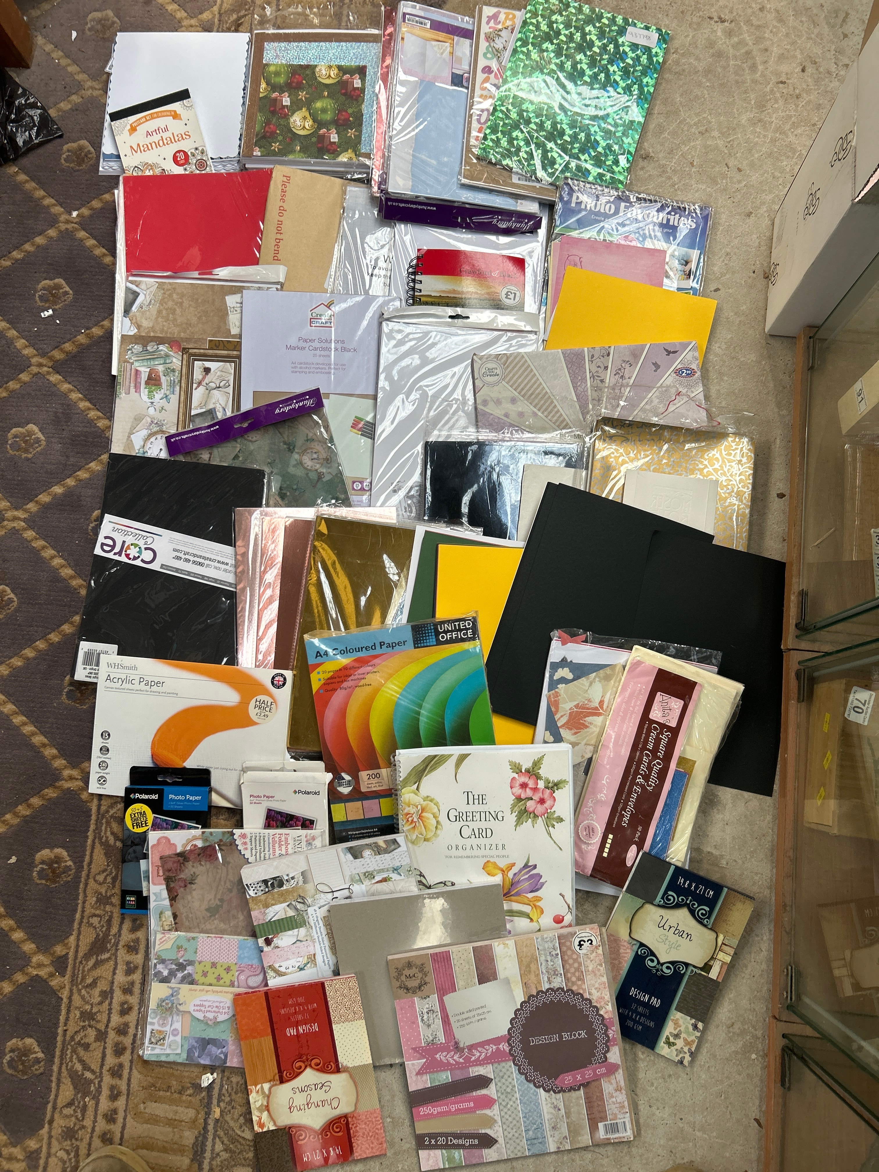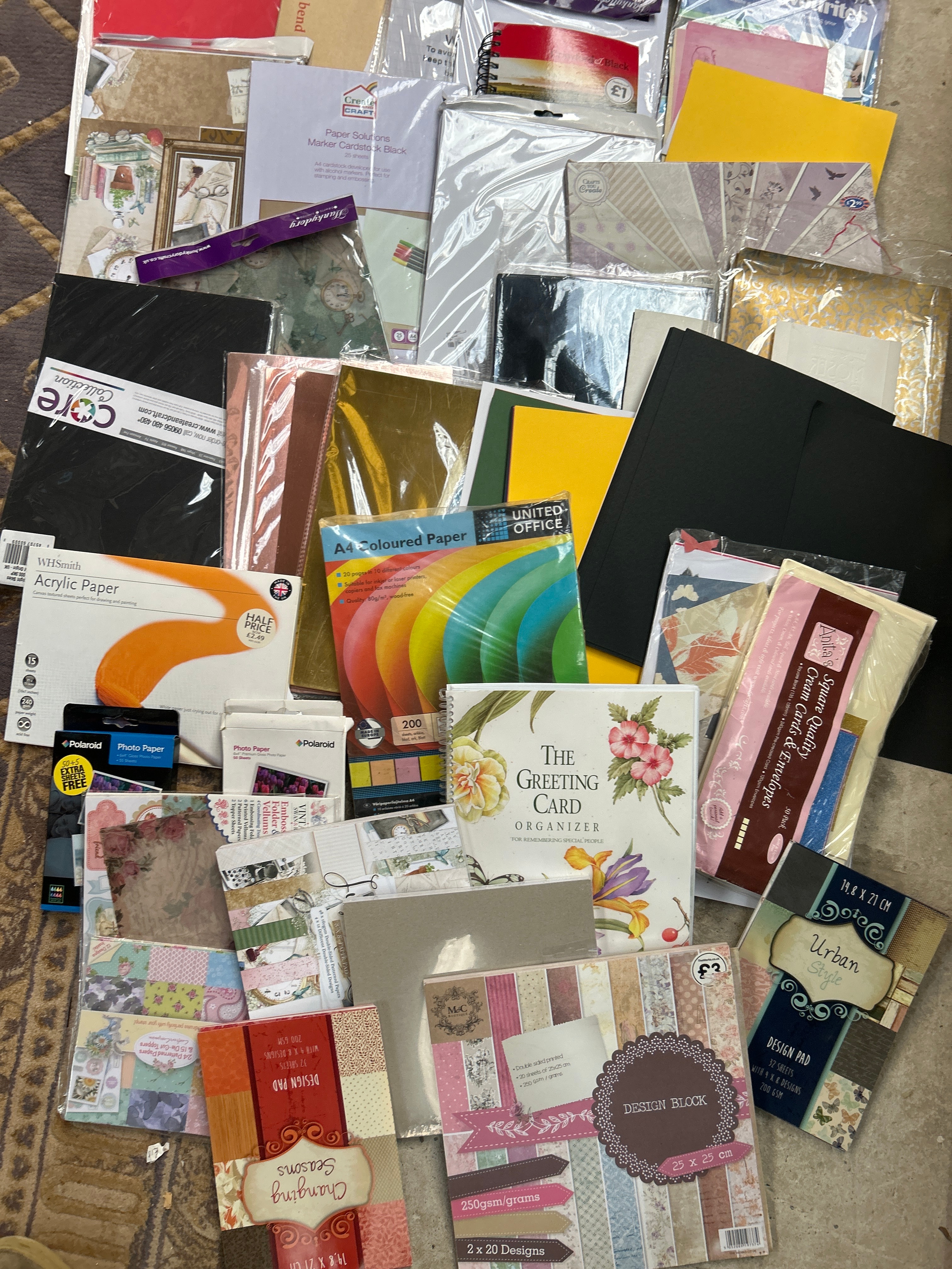 A large collection of contemporary scrapbooking and card making supplies, comprising a wide assortment of new, packaged paper and cardstock craft supplies and stationery items. The collection features a variety of styles, including plain colored sheets, metallic finishes, decorative patterns, and thematic designs such as ‘Artful Mandalas’ and ‘Changing Seasons’. Specific visible items include ‘AA Coloured Paper,’ ‘Acrylic Paper,’ ‘Photo Favorites,’ ‘Square Quality Card & Envelope’ sets, and ‘DESIGN BLOCK’ pads. Also present are storage solutions like ‘The Greeting Card Organizer’. Brands such as UNITED OFFICE, WHSmith, CORE, and Polaroid are visible, with some products indicating paper weight (e.g., ‘250gsm’) and quantities.