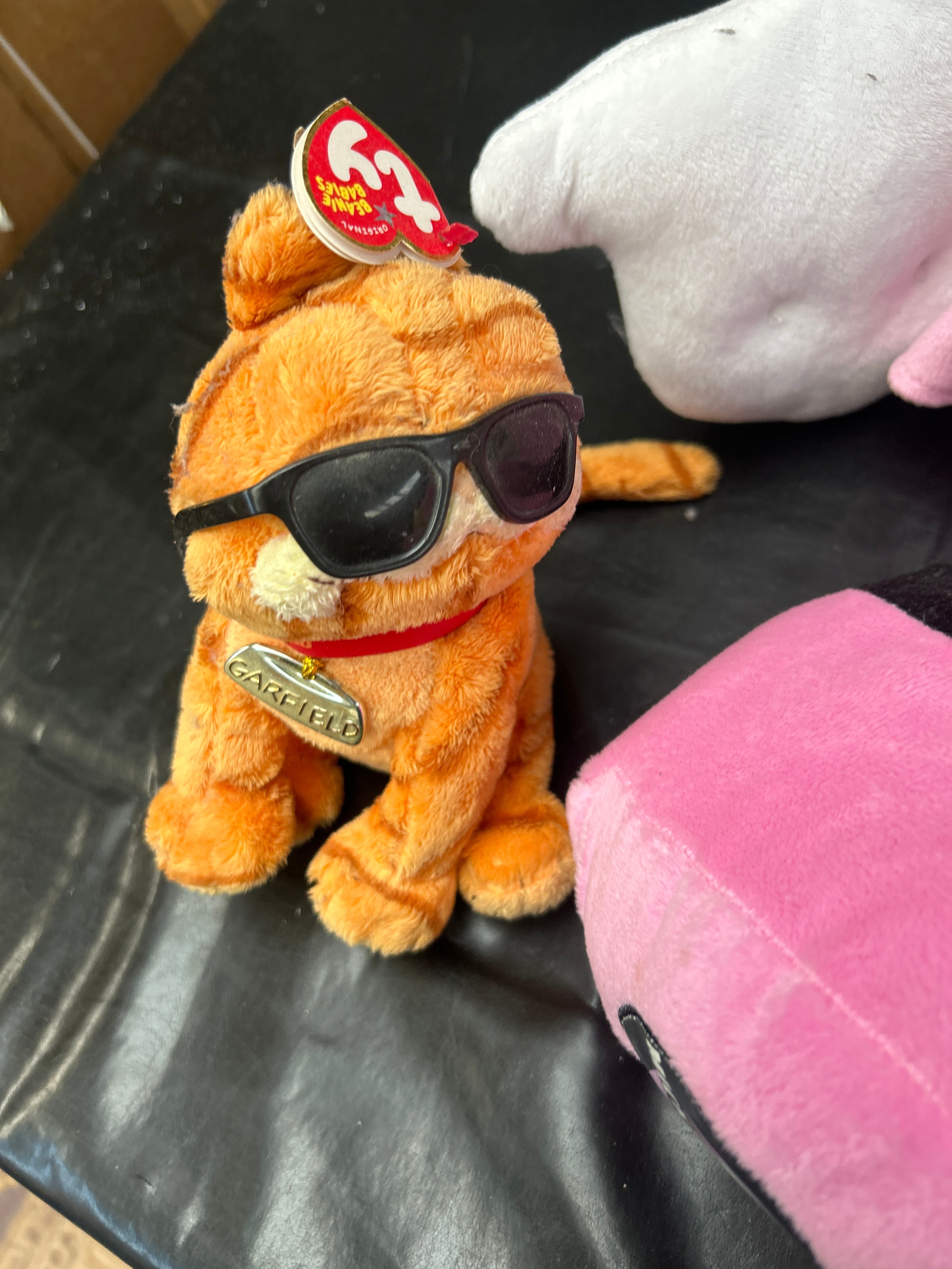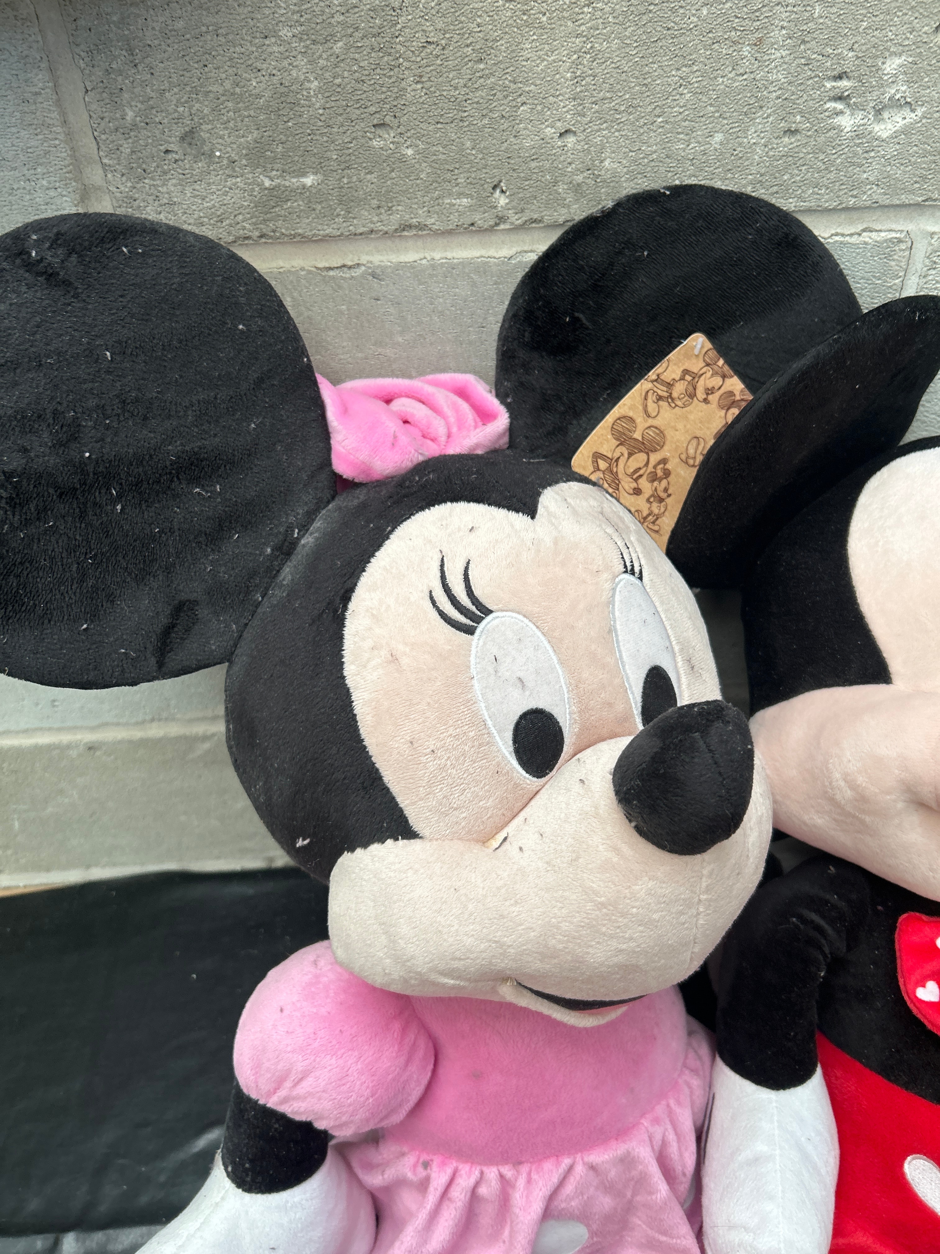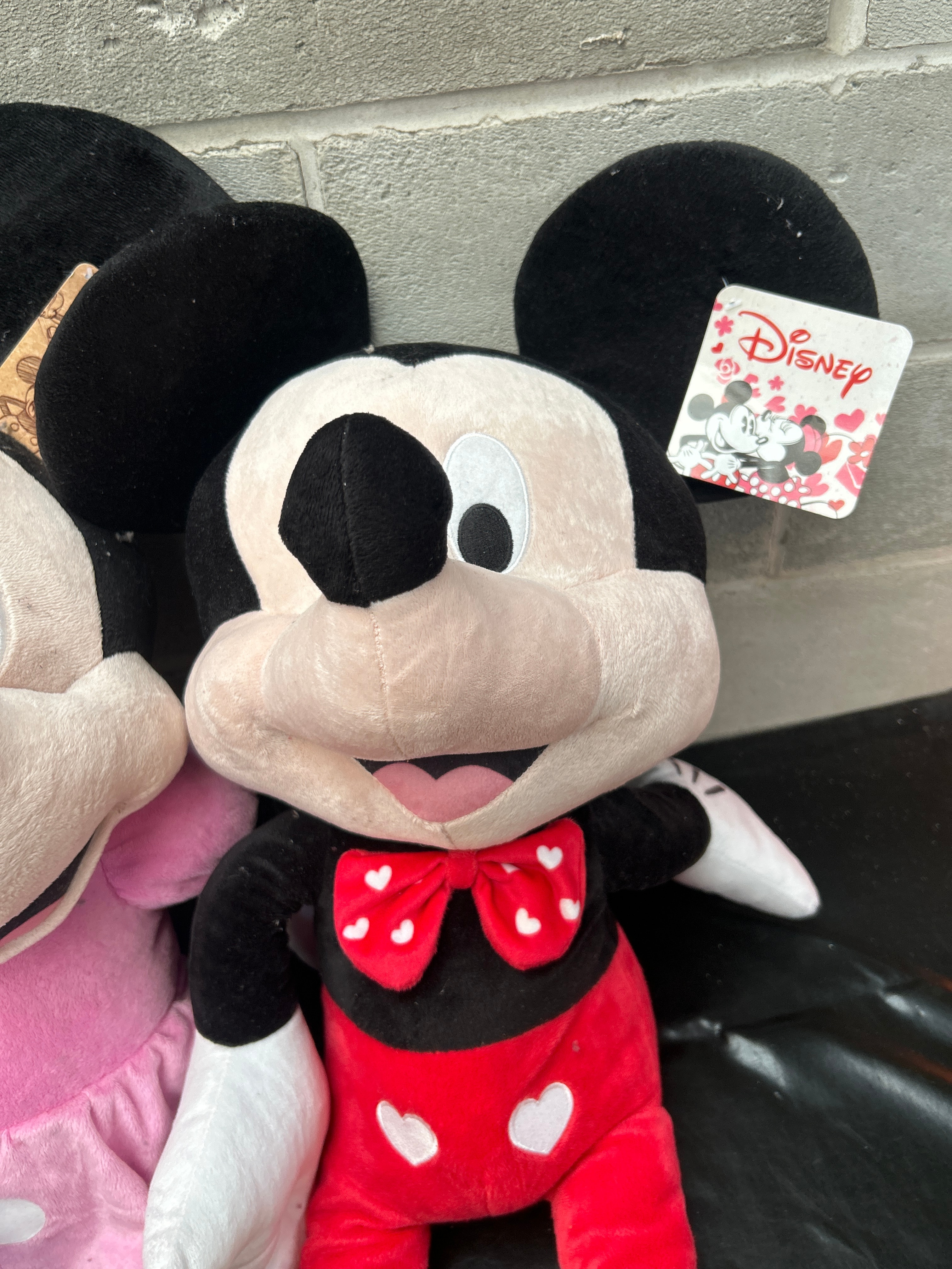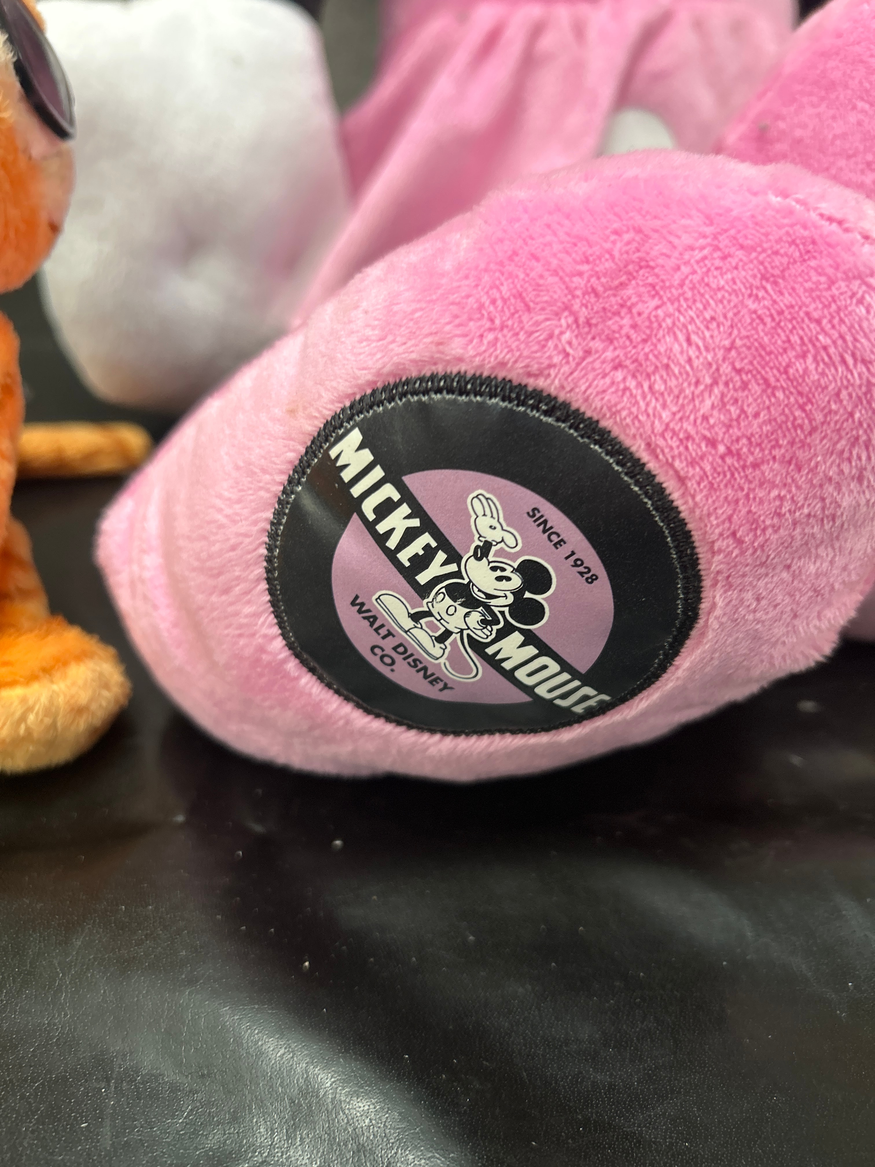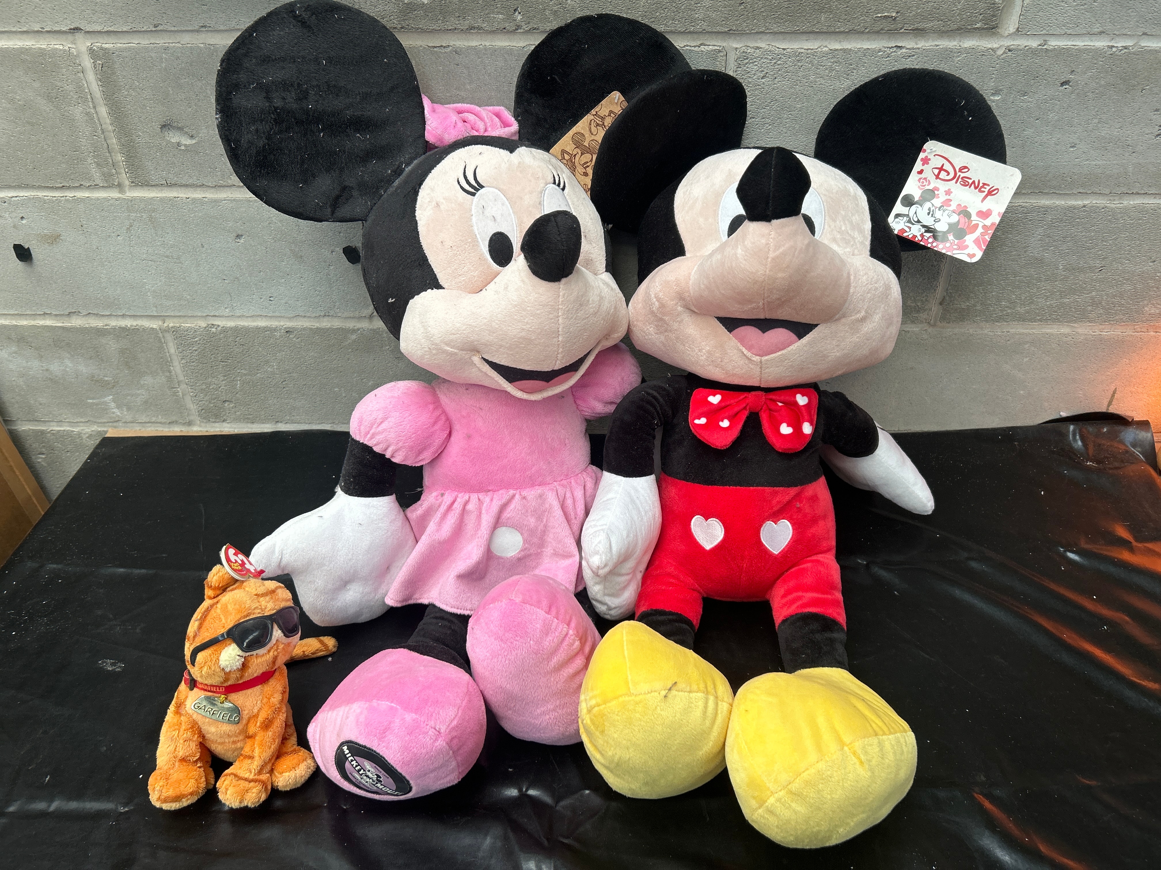 A group of three modern plush toys, including two Disney characters and one Ty Beanie Baby. The lot comprises a large Minnie Mouse plush wearing a pink dress and bow, featuring a circular stitched label on her left foot marked “MICKEY MOUSE SINCE 1928 WALT DISNEY CO.” Accompanying her is a large Mickey Mouse plush, dressed in red shorts with white hearts and a matching red bow tie, retaining an original hang tag with the “Disney” logo and imagery of both characters. The third item is a smaller orange Garfield plush, depicted wearing black sunglasses and a red collar with a metal tag engraved “GARFIELD,” complete with an attached red Ty Beanie Baby tag. All items are constructed from soft plush fabric.