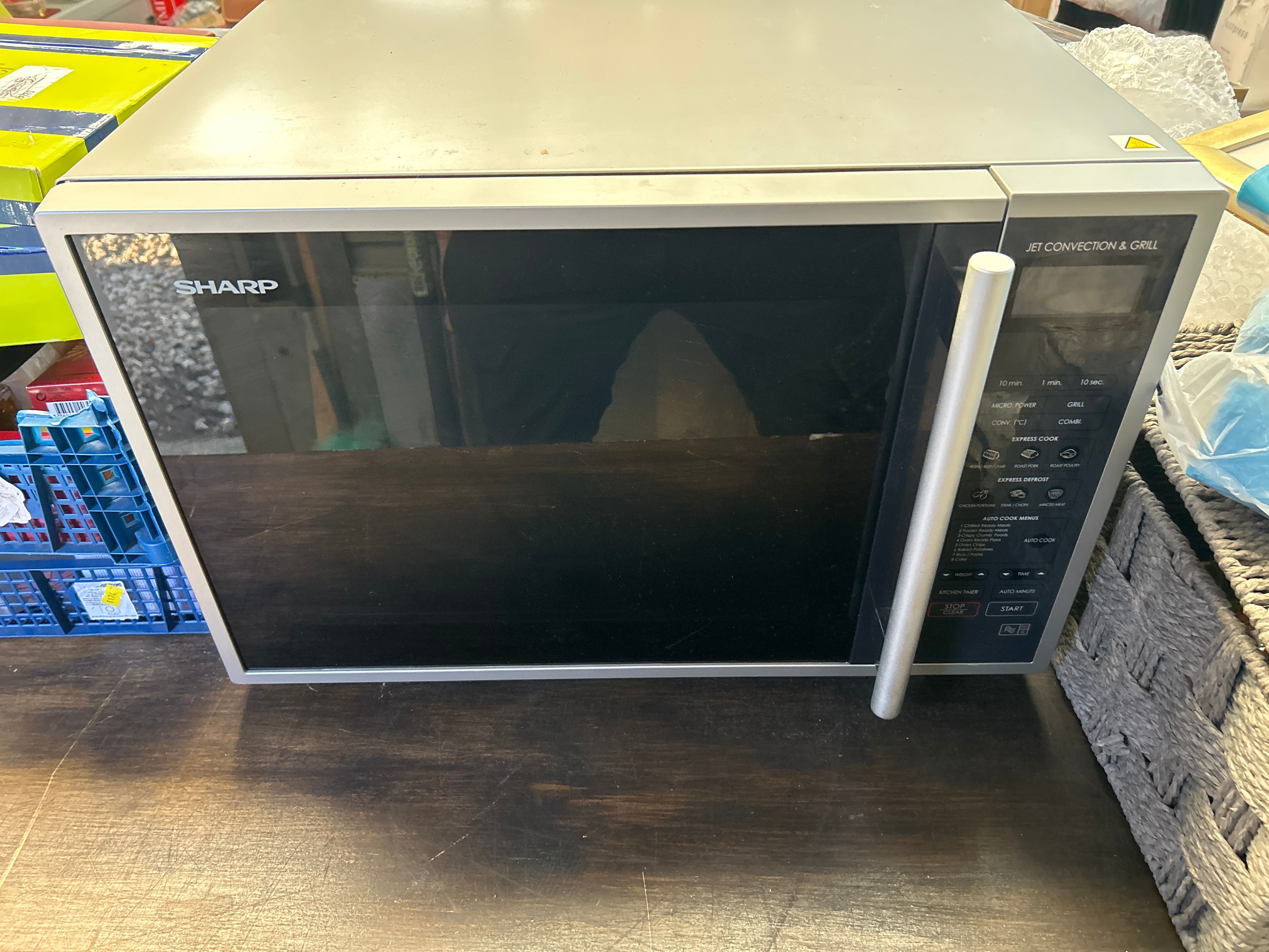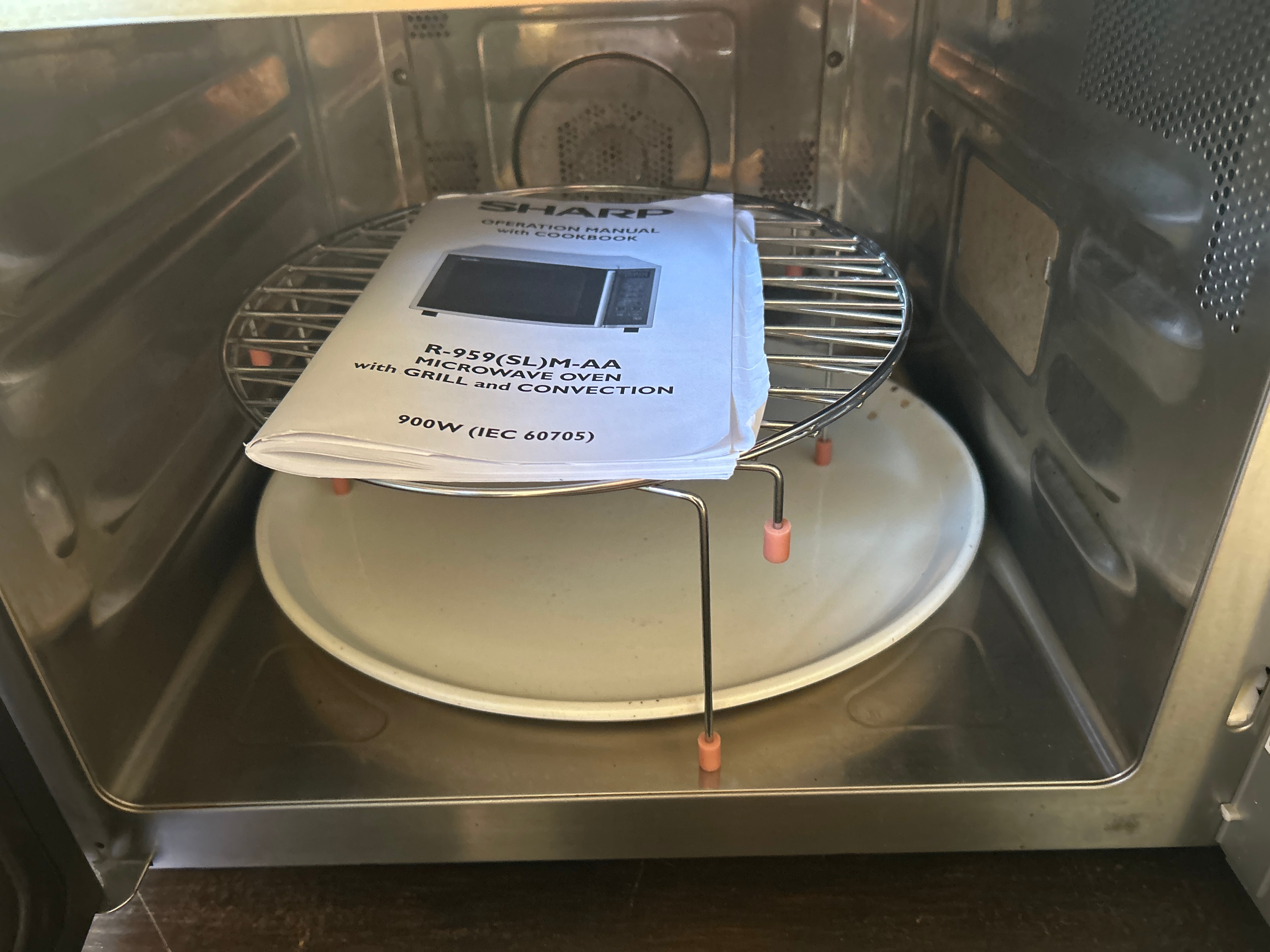 A contemporary Sharp microwave oven, model R-959(SL)M, AA, featuring a “JET CONVECTION & GRILL” system and rated at 900W. The appliance presents with a predominantly stainless steel exterior frame and interior, complemented by a black glass door with a brushed metal handle. The silver-toned control panel lists various functions including “MICRO.POWER,” “GRILL,” “COMB.,” “EXPRESS COOK,” “AUTO COOK,” “EXPRESS REHEAT,” and “START.” The interior is fitted with a metal cooking rack and a ceramic or glass turntable plate. The original “OPERATION MANUAL AND COOKBOOK” is included.
