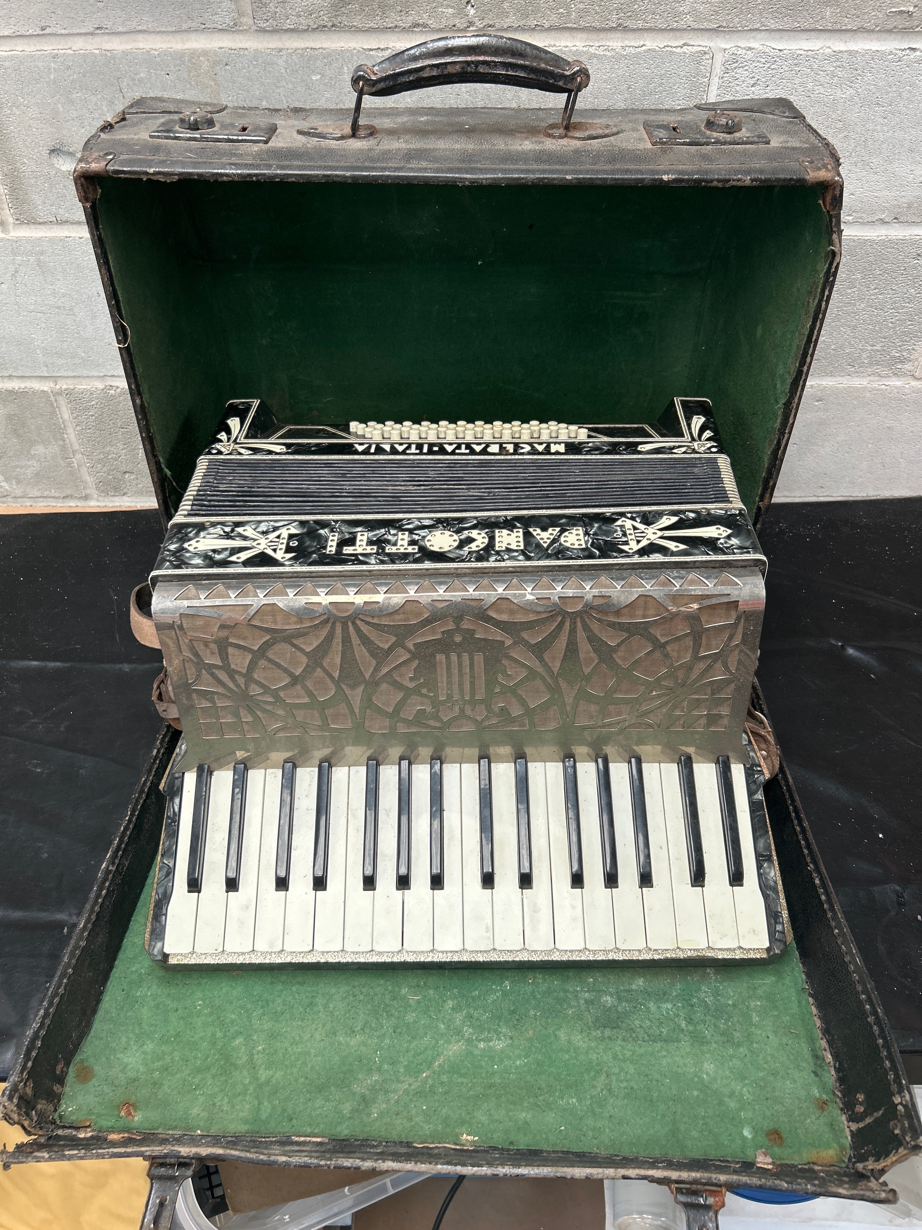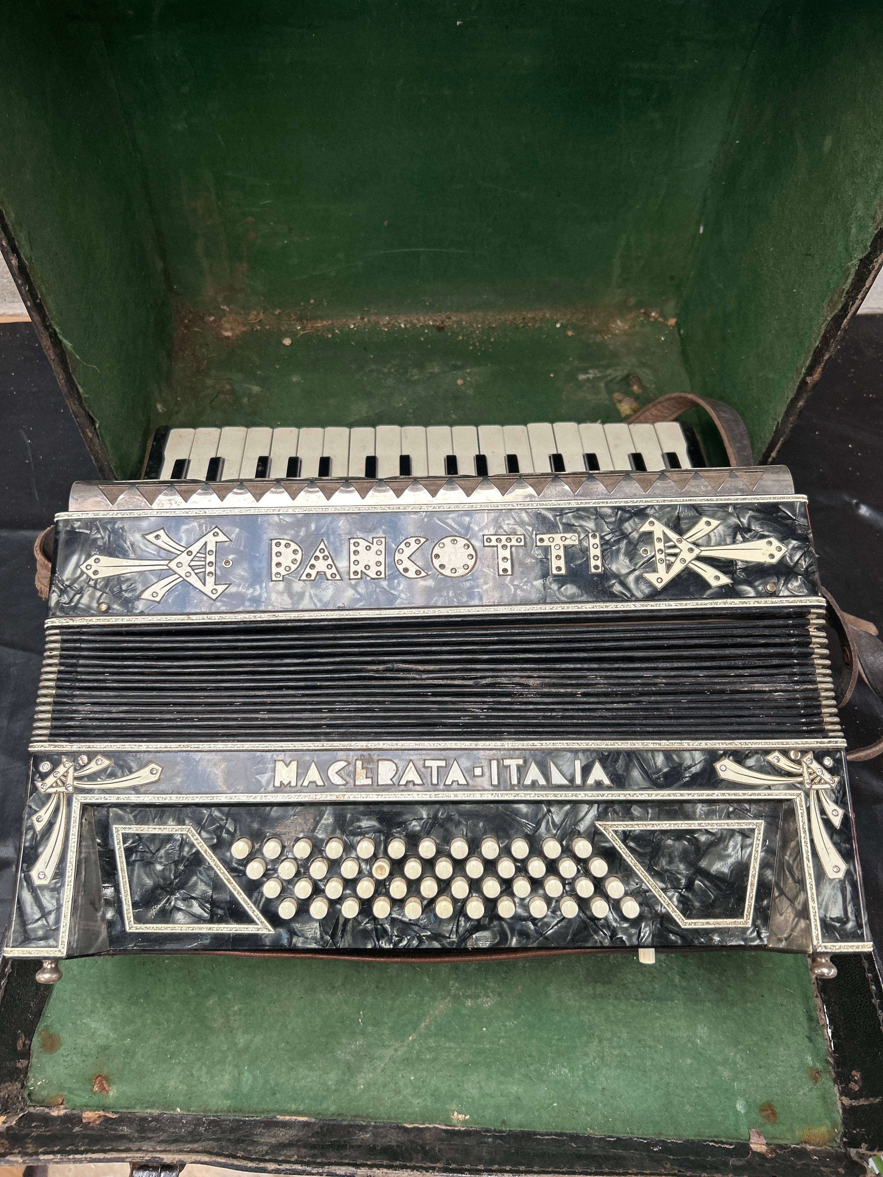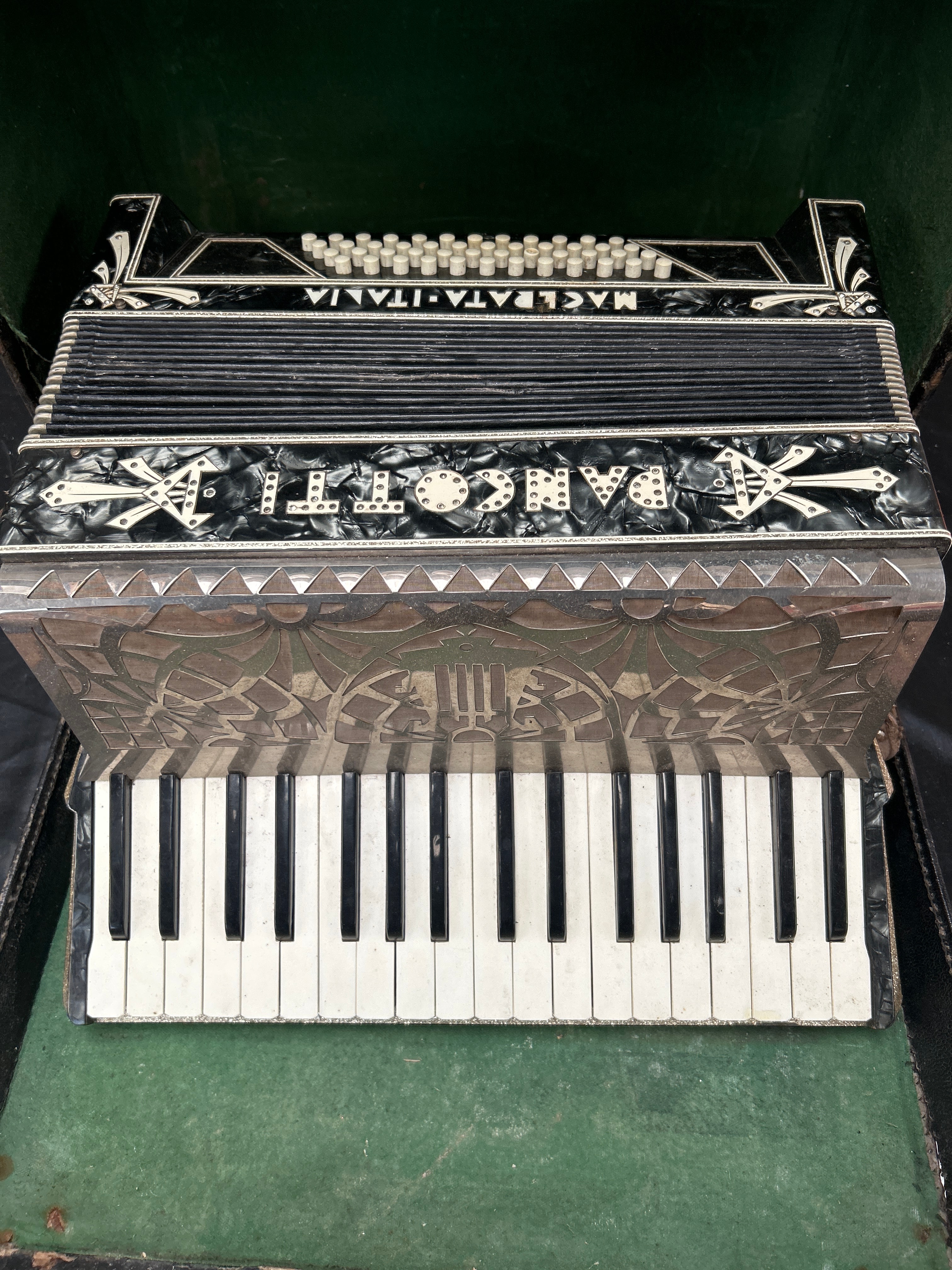 A vintage piano accordion by Pancotti, Macerata – Italia. This instrument features a black and white body adorned with intricate silver-toned decorative inlays on the keyboard and grille sections. It is presented within its original hard case with a green felt interior.