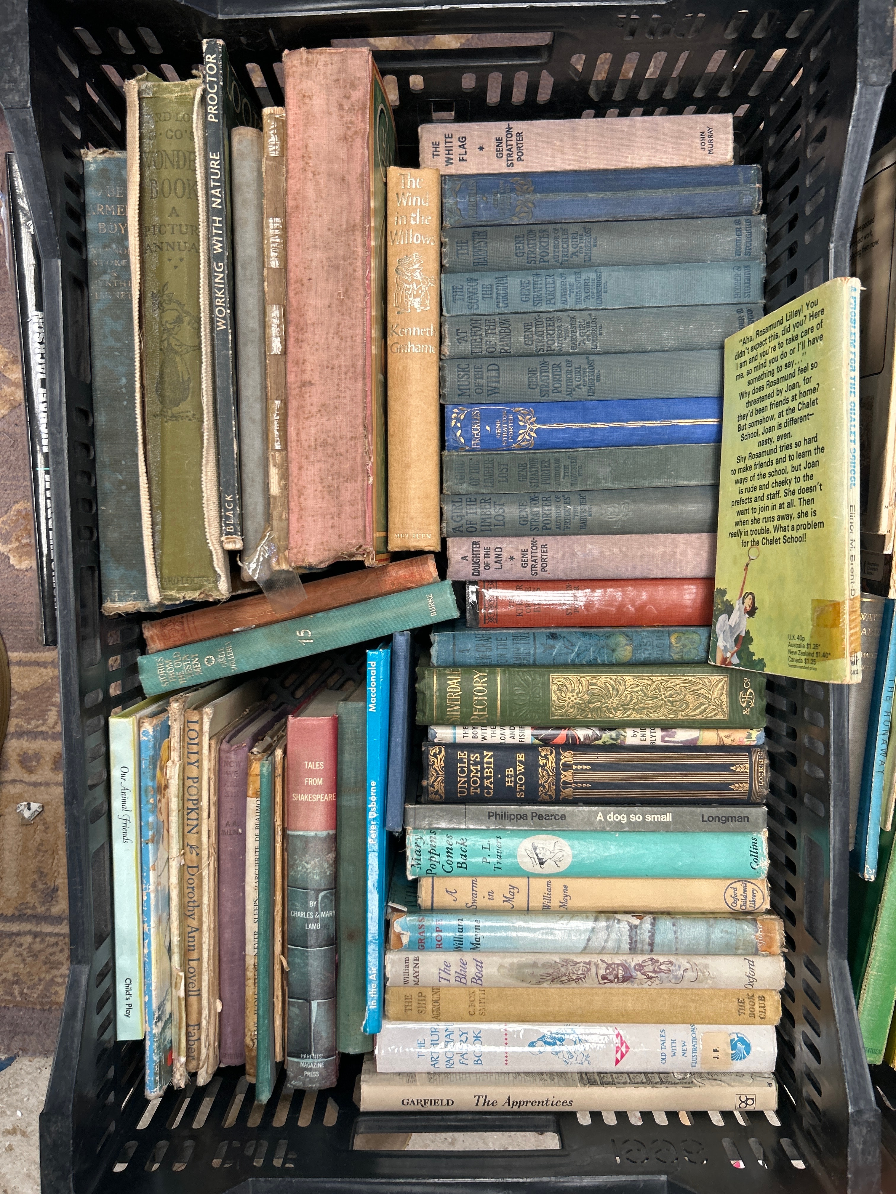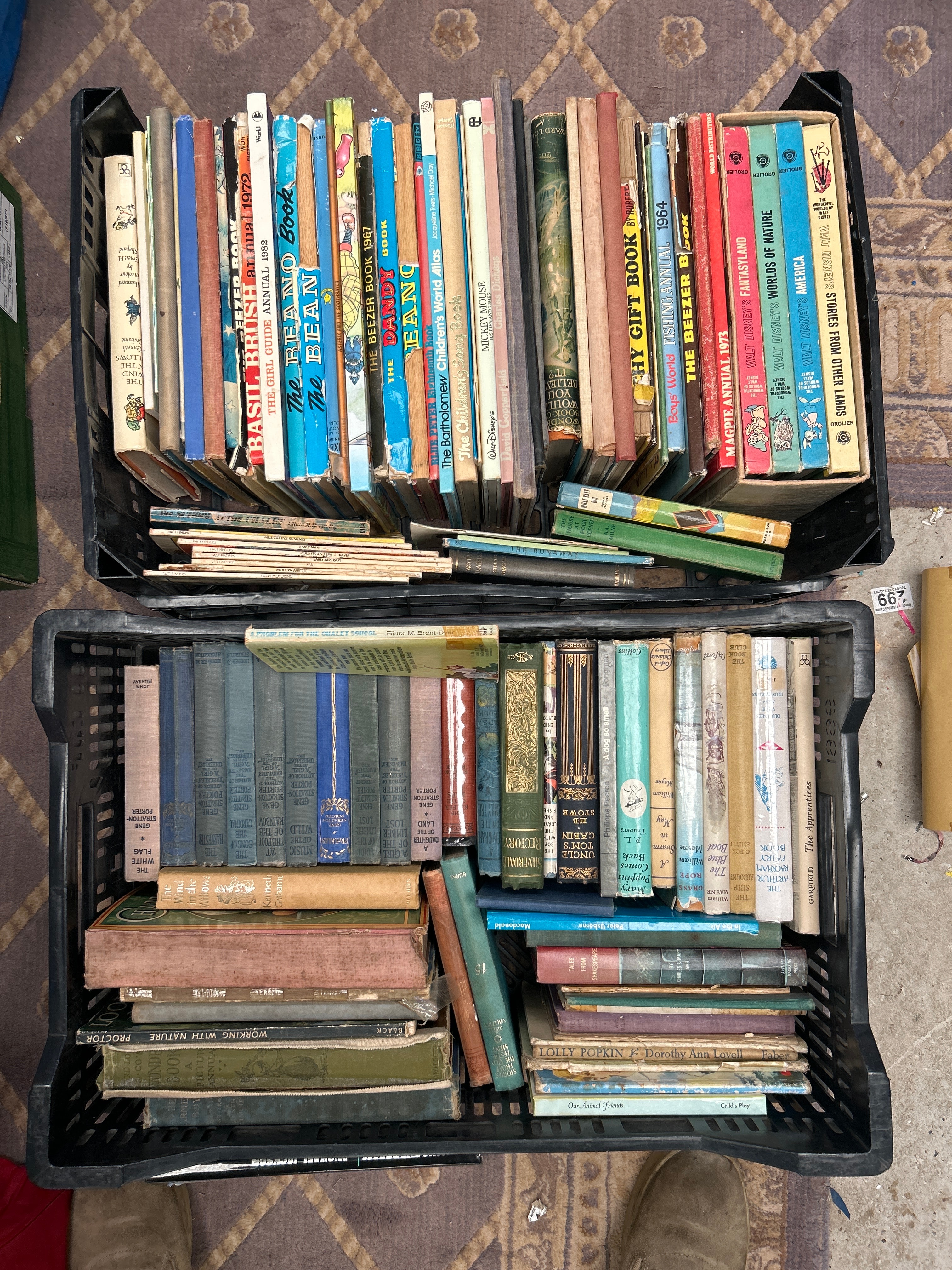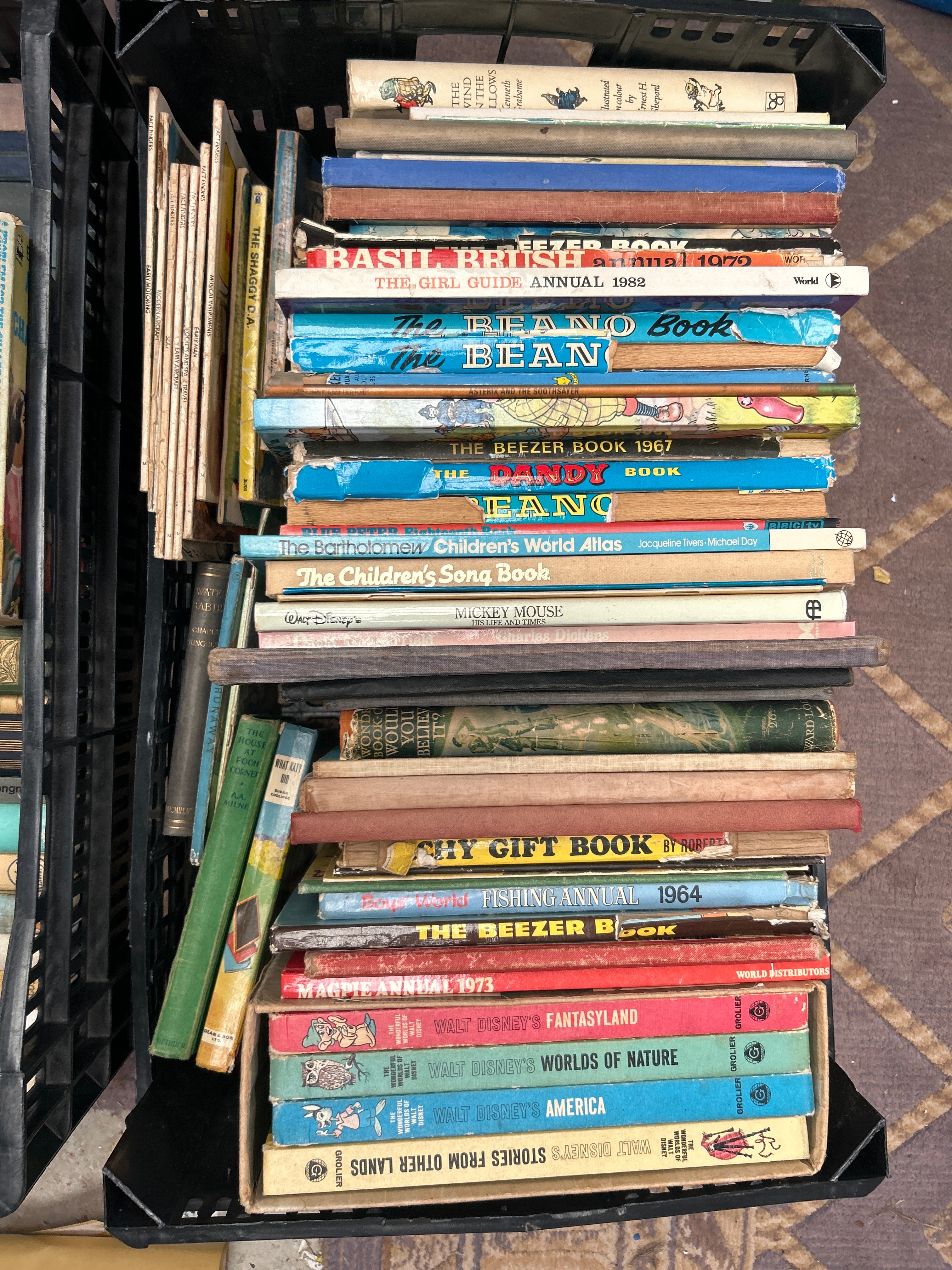 A substantial collection comprising approximately 100-150 assorted hardcover books, housed within two black plastic crates. The collection predominantly features children’s literature, annuals, and classic fiction, with visible publication dates spanning from the 1960s to the early 1980s. Notable titles and series include “The Beezer Book 1967,” “Basil Brush Annual 1982,” “Fishing Annual 1964,” multiple “Walt Disney” books, various “Beano,” “Dandy,” and “Beezer” annuals, “The Wind in the Willows,” “Tales from Shakespeare,” “Jungle Book,” and “Working with Nature.” The books are primarily constructed with paper pages and cardboard covers, some retaining illustrated dust jackets or featuring pictorial boards. One yellow hardcover book is distinctive for an extended excerpt of English dialogue from a children’s story printed directly on its front cover, detailing characters Runa-val and Libby and a discussion about a chalet.