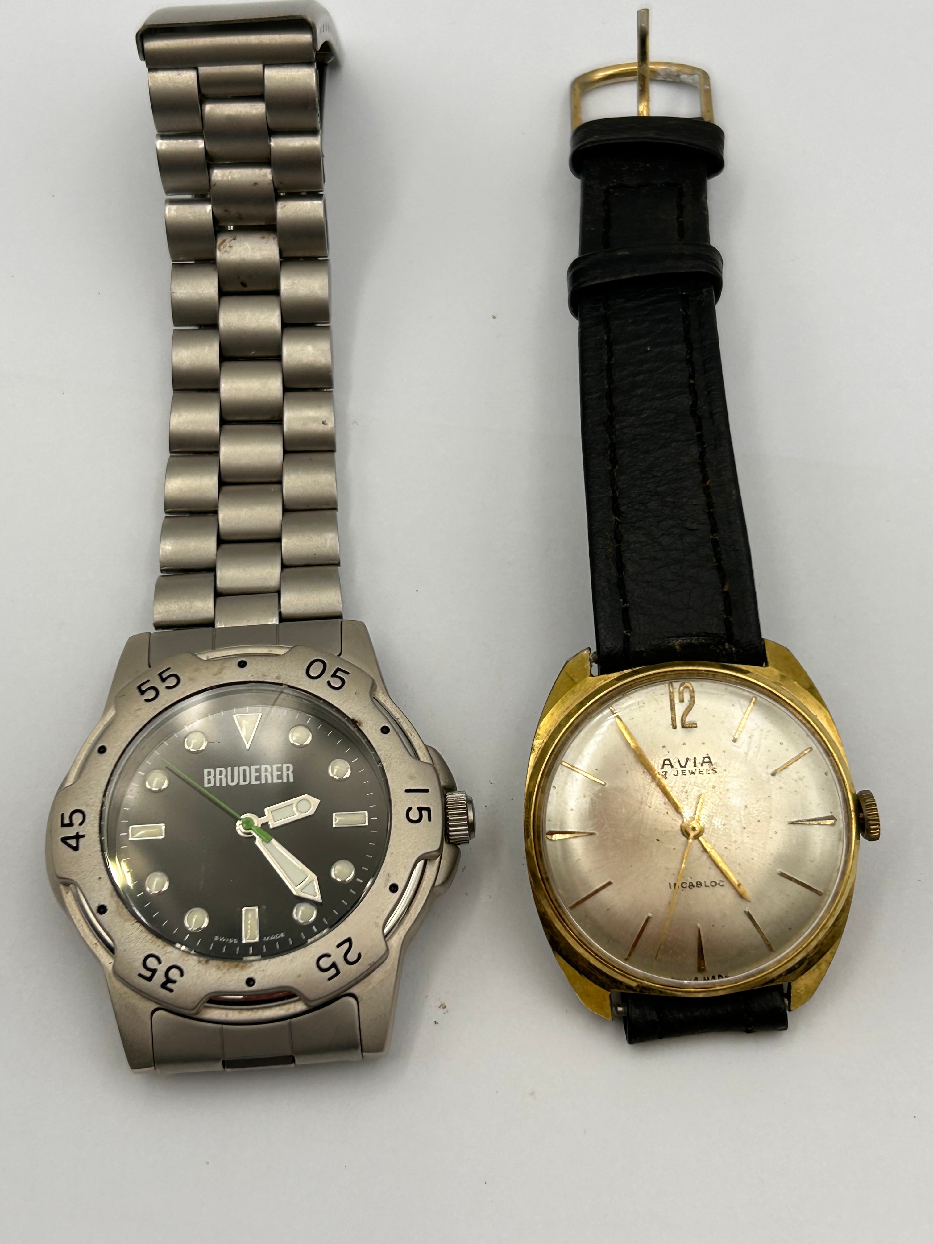 A pair of Swiss Made wristwatches. The first is a modern dive-style watch, featuring a brushed metallic (likely stainless steel or titanium) case and matching link bracelet. The black dial is marked “BRUDERER” and “SWISS MADE”, complemented by a unidirectional bezel with numeric indicators (05, 15, 25, 35, 45, 55). The second timepiece is a vintage gold-tone dress watch with a light champagne-colored dial displaying “AVIA,” “17 JEWELS,” and “INCABLOC,” along with the phrase “SWISS MADE.” It is fitted with a black leather strap.