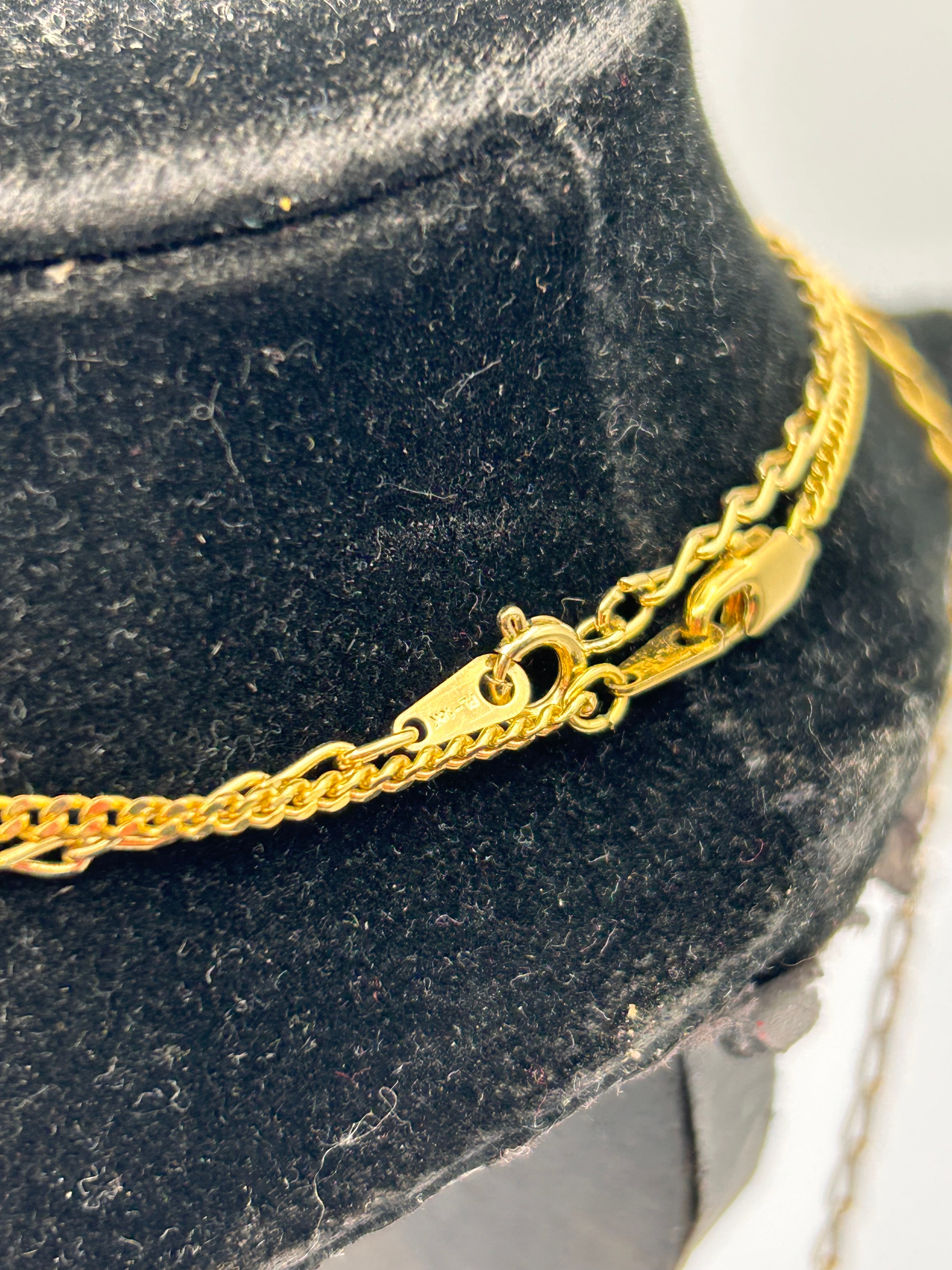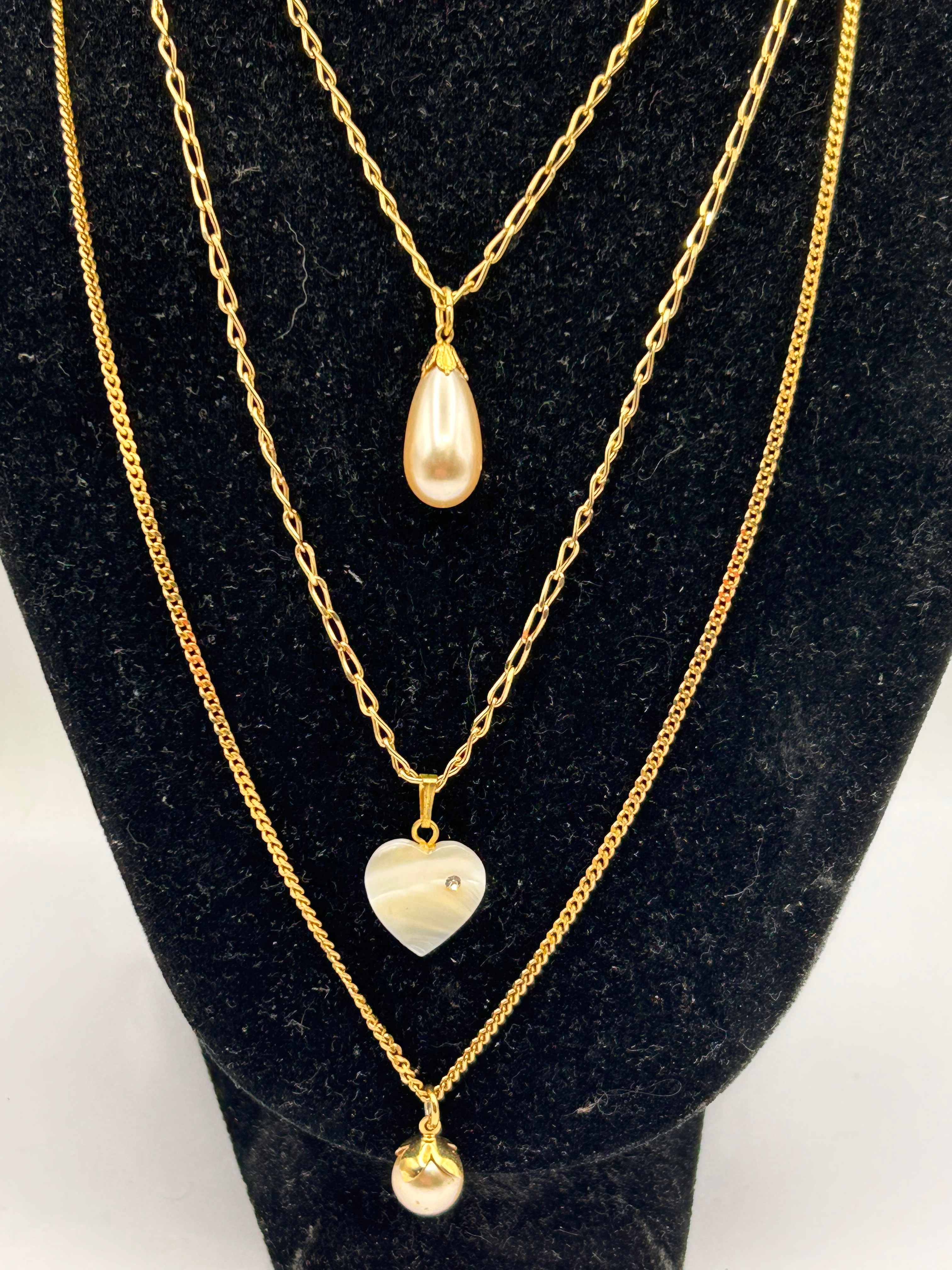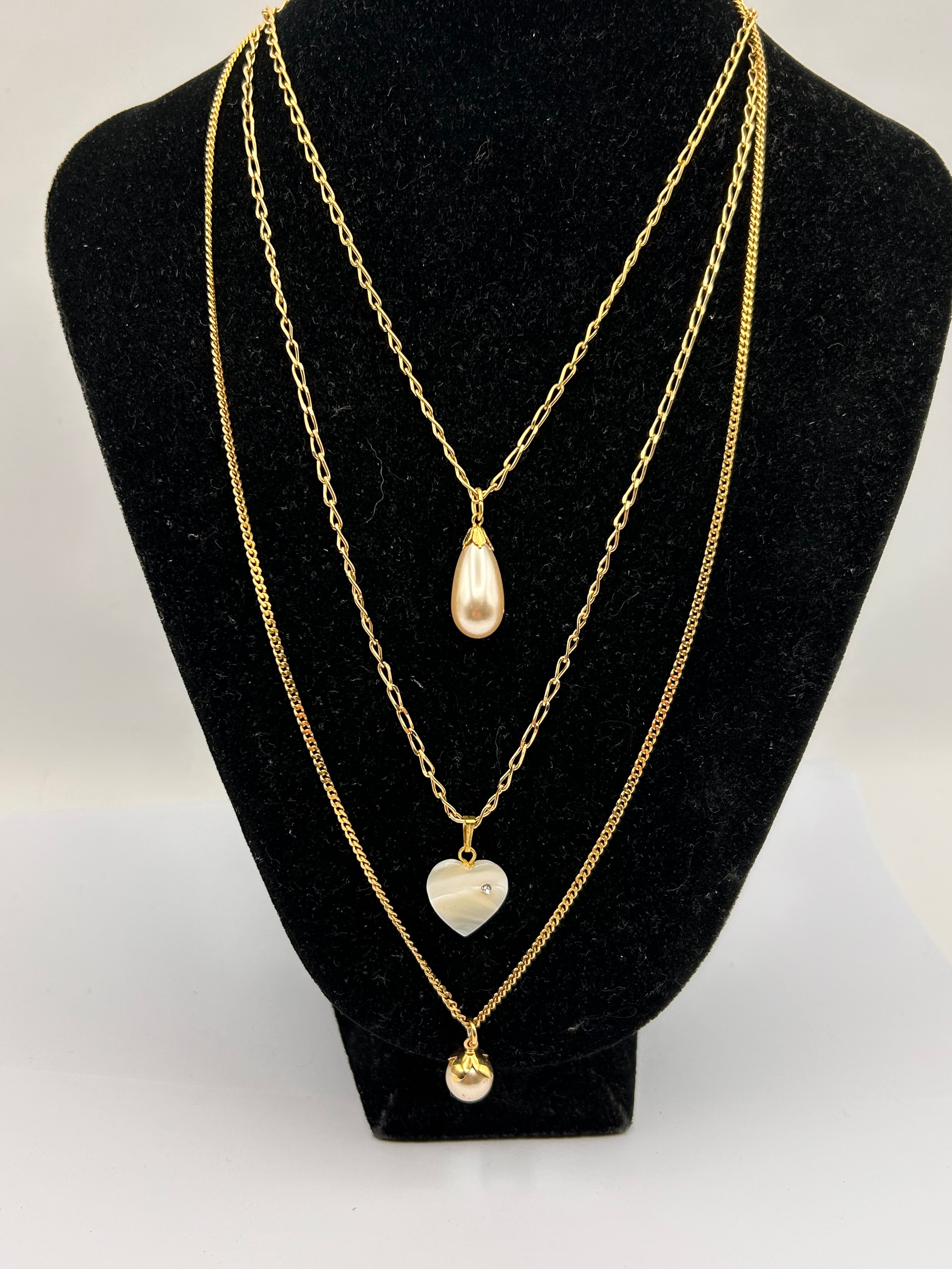 A set of three 18K gold plated layered necklaces. Each necklace features a gold-tone metal chain; the top chain is a rolo style, the middle a flat curb link, and the bottom a classic curb or cable link. The shortest necklace has a teardrop-shaped faux pearl pendant with a gold-tone cap. The middle necklace features a polished, heart-shaped pendant, likely mother-of-pearl or shell, accented with a small clear faceted stone. The longest necklace displays a spherical pearl-like bead pendant, also with a gold-tone cap. Lobster clasps are visible on at least one chain, accompanied by a small, unidentifiable tag. Exhibiting a contemporary style.