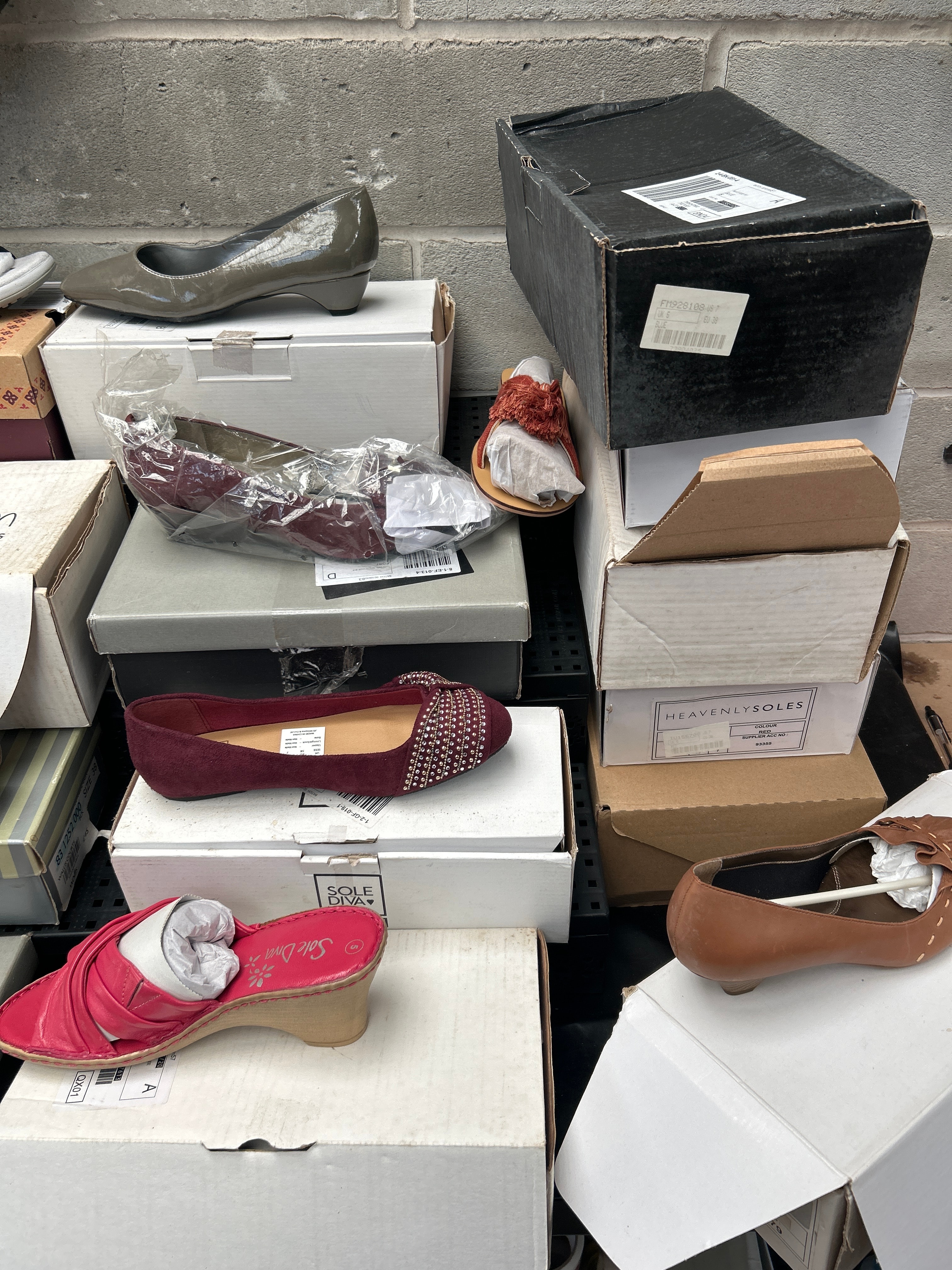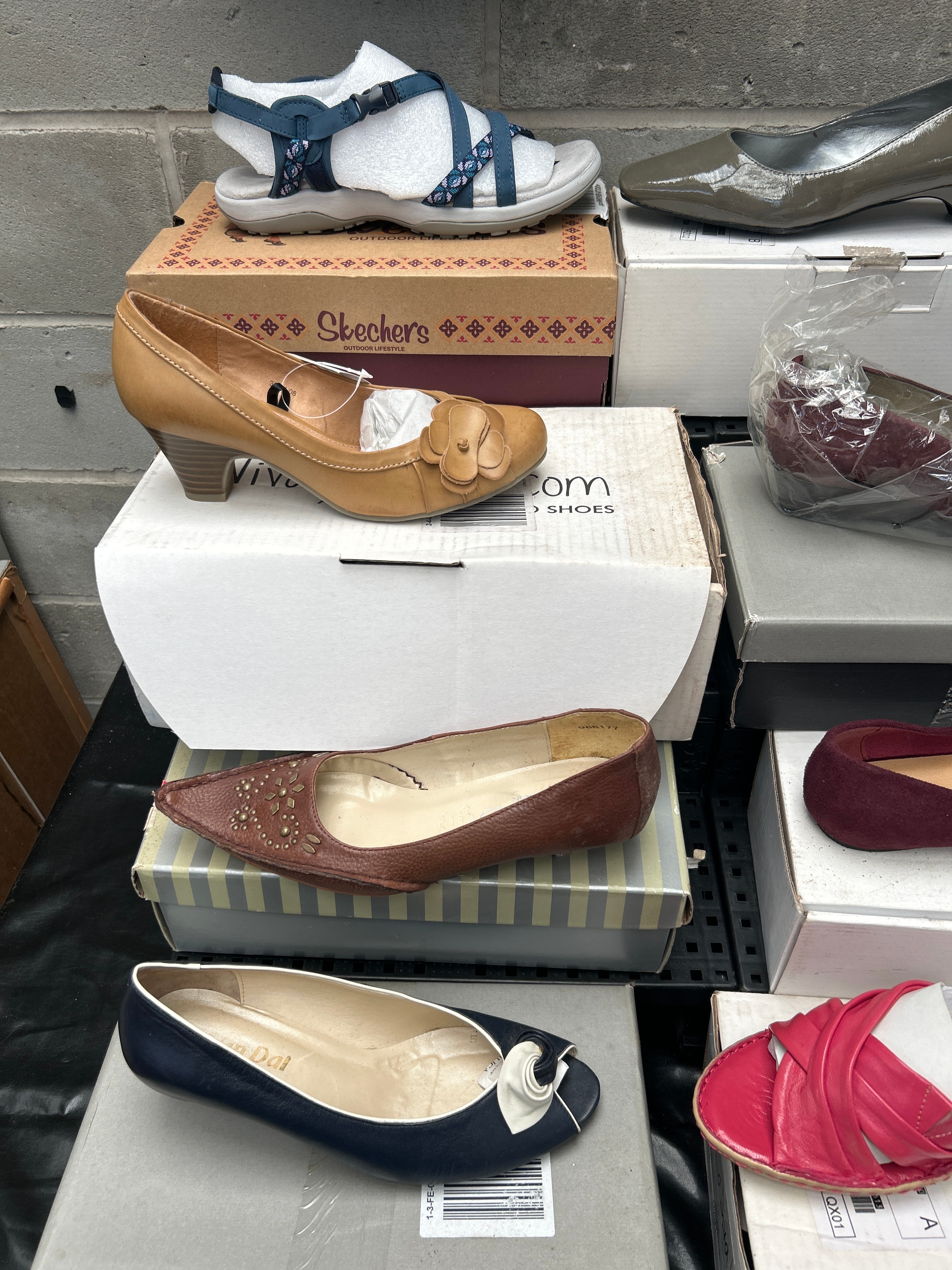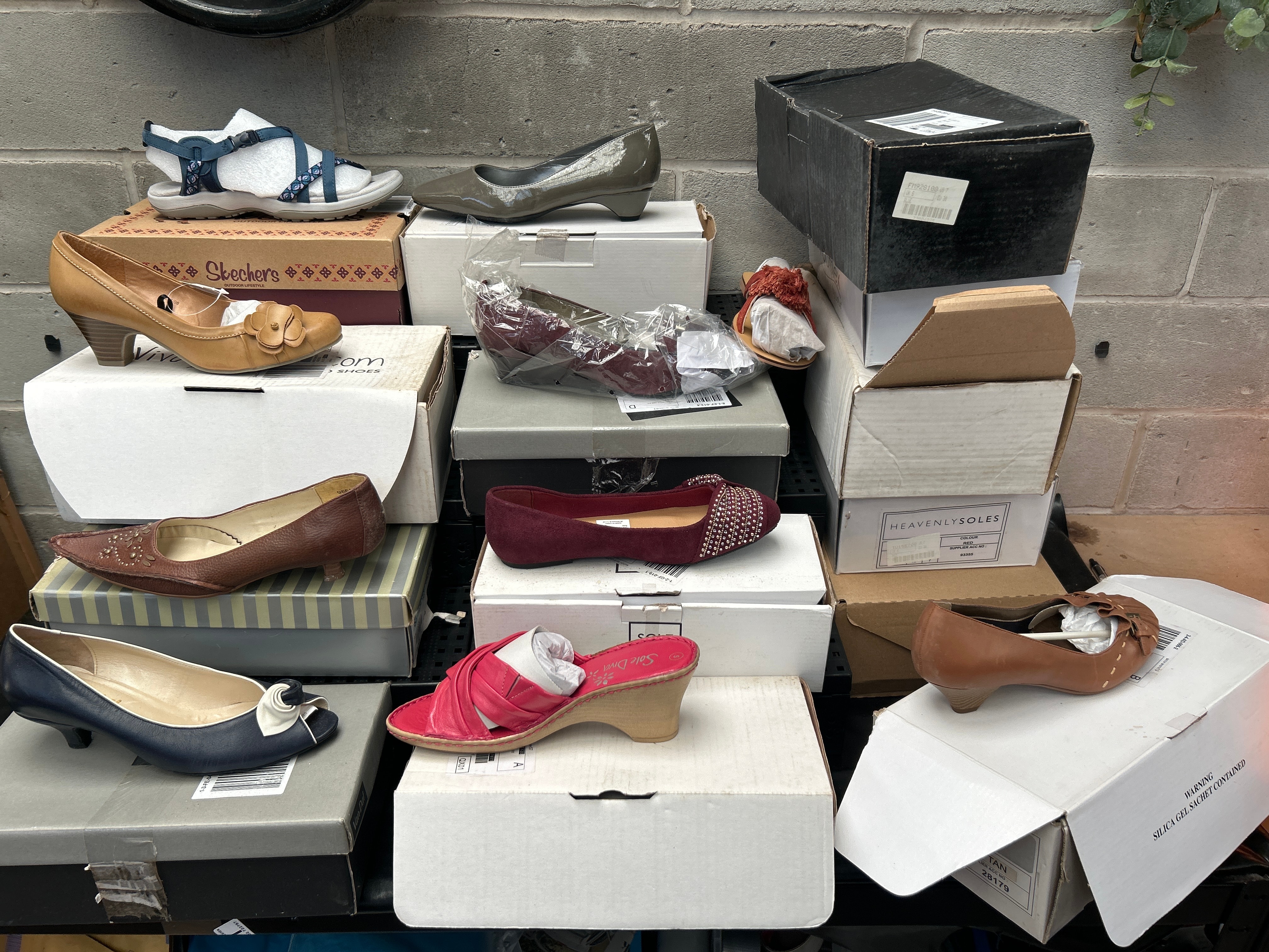 A collection of approximately ten pairs of contemporary women’s shoes, presented with their accompanying shoeboxes. The lot includes a diverse range of styles such as sandals, pumps, ballet flats, and wedge heels. Materials vary, encompassing patent leather, suede-like textiles, and synthetics, in a palette of colors including tan, olive green, burgundy, navy, white, and red. Visible brands and markings include Skechers Outdoor Lifestyle, Vivofootwear.com Shoes, Heavenly Soles, Sole Diva, and Ciao Dal.