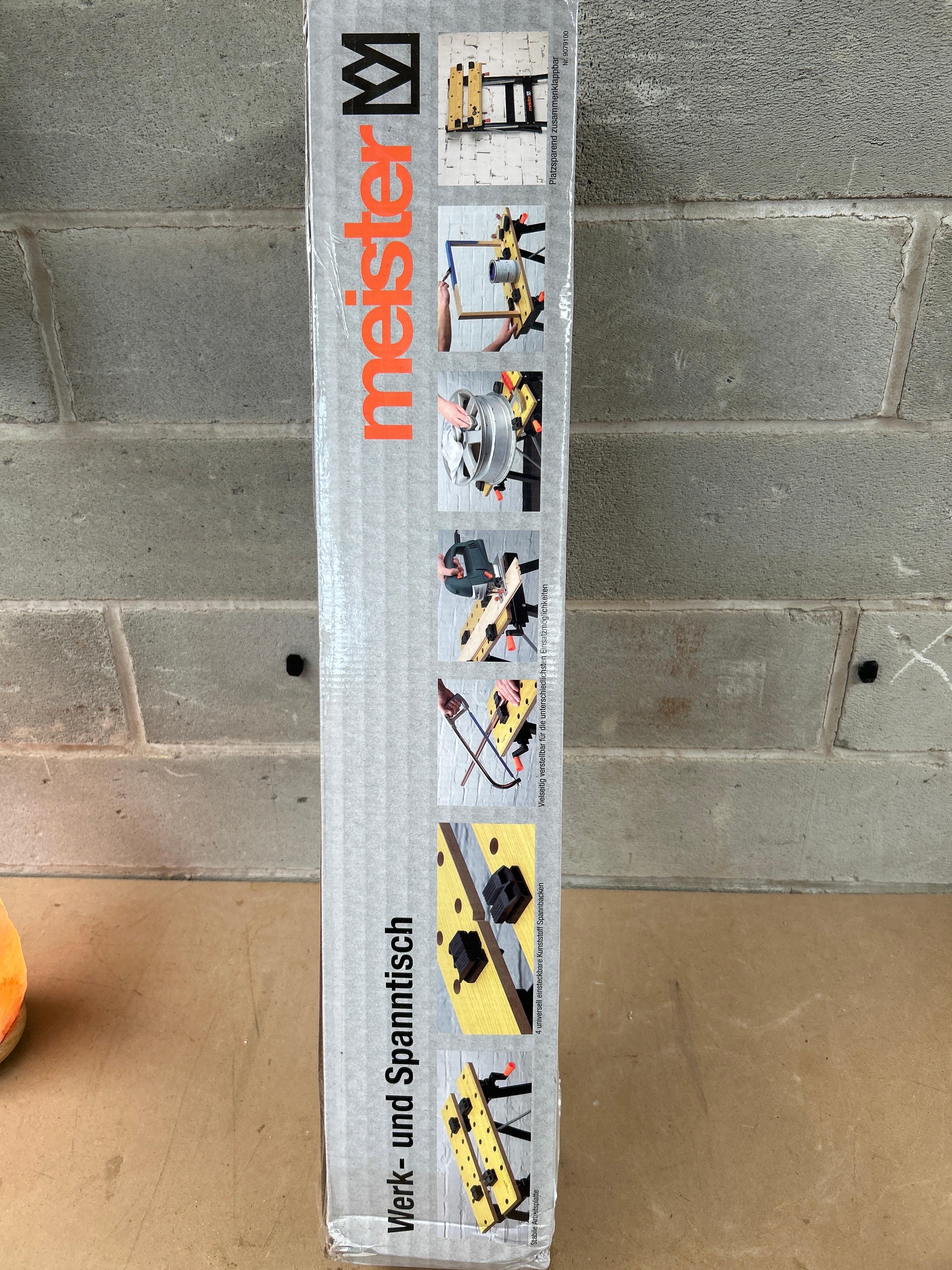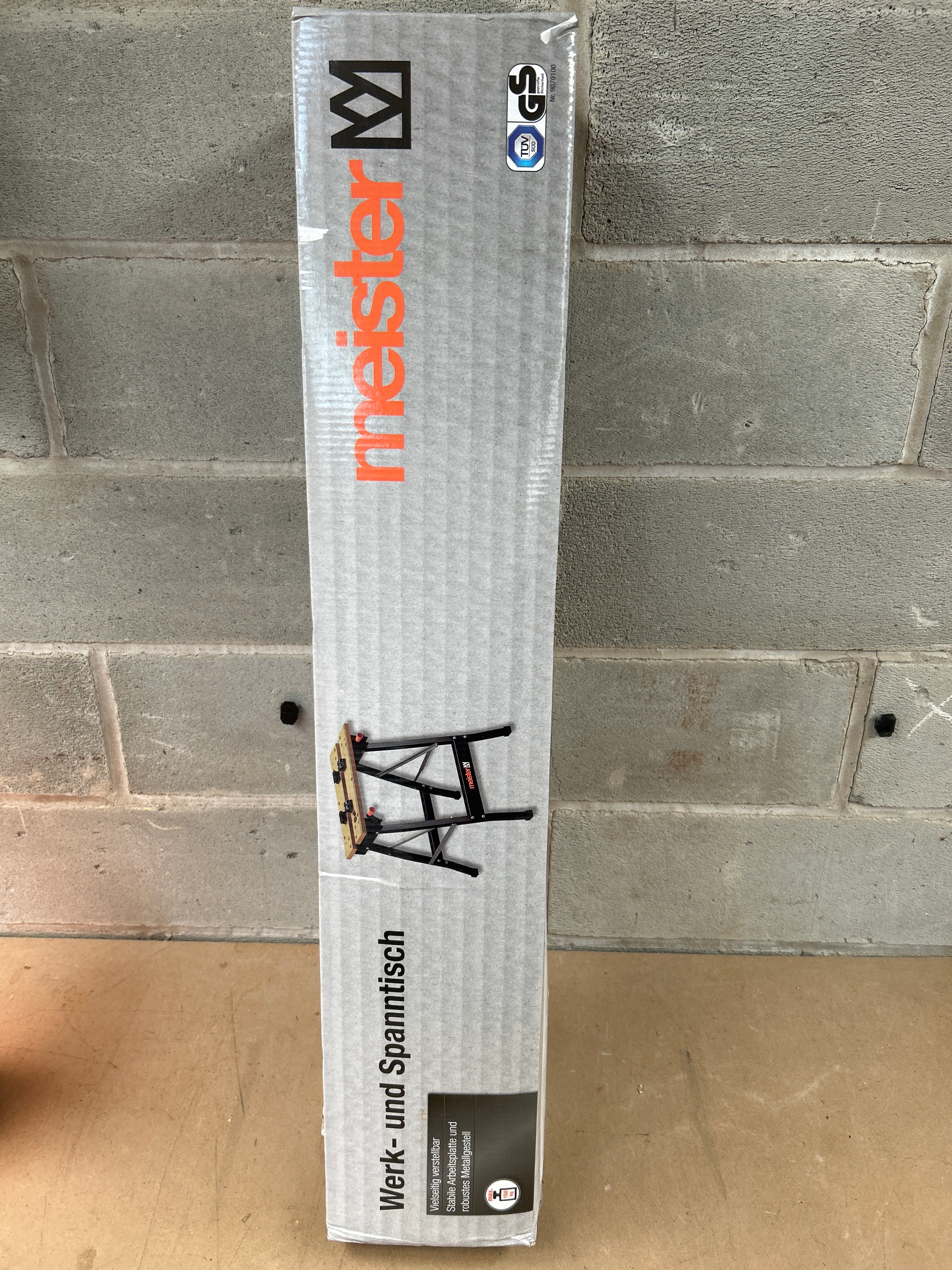 A Meister brand Werk- und Spanntisch (Work and Clamping Table), presented new in its factory-sealed rectangular cardboard packaging. This item is a portable workbench and vise, similar in function and design to the widely recognized Black+Decker Workmate series. The modern-style packaging features a prominent image of the black and wood-colored workbench in a folded configuration on the front. Additional smaller images on the reverse illustrate its versatile use for clamping various materials and its space-saving foldability. German text on the packaging describes it as “Vielseitig einsetzbar, stabile Arbeitsplatte und robustes Metallgestell” (Versatile, stable worktop and robust metal frame) and “Vielseitig einsetzbar für die unterschiedlichsten Arbeiten” (Versatile for the most diverse tasks). It also highlights its quick storage and transport: “In Sekunden verstaut & transportiert! Sparsam! Sparen Platz!” (Stowed & transported in seconds! Economical! Save space!). The packaging displays TÜV SÜD GS and TDX certification logos.