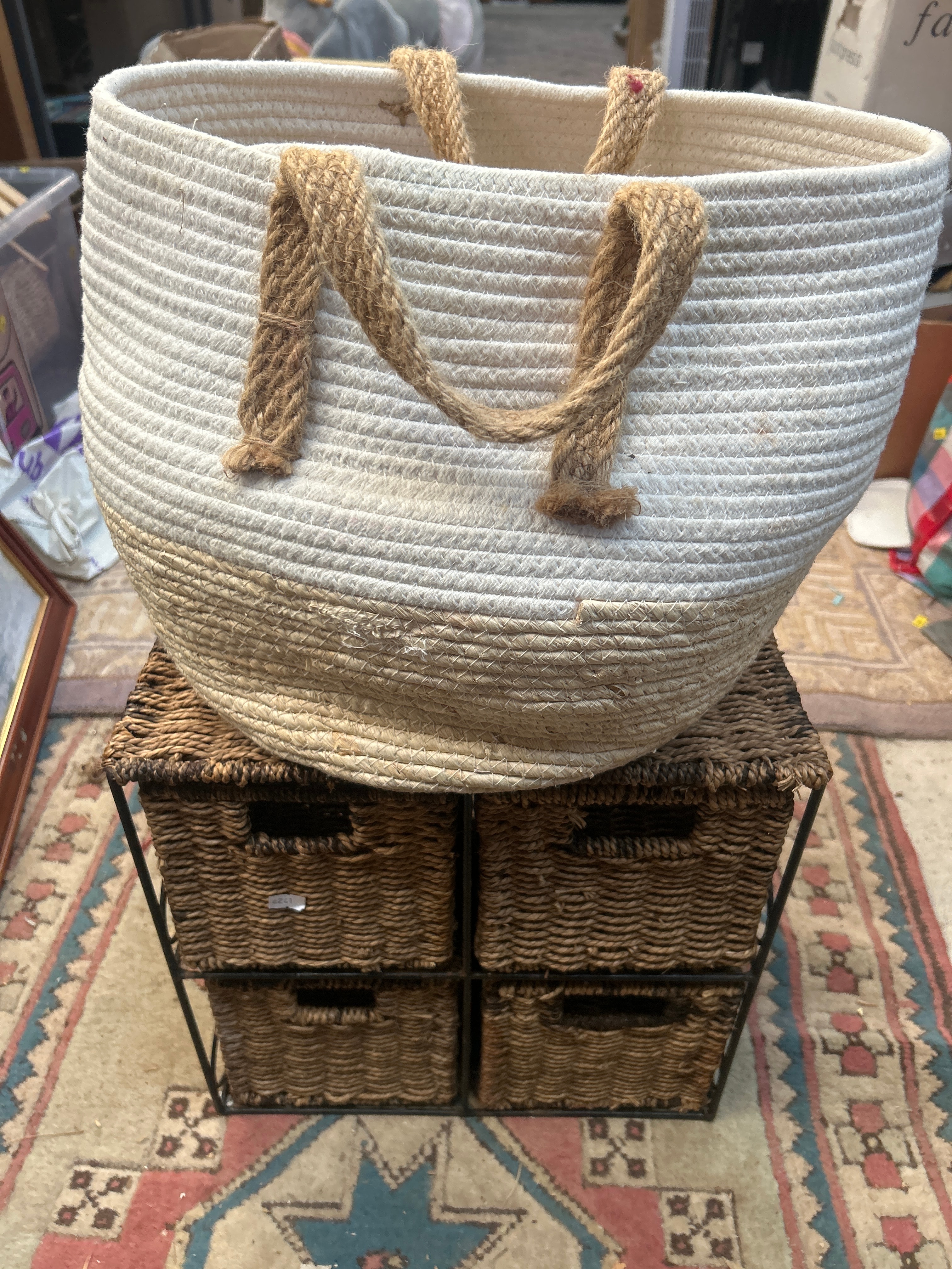 A Dovecove Althoff rope woven storage basket, crafted from coiled rope, predominantly in a cream or off-white color, with its lower band and two integrated loop handles made from a coarser, light brown natural fiber, likely jute or sisal. This basket is presented atop a four-drawer storage unit, which features four individual woven wicker or natural fiber drawers, appearing to be rattan or seagrass, set within a minimalistic black metal open-frame structure. A small white sticker bearing the number ‘6221’ in black text is affixed to one of the wicker drawers.