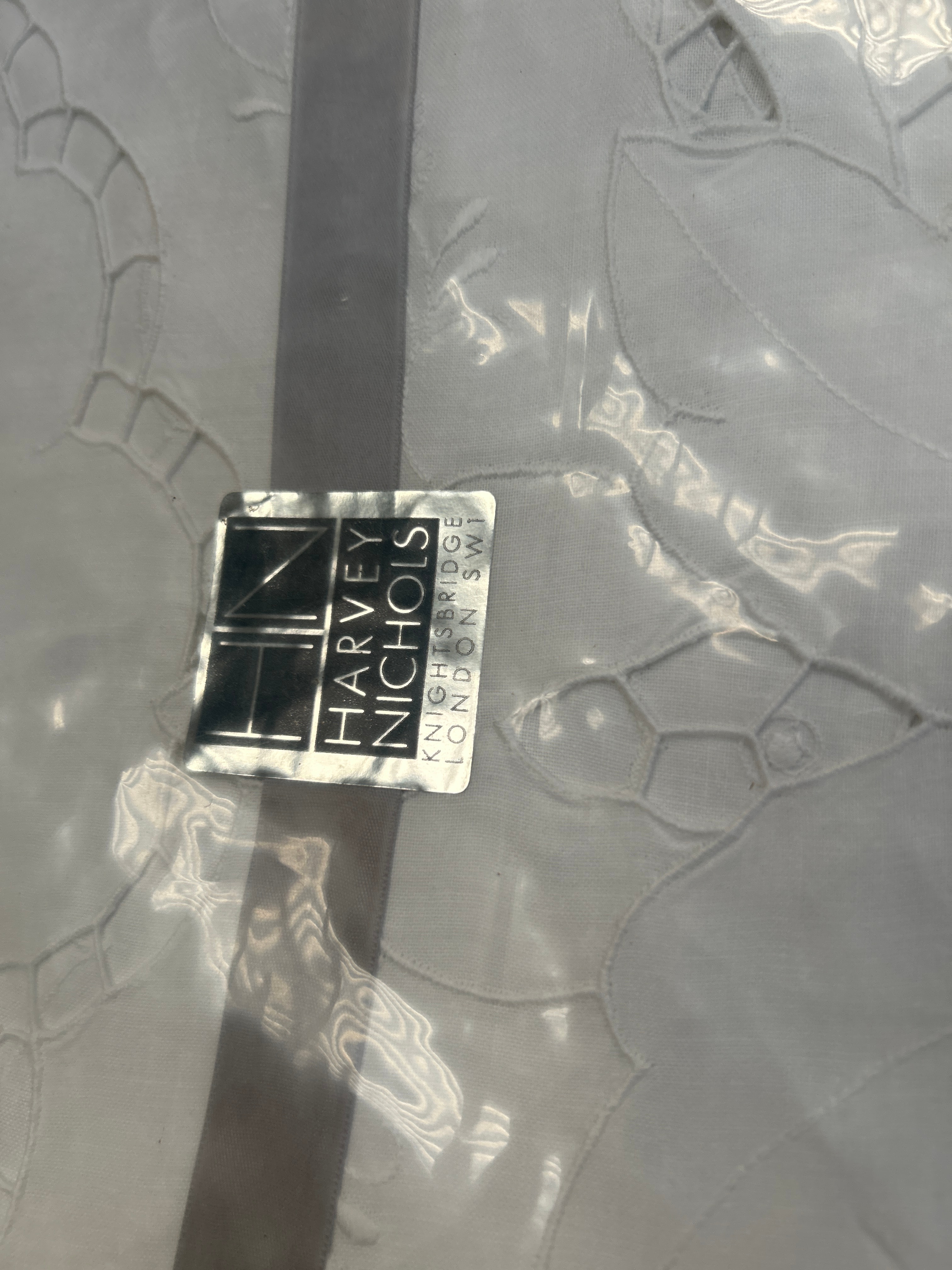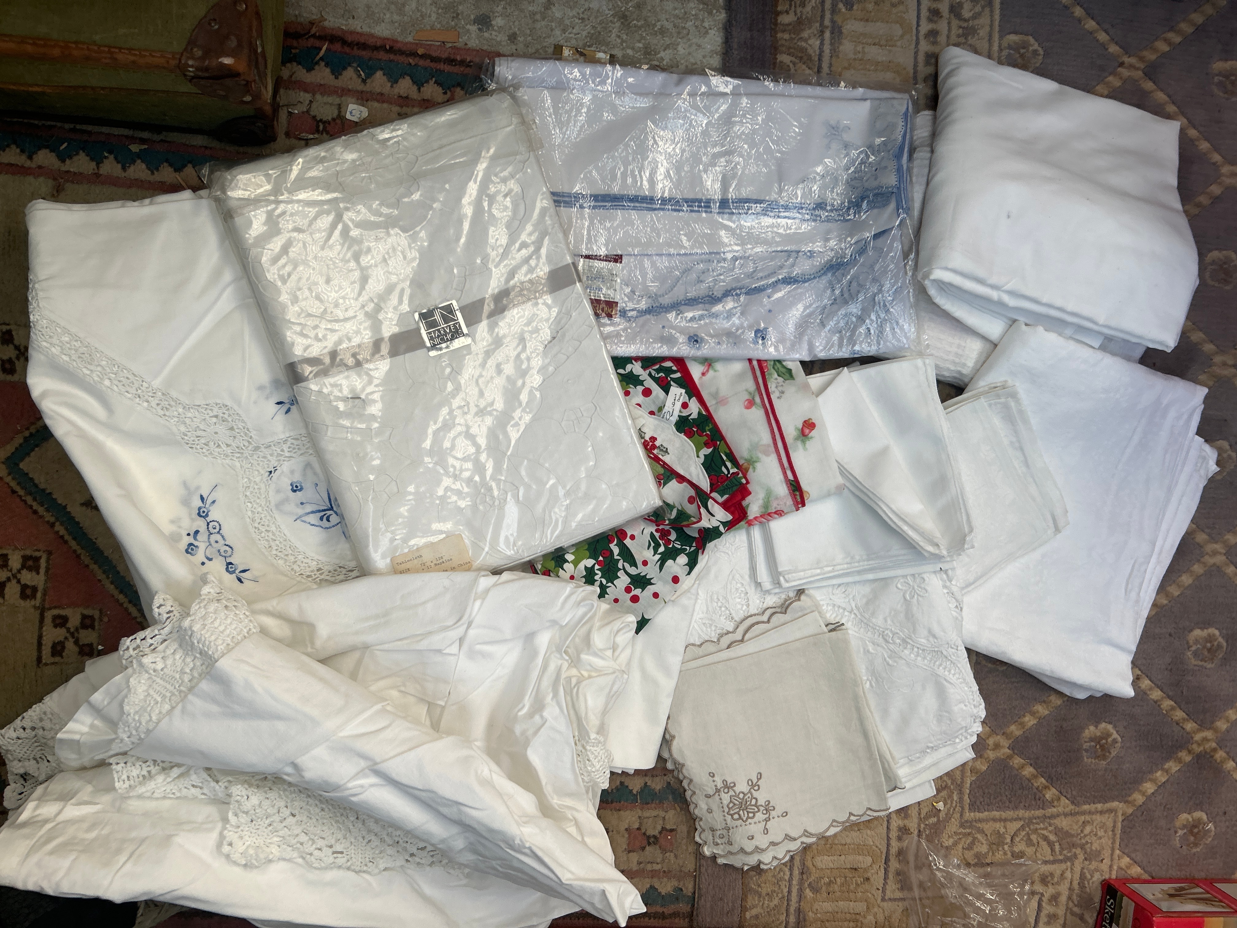 A diverse collection of new and pre-owned household linens and textiles. The assortment includes various white or off-white items such as tablecloths, napkins, and placemats. Decorative styles present include intricate white lace borders, openwork embroidery, and blue floral embroidery. One distinct piece features a festive Christmas-themed pattern with holly and berries. Several items remain sealed in clear plastic packaging, with one notable piece bearing a black and white label that reads “HARVEY NICHOLS KNIGHTSBRIDGE LONDON SW1.” The visible materials appear to be predominantly cotton or cotton blends.