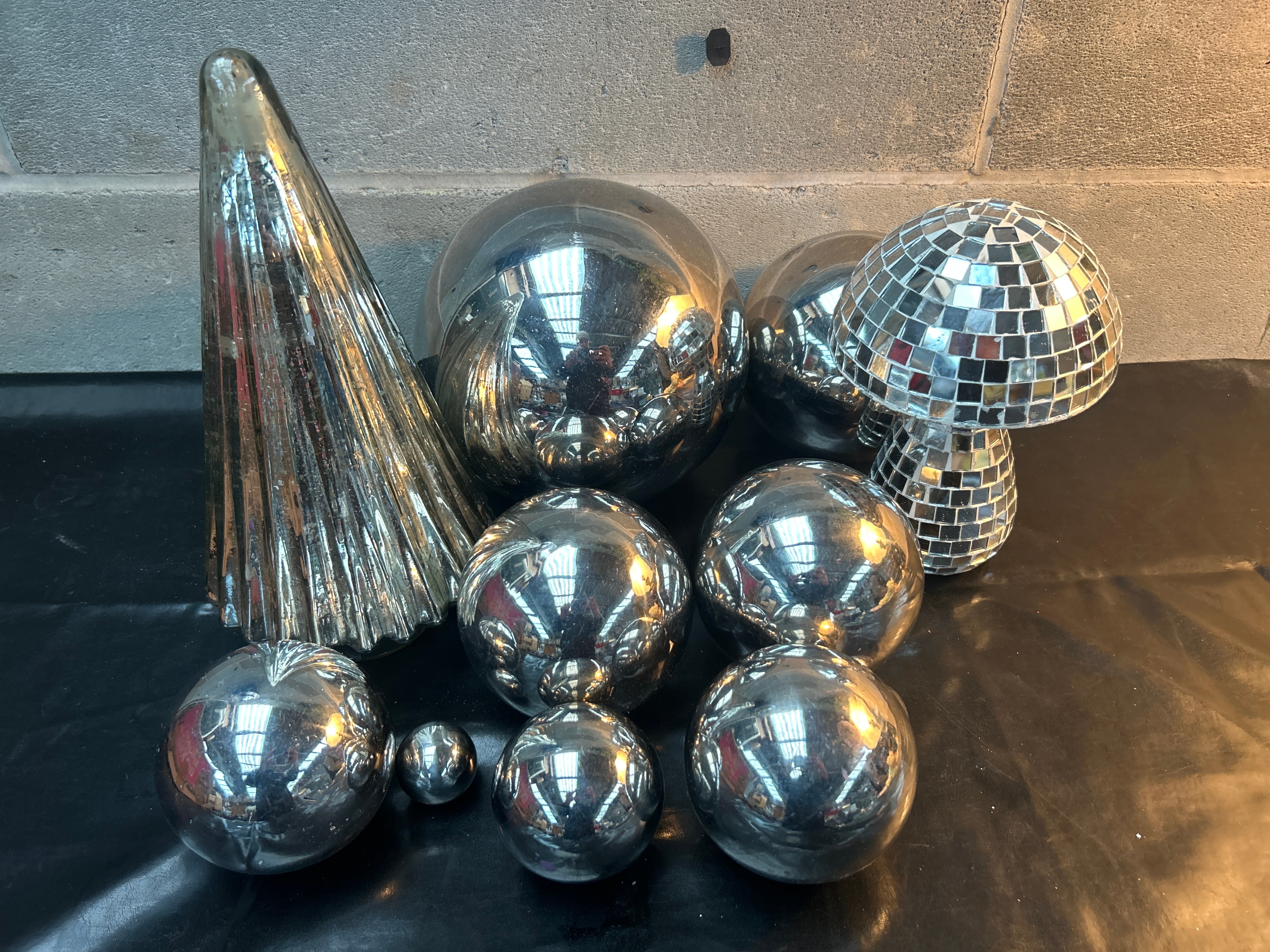 A group of modern and retro-style reflective decorative objects, comprising a fluted conical form, four large and two smaller smooth spheres, and a mushroom-shaped item. The cone and spheres exhibit a highly reflective, possibly mercury glass or chrome-plated finish. The mushroom is composed of small, square mirrored tiles, creating a disco ball aesthetic. No visible text or manufacturer’s markings are apparent.