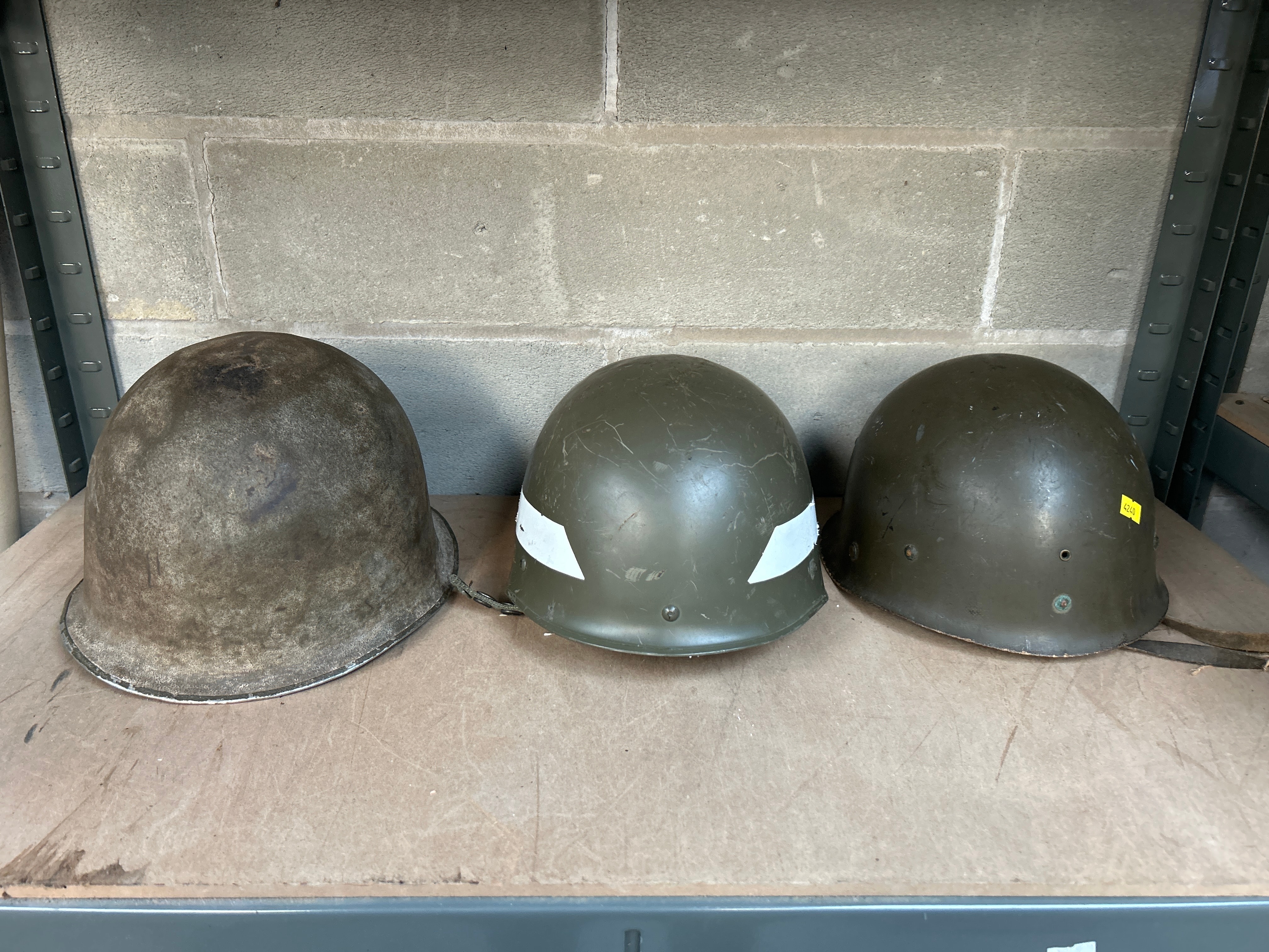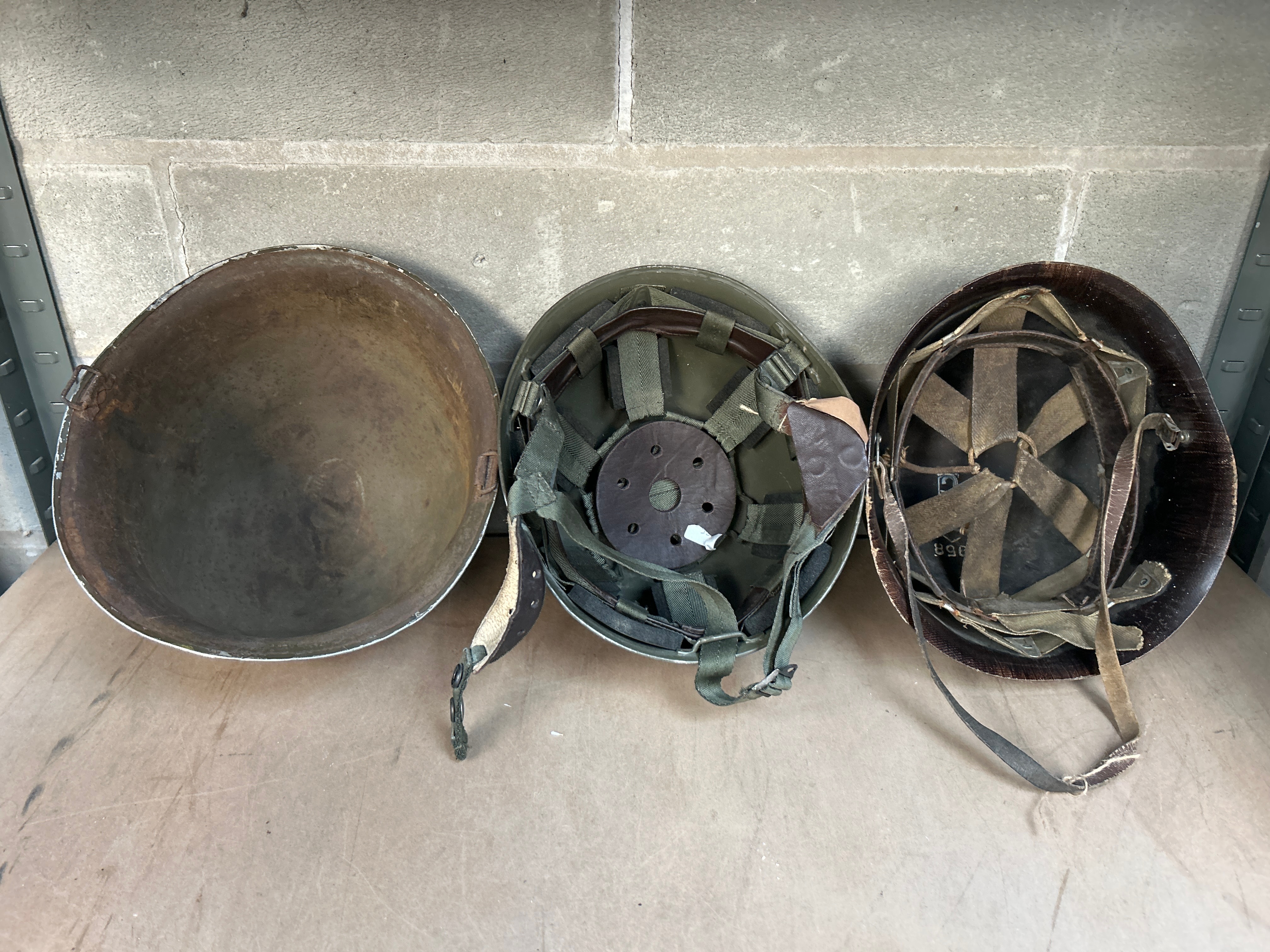 This lot features three military-style helmets, likely dating to the mid-20th century. The leftmost helmet is a heavily oxidized and discolored metal shell with significant surface wear. The central helmet is a dark green painted metal shell featuring two white, angular “cat eye” markings on the front, exhibiting numerous scratches and scuffs, and revealing a green webbing internal liner. The rightmost helmet is also a dark green painted metal shell with scuffs and paint loss, featuring a small yellow sticker with “30.00” written on its exterior, and an internal brown fabric and leather strap liner clearly marked “U.S.N.” (United States Navy) on one of its straps. All three helmets display varying degrees of wear, consistent with age and previous use.