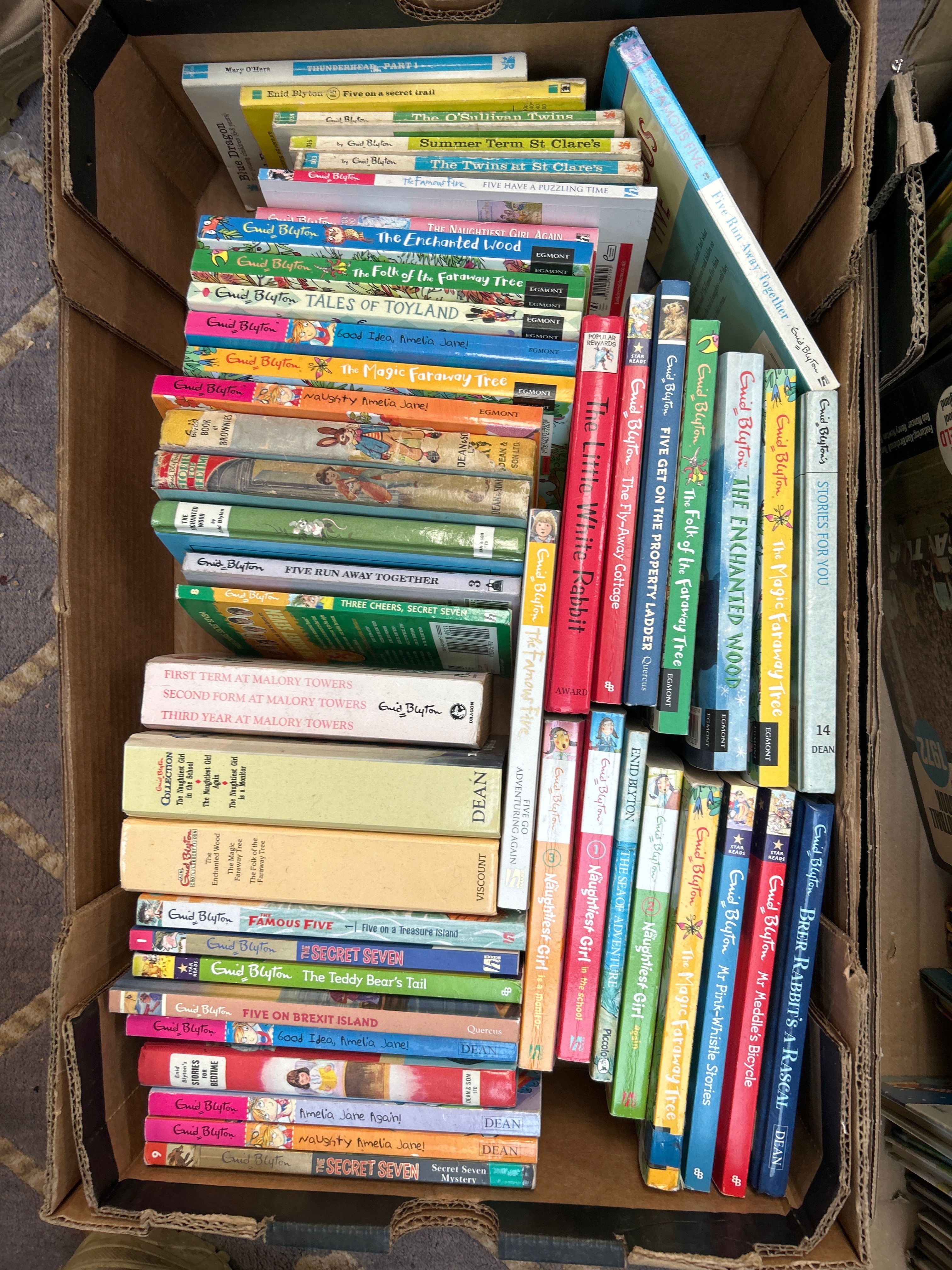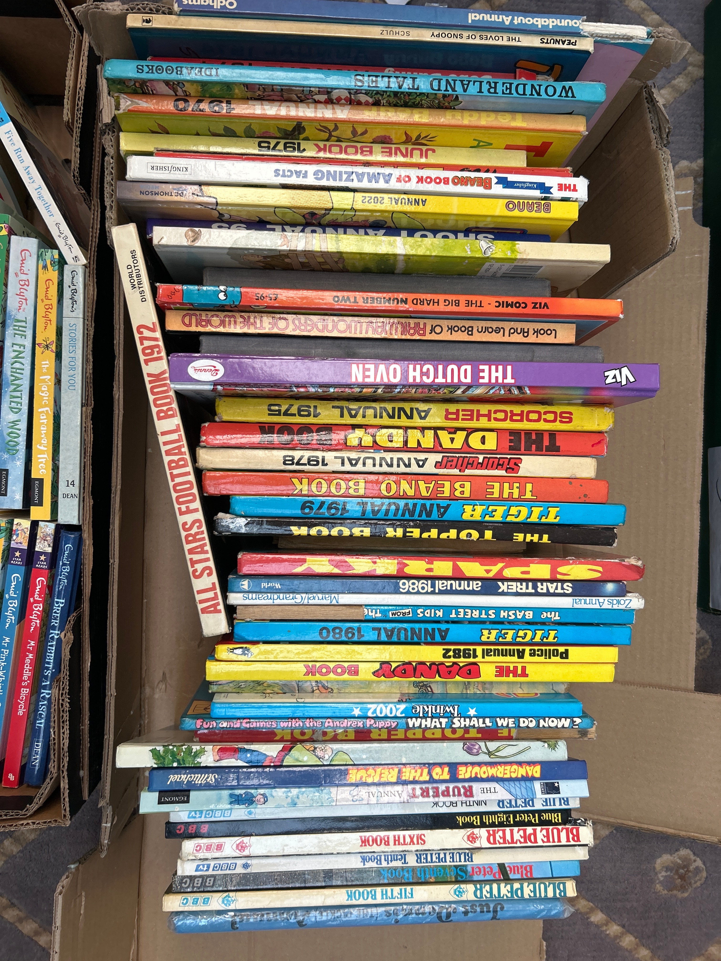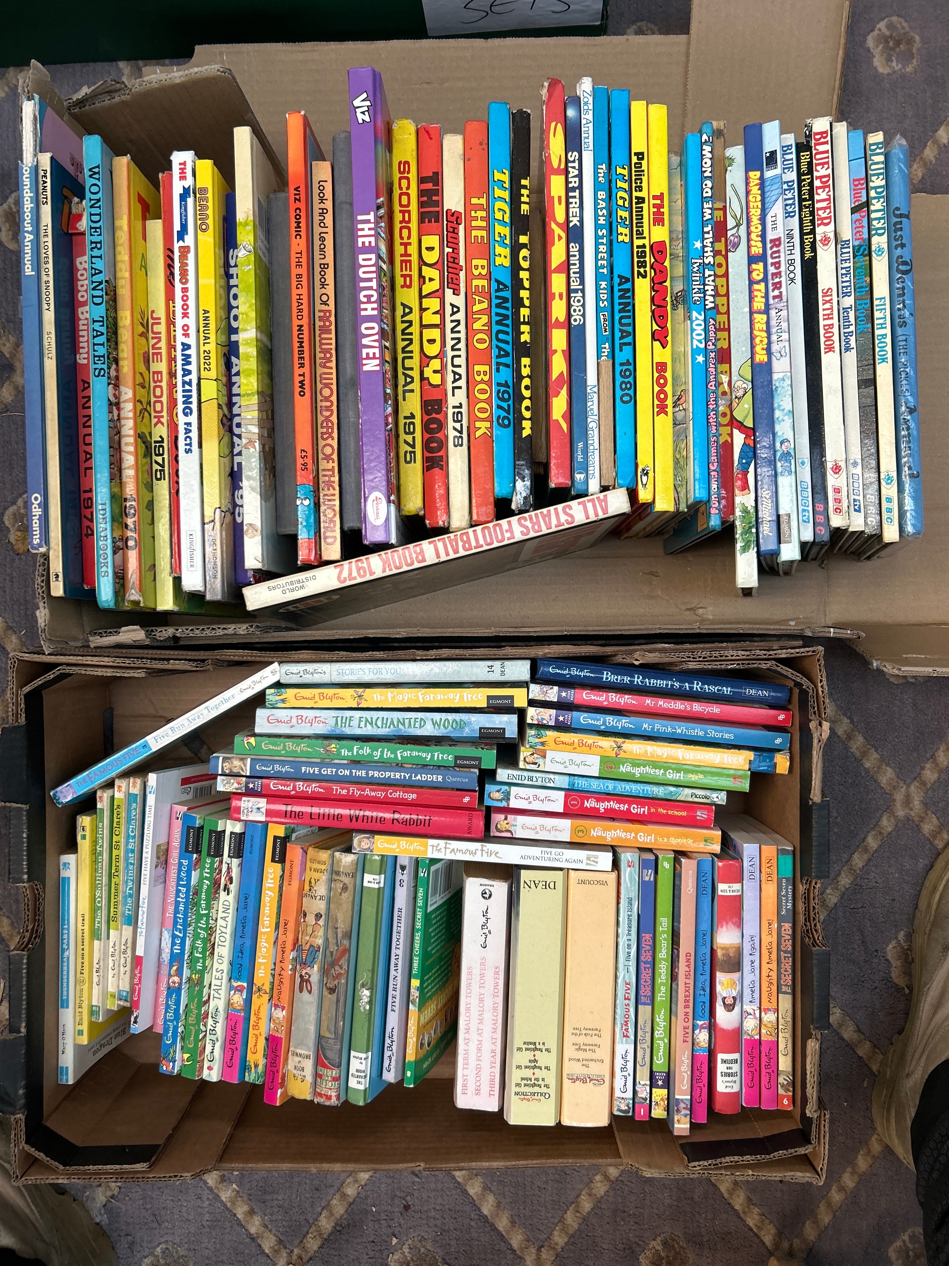 This lot comprises approximately 100-150 used books, primarily children’s fiction, comics, and annuals, contained within two cardboard boxes. The top box holds a variety of mostly hardcover annuals such as “The Dandy Book,” “The Beano Book,” “Tiger Annual,” “Scorcher Annual,” “Rupert Annual,” “Blue Peter Book,” and “Star Trek Annual,” with visible publication dates spanning from the 1970s through the 1980s and some up to 2022, alongside “Viz Comic” issues and “All Stars Football Book 1972.” The bottom box predominantly features numerous softcover children’s fiction titles by Enid Blyton, including books from the “Malory Towers,” “Famous Five,” “Secret Seven,” “Noddy,” and “Amelia Jane” series. All books are constructed from paper and cardboard. No foreign language text requiring translation is visible.