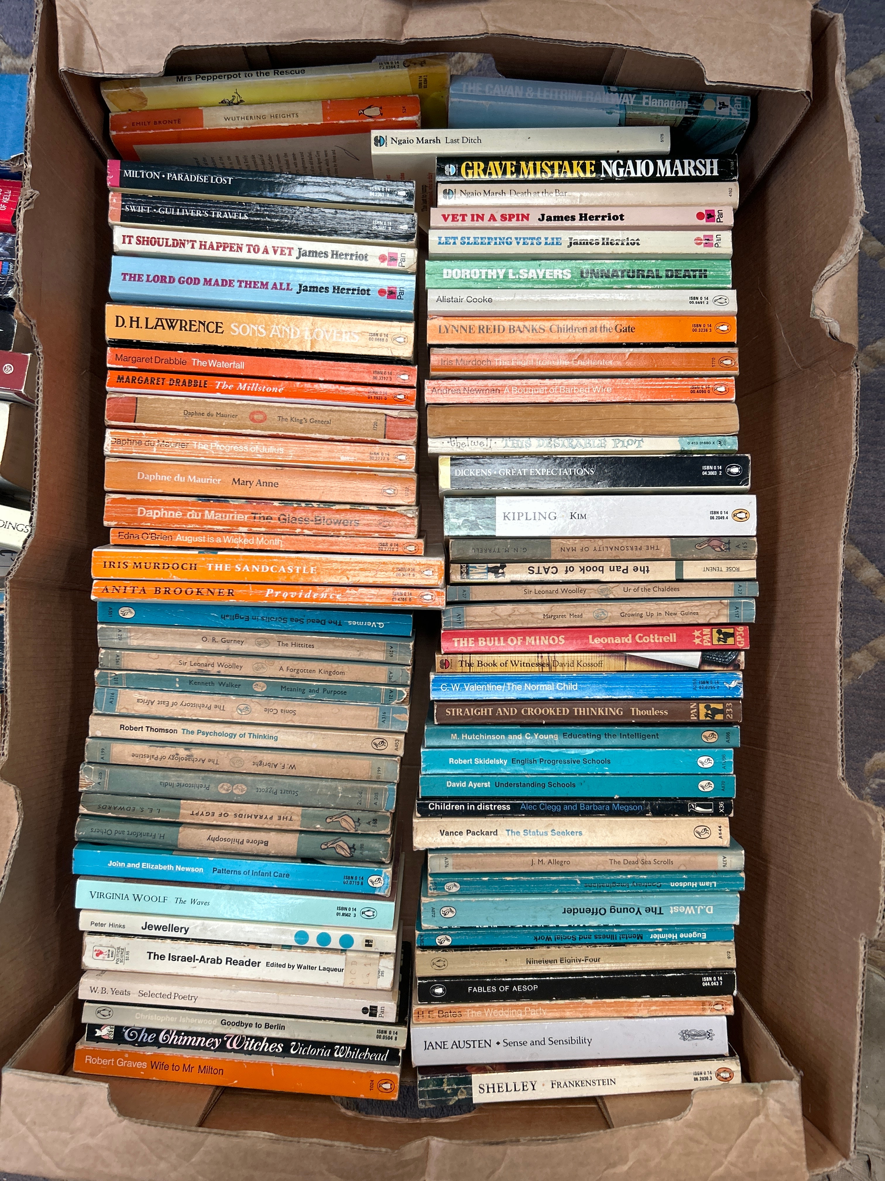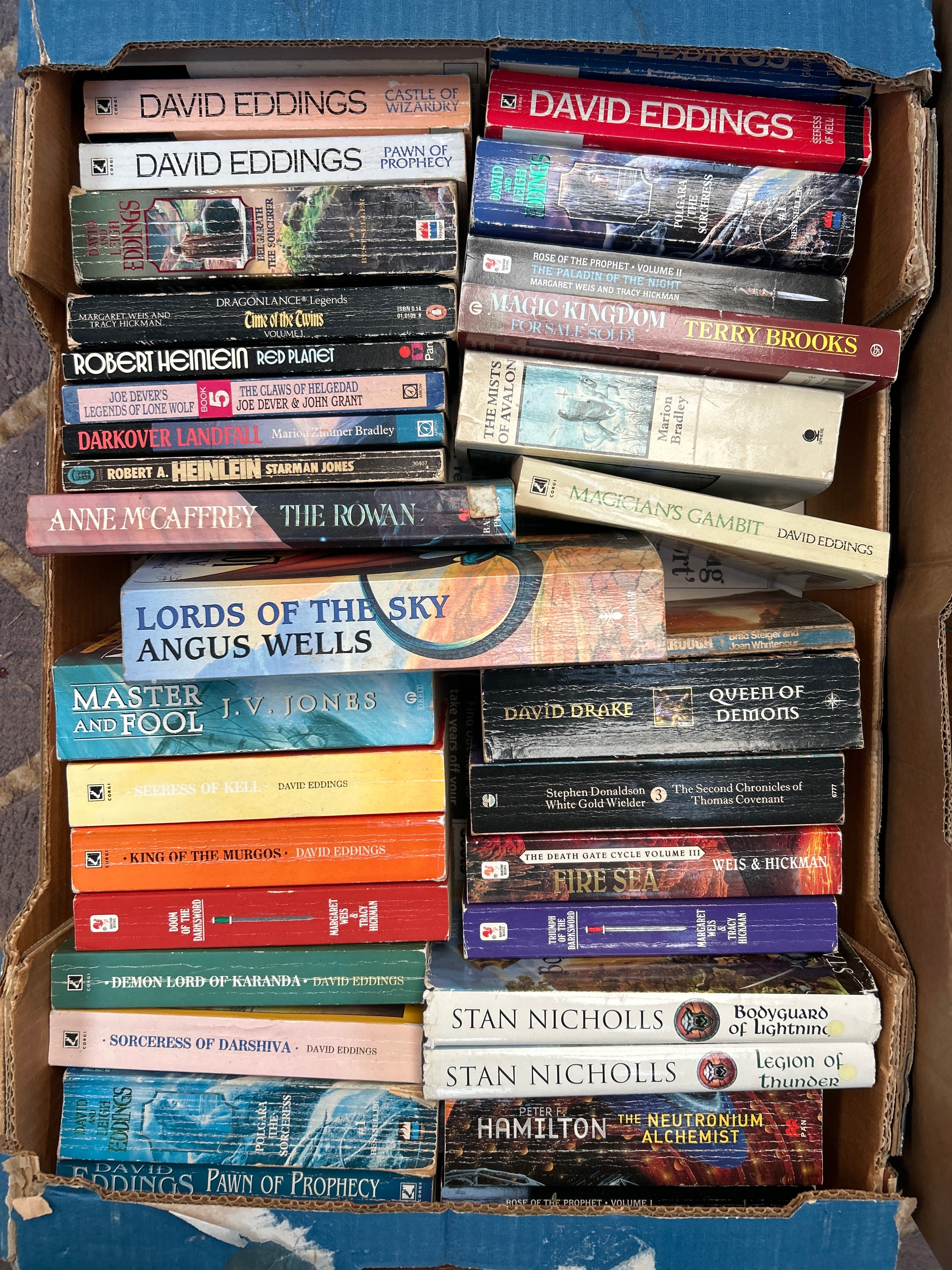 A substantial collection comprising several hundred books, presented in multiple large, used corrugated cardboard boxes. The collection is diverse, featuring both paperback and some hardcover volumes. Genres primarily include fantasy and science fiction, with prominent authors such as David Eddings, Terry Brooks, Anne McCaffrey, and Robert Heinlein. Also present are classic literature titles by authors including Virginia Woolf, Jane Austen, and Mary Shelley, alongside various mystery and non-fiction works. Specific visible titles include “Lords of the Sky,” “Pawn of Prophecy,” “The Mists of Avalon,” “Frankenstein,” and “Great Expectations.” All discernible text is in English. Publication styles and cover art suggest a span from the mid-20th to early 21st century. One volume is noted to have a “For Sale Sold” marking.