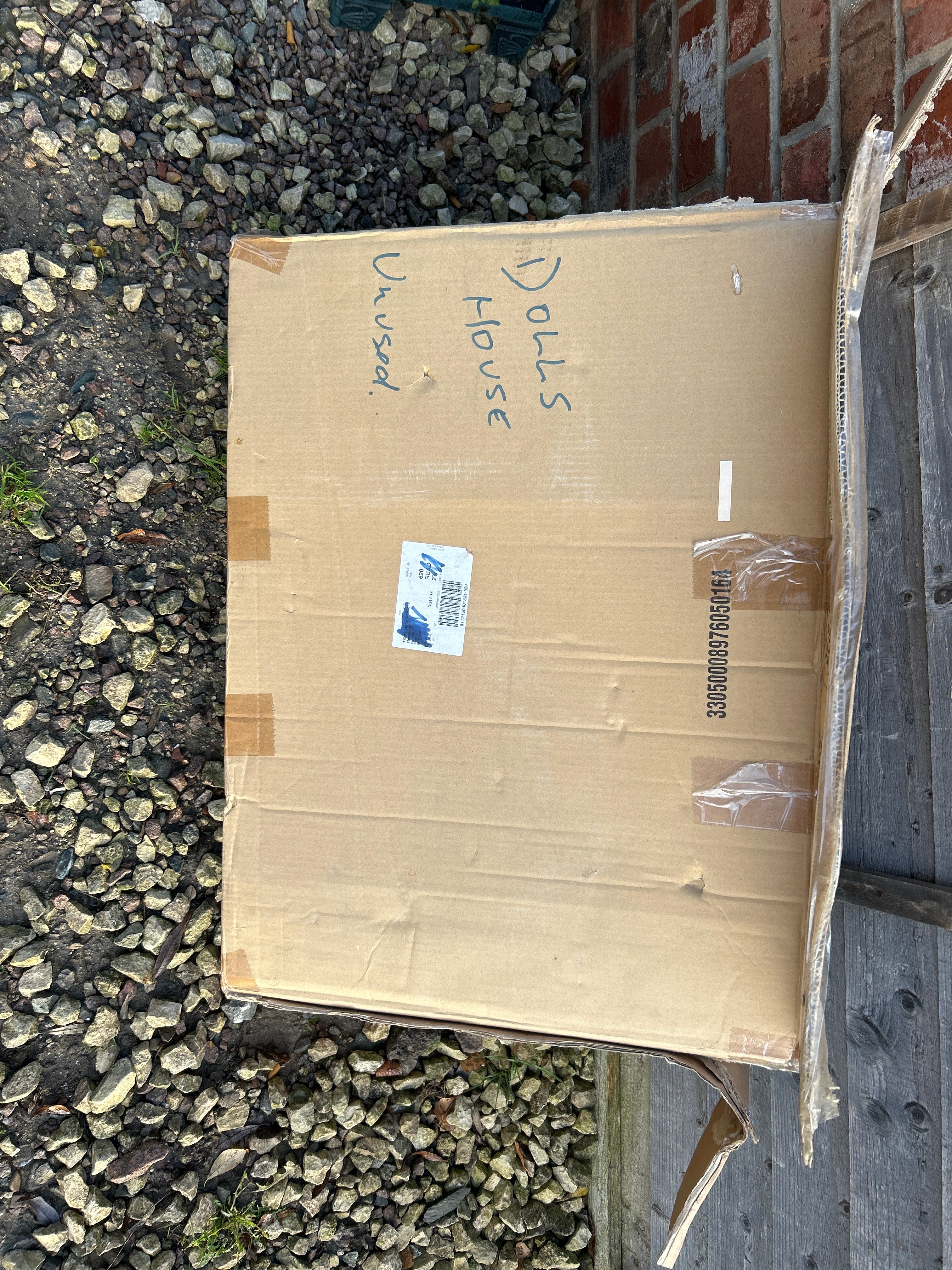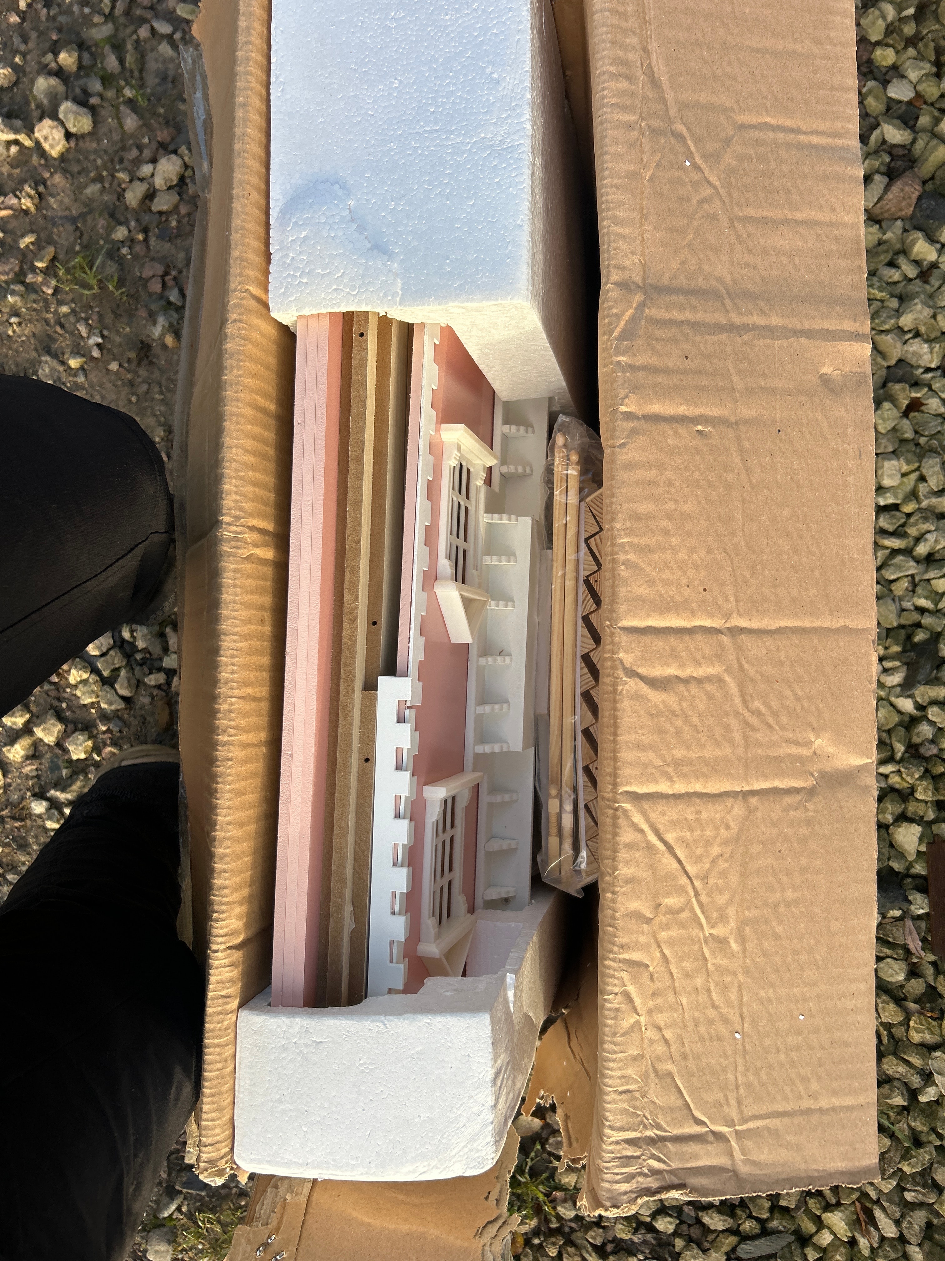 An unused contemporary flat-pack dollhouse. Housed within its original cardboard shipping box, the unassembled components include pink-painted panels, white decorative architectural elements, and natural wood-toned pieces. The parts are made of wood or MDF and are protected by white styrofoam within the box. The exterior of the shipping box is marked ‘Dolls House’ and ‘Unused.’, along with a shipping label and the printed number ‘3300000976050106’.