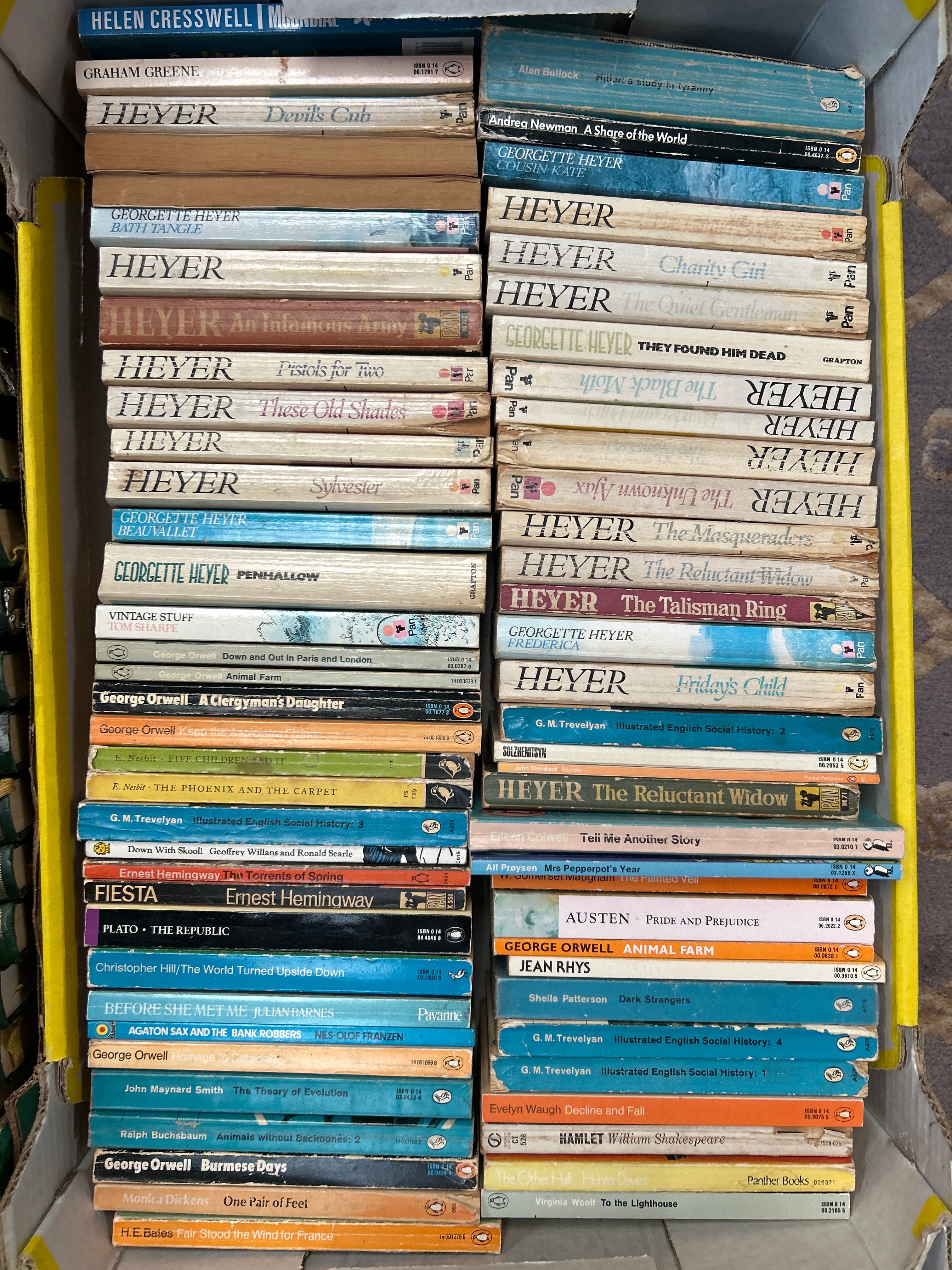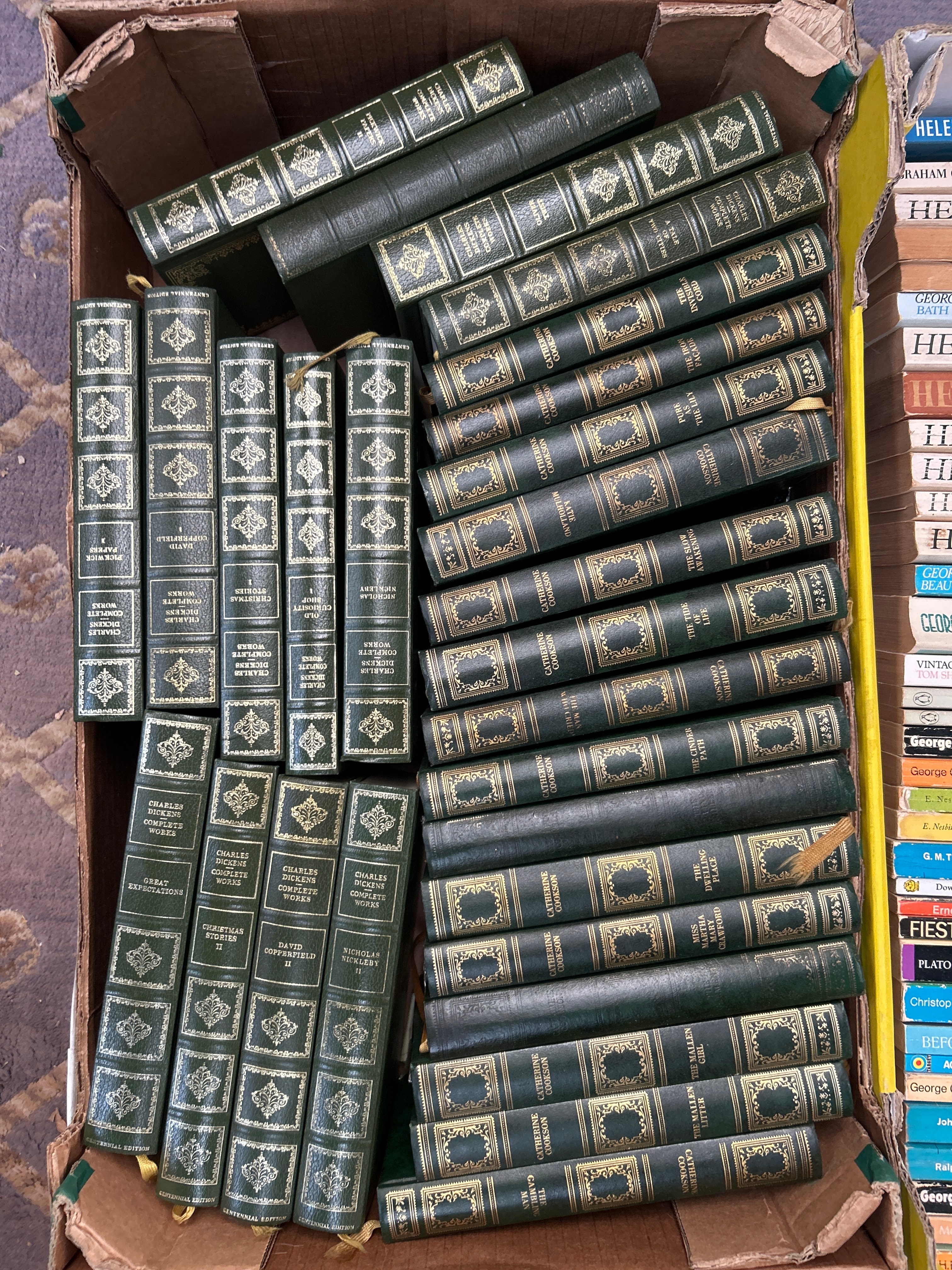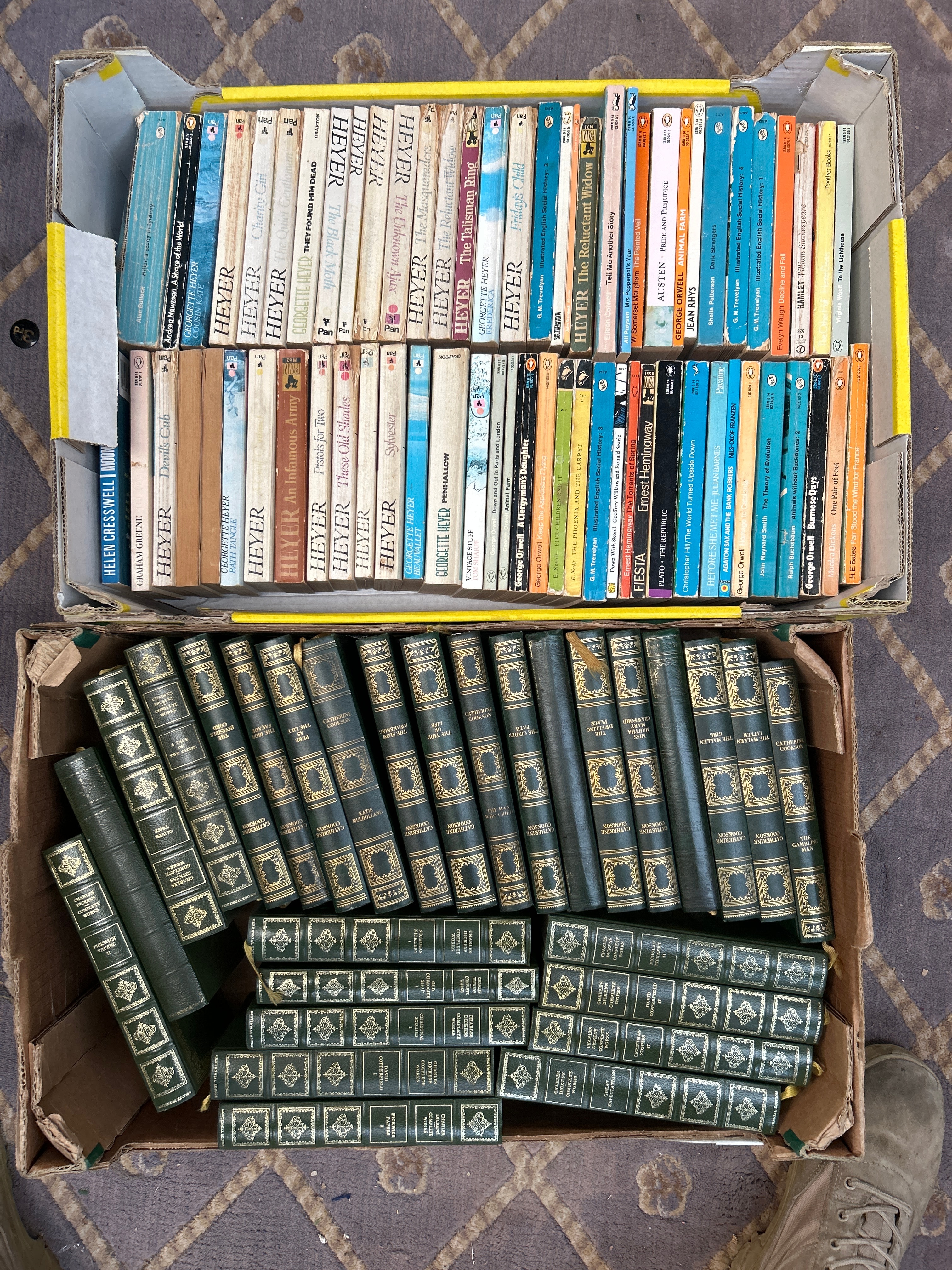 A 54-volume set of the Britannica Great Books of the Western World, published in 1952. This multi-volume set features uniform dark green or possibly dark blue cloth/leatherette bindings extensively decorated with gold tooling on both spines and front covers. Specific titles clearly identifiable include ‘David Copperfield,’ ‘Oliver Twist,’ ‘Great Expectations,’ ‘A Tale of Two Cities,’ and ‘The Pickwick Papers.’ Also included is a collection of approximately 60-70 mass-market paperbacks and some slimmer hardcovers, predominantly fiction from the mid to late 20th century. Visible authors include Georgette Heyer (with many titles), George Orwell, Ernest Hemingway, Graham Greene, and Jane Austen, published by imprints such as Penguin, Pan, and Dent. These books display varied cover art, typical of their period.