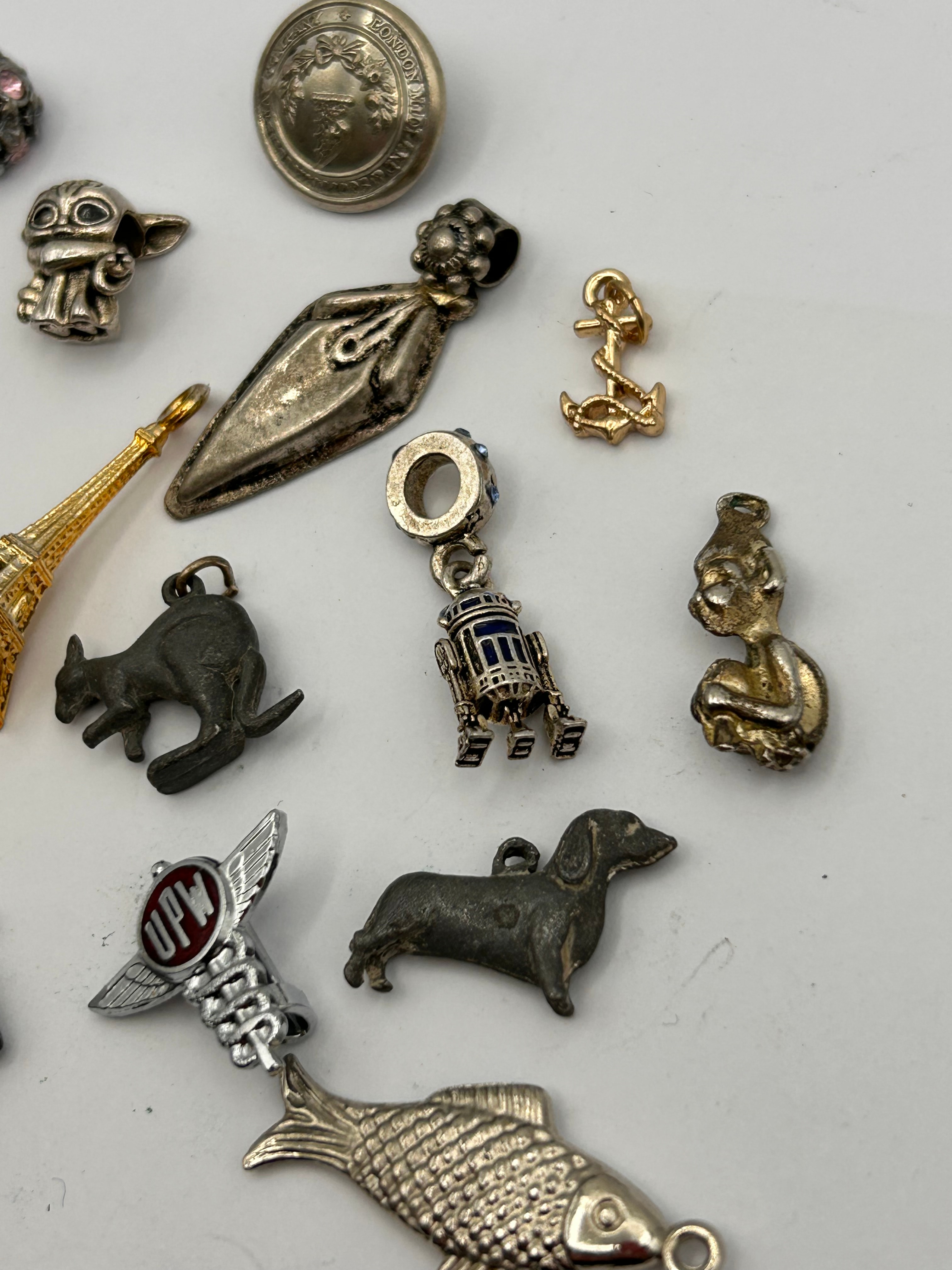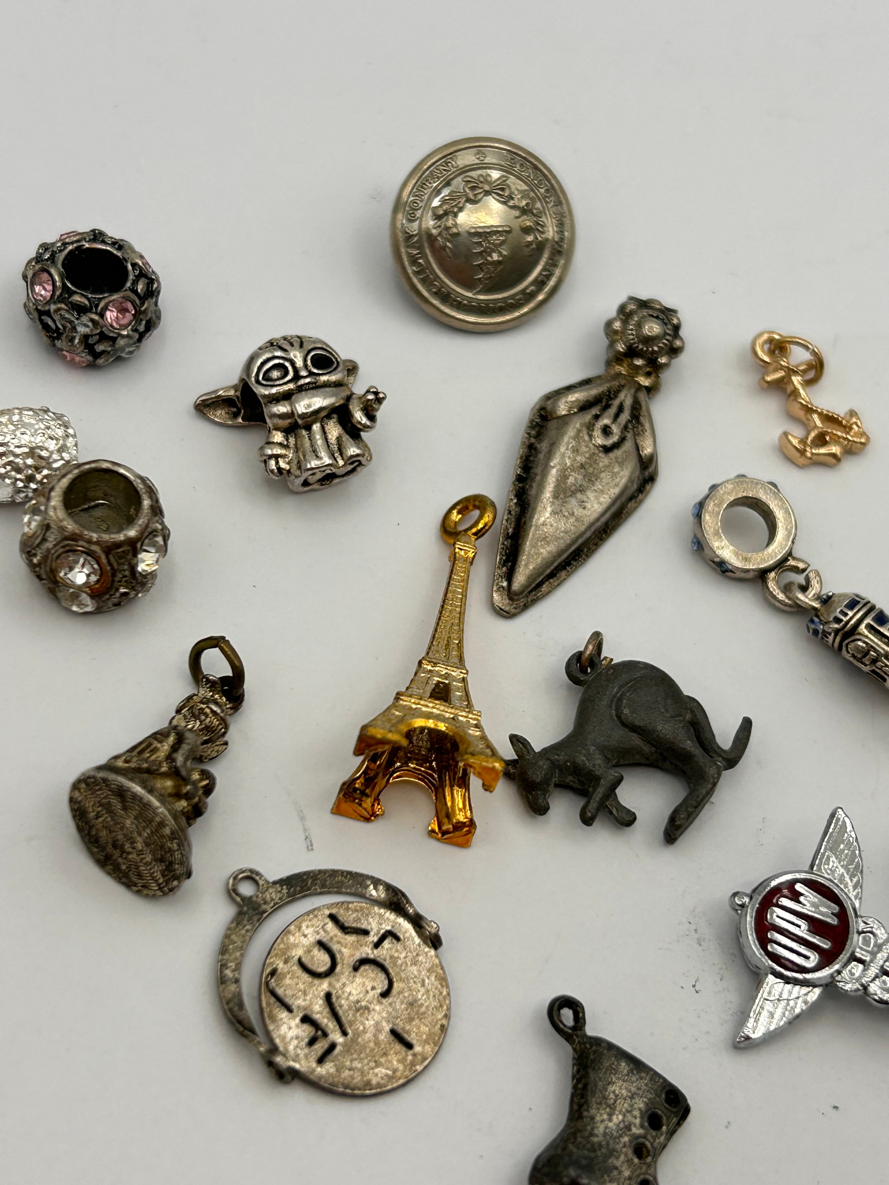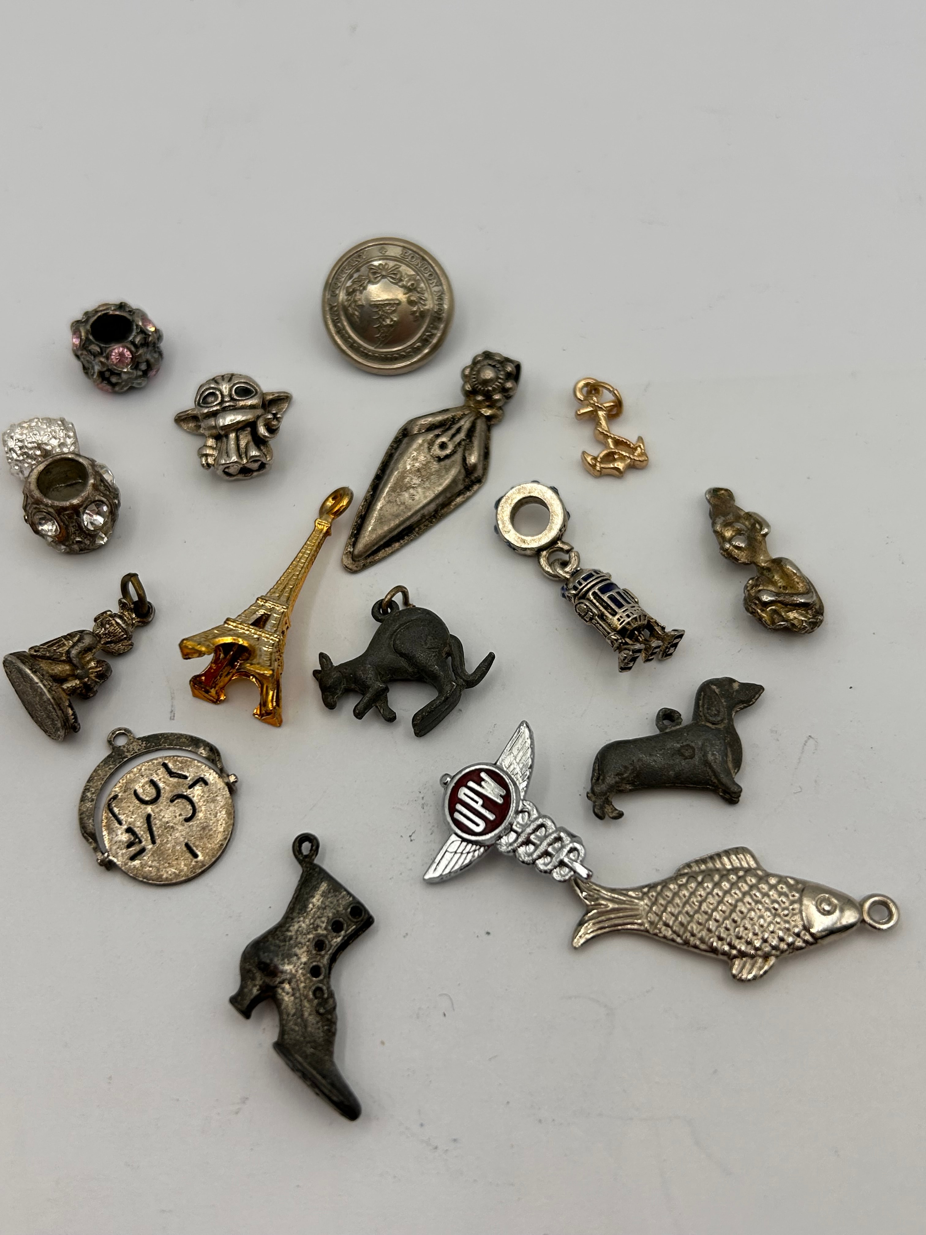 This lot comprises approximately eighteen assorted costume jewelry charms, a button, and two decorative beads, presenting an eclectic mix of styles and themes. Featured charms include contemporary popular culture figures such as “Baby Yoda” and “R2-D2,” alongside animal motifs like a dachshund, kangaroo, cat, and a fish. Additional designs include a golden Eiffel Tower with an orange translucent body, a stylized anchor, an ornate silver-tone drop-pendant, a genie-like figure, a small bell-shaped charm, and a round charm resembling an antique clock face with stylized Roman numerals (“XII, I, II, III” visible). A winged silver-tone emblem displays the initials “UPW” in a red circle. Materials appear to be primarily base metals in silver-tone, gold-tone, and bronze-tone finishes, with some items incorporating minor enamel detailing (e.g., blue on R2-D2), and faceted clear or pink stones set into the two larger beads. A central round button features a classical profile surrounded by largely unreadable text, possibly “COMMERCE” or similar. The items are generally of modern to contemporary period.