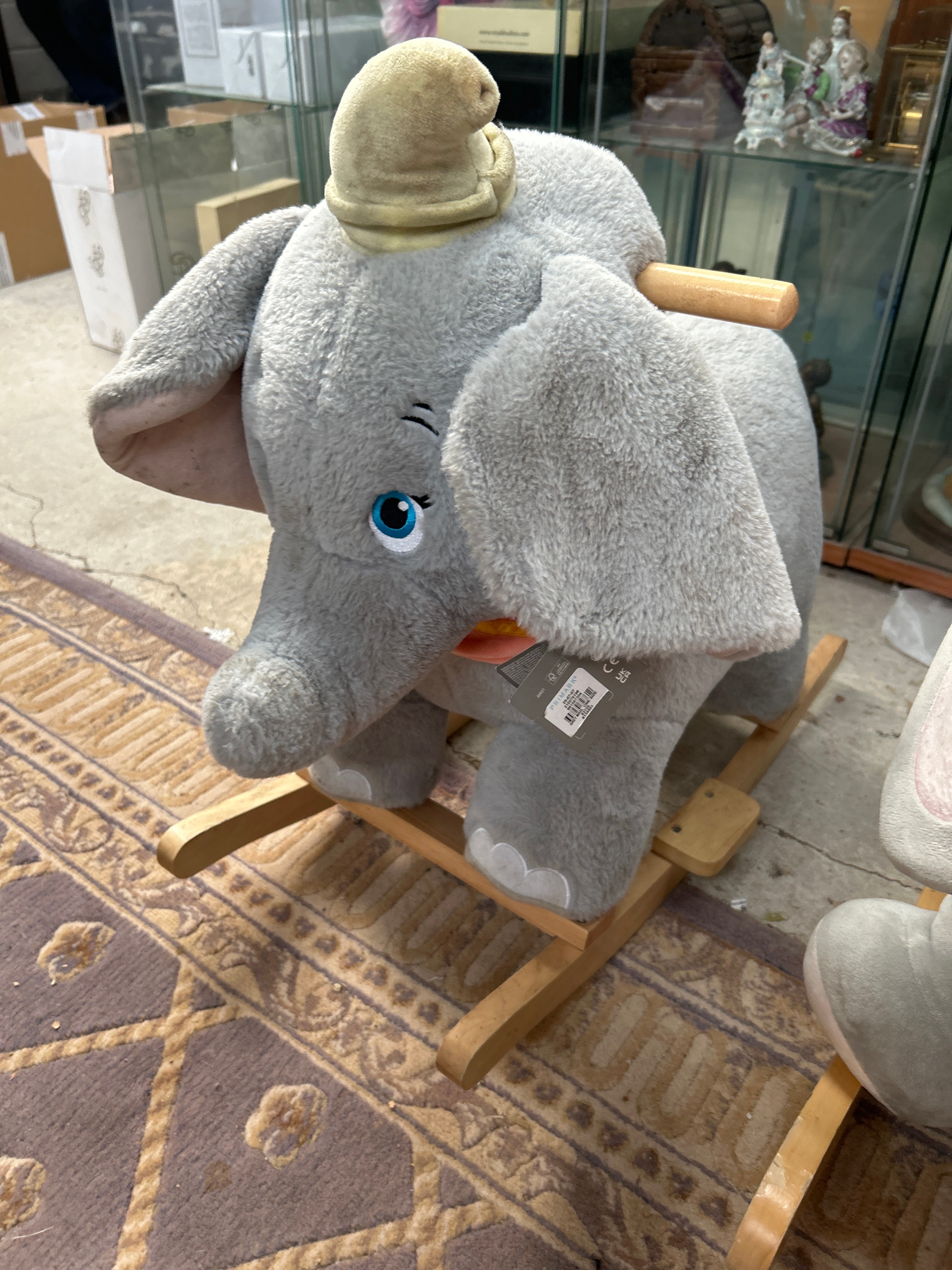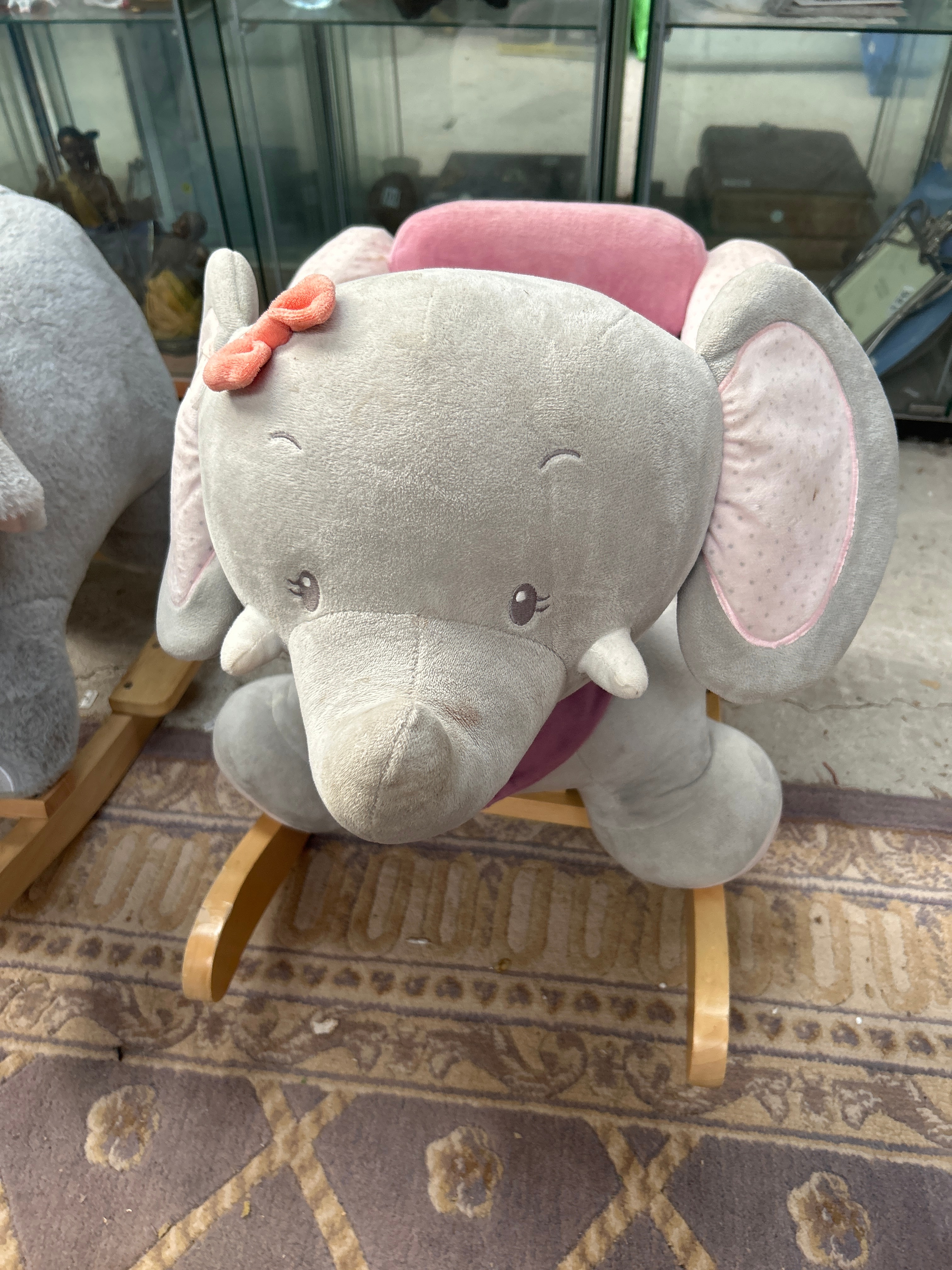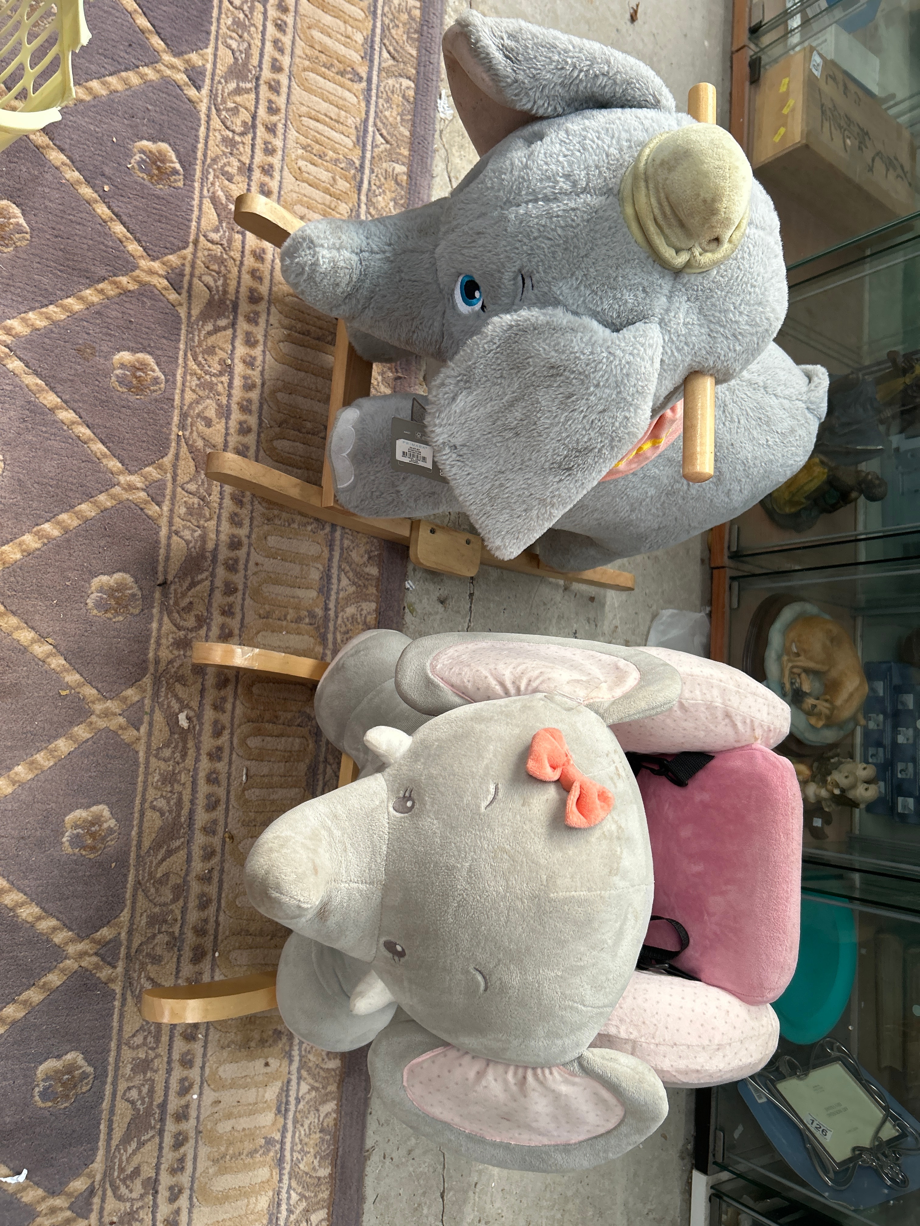 A pair of contemporary plush rocking elephant toys, each constructed with a gray fabric exterior and mounted on light wood rocking bases. The first elephant features embroidered blue eyes, a yellow conical hat, and a plaid neck scarf, with a retail tag partially visible on its side. The second elephant presents with embroidered closed eyes and eyelashes, a pink bow on its head, and pink polka-dotted inner ear linings and a matching pink seat.