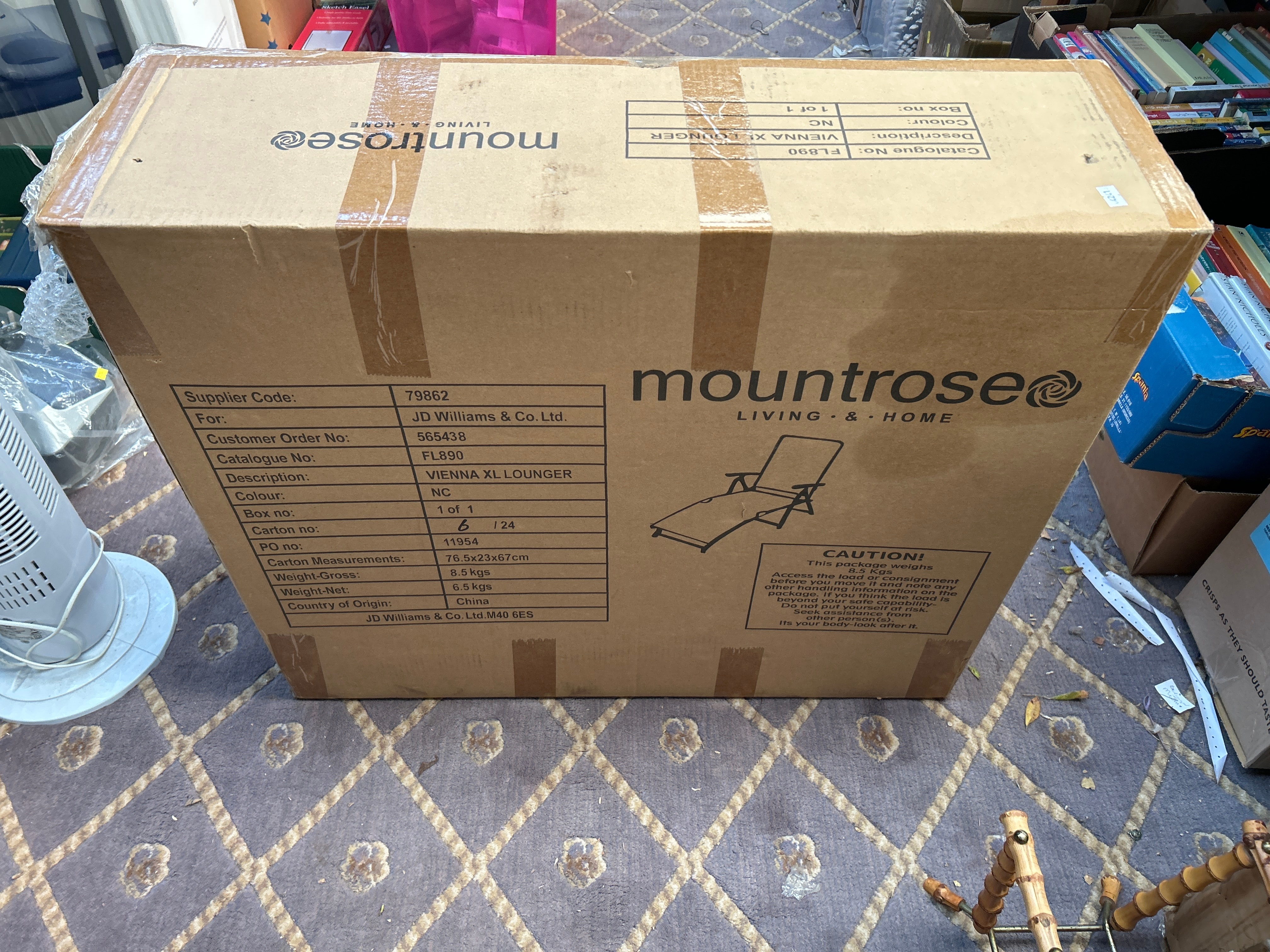 A mountrose LIVING & HOME ‘Vienna XL Lounger’, offered new in its factory-sealed corrugated cardboard shipping box. The packaging is secured with brown packing tape and some clear plastic film, and features a line drawing of the reclining lounge chair contained within. Printed details on the box identify the item as Catalogue No. FL890 and state ‘Country of Origin: China’. A ‘CAUTION!’ label provides handling instructions related to the package’s weight.