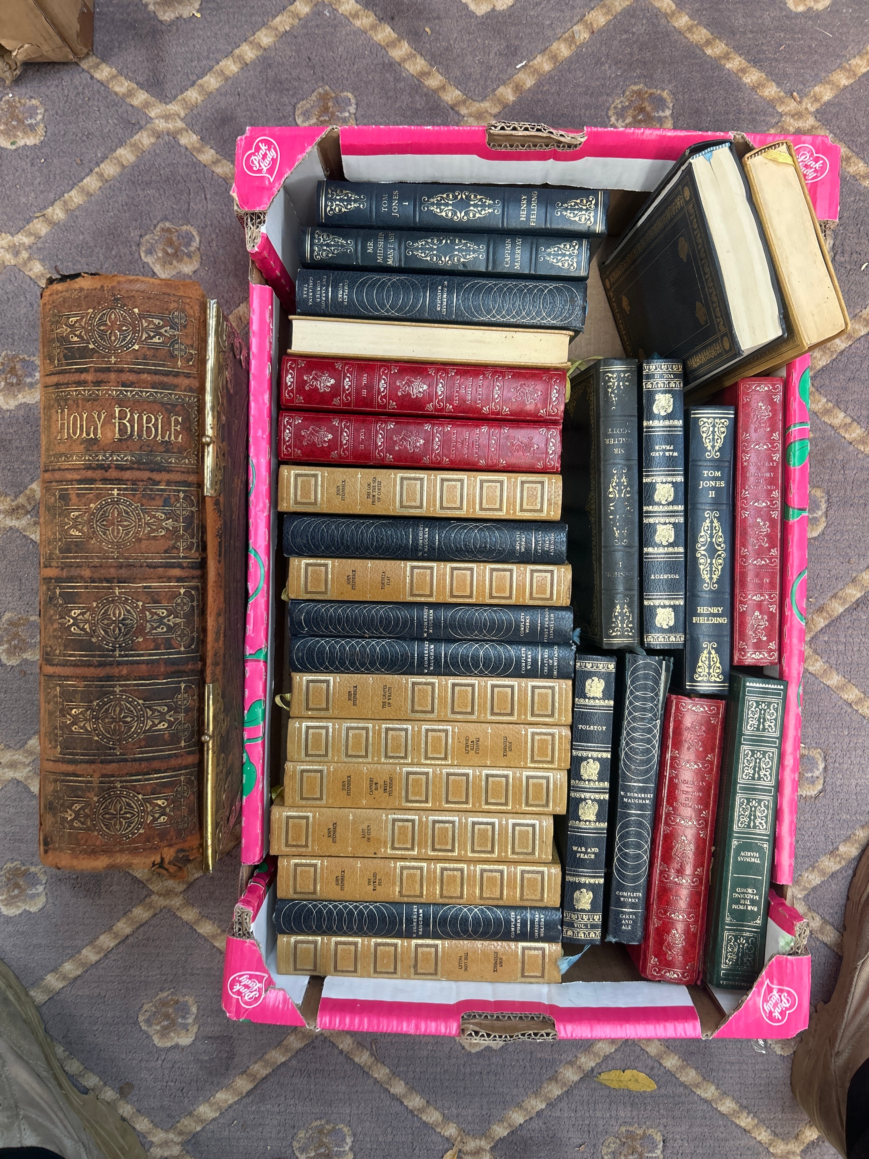 A collection of approximately 40-50 books. The majority of the collection consists of Franklin Library editions, uniformly bound in various colors including dark blue/black with gilt decorative spines and titles, red with gilt lion rampant emblems, and light brown/tan with gilt rectangular frames. Noted titles include works by Henry Fielding (“TOM JONES I,” “TOM JONES II”), Captain Marryat (“MR. MIDSHIPMAN EASY”), Sir Walter Scott, Tolstoy (“WAR AND PEACE”), W. Somerset Maugham (“COMPLETE WORKS,” titles such as “FIRST PERSON SINGULAR,” “CREATURES OF CIRCUMSTANCE,” “CHRISTMAS HOLIDAY,” “CAKES AND ALE”), John Steinbeck (“THE GRAPES OF WRATH,” “TRAVELS WITH CHARLEY,” “CANNERY ROW,” “SWEET THURSDAY,” “EAST OF EDEN,” “THE LONG VALLEY,” “THE WAYWARD BUS”), Thomas Hardy (“FAR FROM THE MADDING CROWD”), and Macaulay (“HISTORY OF ENGLAND” Vol. II, III, IV). These books are primarily housed within a pink cardboard box with “Pink Lady” branding. Accompanying this collection is one large, heavily embossed brown book featuring a brass clasp, labeled “HOLY BIBLE.”