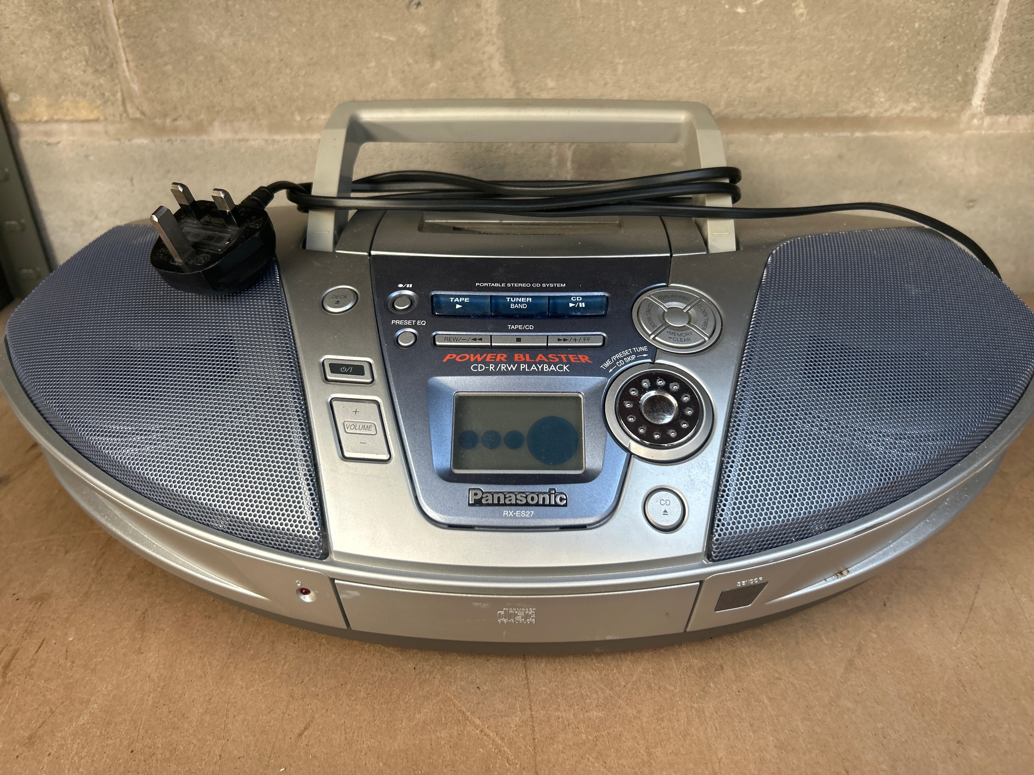 A Panasonic RX-ES27 ‘POWER BLASTER’ portable stereo CD system, featuring CD-R/RW playback, a tape deck, and a radio tuner. The unit is constructed primarily from silver-grey plastic with dark grey perforated metal speaker grilles and includes a central digital display. Visible controls include buttons for volume, preset EQ, various playback functions, and a circular multi-function control dial for tuning or time settings, alongside labels for “CLOCK TIMER” and “MEMORY CLEAR.” A UK-standard 3-pin power plug is attached via a black cable. The item appears to be from the late 1990s or early 2000s.