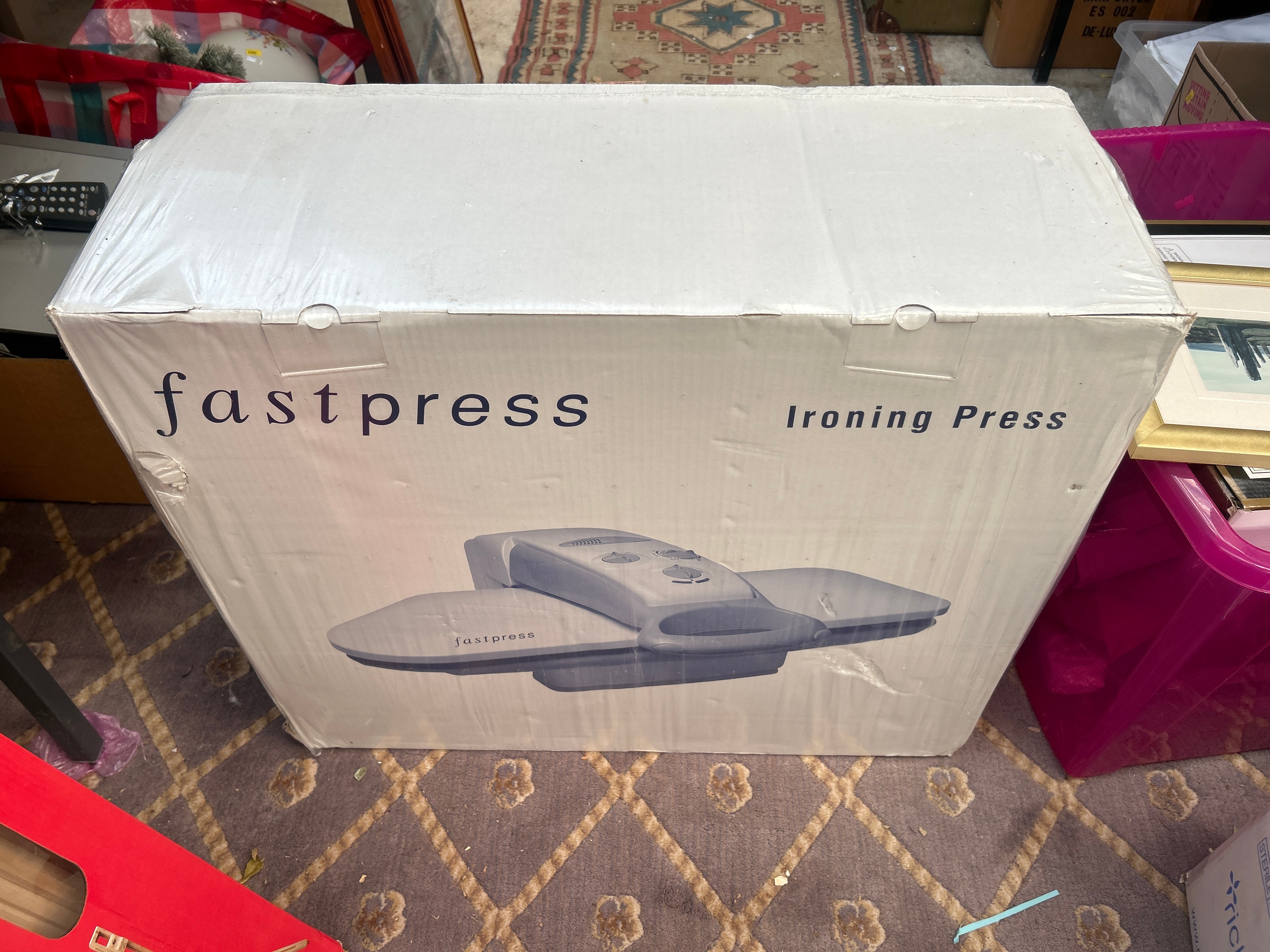 A FastPress Electric Steam Ironing Press. The item is presented in its original white cardboard packaging, which is sealed in clear plastic shrink wrap. The front of the box prominently displays the brand name “fastpress” and the product type “Ironing Press” in dark sans-serif lettering, accompanied by an illustrative image of the light grey and dark grey appliance. The appliance depicted on the box also carries the “fastpress” branding. Web intelligence suggests this model is visually identical to the Singer ESP2 Electronic Steam Press, a widely recognized appliance in the market.