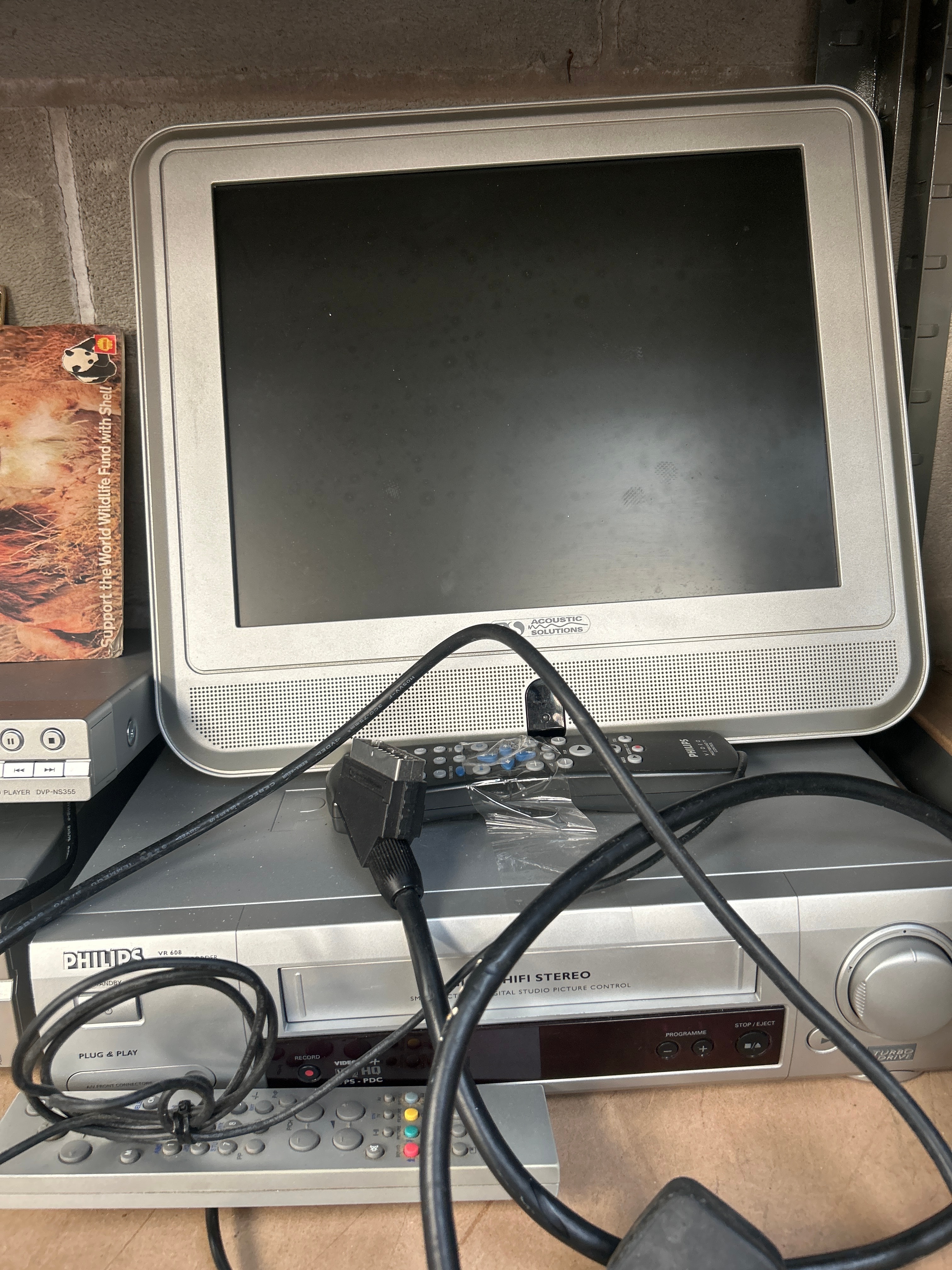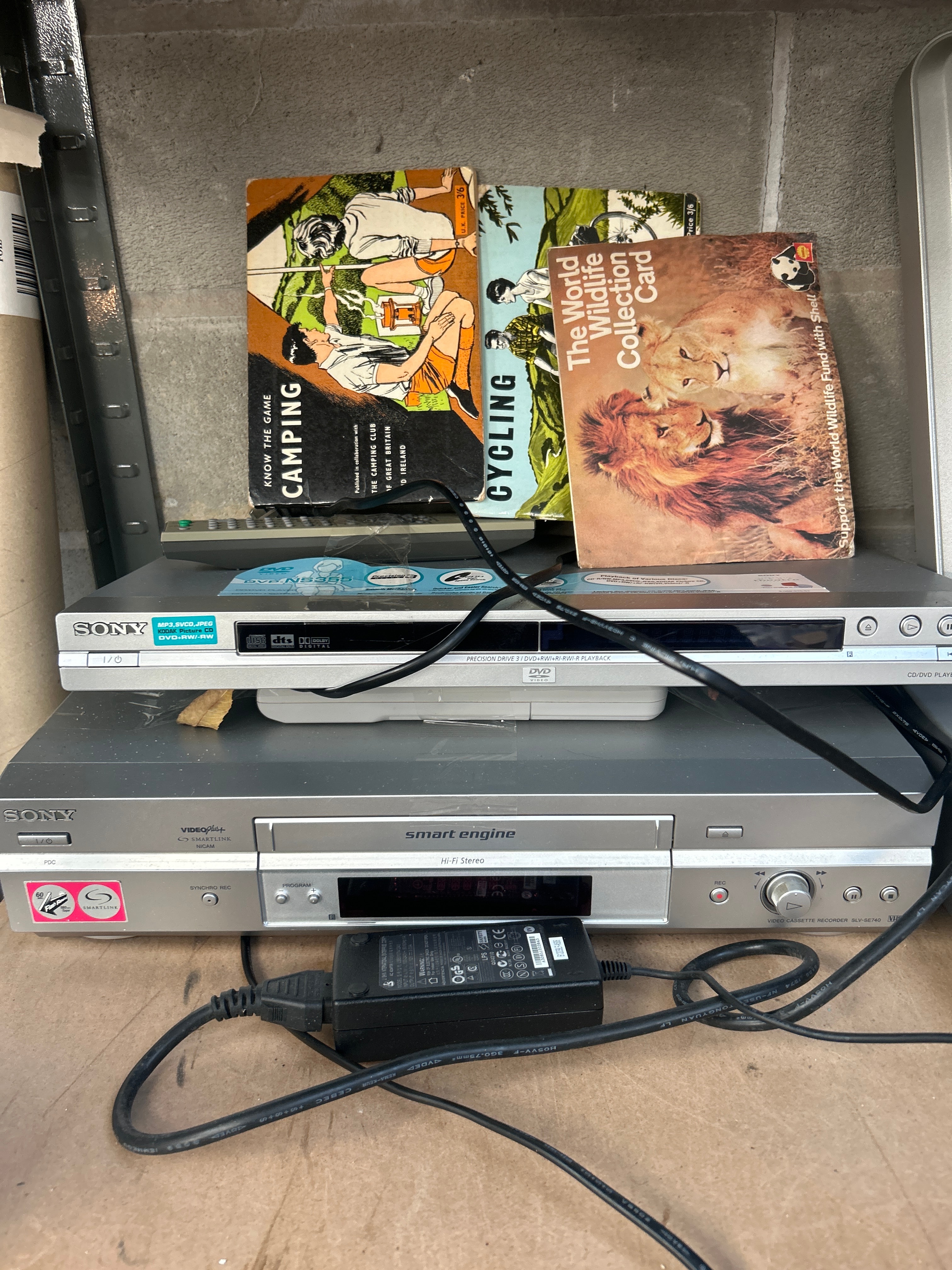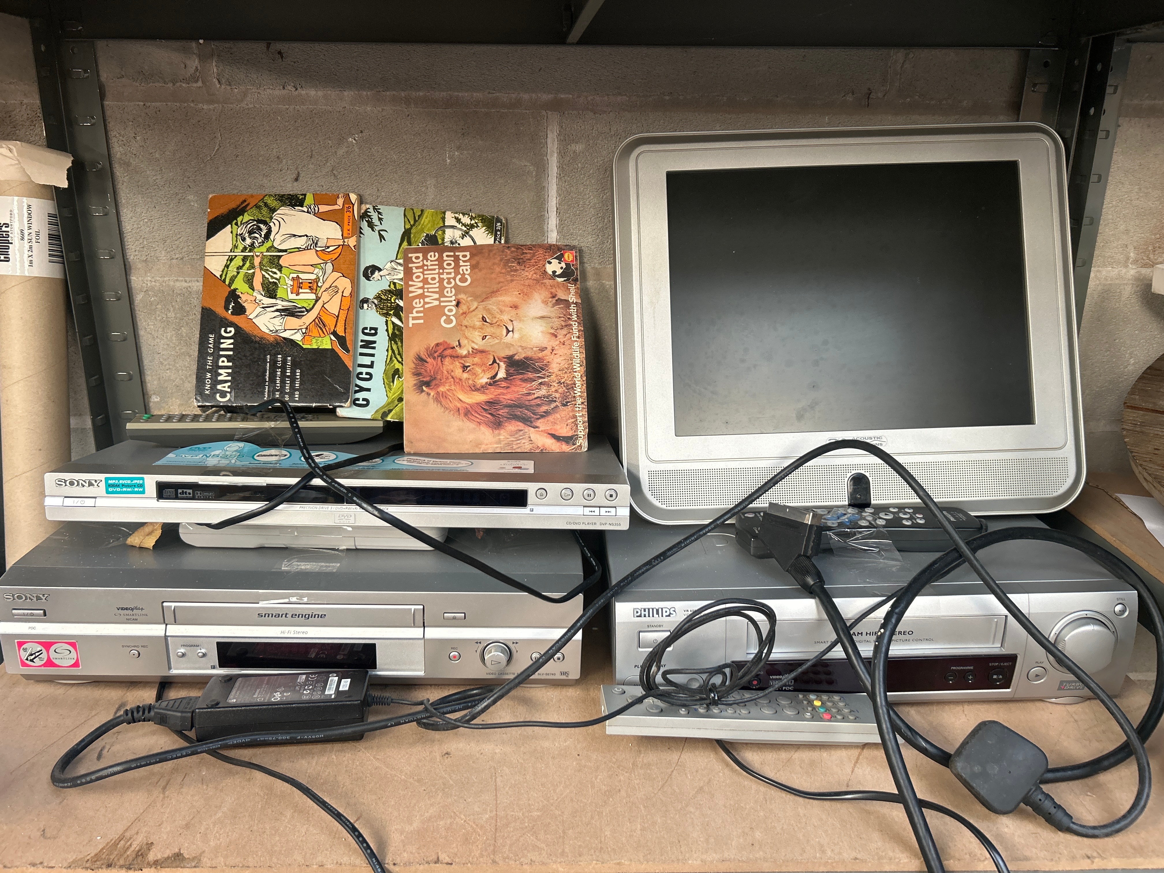 This lot comprises a collection of vintage consumer electronics and paperbacks. The electronics include a Sony DVP-NS355 DVD player, a Sony SLV-SE740 VCR, and a Philips Hi-Fi Stereo VCR. These components are accompanied by an Acoustic Solutions CRT monitor or small television. Various cables, including power cords, SCART connectors, and a Delta Electronics branded AC adapter, are present, along with multiple remote controls. The paperbacks consist of two titles from the “Know the Game” series, “Camping” and “Cycling,” and a larger format book titled “The World Wildlife Collection Card” depicting lions.