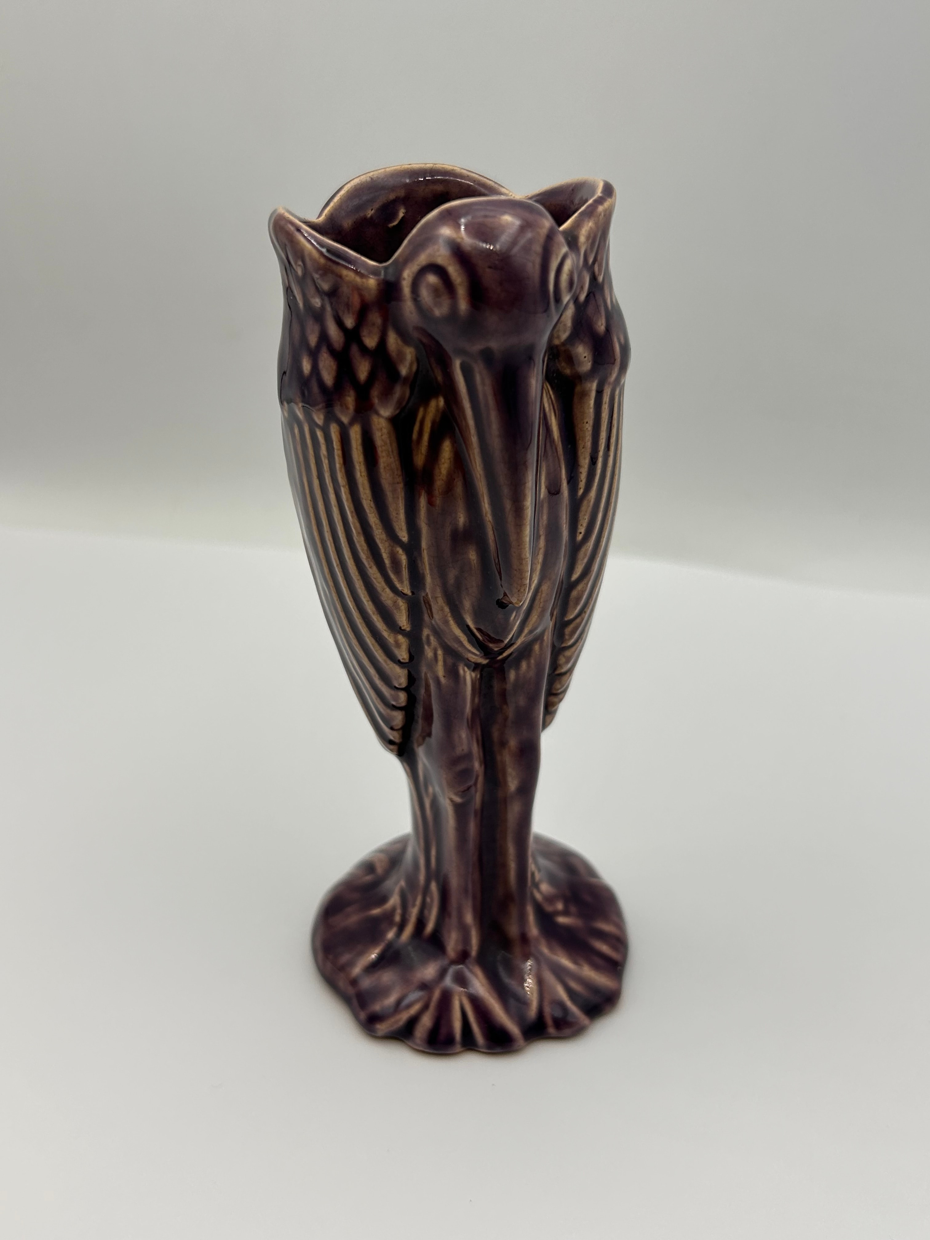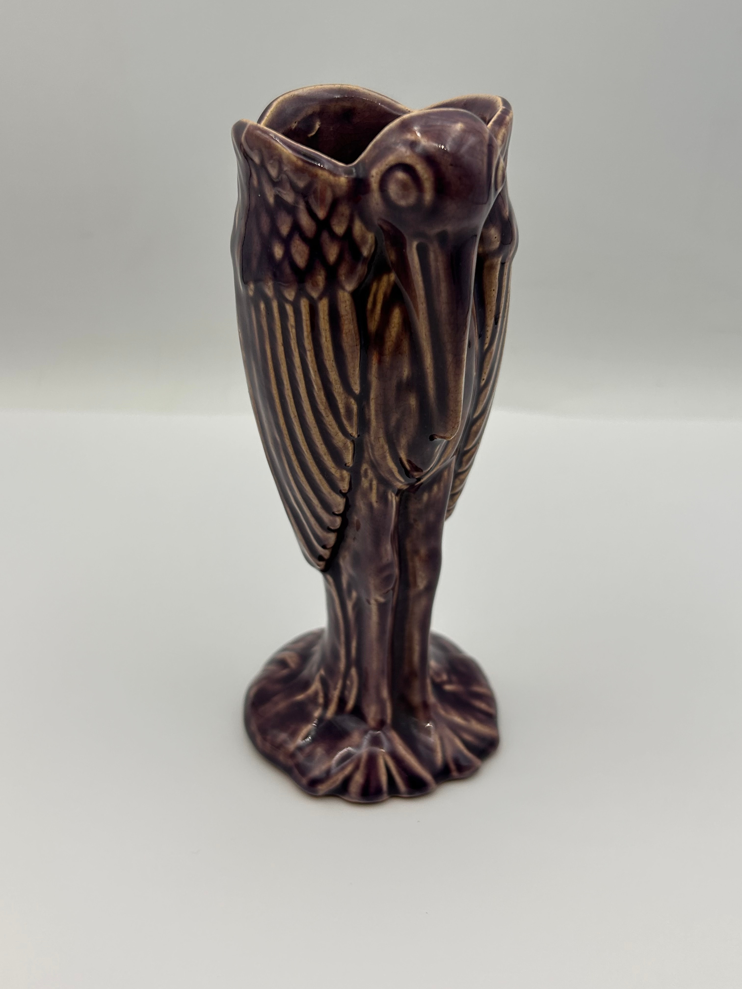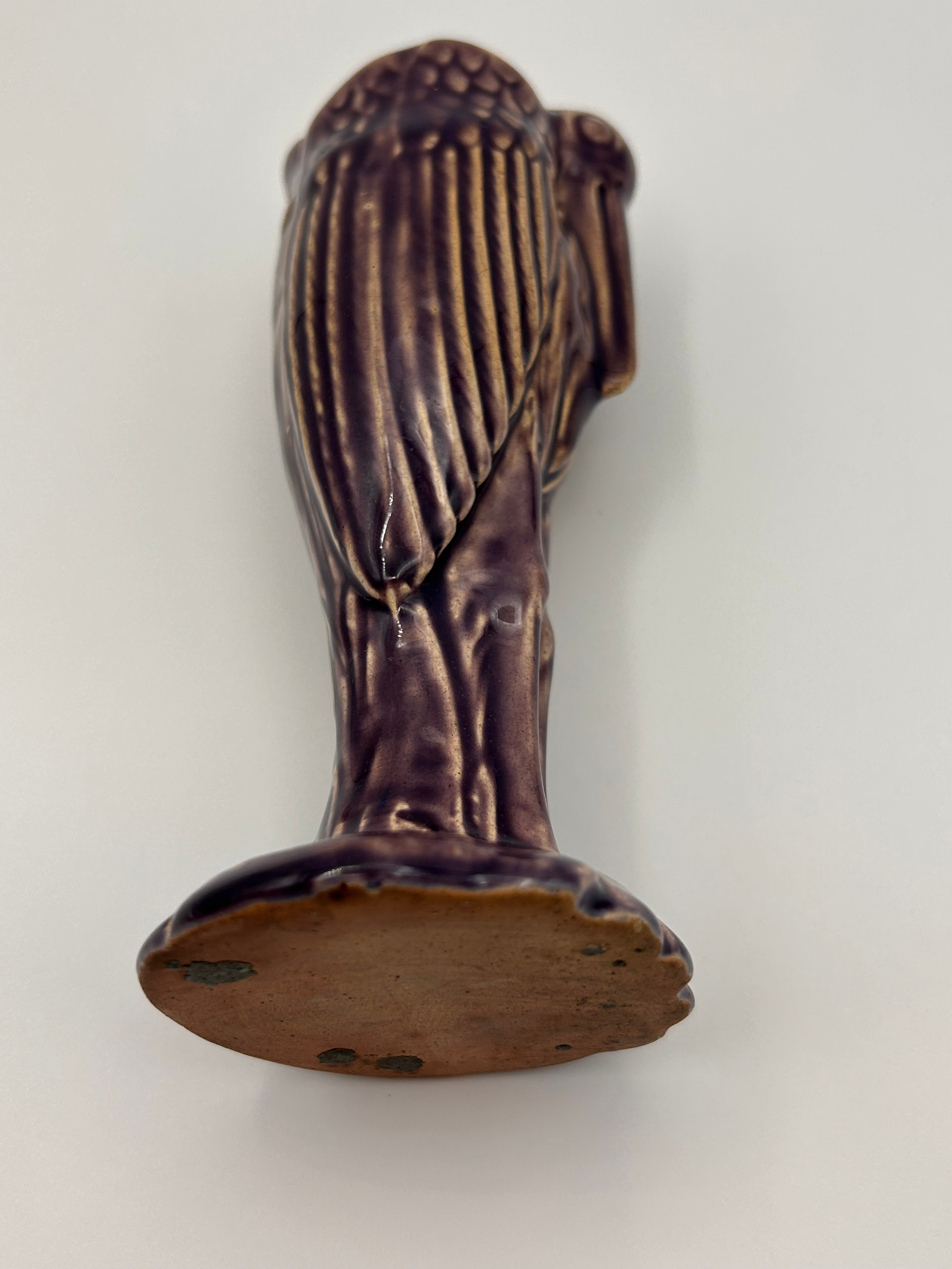 A Mid Century Glazed Pottery Bird Vase. This stylized ceramic vessel is molded in the form of an upright owl, with its head forming the opening at the top. The piece features a glossy, variegated dark purple-brown glaze with lighter tan-brown accents highlighting the textured wing feathers and other raised details. The material is glazed earthenware, with the unglazed terracotta base revealing the raw ceramic body.