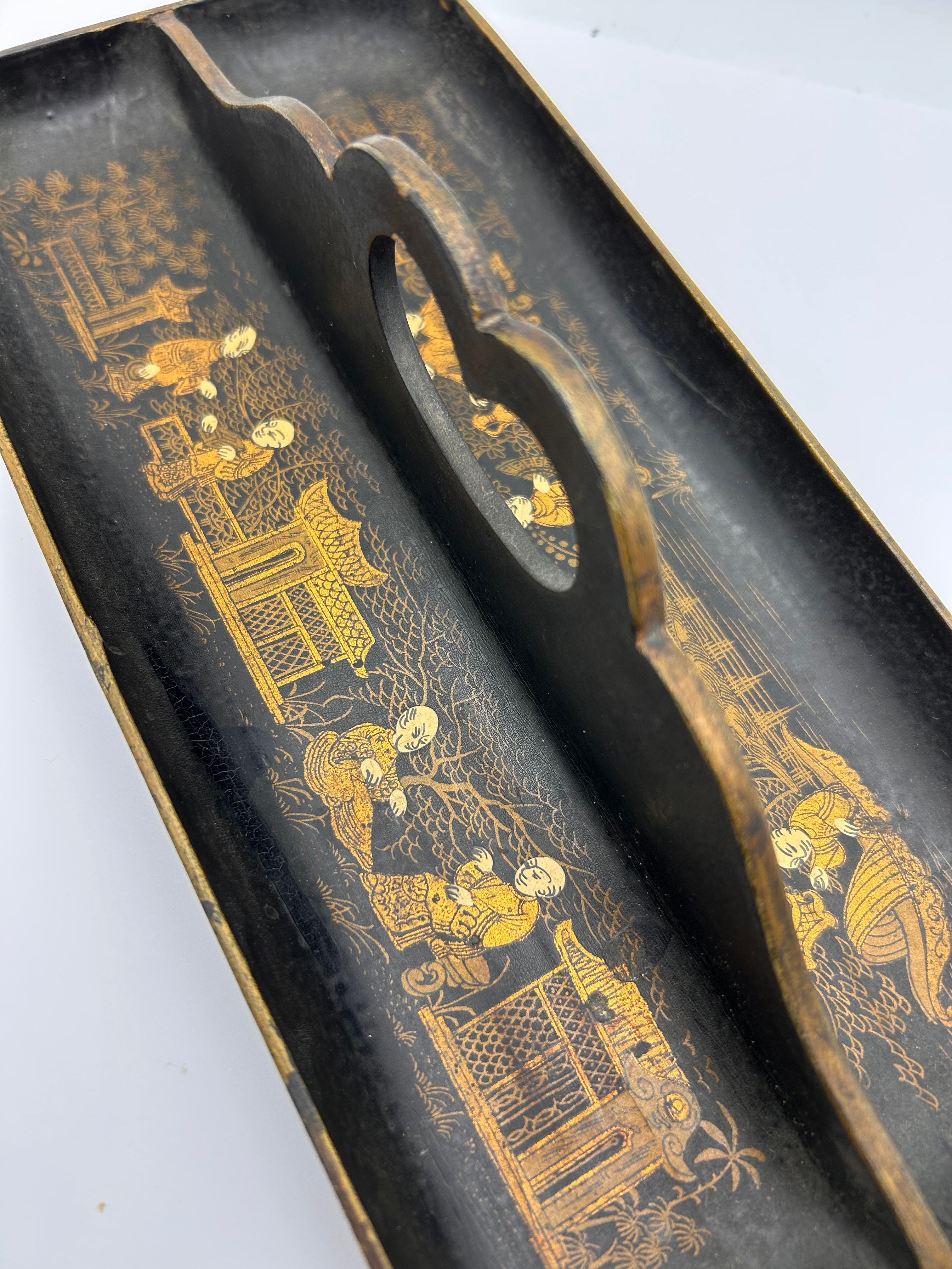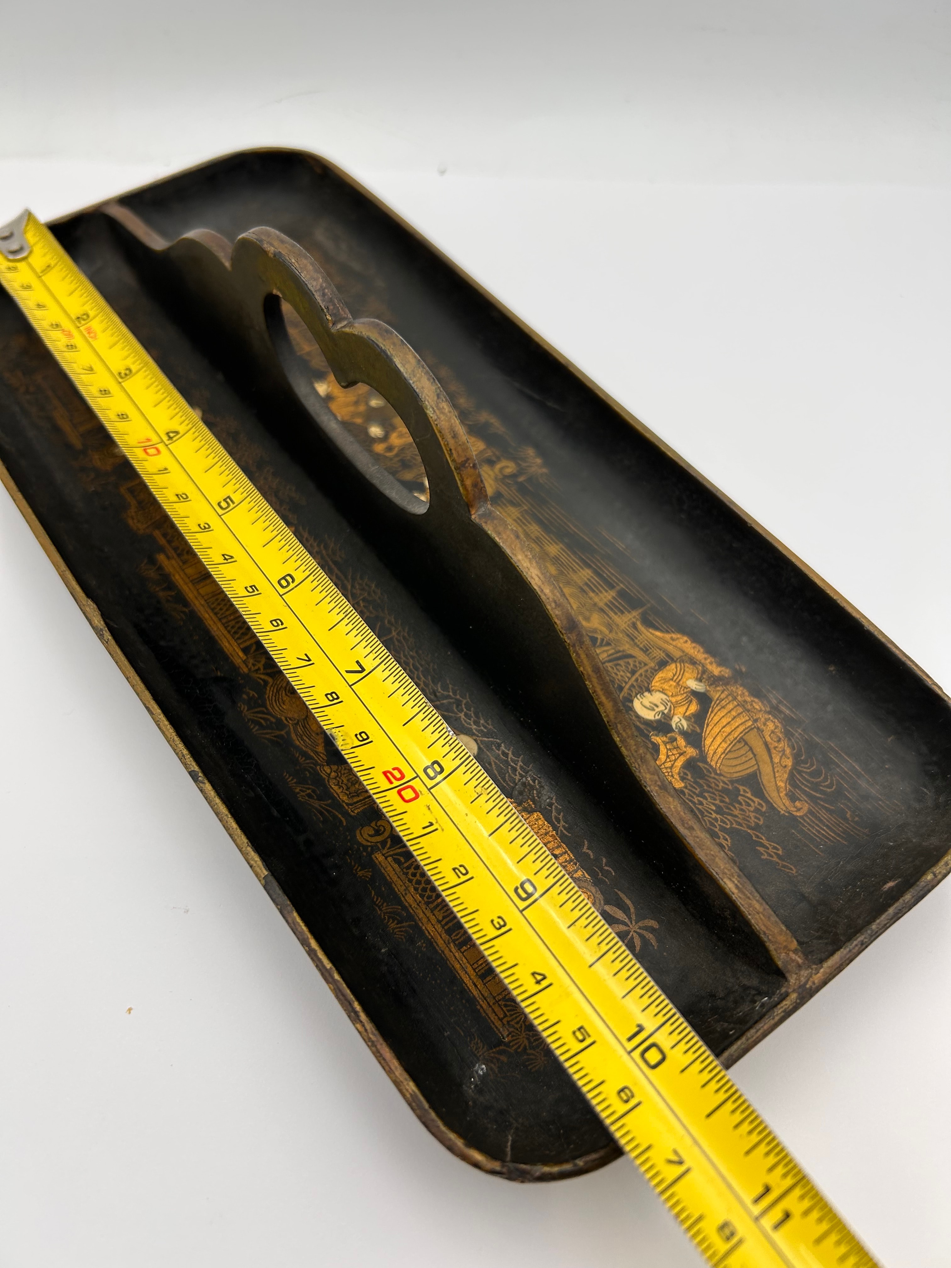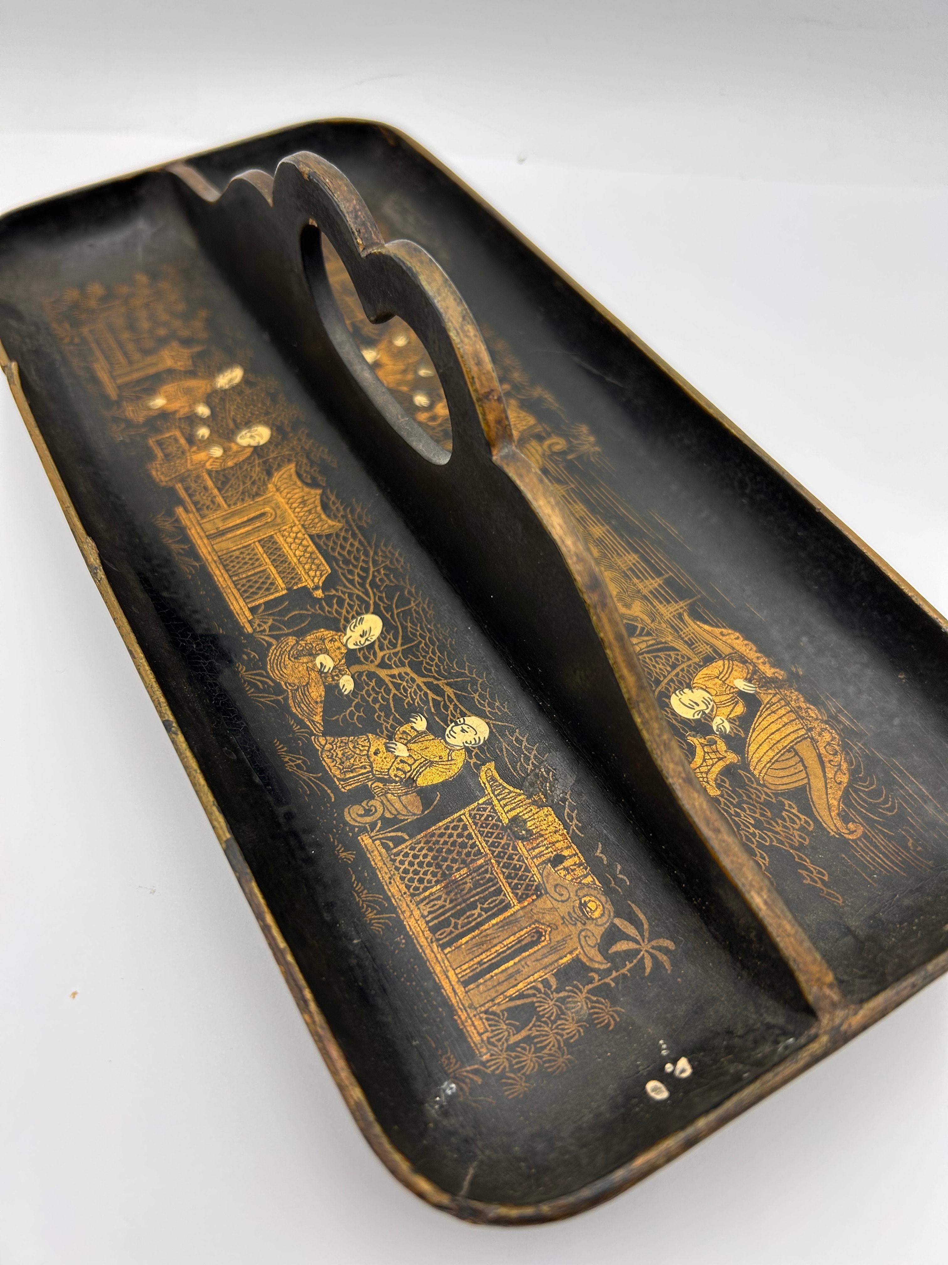 An antique Mid-19th Century Chinese Export Chinoiserie papier-mâché double pen tray. This rectangular, dual-compartment tray features a central, stylized heart-shaped handle. It is decorated in a traditional East Asian style with intricate gold-colored scenes depicting figures, architecture, and landscapes against a black ground. No discernible text or maker’s marks are visible.