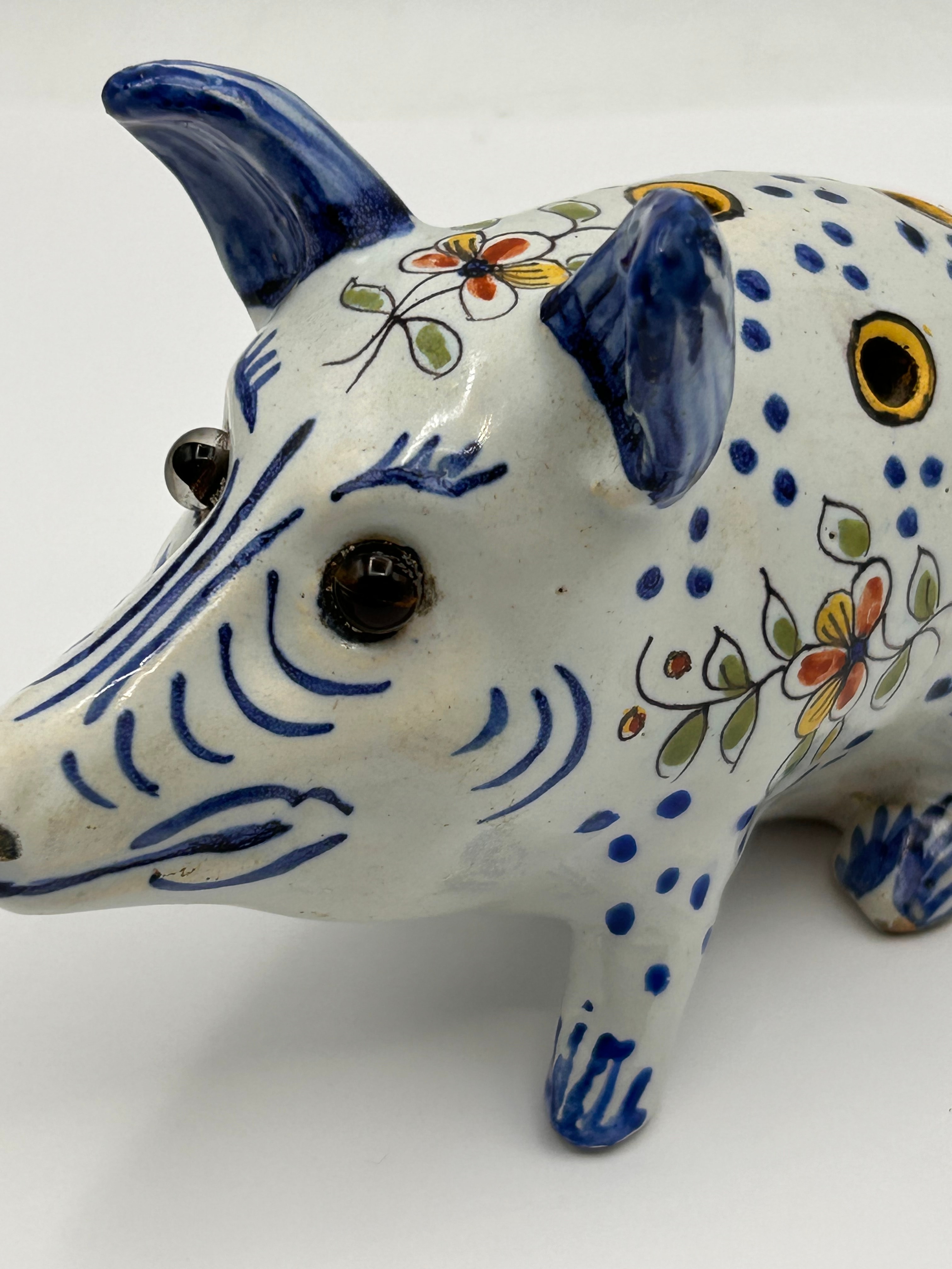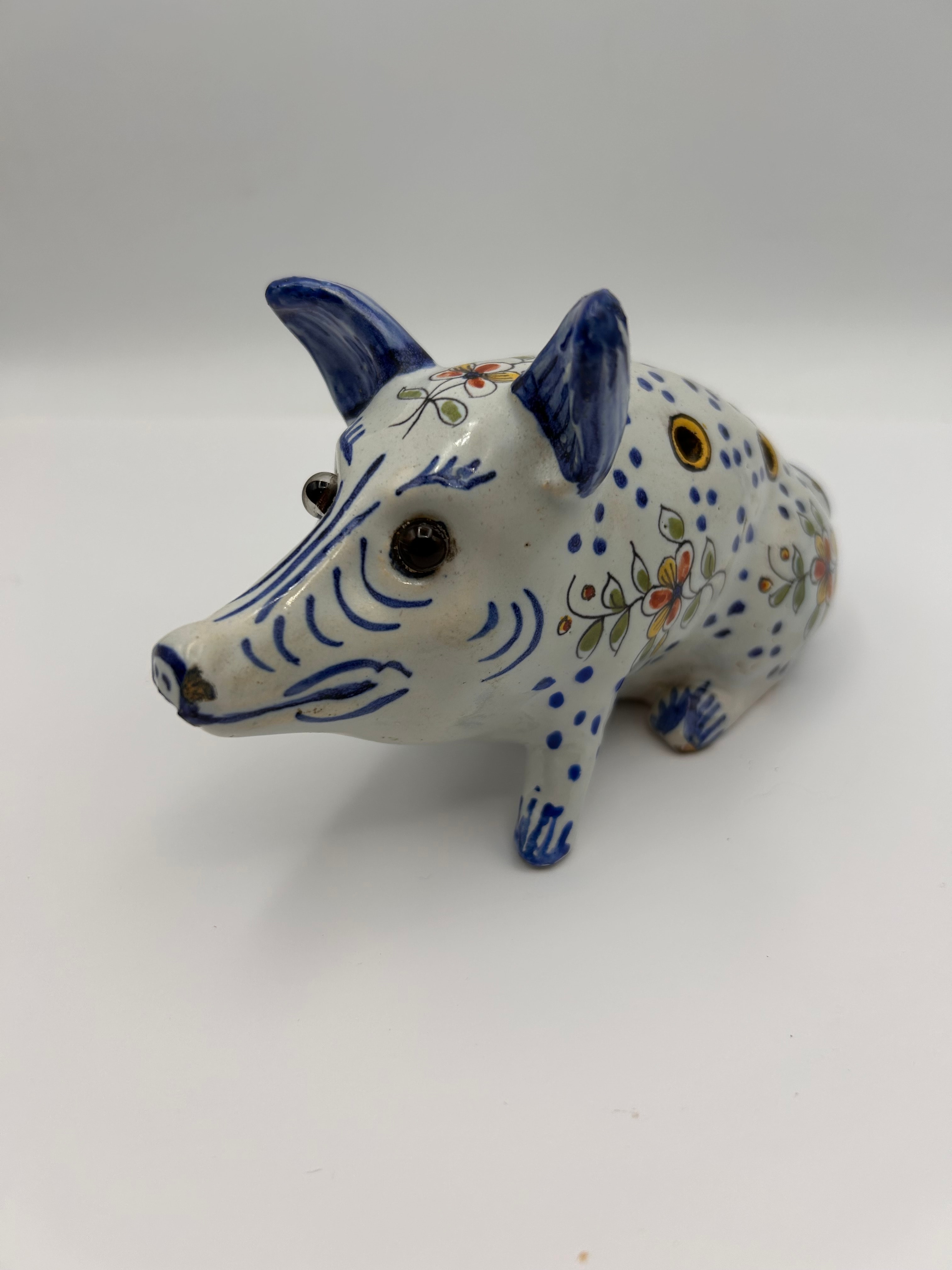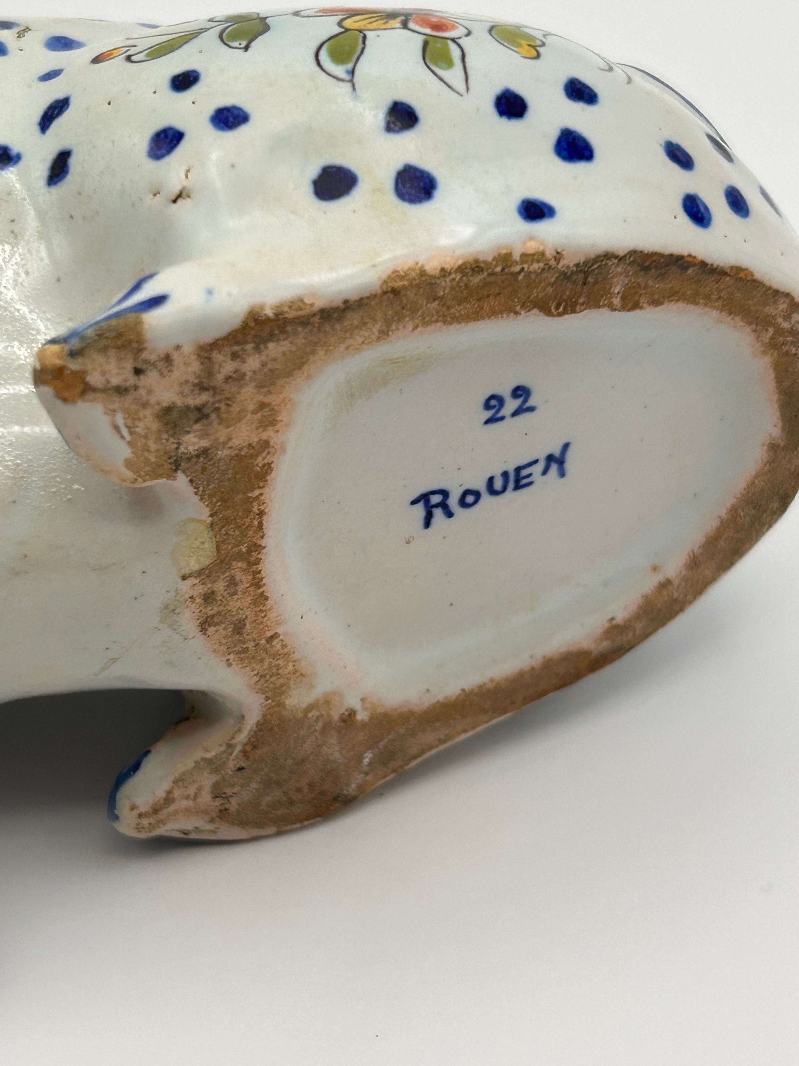 A 19th Century Desvres French Faience figural pig sculpture, crafted from polychrome ceramic earthenware. The piece features a white glazed body with hand-painted decoration, including scattered blue dots, multi-colored floral motifs in orange, yellow, and green, and blue striped patterns on the snout and ears. It is fitted with dark, possibly glass, eyes. The unglazed reddish-brown base bears the blue script markings ’22’ and ‘ROUEN’.