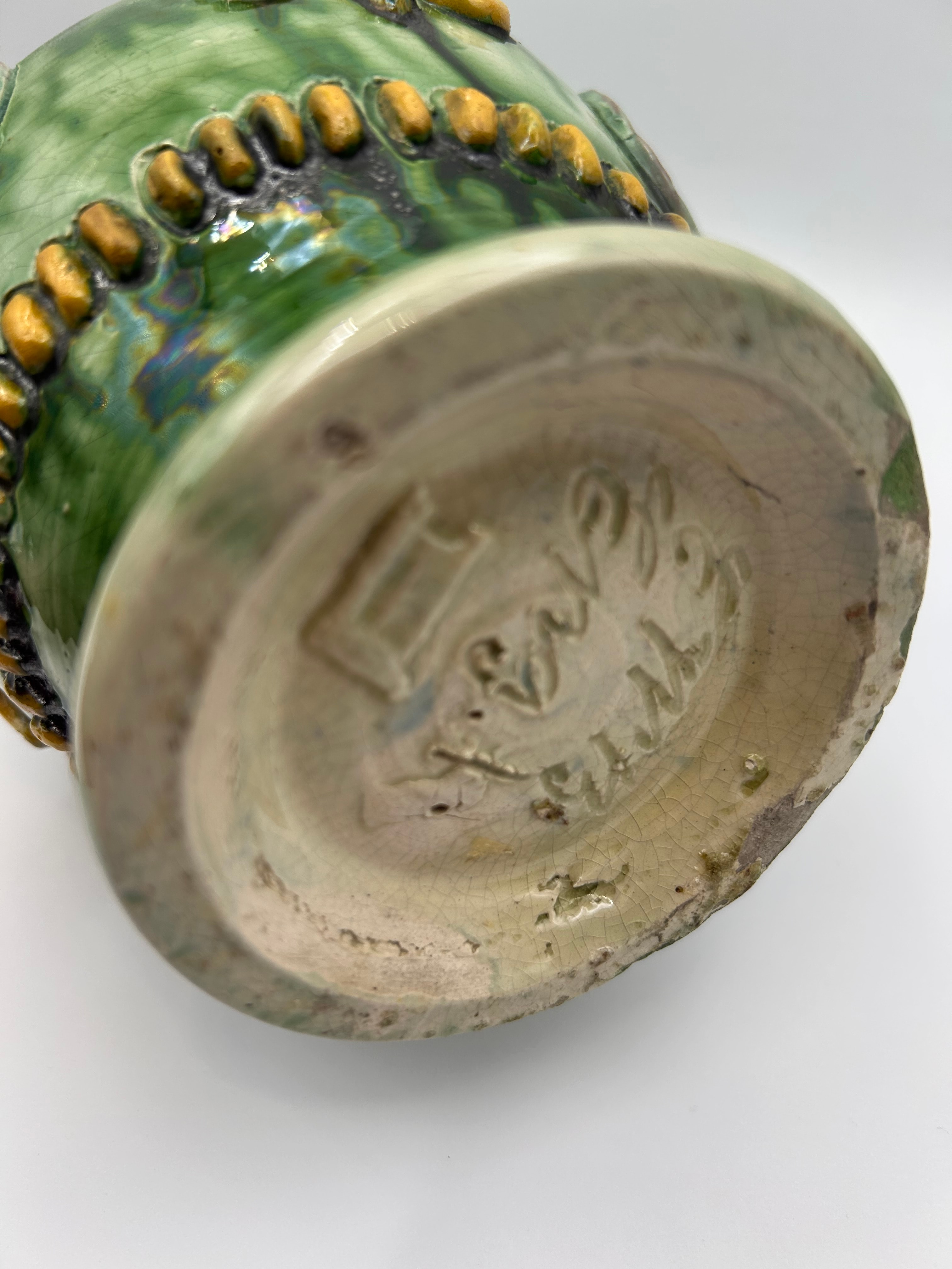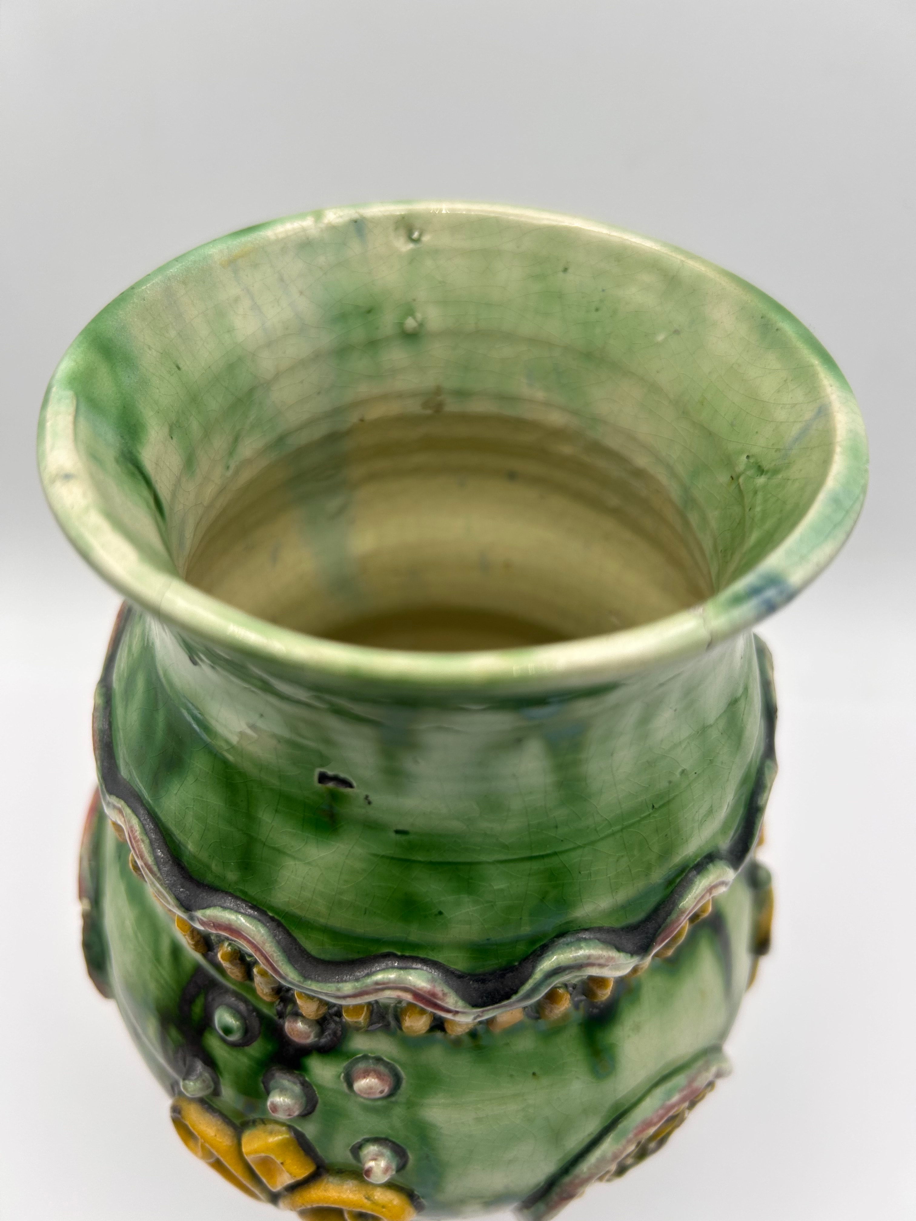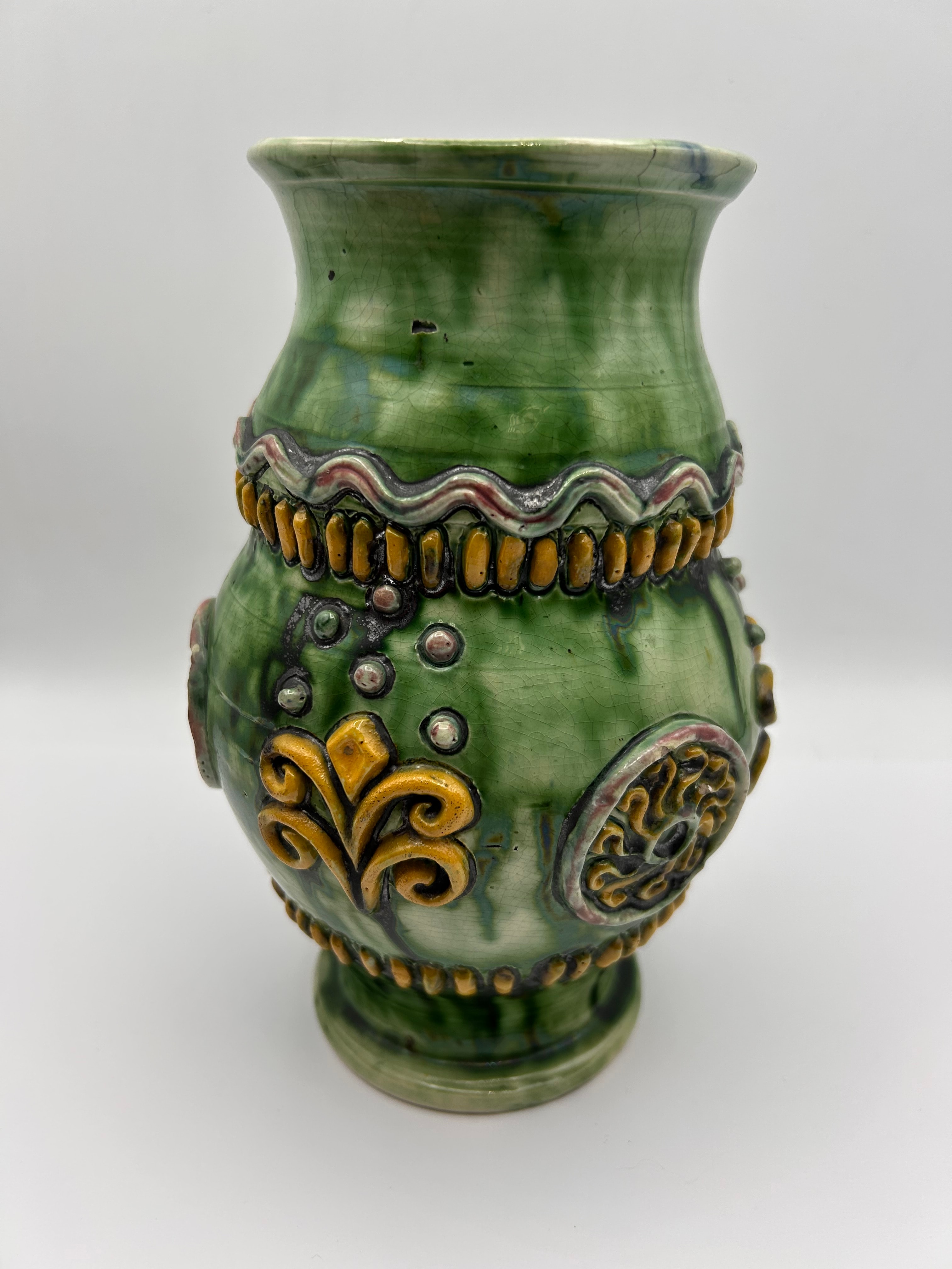 A vibrant, green-glazed ceramic vase of bulbous form with a flared rim and footed base. The surface is extensively decorated with applied or relief elements, including scalloped bands, raised oval shapes, circular dots, and stylized floral or geometric medallions, all accented in orange, yellow, silver, and black. The piece exhibits a rustic, folk art or majolica-inspired style, with a visible craquelure throughout its glossy finish. The underside features an impressed circular mark with a stylized house or building symbol, and the legible text “ITALY,” alongside the name “S. EVANS.”