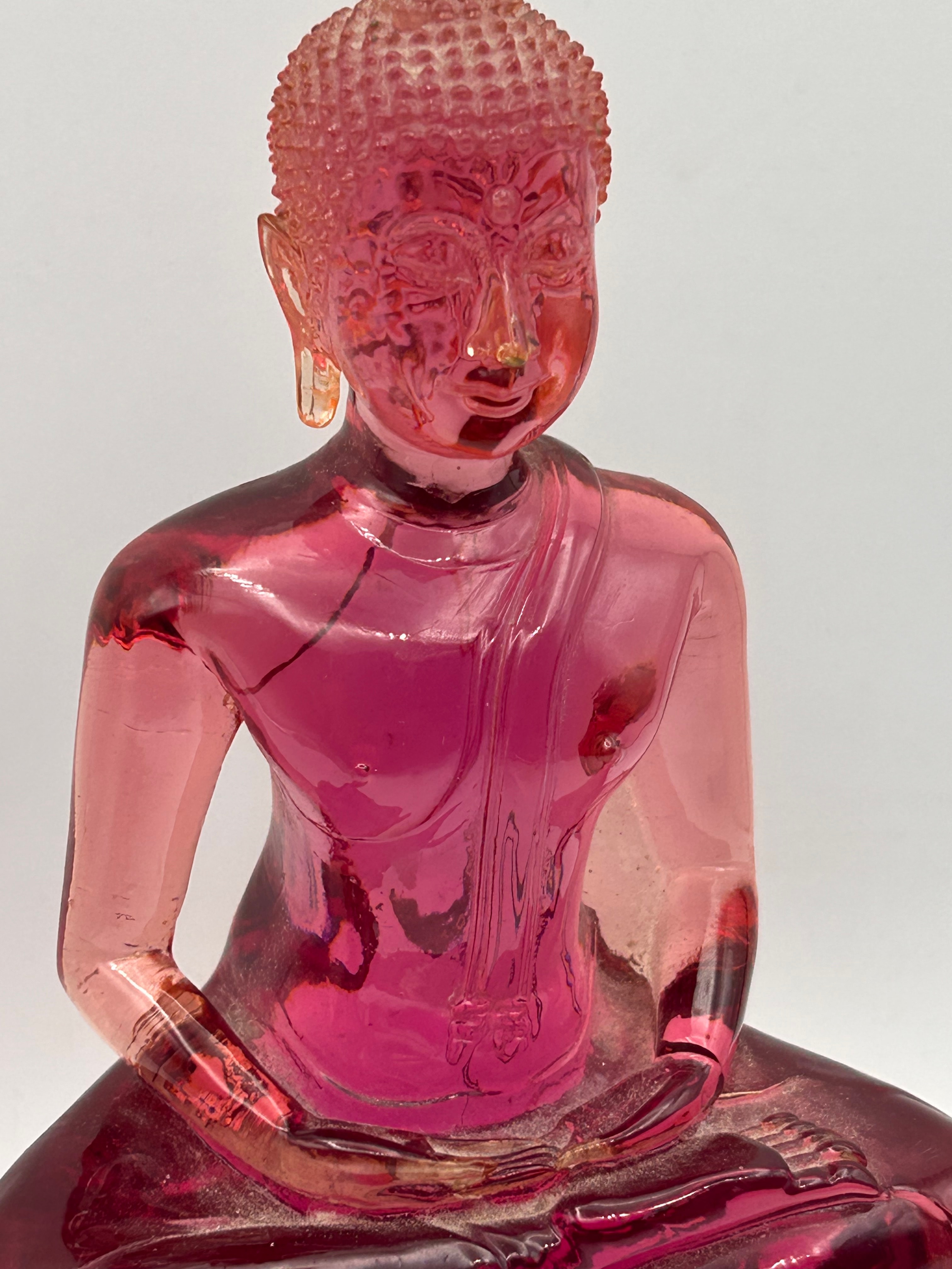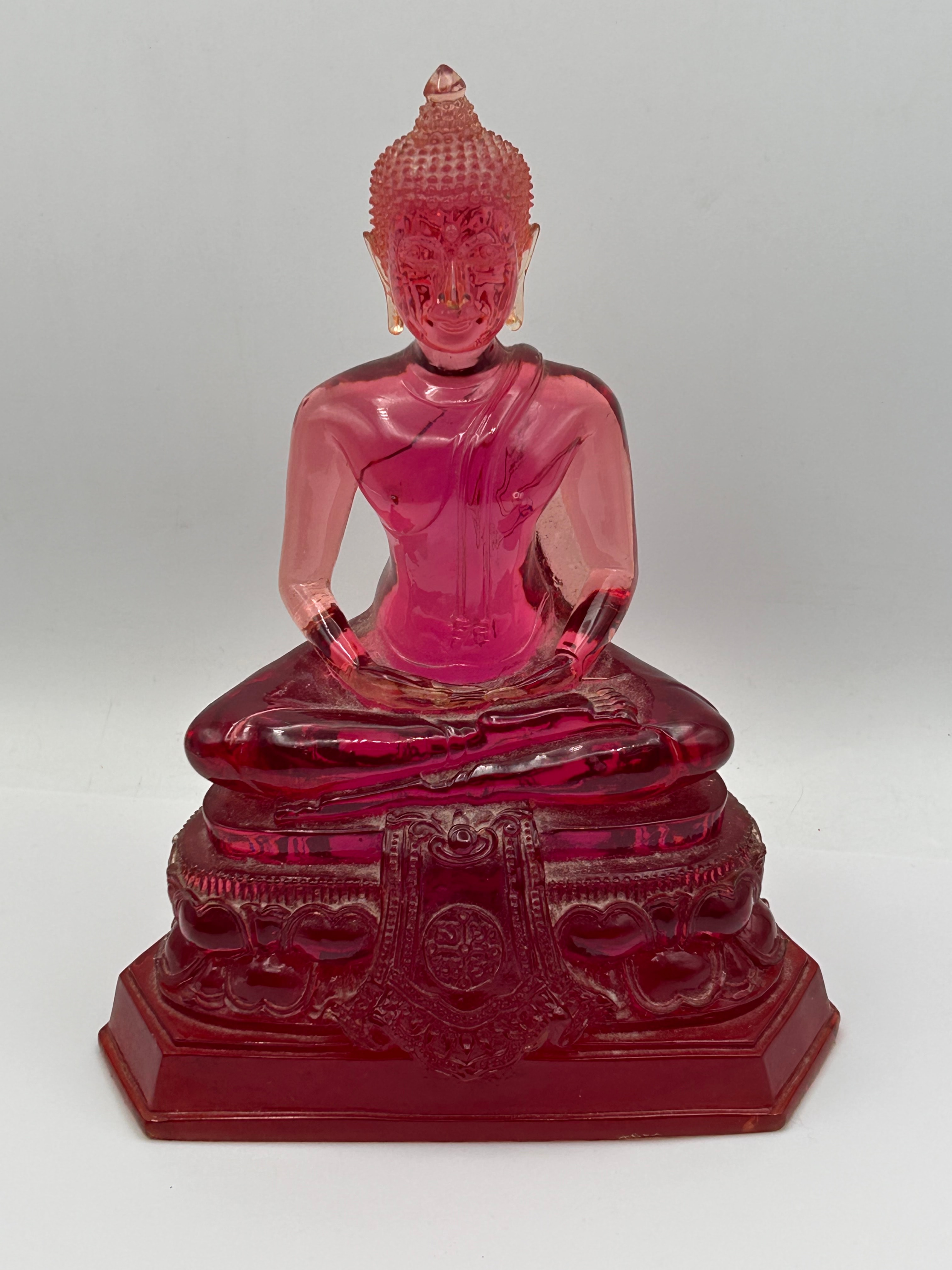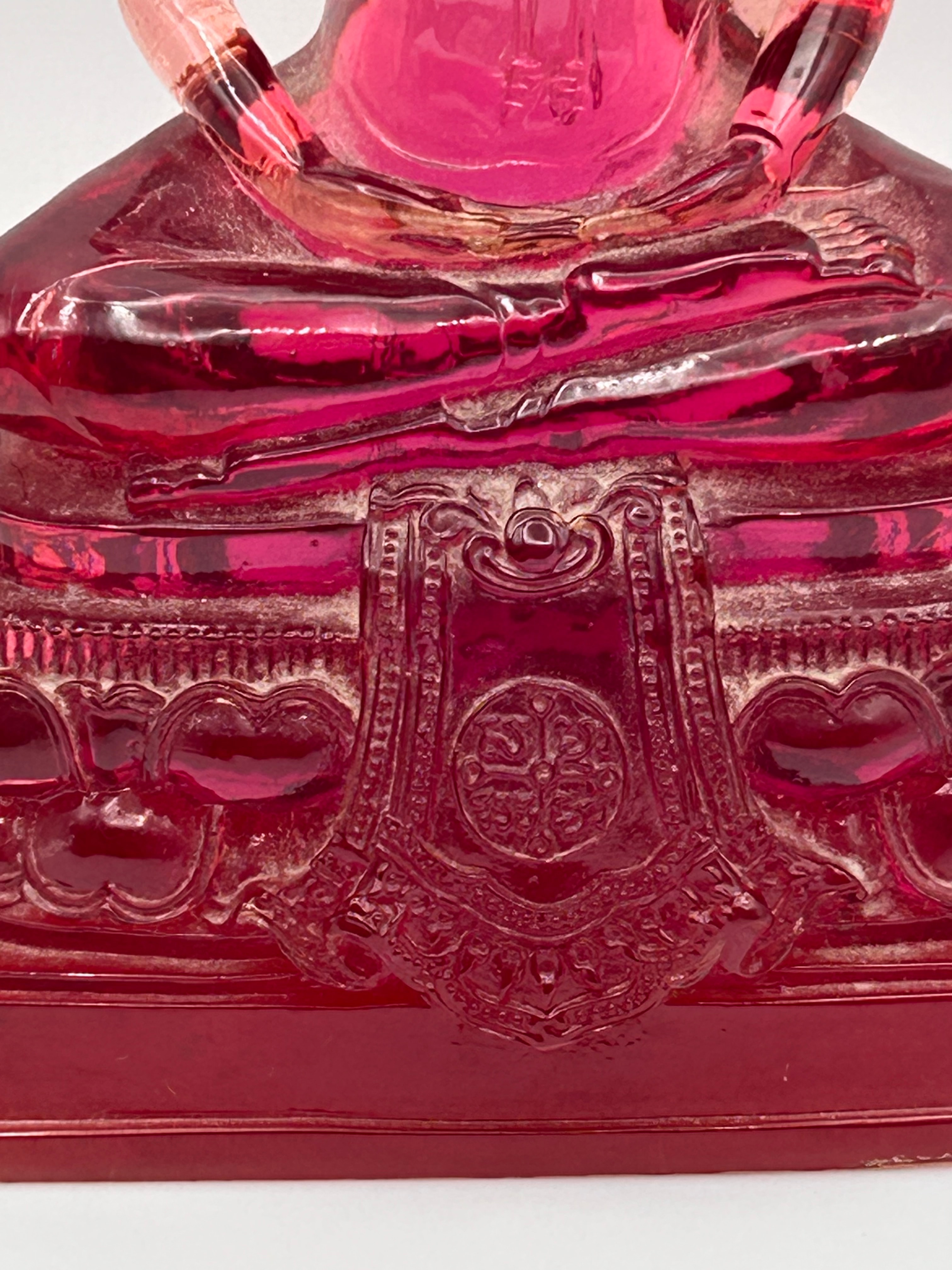 A translucent ruby-red gass statue of a seated Buddha, likely depicting the Bhumisparsha mudra, rendered in a traditional Southeast Asian style characterized by a flame-like ushnisha and elongated earlobes. The figure rests upon an octagonal, multi-tiered base intricately adorned with relief carvings, including heart-shaped motifs and a prominent central shield-like emblem featuring a circular auspicious symbol, possibly a Dharma wheel. There are no discernible textual markings.