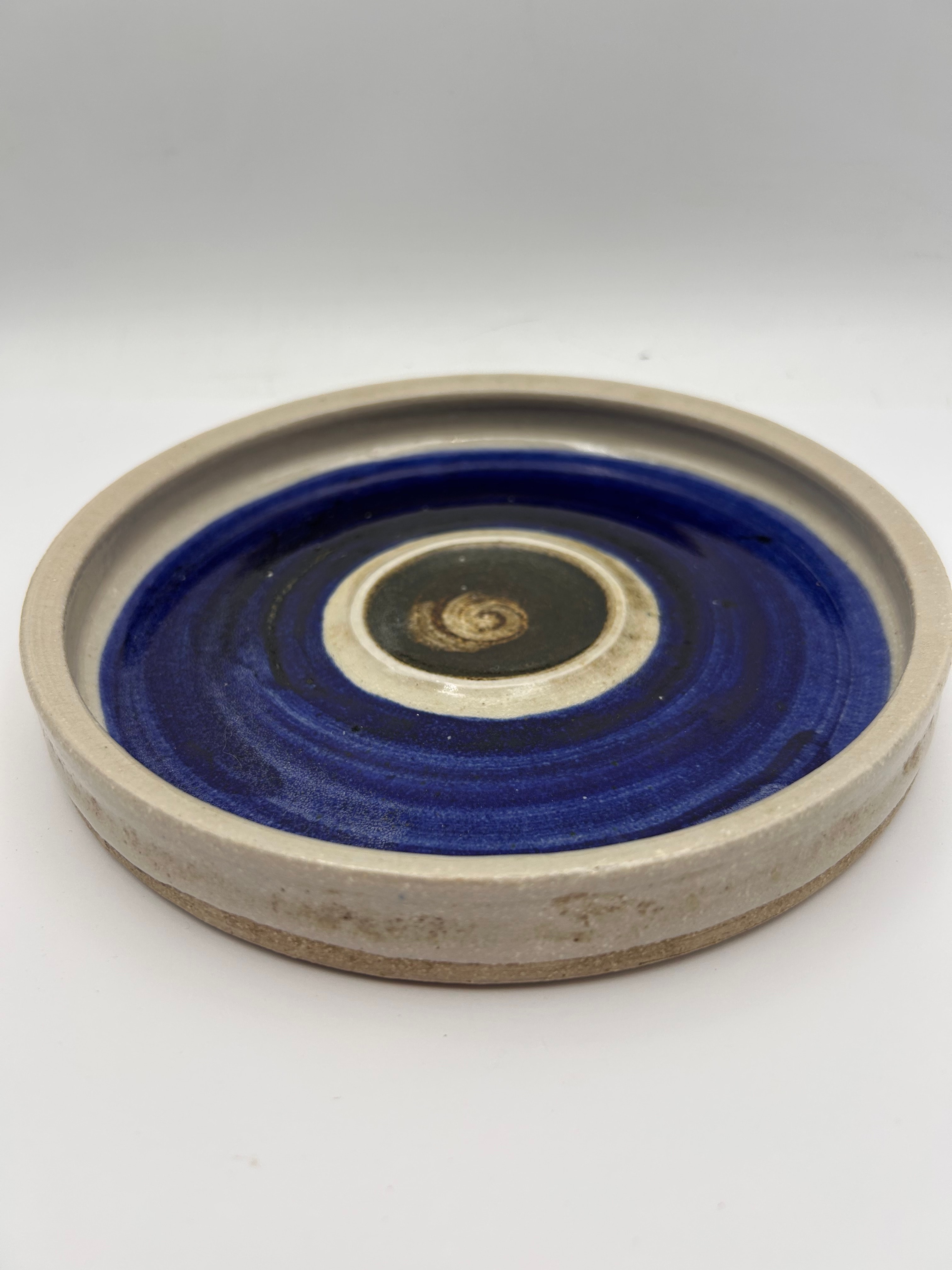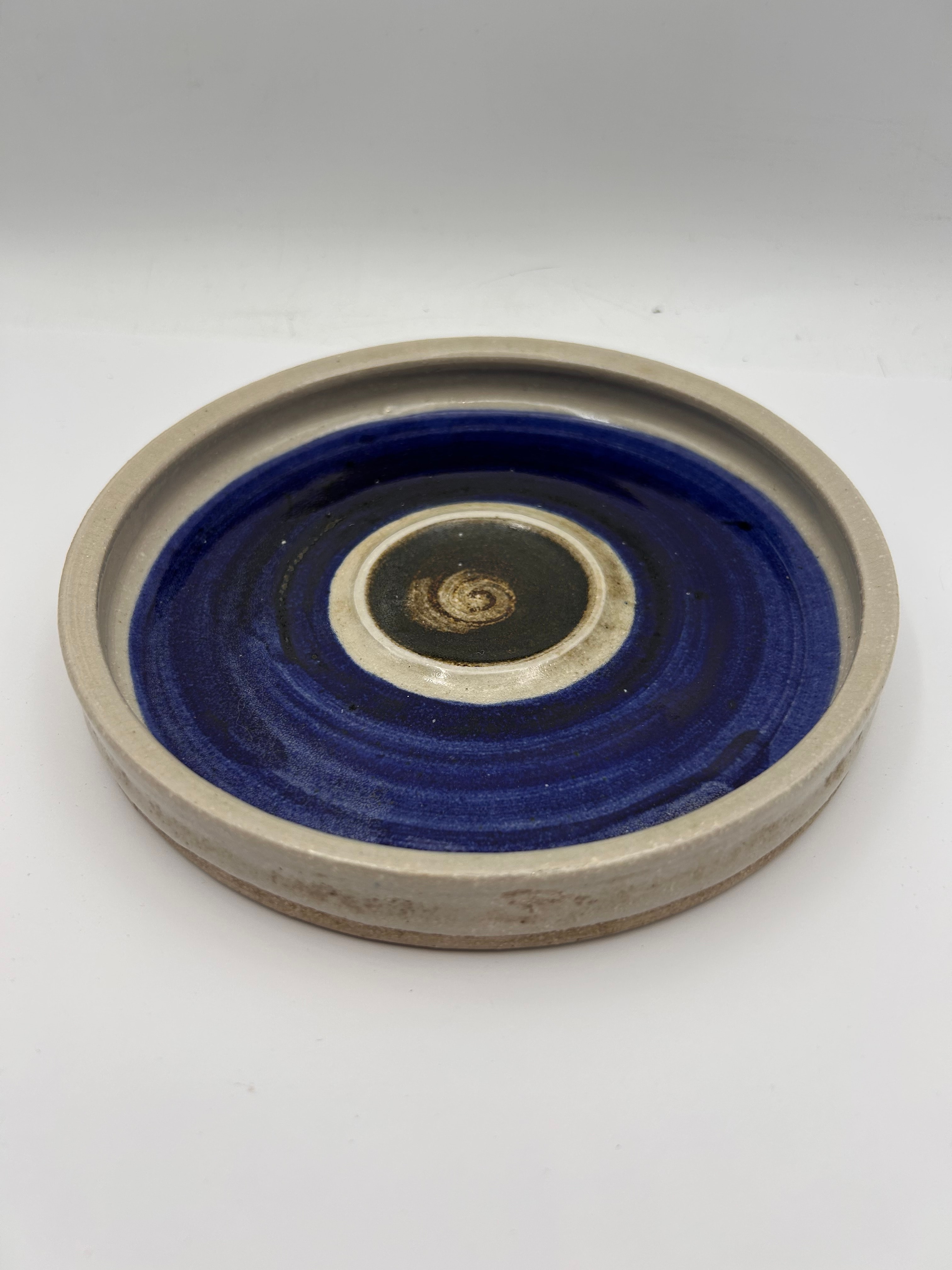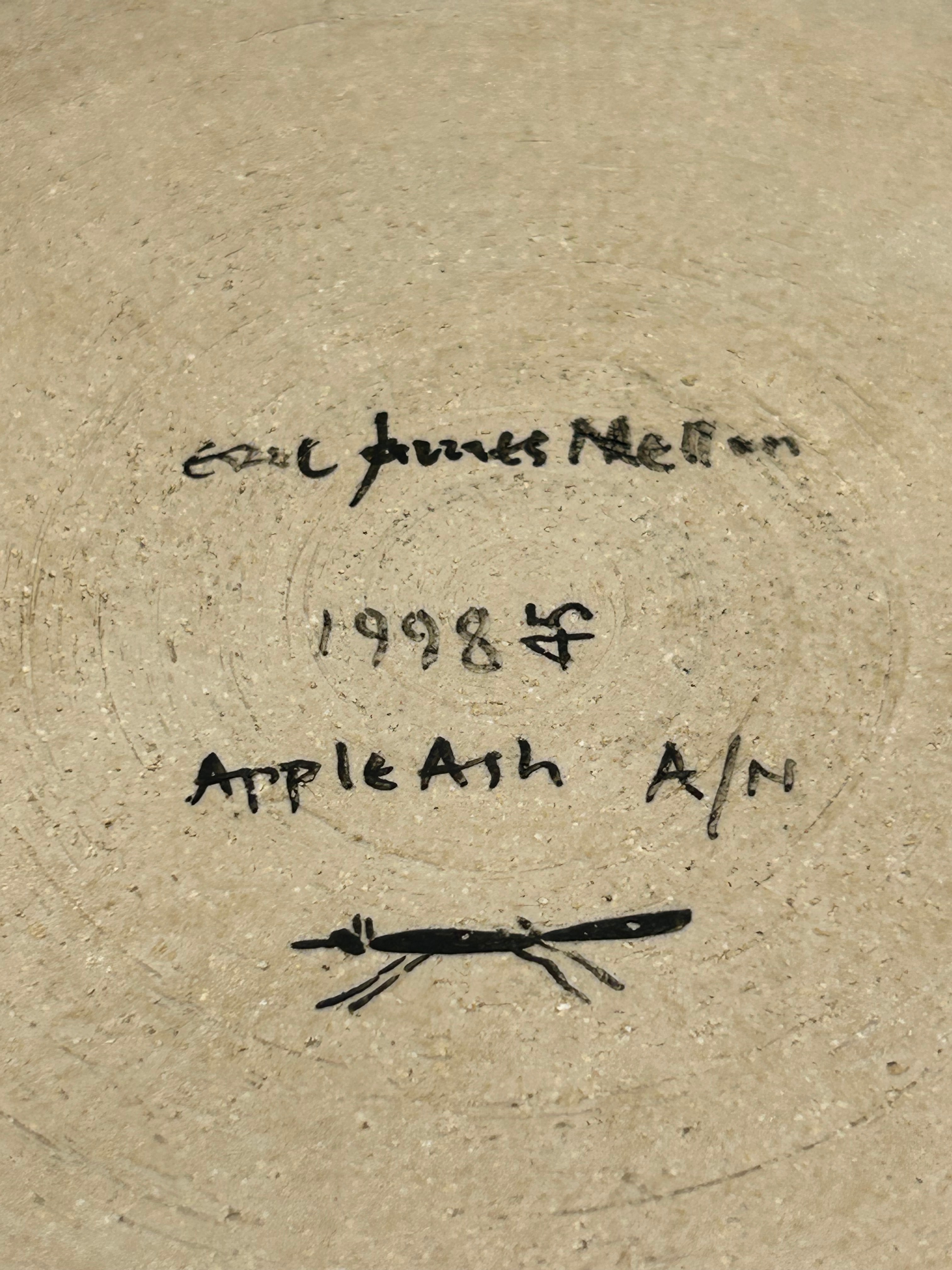 A modern studio pottery plate or shallow dish by Eric James Mellon, dated 1998. Crafted from ceramic, it features an unglazed, textured light beige exterior and rim. The glazed interior displays concentric rings of deep blue and beige, with a swirling dark brown or black design at the center, creating an abstract, modernist aesthetic. The underside is inscribed in black ink with “eric james Mellon,” “1998,” a distinctive symbol, “Apple Ash A/N,” and a stylized insect or dragonfly motif.