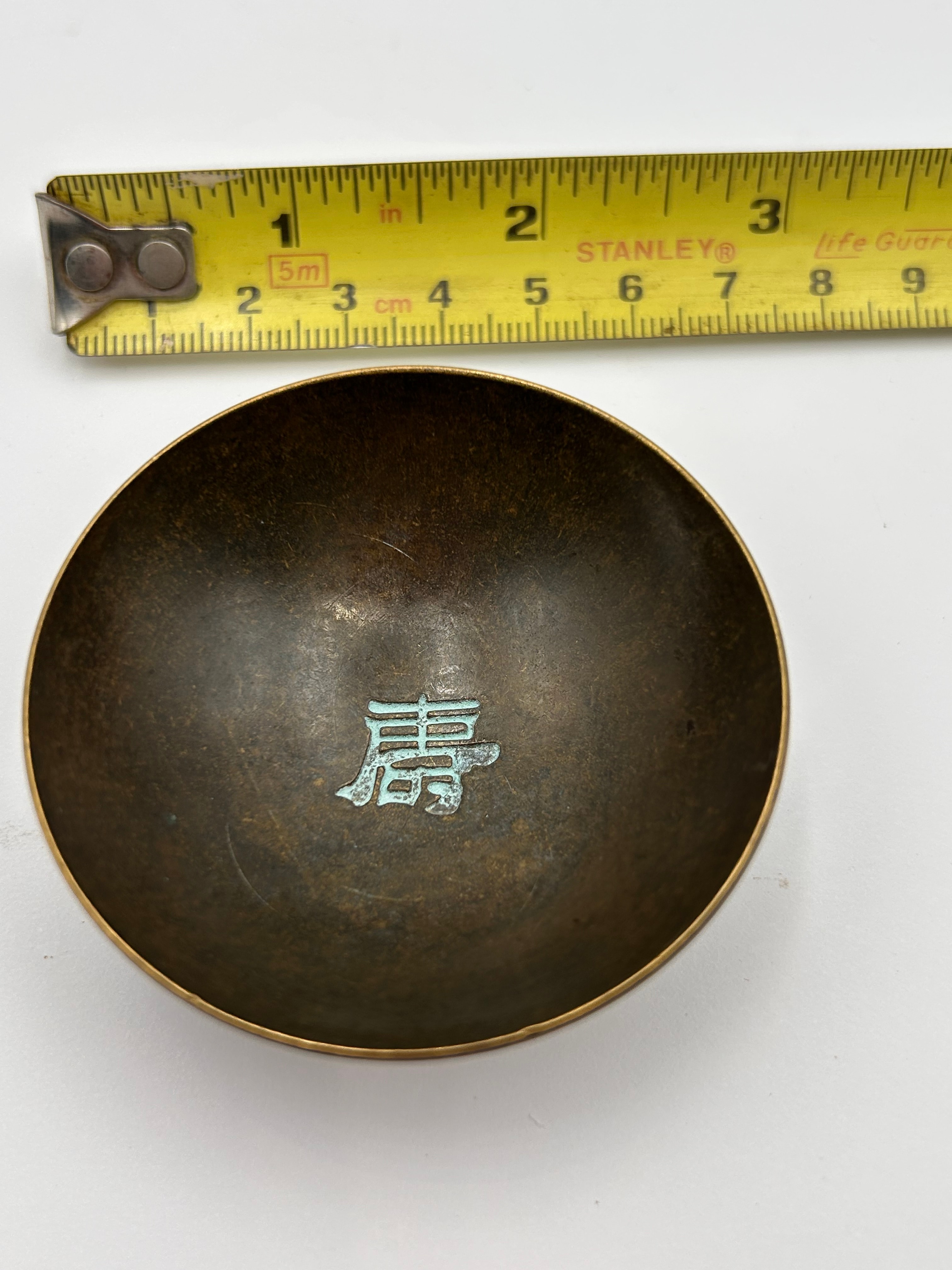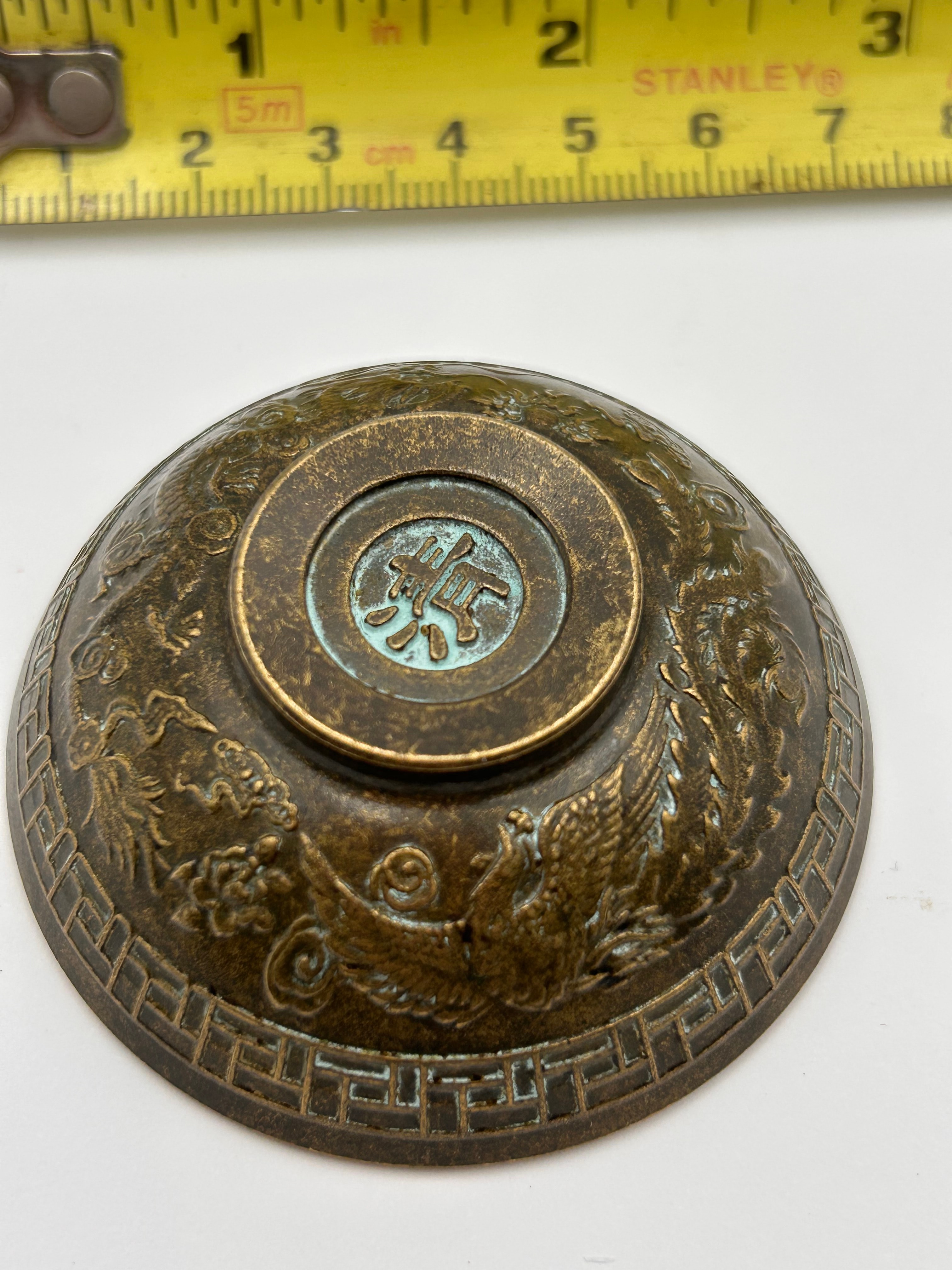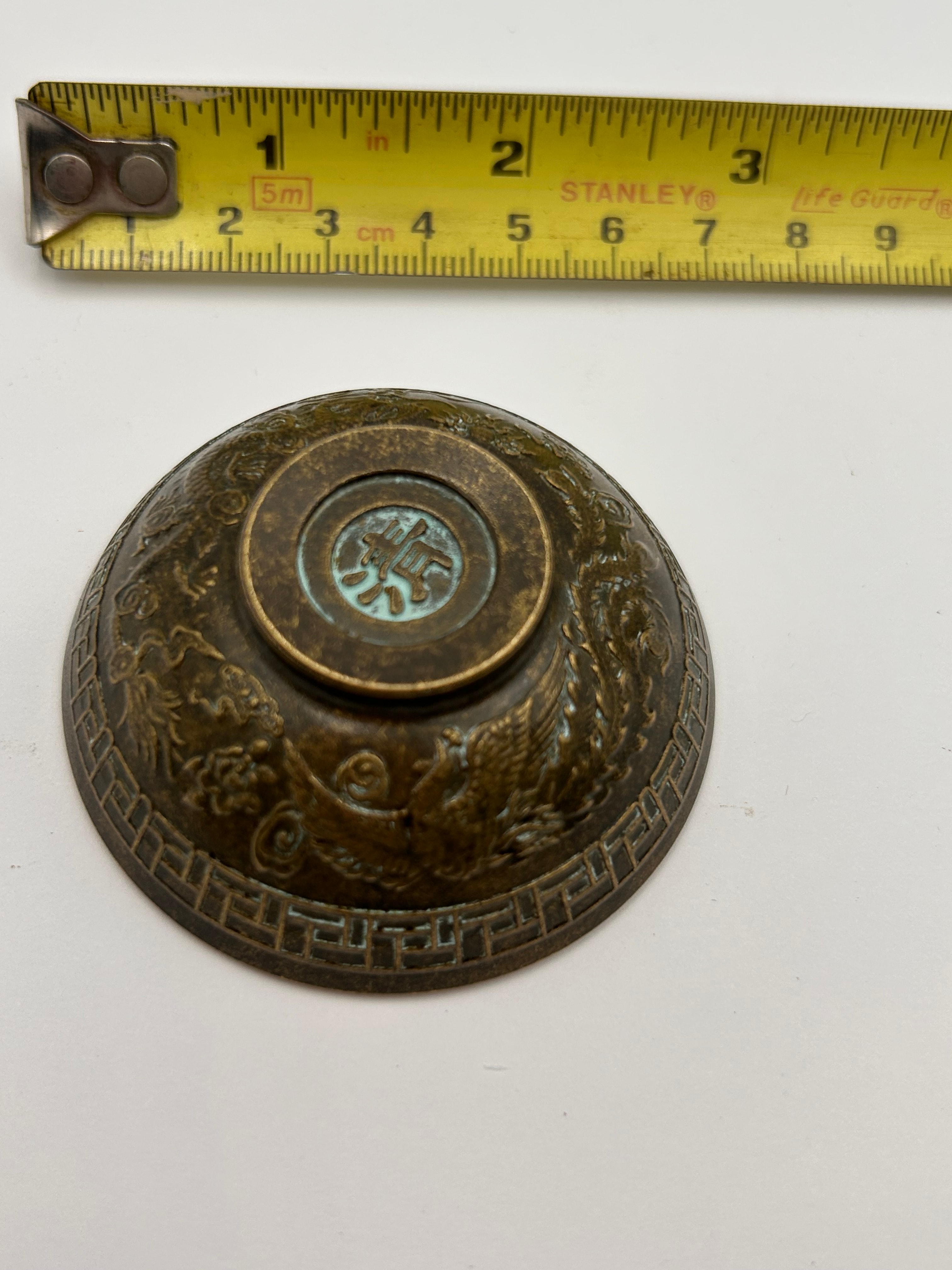 A Chinese patinated bronze bowl, featuring a central ‘壽’ (shòu) character, meaning ‘longevity,’ highlighted in a vibrant blue-green enamel or pigment on the interior. The exterior is extensively decorated in relief with stylized mythical creatures, likely dragons or phoenixes, circling the body, above a base rim adorned with a geometric meander pattern. The recessed base also bears the same ‘壽’ character rendered in blue-green. The bowl displays a dark, aged surface with some lighter metallic wear.