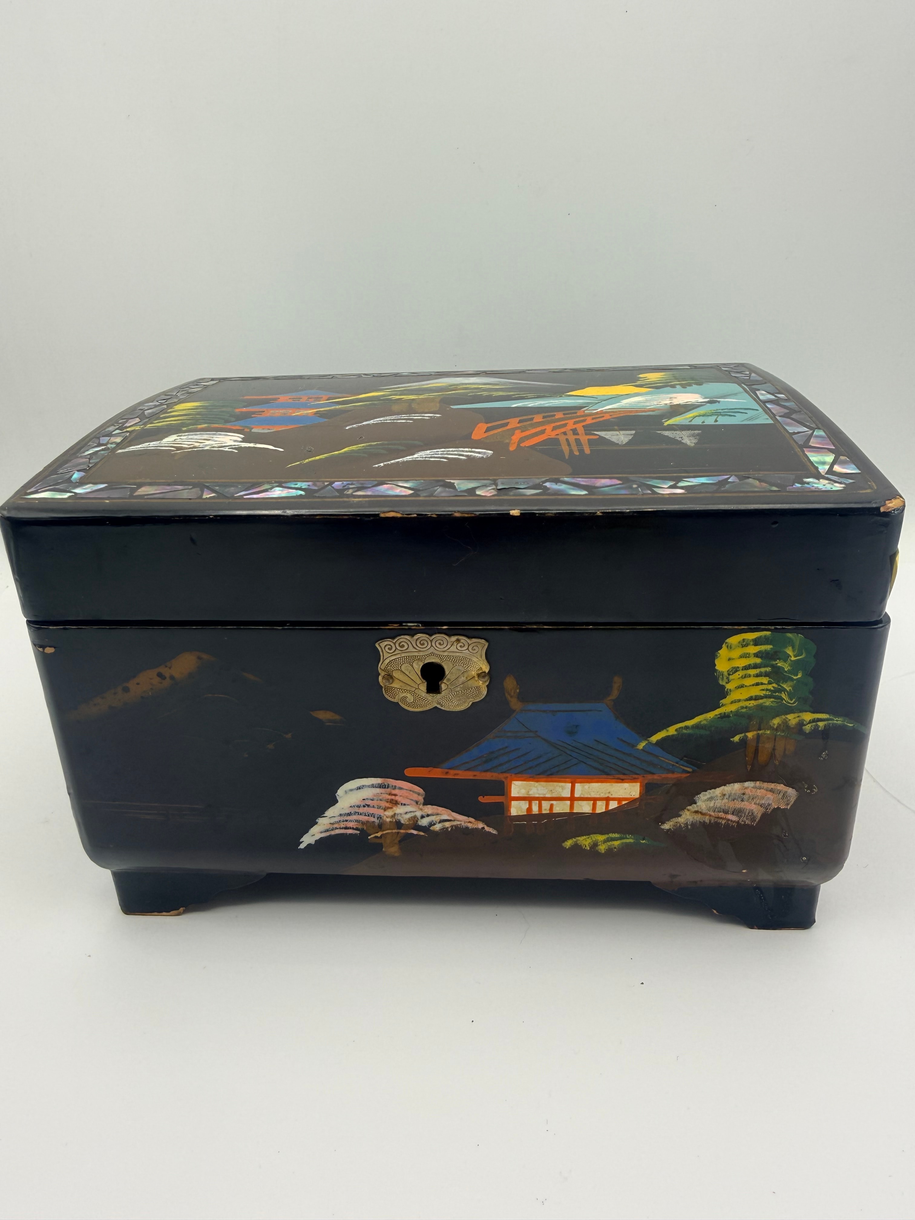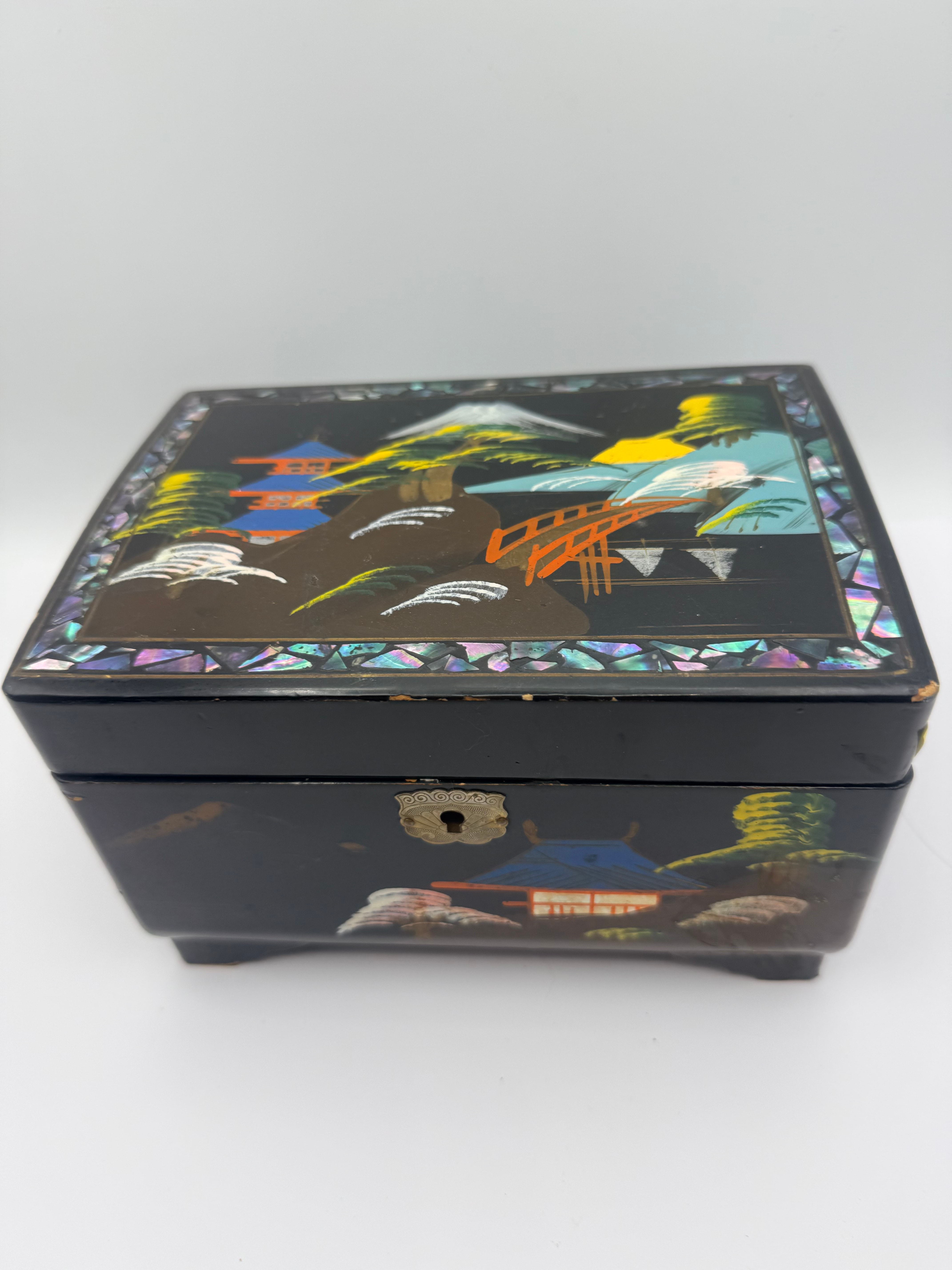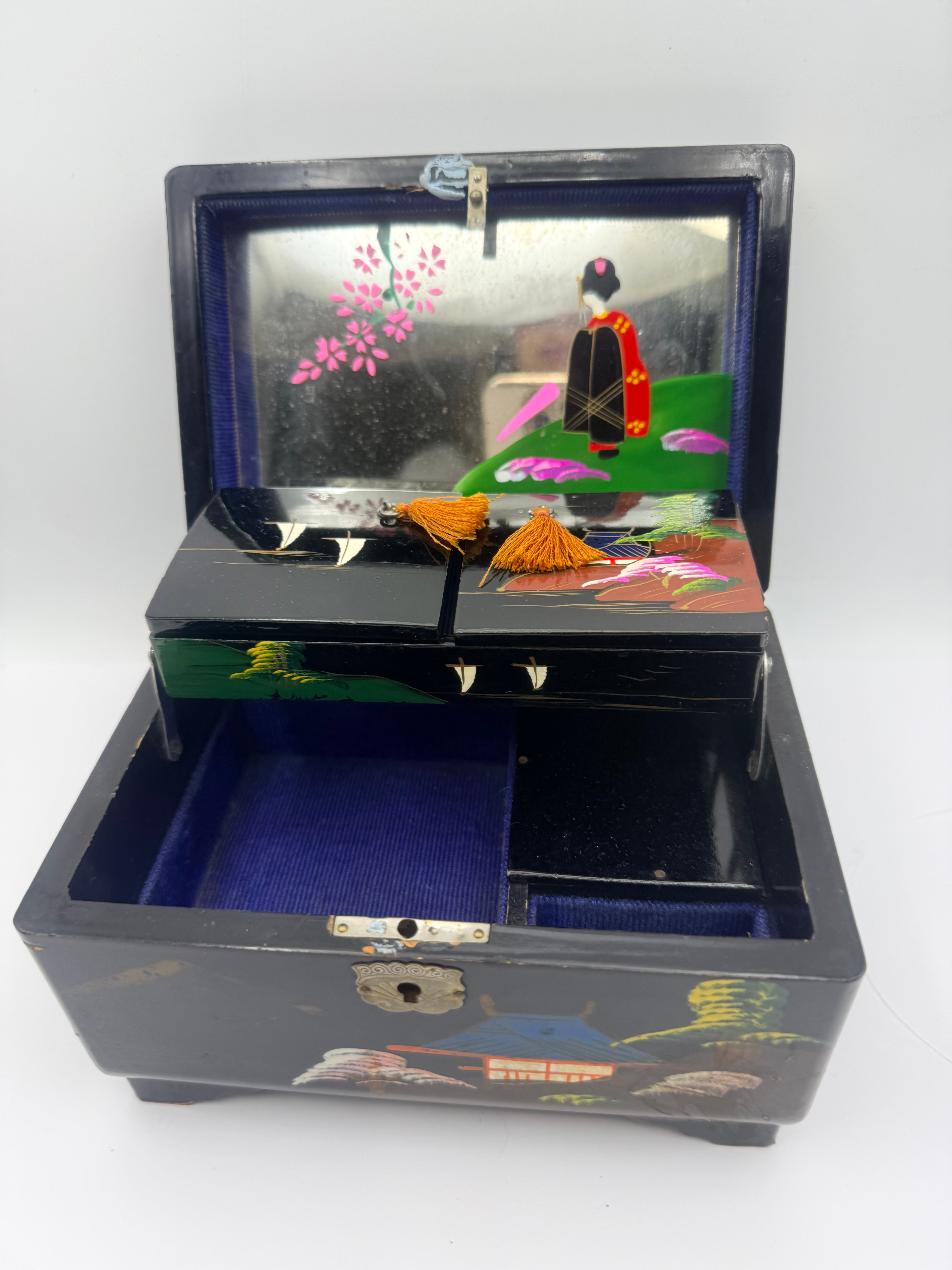 A vintage Japanese-style lacquered wood jewelry/music box, likely mid to late 20th century, distinguished by its black lacquer finish and extensive mother-of-pearl inlay. The exterior features scenic depictions of traditional Japanese landscapes with pagodas, mountains, and cherry blossoms. The hinged lid opens to reveal a mirrored interior with a painted scene of a geisha and cherry blossoms. Inside, a multi-tiered compartment system is lined with blue velvet-like fabric, including two small drawers adorned with orange tassels. The box stands on four small feet and is fitted with a brass-toned metal lock plate and hinges. No visible text or manufacturer’s markings are present.