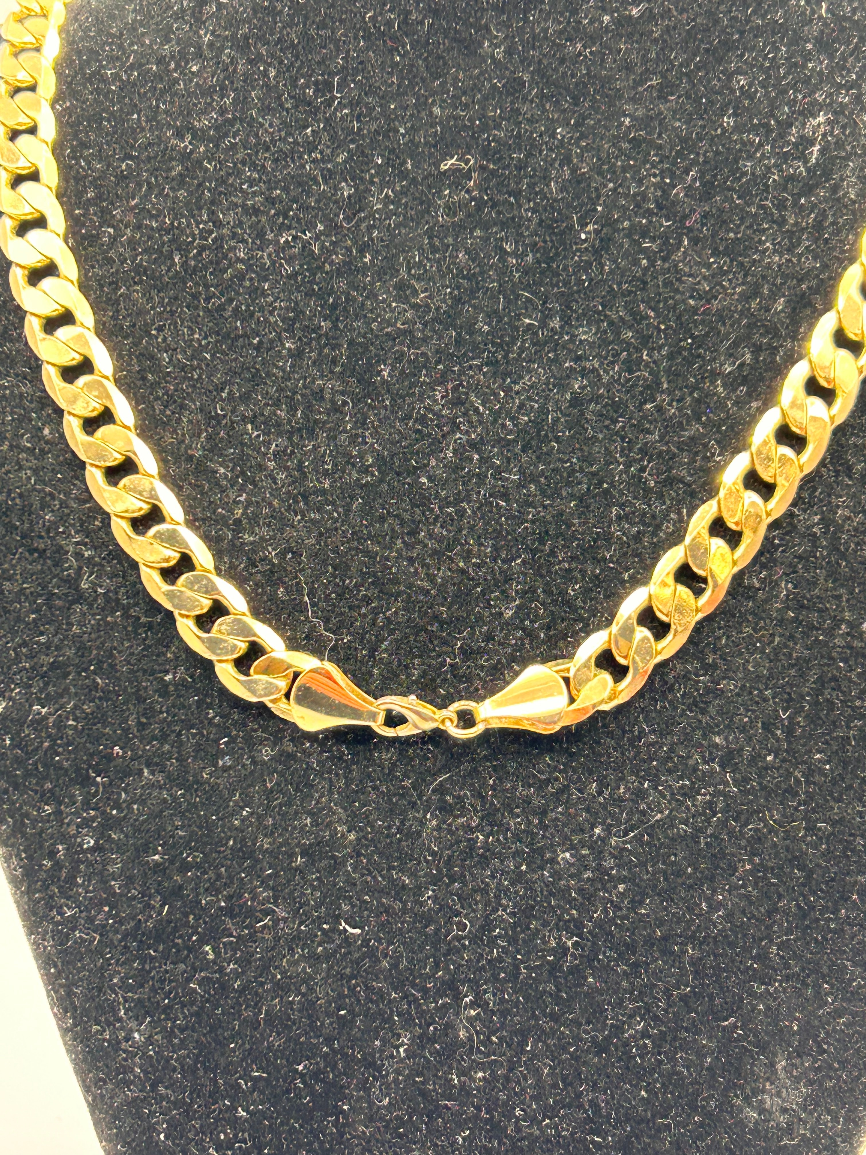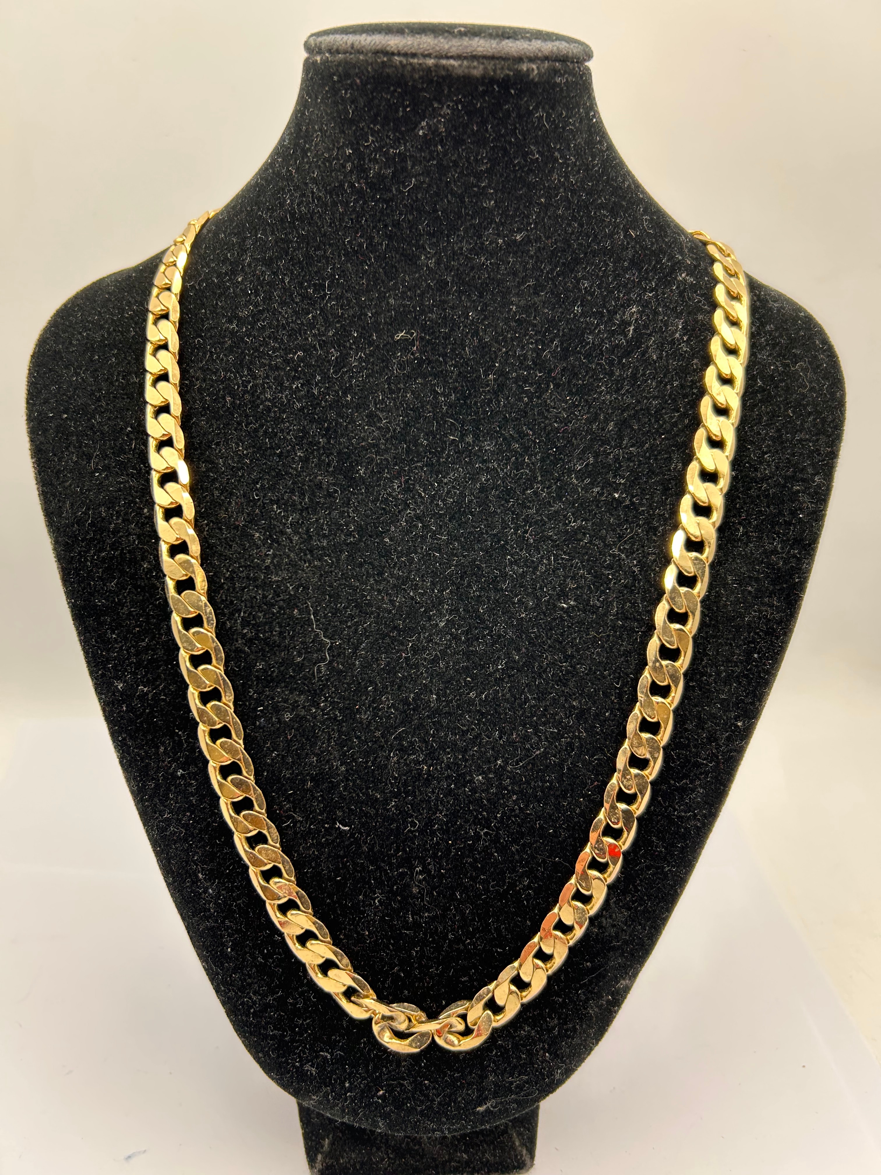A heavy gauge curb link chain necklace, featuring flattened, interlocked links. Crafted from a yellow-toned metal exhibiting a polished, reflective finish, consistent with gold or gold plating. The chain includes a visible and functional clasp mechanism. No discernible hallmarks, maker’s marks, or inscriptions are visible on the links or clasp.