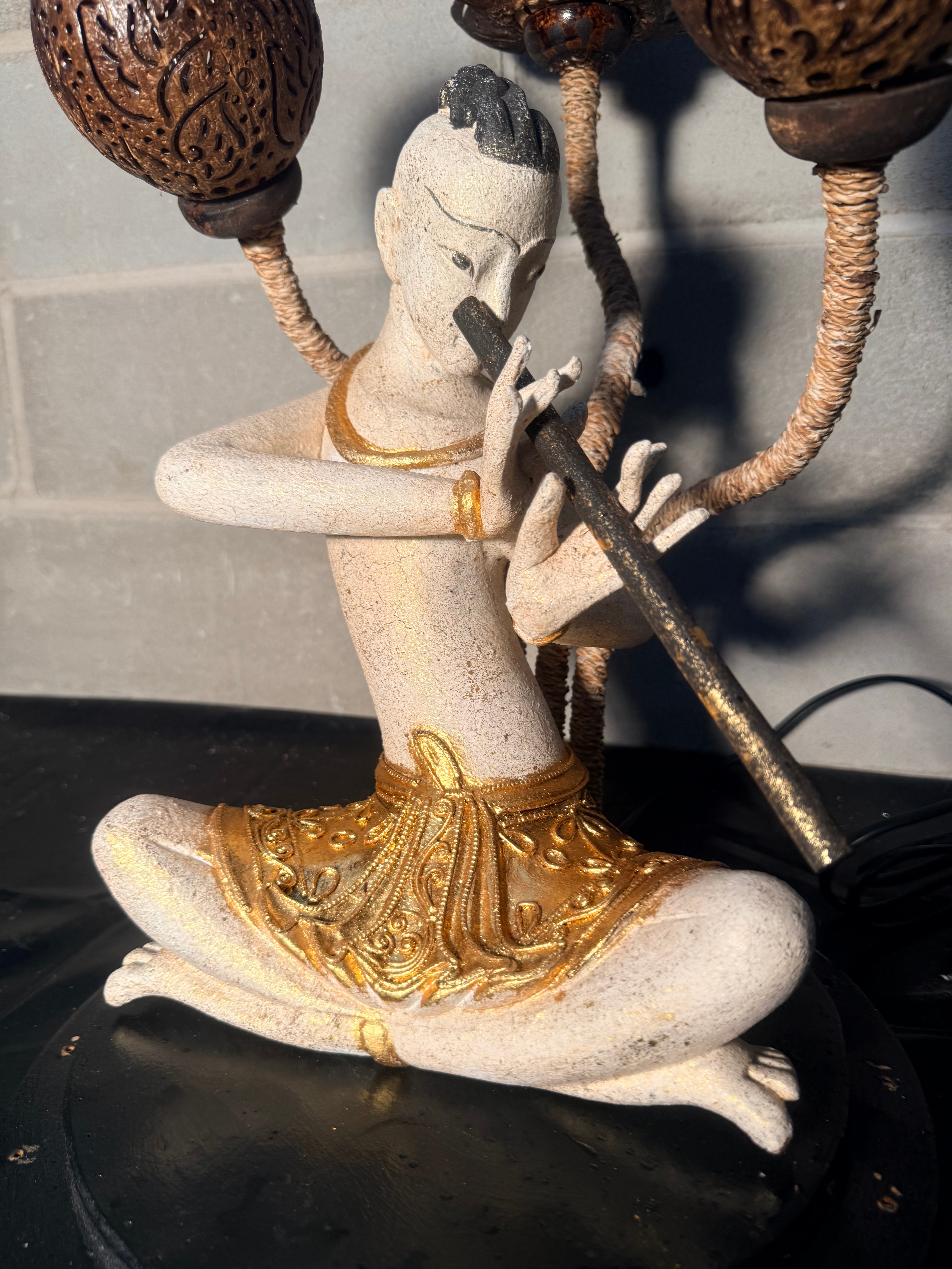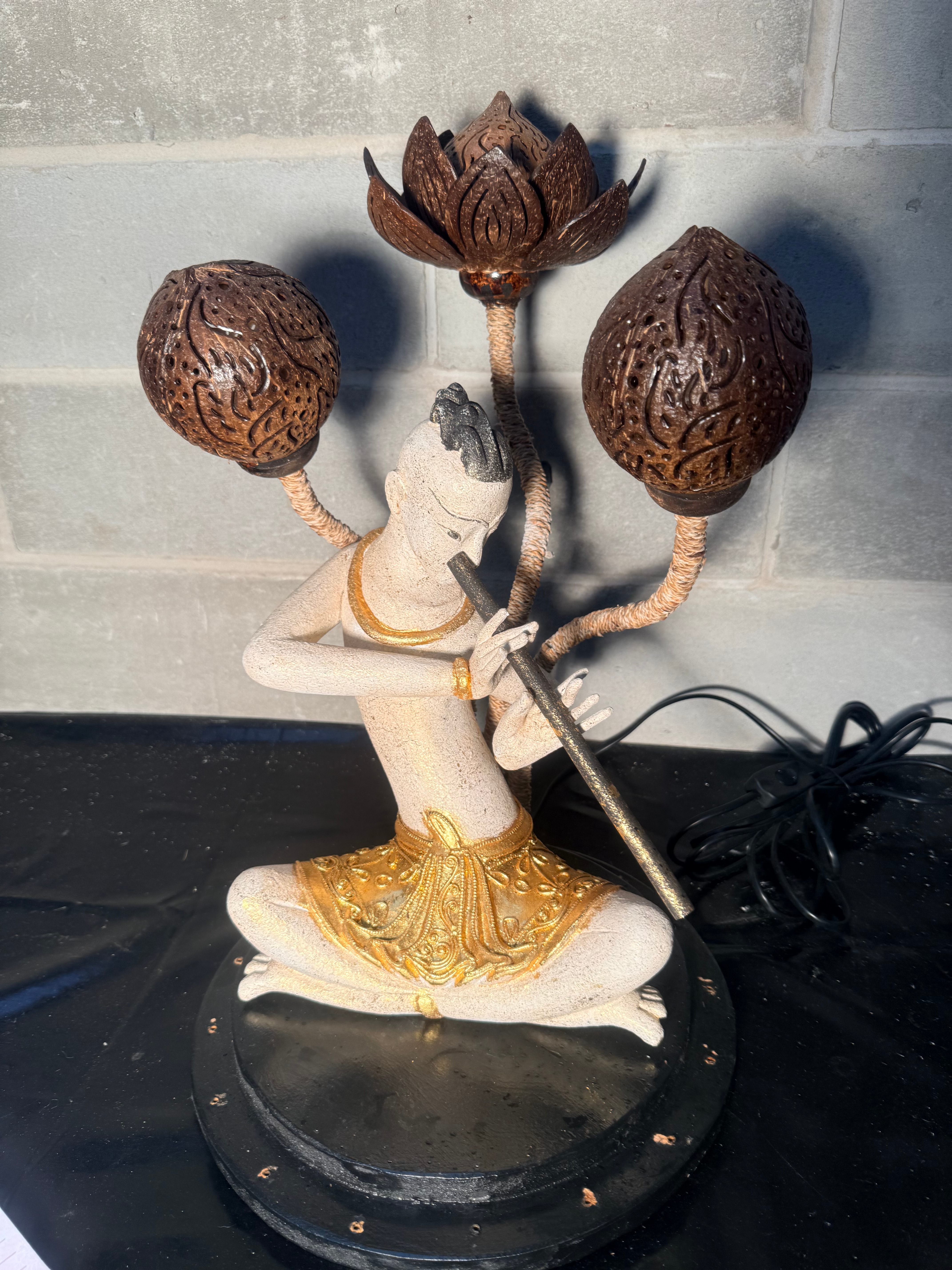 A decorative electric lamp crafted in a style reminiscent of Southeast Asian folk art, likely Thai or Balinese, appearing to be of contemporary manufacture. The central figure, constructed from a light-colored resin or composite with gilded gold accents on traditional attire and jewelry, is depicted in two variations across the images: one playing a transverse flute, and another a small barrel drum. Three distinct lamp shades, intricately carved from dark coconut shells, including a central lotus blossom and two spherical motifs, extend from the figure via natural fiber-wrapped arms. The entire ensemble is mounted on a dark, circular wooden or composite base, with a visible black electrical cord suggesting its function as a lamp.