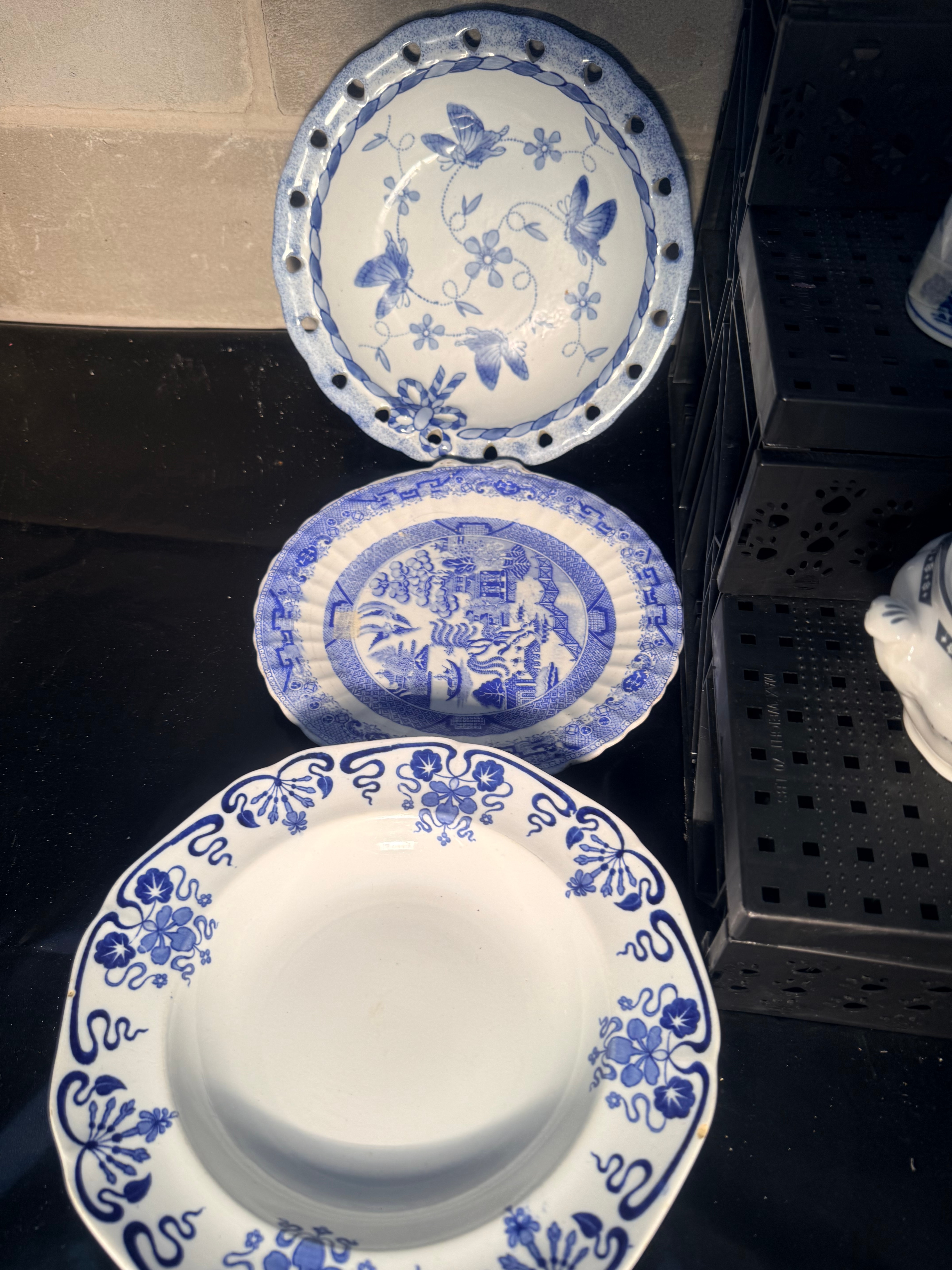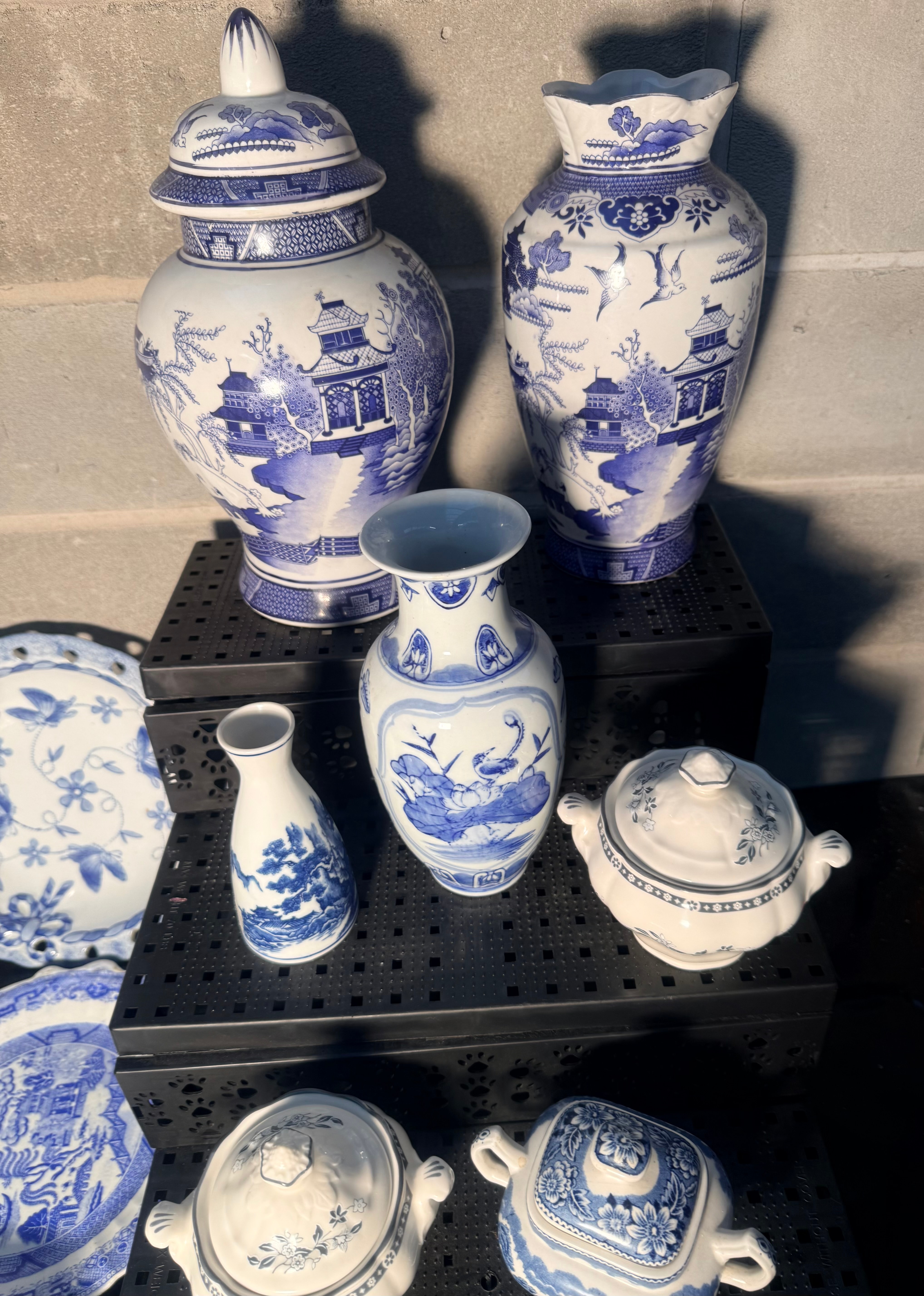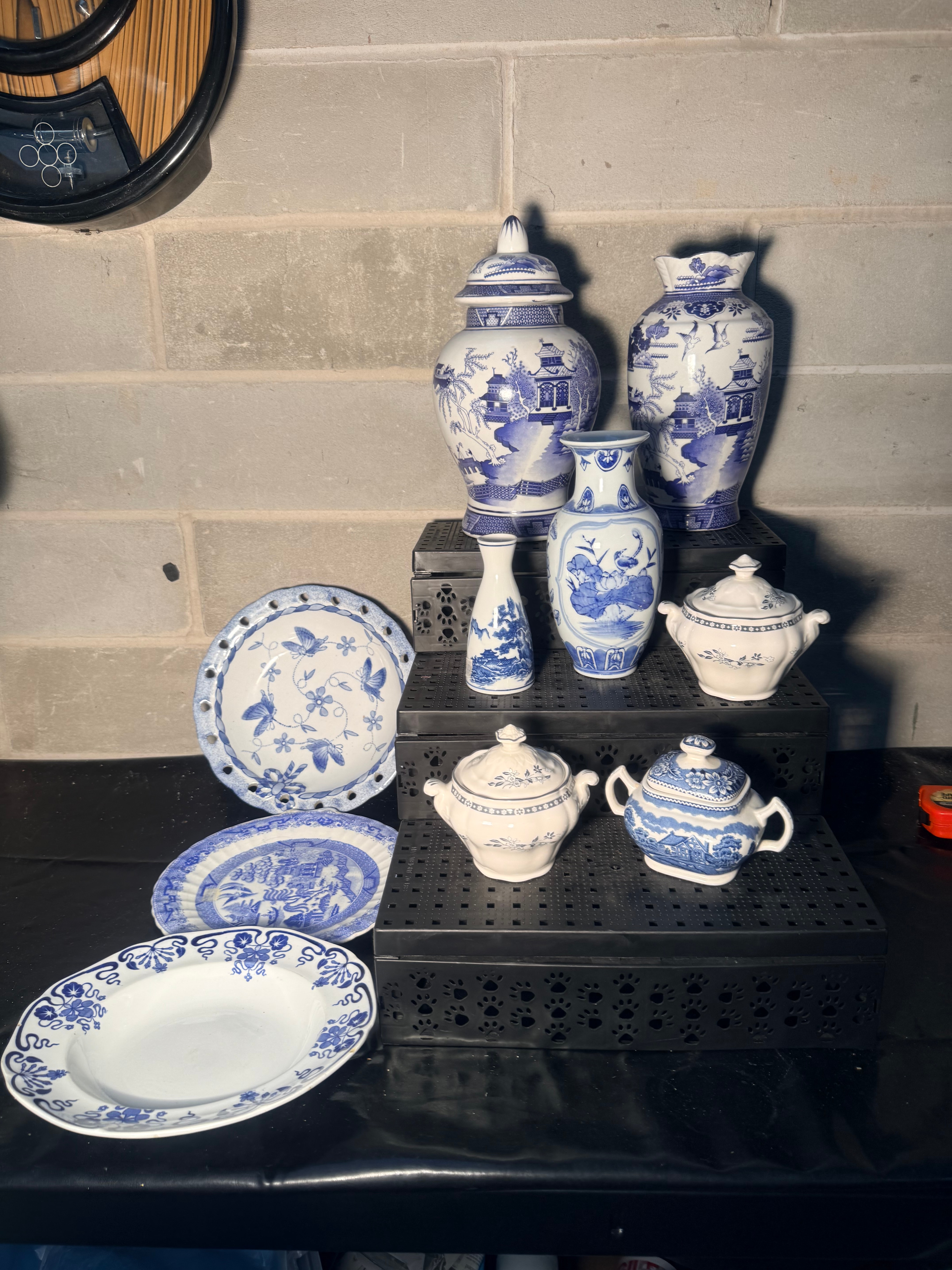 A collection of Royal Doulton ‘Real Old Willow’ blue and white ceramic decorative and tableware items. Comprising approximately twelve pieces, the group includes two large lidded jars or vases, three smaller vases or bottles, three lidded tureens or serving dishes, one pierced decorative plate, one oval platter, and one deep dish. All pieces feature blue designs on a white ground, depicting various Asian-inspired motifs such as pagodas, landscapes, birds, butterflies, and stylized floral patterns, consistent with Chinoiserie or traditional transferware styles. The oval platter notably exhibits the classic ‘Willow pattern’. The material is glazed ceramic, likely porcelain or earthenware.
