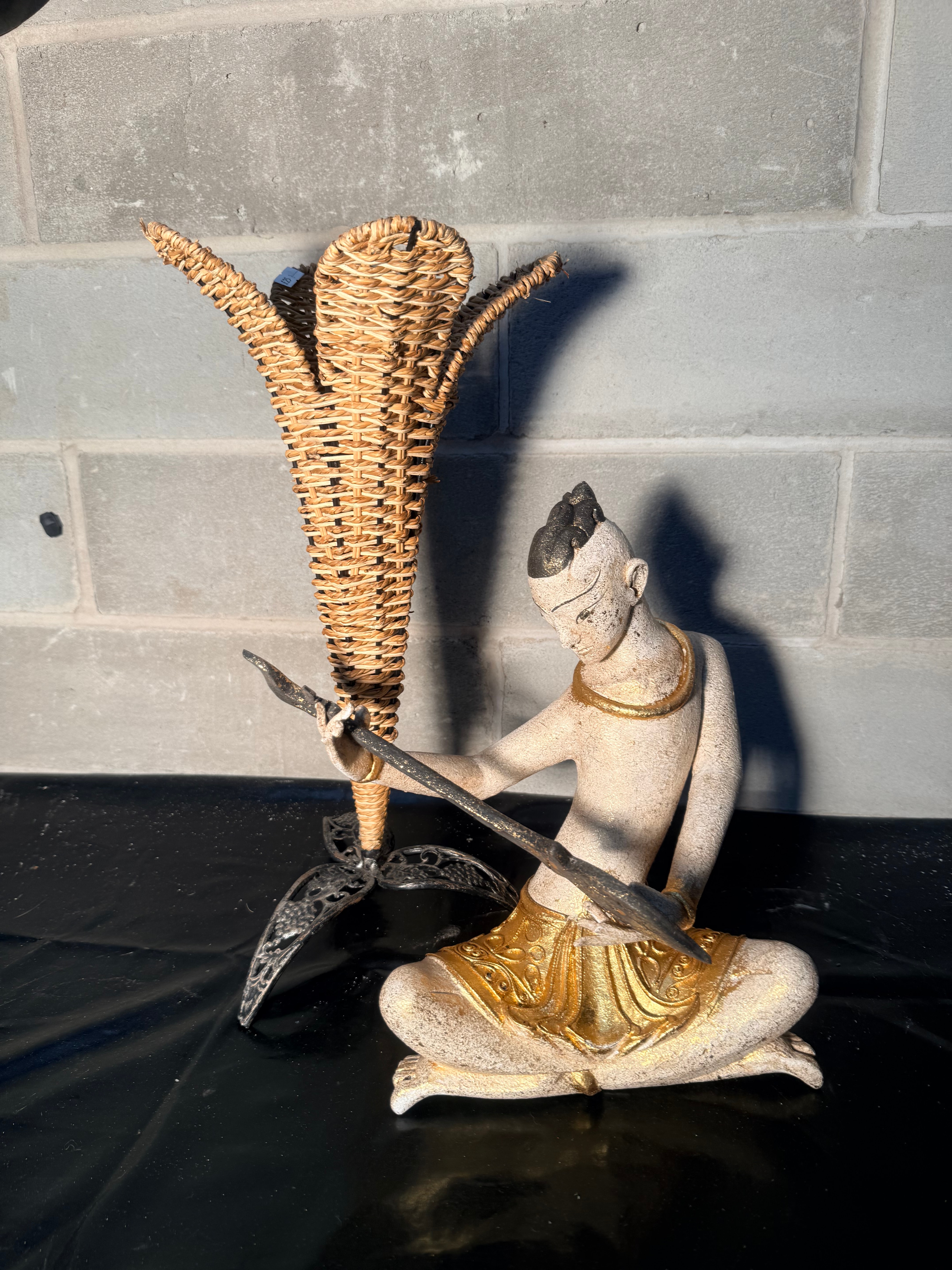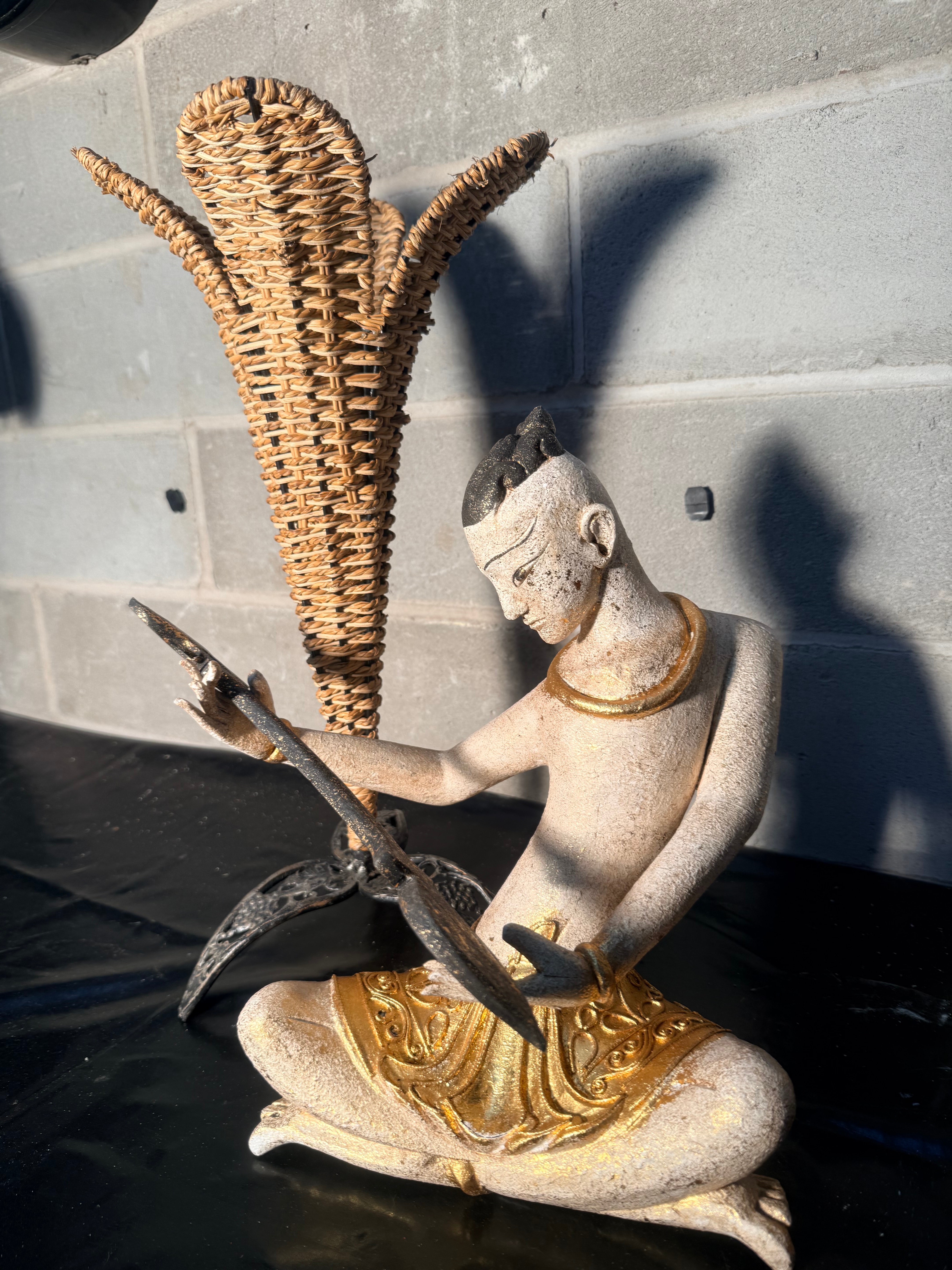 A sculpture depicting a cross-legged male figure playing a stringed instrument, rendered in a style reminiscent of Southeast Asian art, possibly Thai or Khmer. The figure is crafted from a light-colored, textured material, likely cast stone, concrete, or resin, with painted gold accents on the garment, necklace, and wristbands, and dark details on the hair and instrument. It exhibits a deliberately aged or distressed surface patina. No visible text, signatures, or identifying markings are present. Accompanying the figure is a tall, flaring decorative object made from woven natural fibers, resembling wicker or rattan, mounted on a dark, ornate metal base.