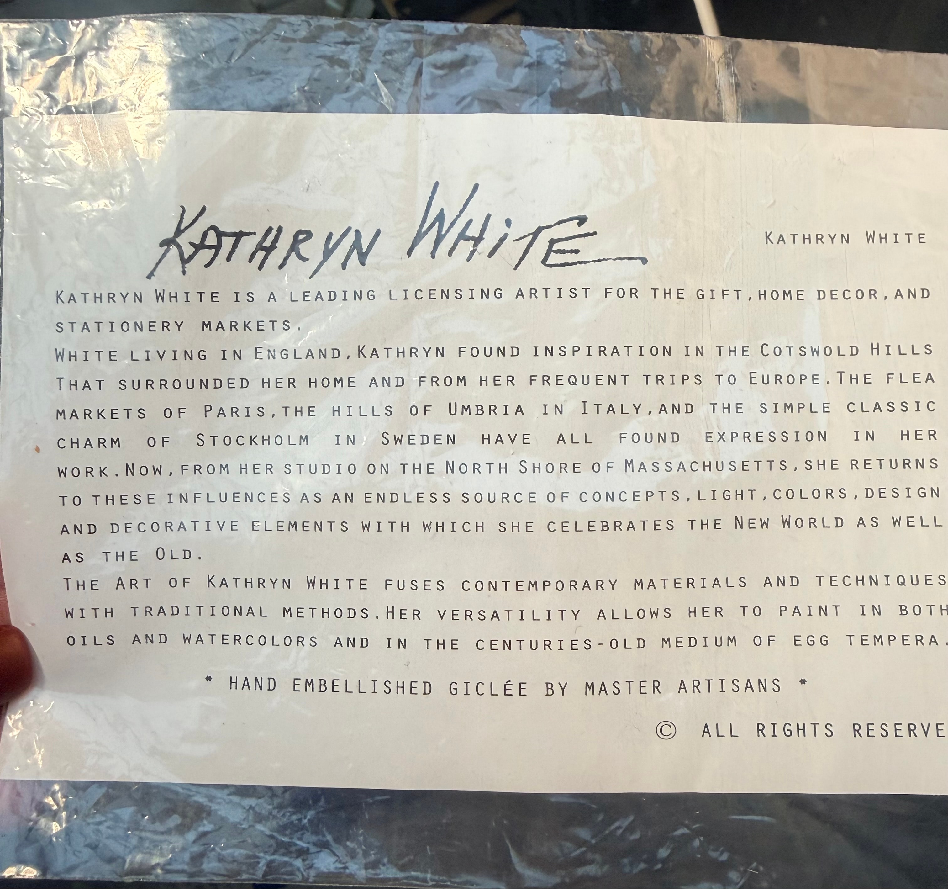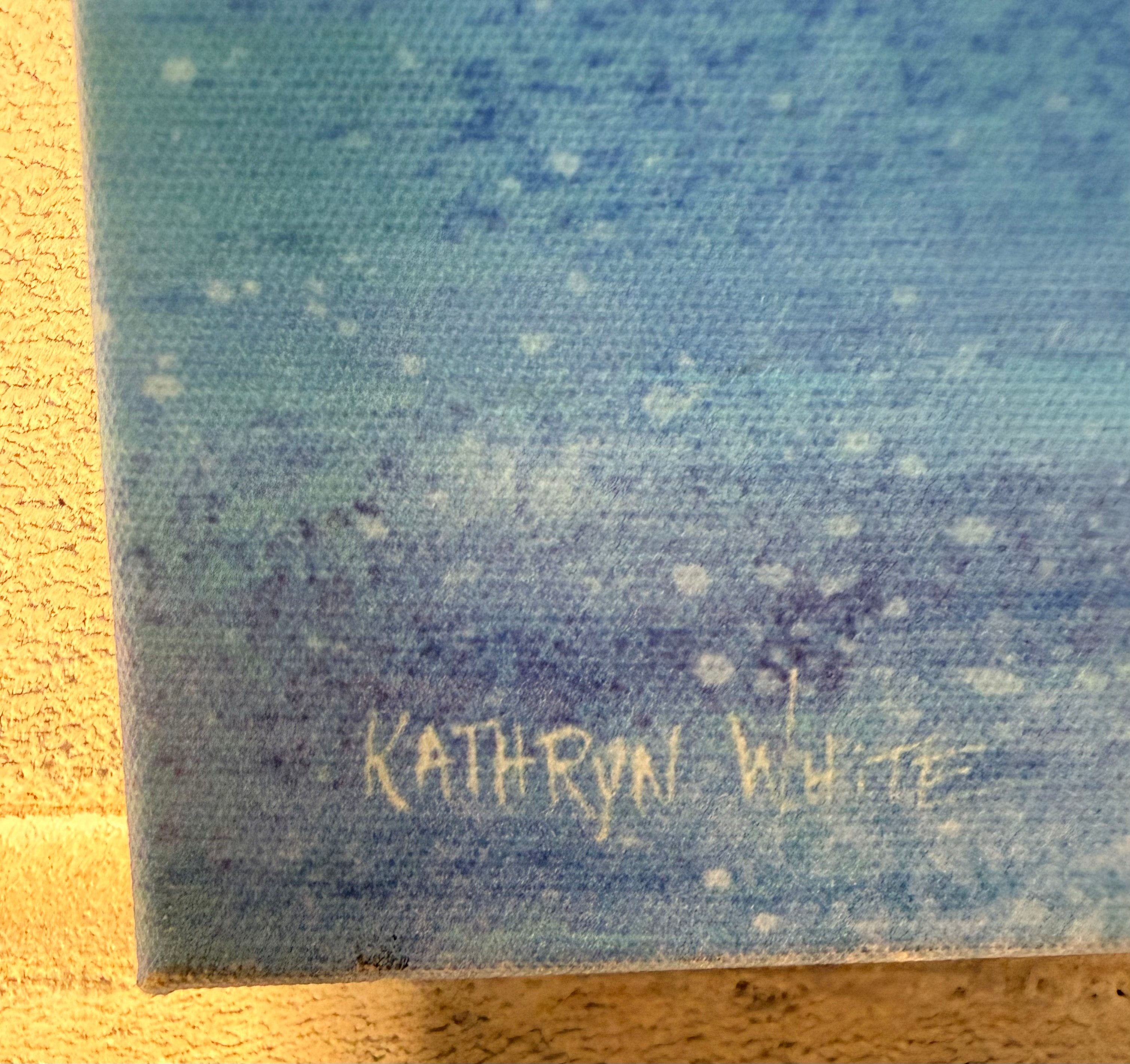 A hand-embellished giclée print on canvas by Kathryn White, depicting a vibrant coastal landscape. The scene features three blue and white striped beach huts on a sandy shore in the foreground. To the left, a red and white lighthouse stands on an islet, with two white sailboats visible on the blue sea under a light sky in the background. A small seagull is present on the sand. The artwork is signed “KATHRYN WHITE” in the lower left corner. An accompanying information sheet confirms the artist as Kathryn White and specifies the item as a “HAND EMBELLISHED GICLÉE BY MASTER ARTISANS.”