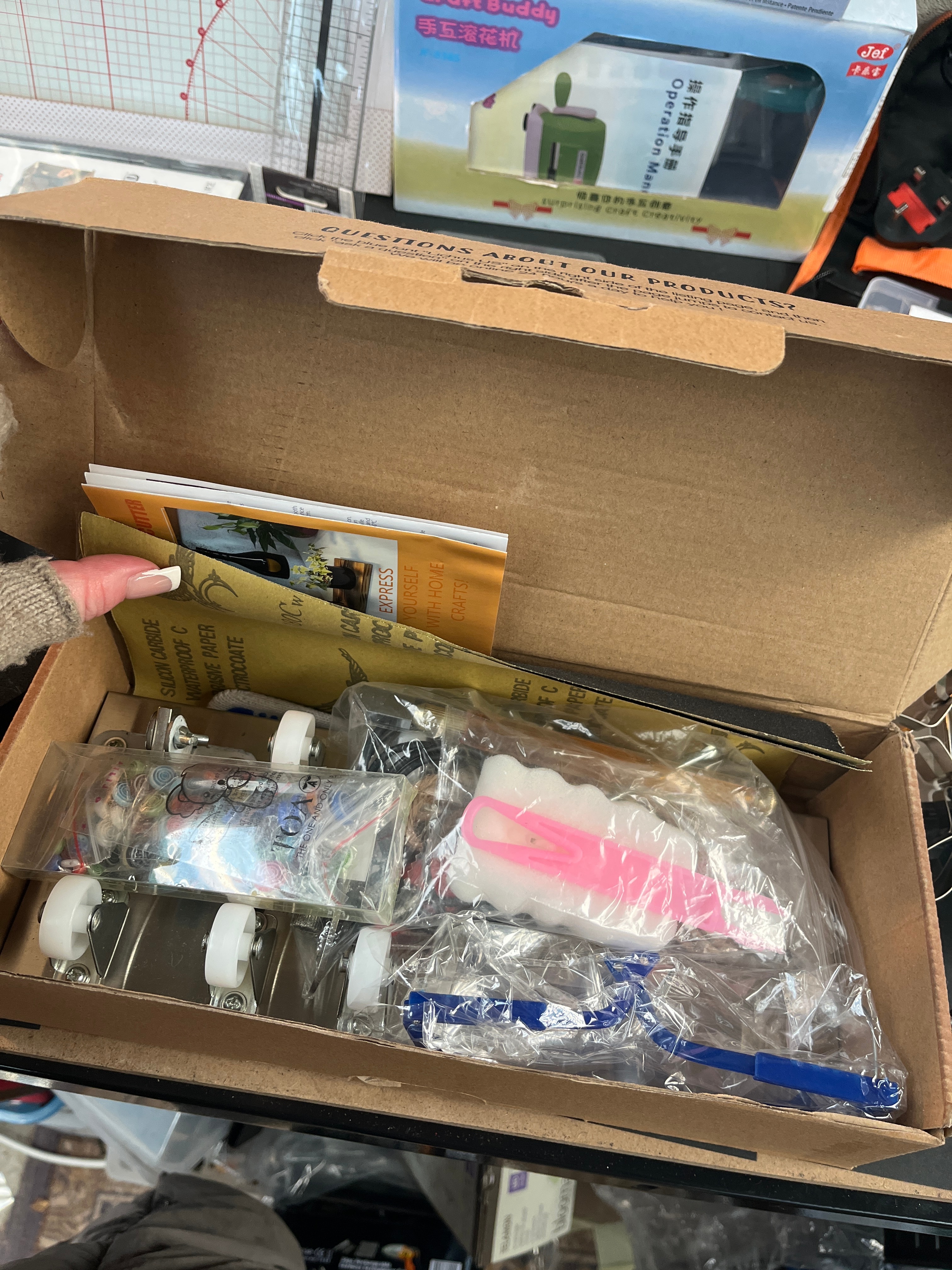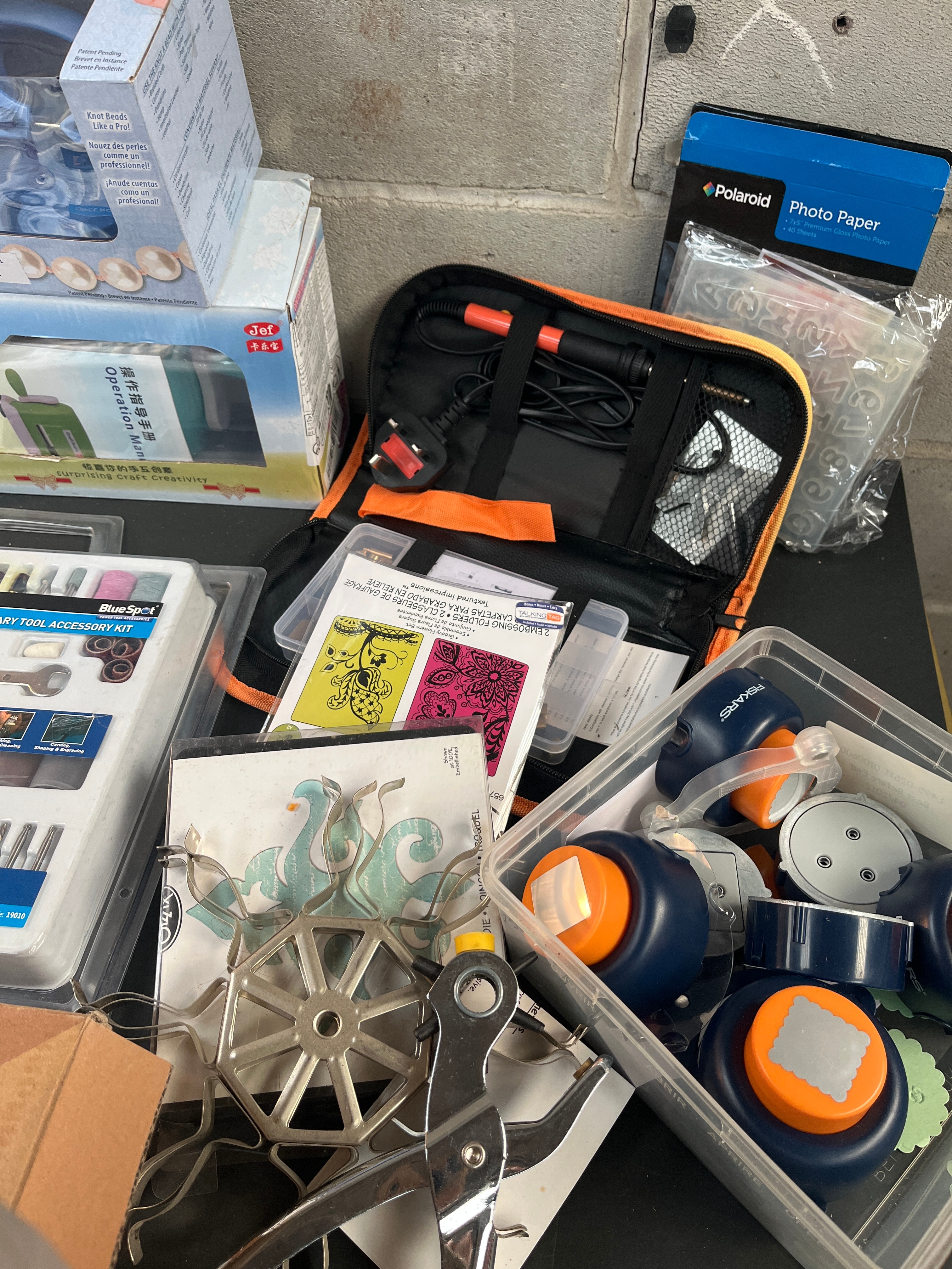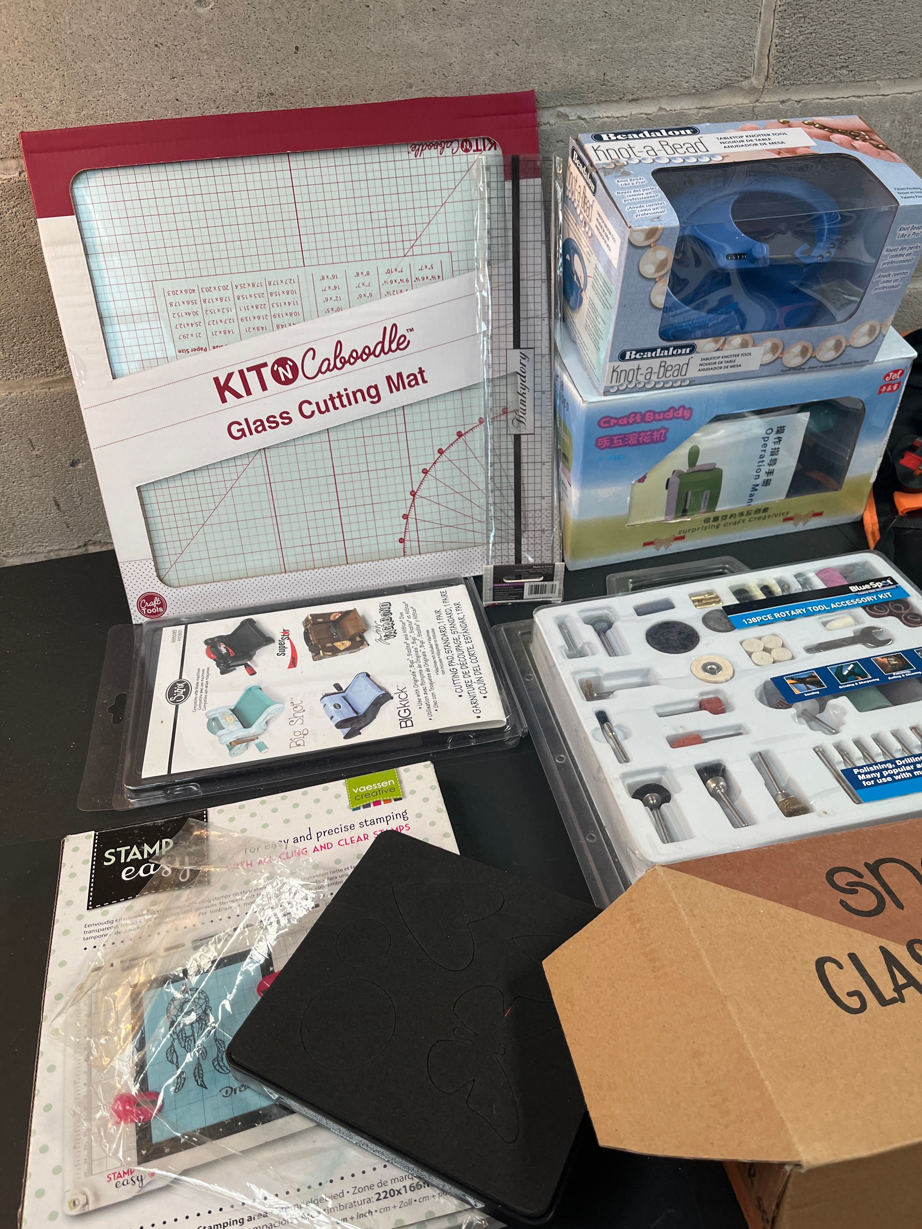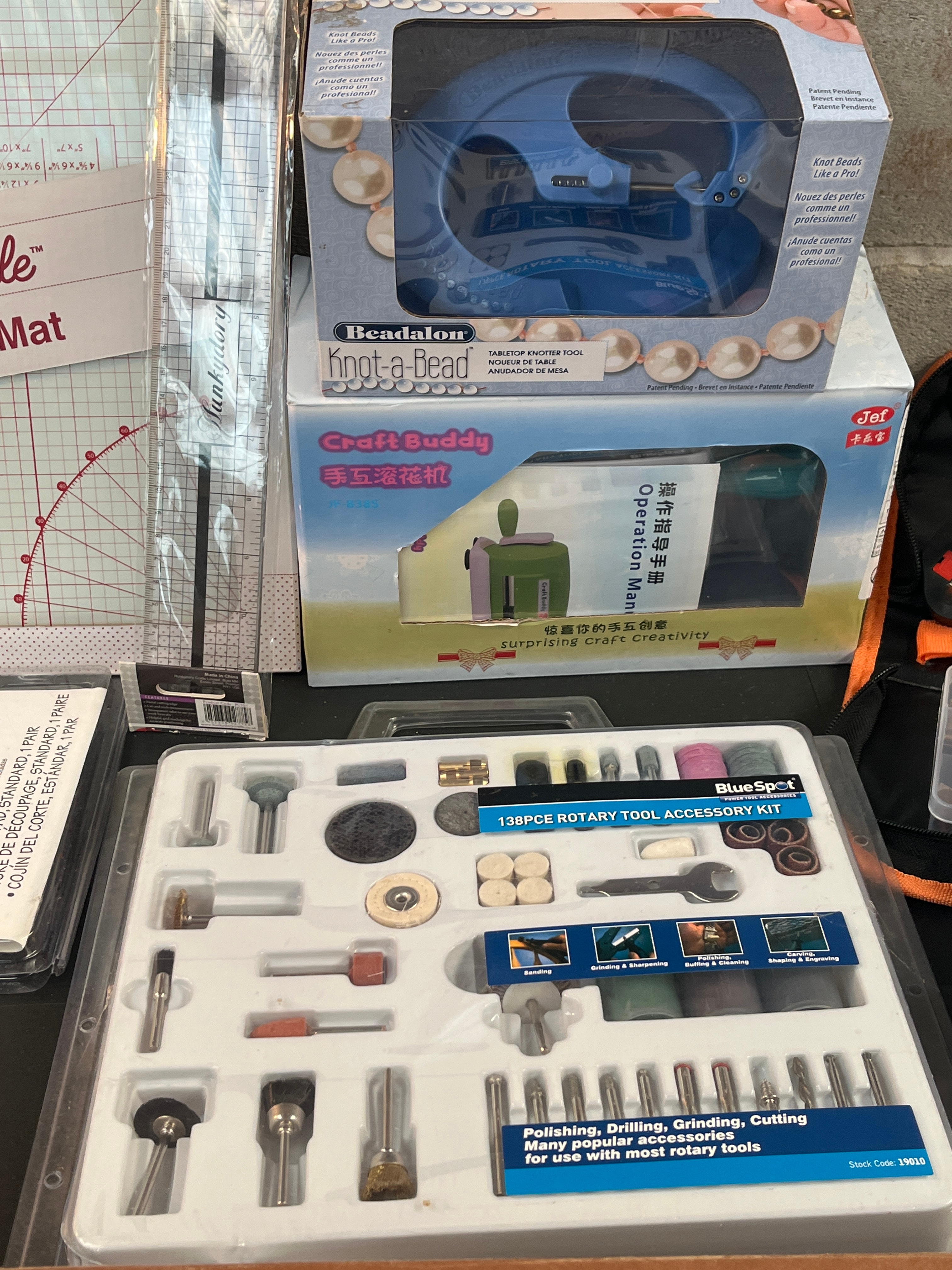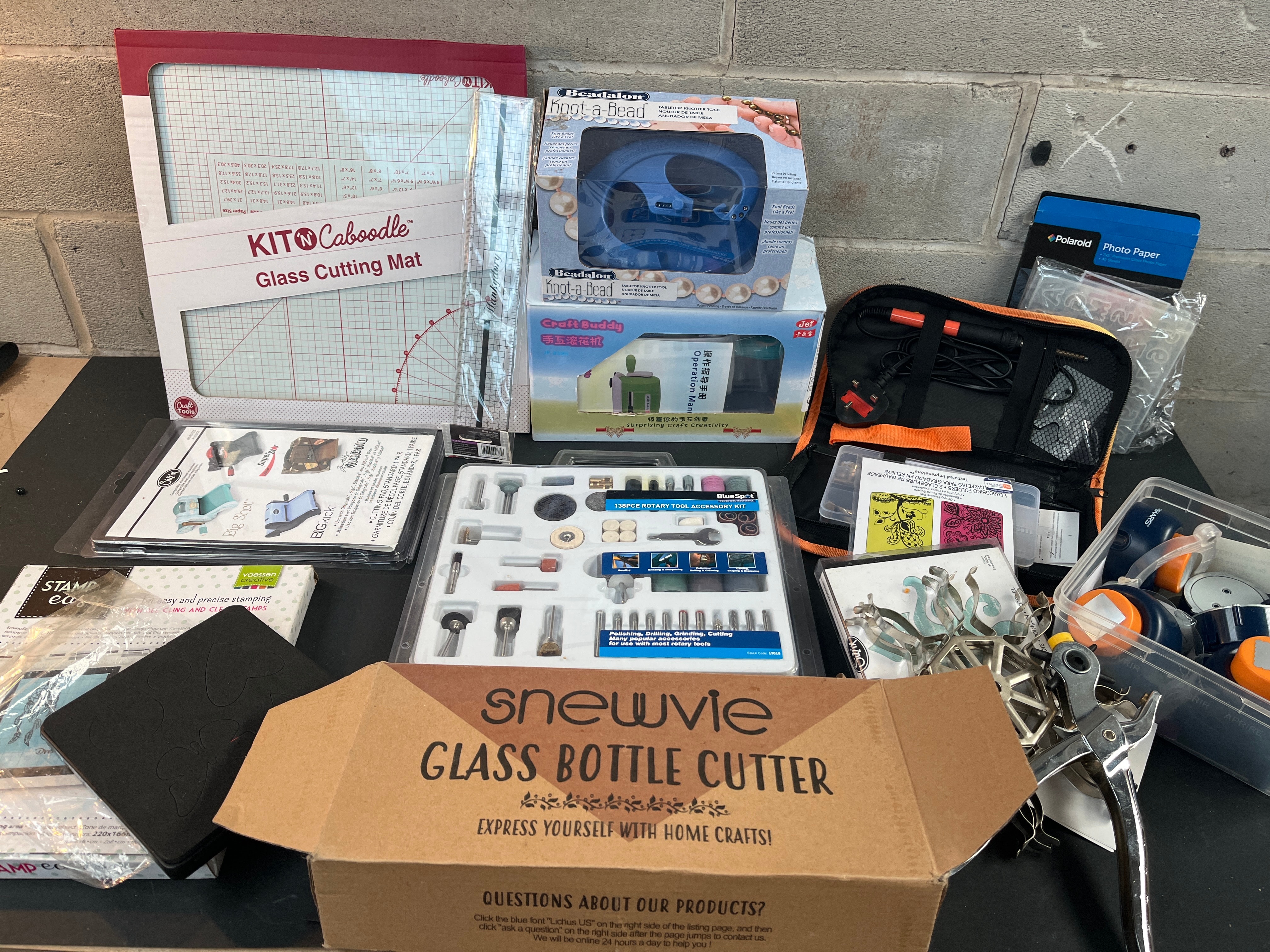 A diverse collection of modern crafting tools and supplies, primarily composed of plastic and metal. The collection includes a Beadalon Knot-a-Bead tabletop knotter tool, a Kit Kaboodle glass cutting mat, a Craft Buddy “手压花机” (Hand Press Flower Machine), a Snewvie glass bottle cutter, and a BlueSpot 130-piece rotary tool accessory kit. Further components consist of various plastic paper punches, a metal crimping or eyelet setting tool, a Dremel-branded tool in an orange zippered case, Stamp-Eazy stamping accessories, Polaroid photo paper, and assorted stencils and loose crafting parts.