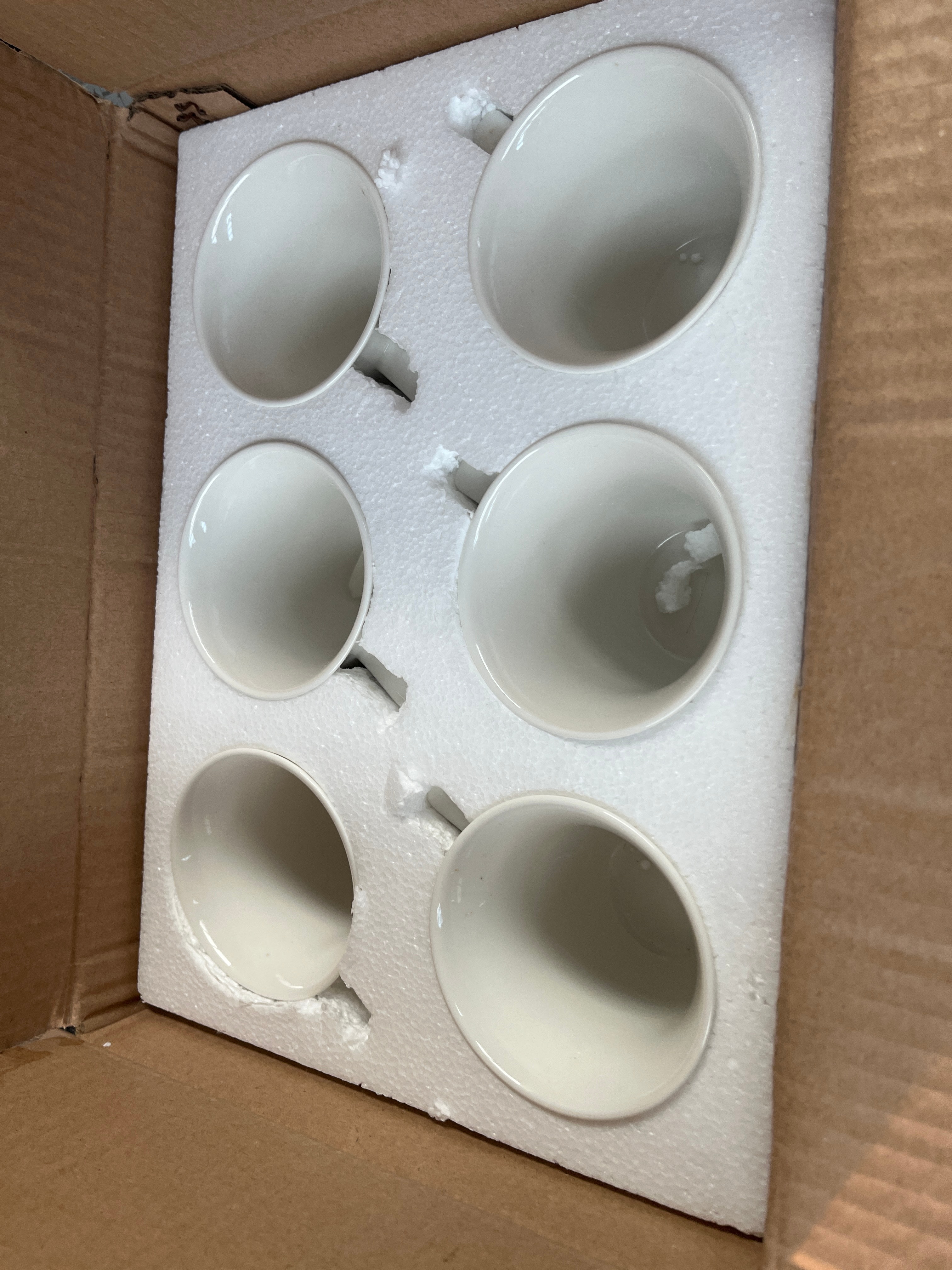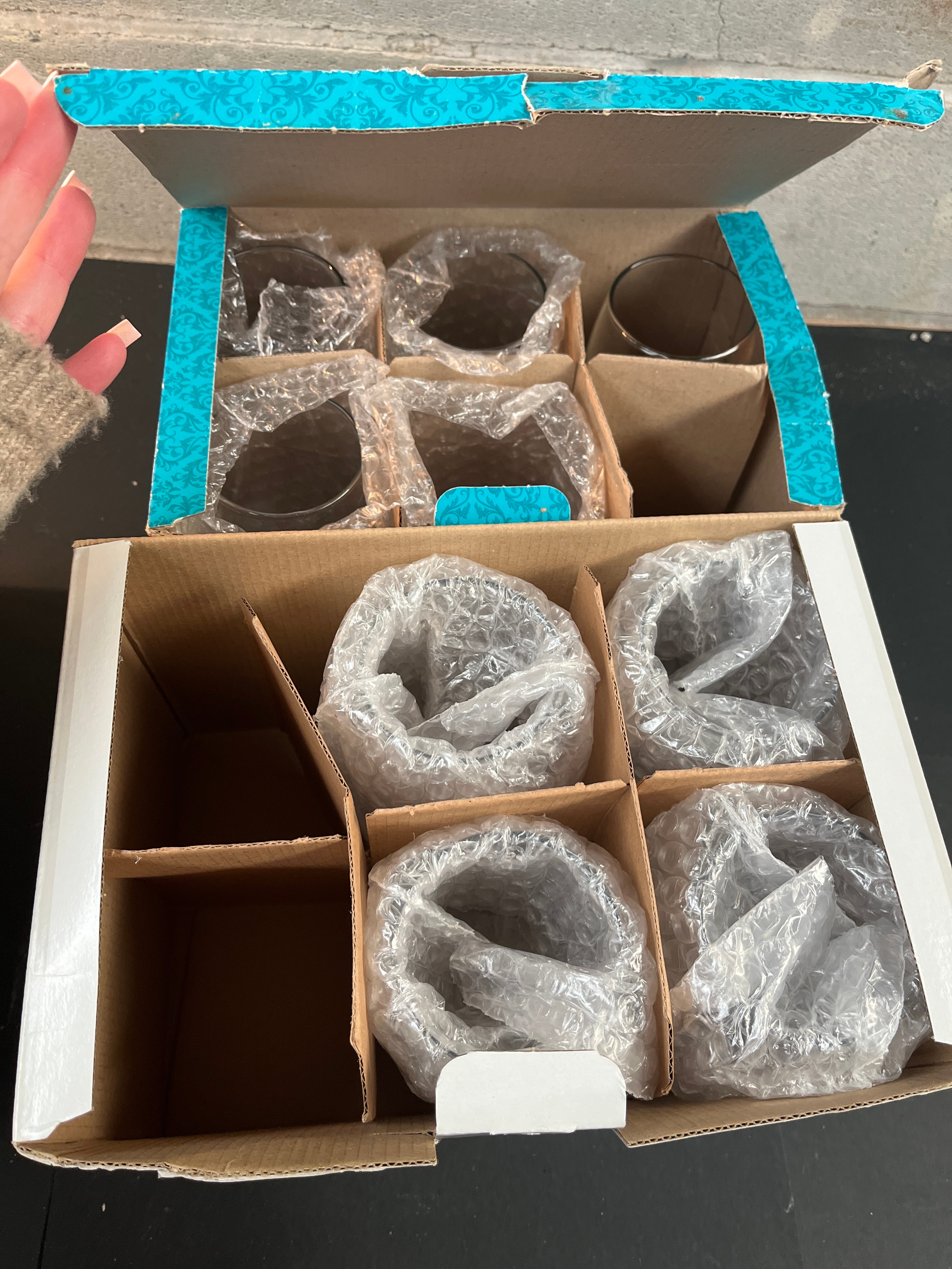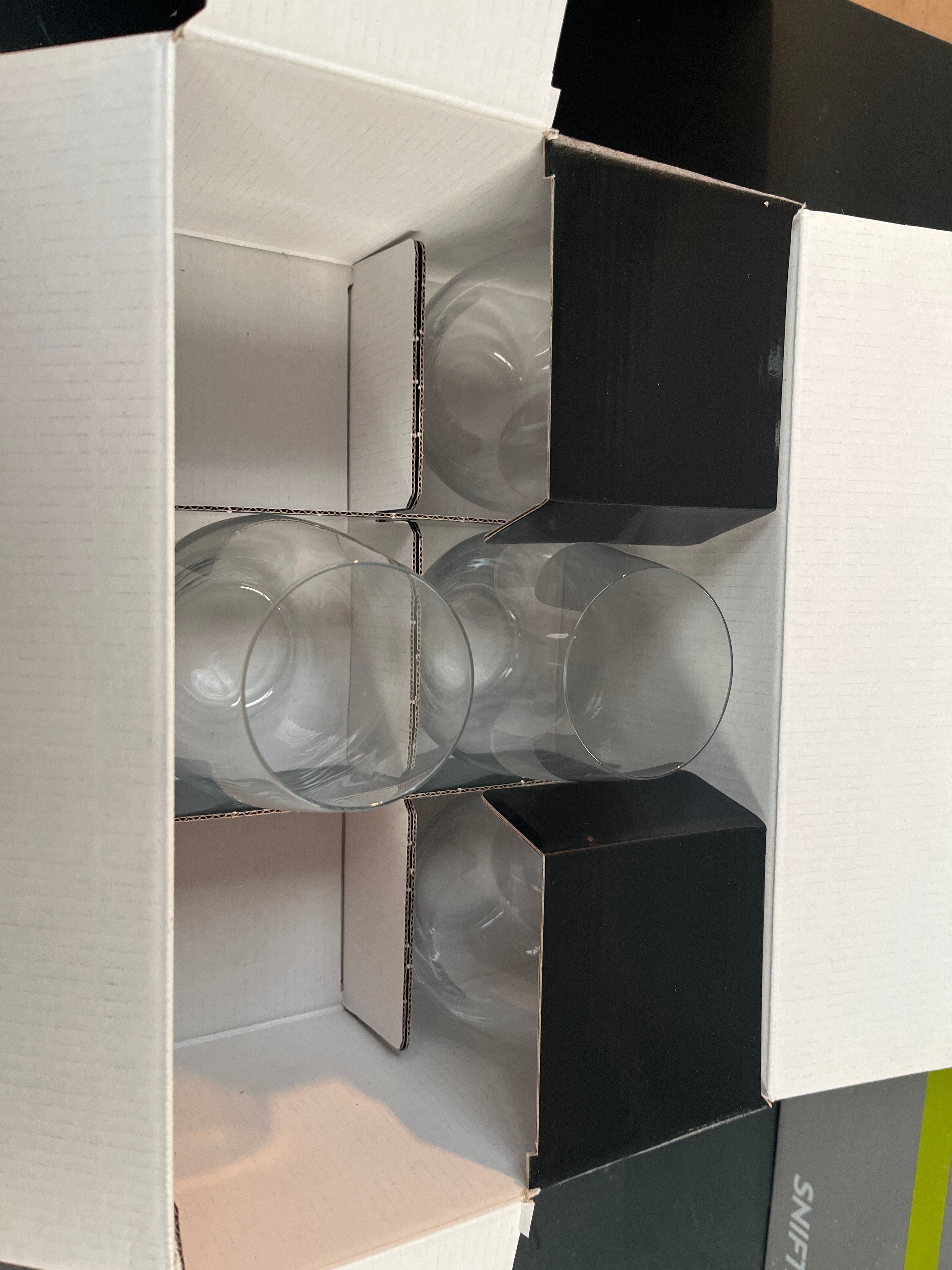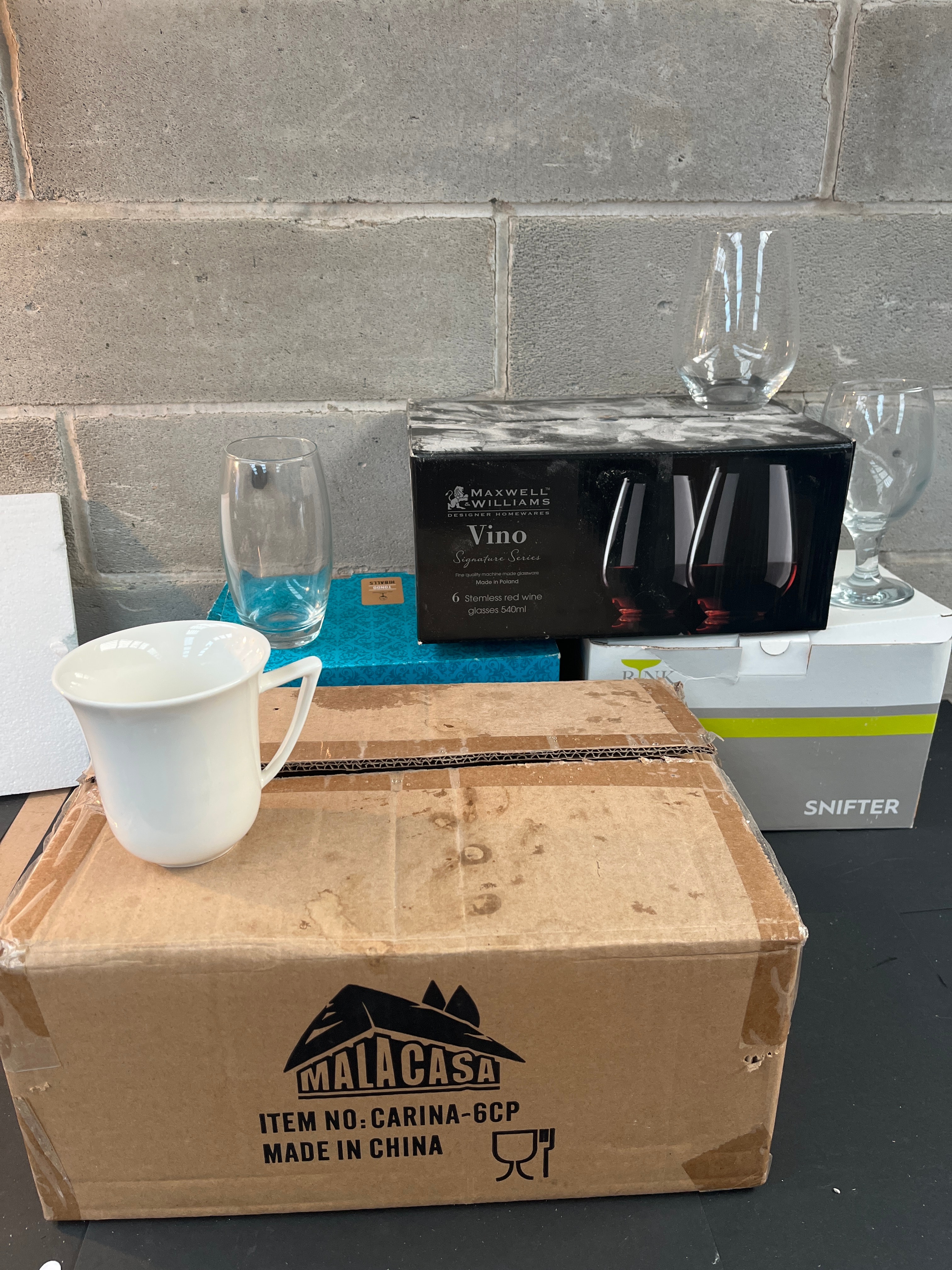 This lot comprises multiple sets of new, contemporary kitchenware and tableware items. Included are one set of four Maxwell & Williams ‘Vino Signature Series’ 540ml stemless red wine glasses in their original black box, one set of six white ceramic ‘MALACASA CARINA-6CP’ mugs (marked “MADE IN CHINA”) in their original cardboard box with styrofoam inserts, one set of four ‘SNIFTER’ clear glass tumblers or stemless glasses in a white box with cardboard dividers, and a separate set of clear glass tumblers/drinking glasses, some individually bubble-wrapped, in a decorative blue box. All items are crafted from clear glass or white ceramic, presented in their original retail packaging.
