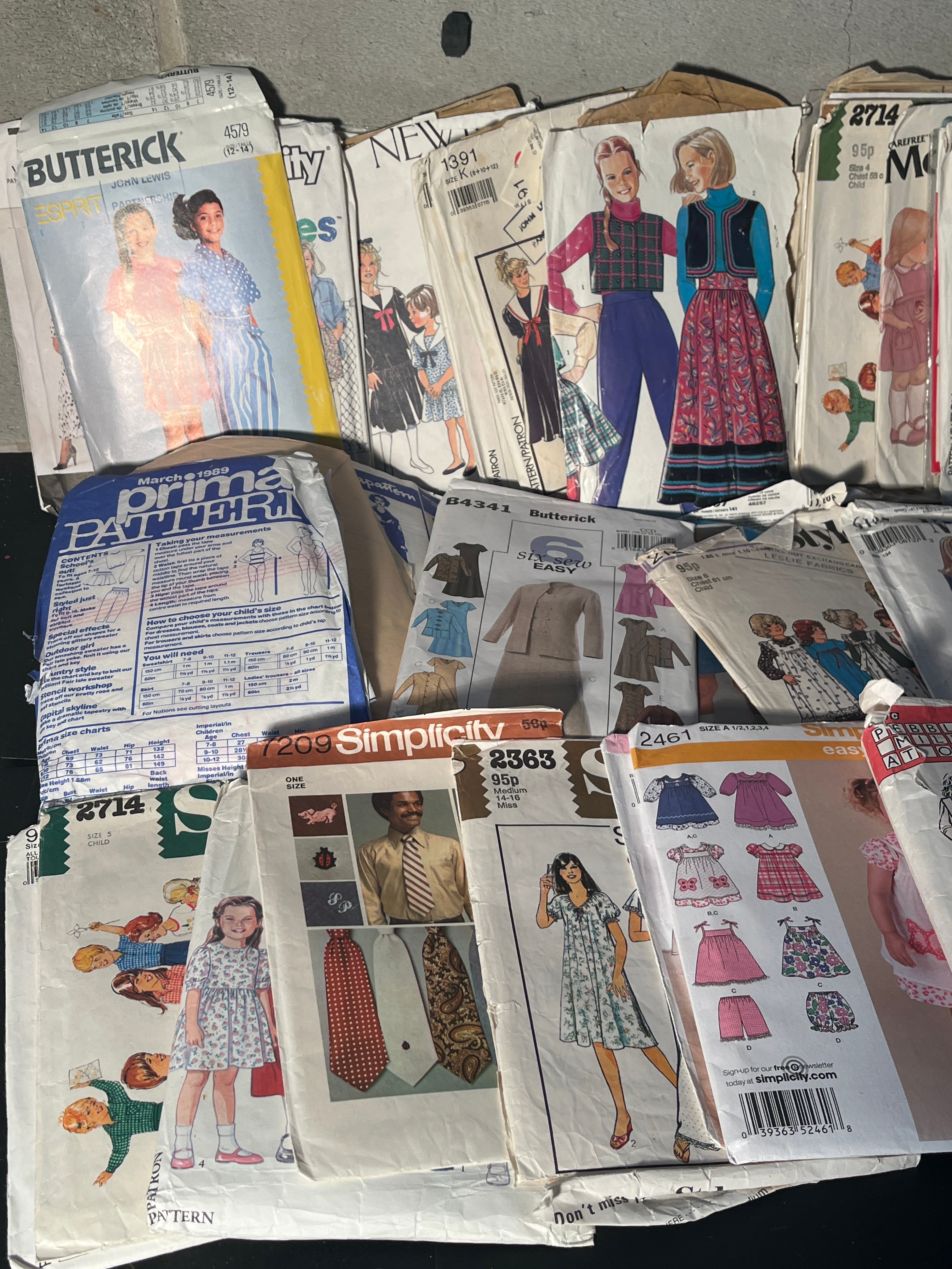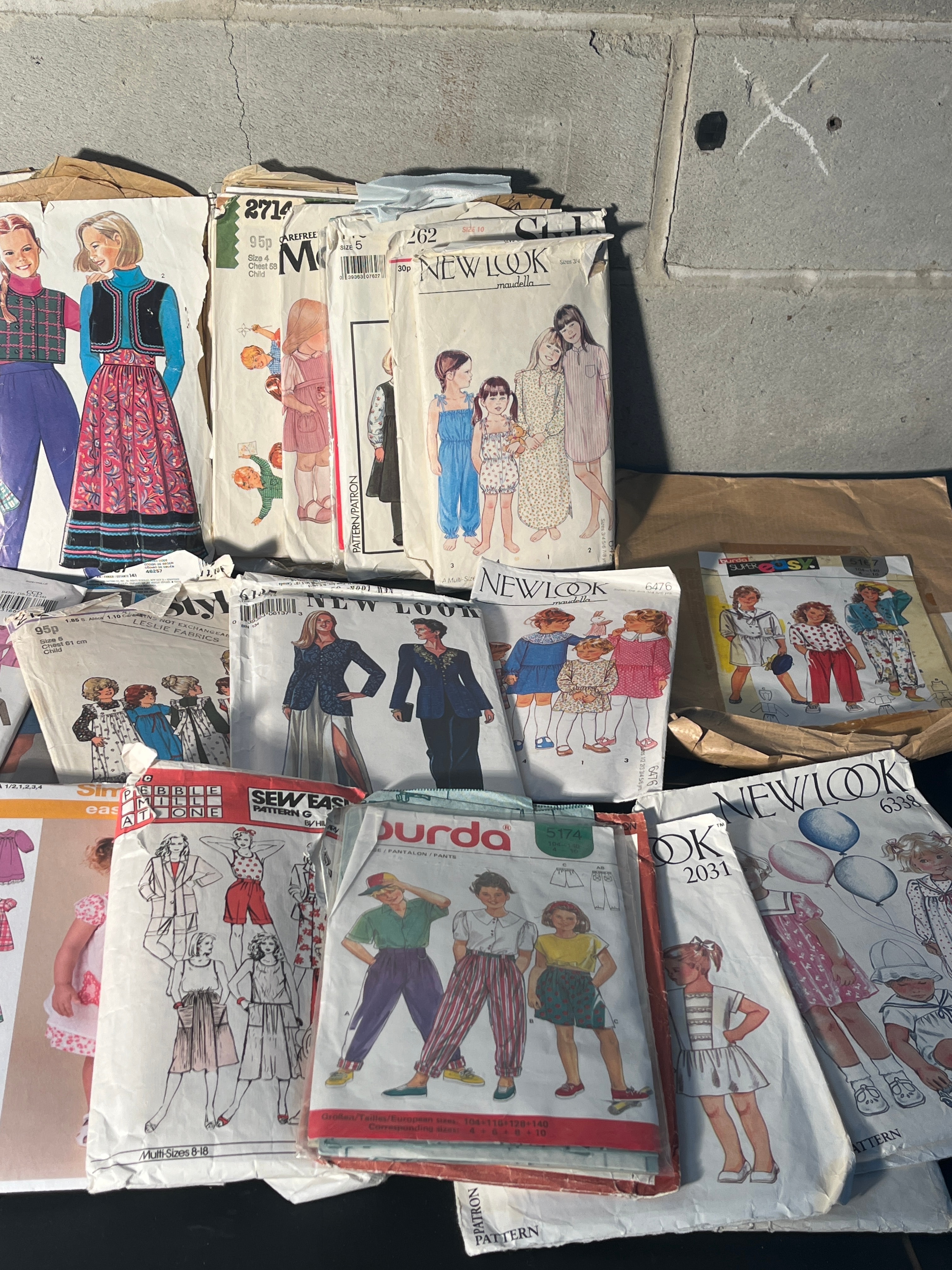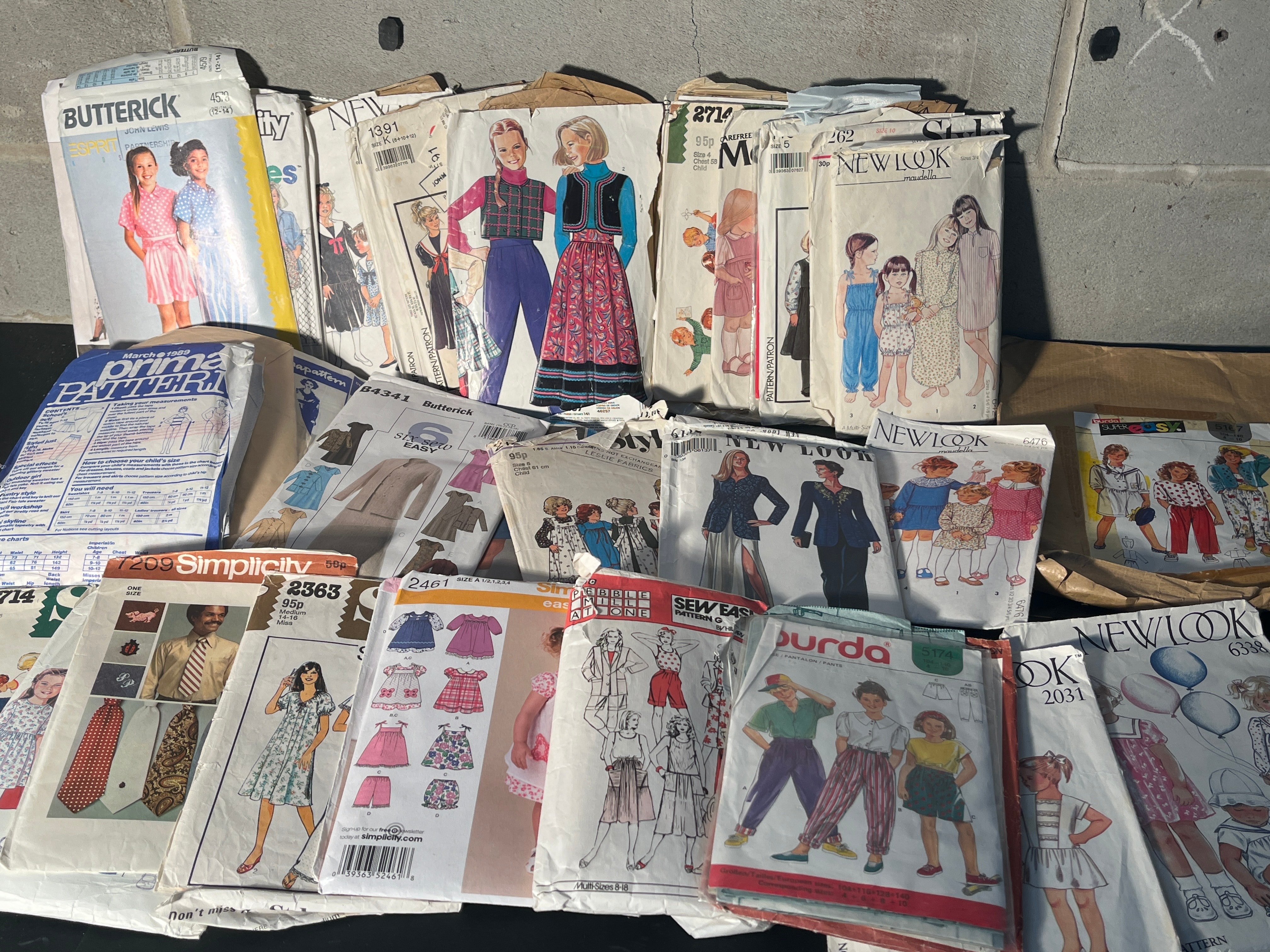 This lot comprises a large collection of commercial sewing patterns from well-known brands including Butterick, Simplicity, New Look, Burda, and Prima Pattern. The patterns are housed in paper envelopes, often featuring illustrated or photographic depictions of finished garments for children and adults. Styles are indicative of the late 1980s through the 1990s and possibly early 2000s, with a “March 1989” date visible on one “Prima Pattern” envelope. Visible markings include various pattern numbers, brand names, and instructional keywords such as “SEW EASY” and “Multi-Sizes,” all primarily in English.