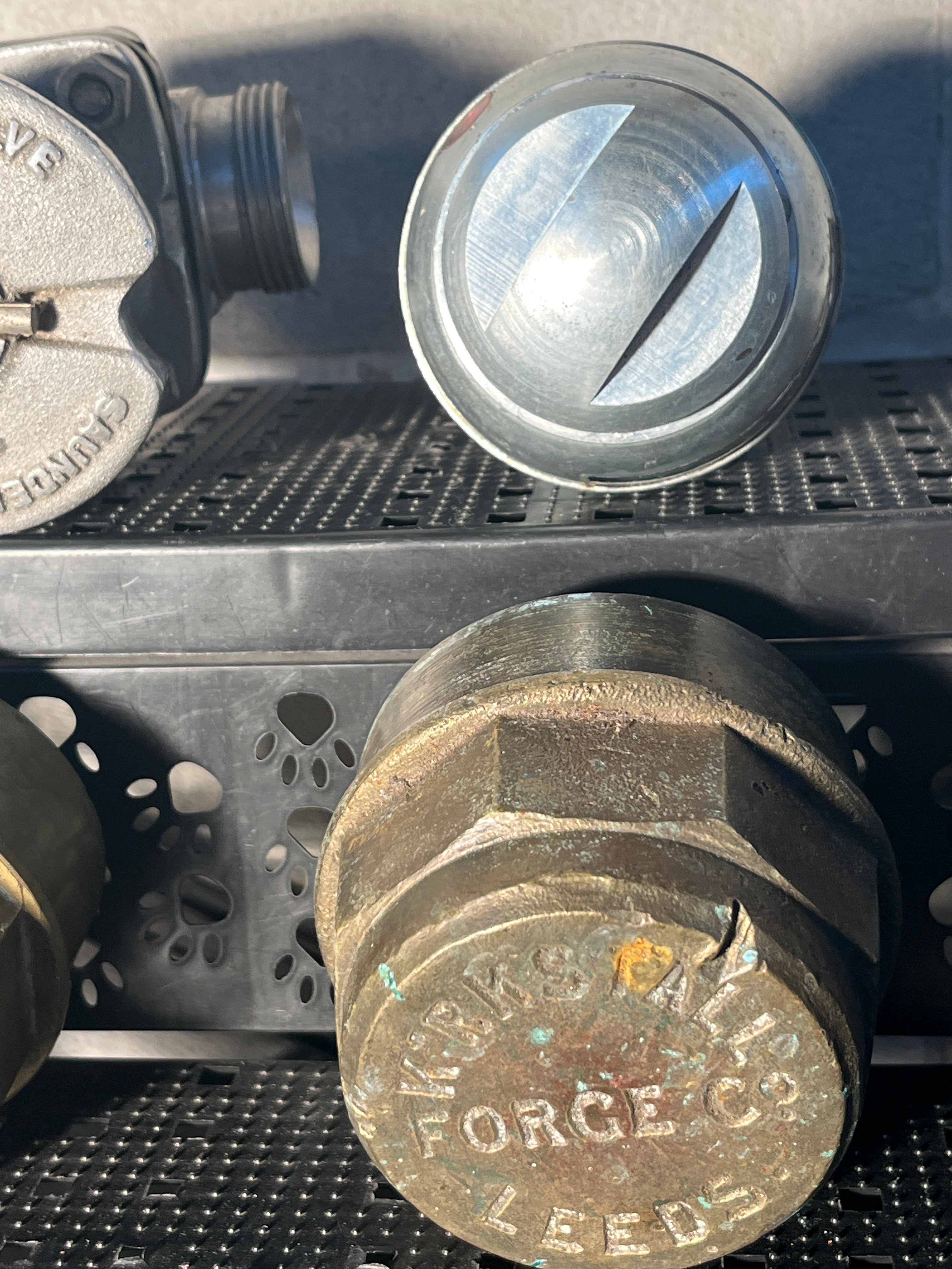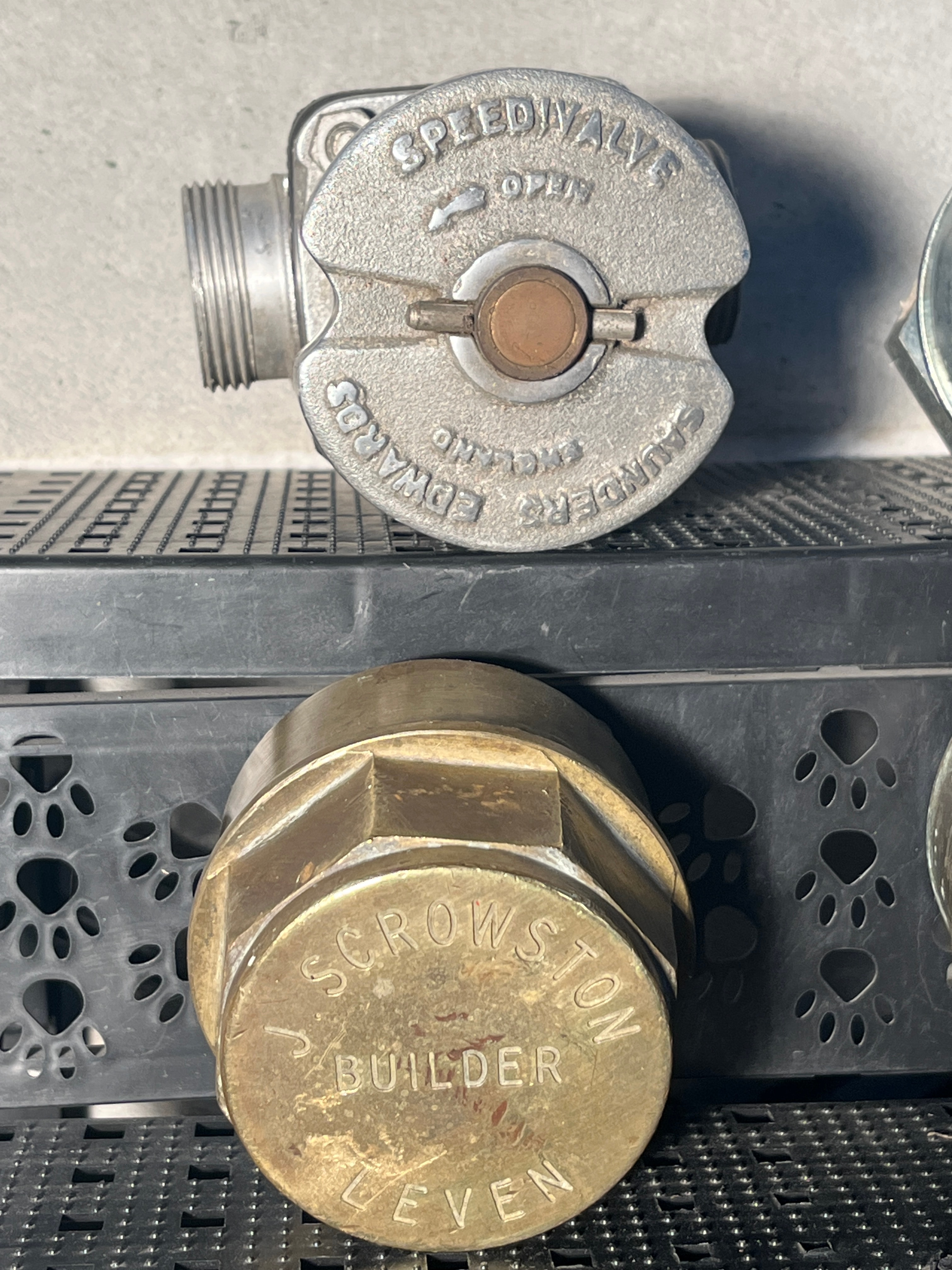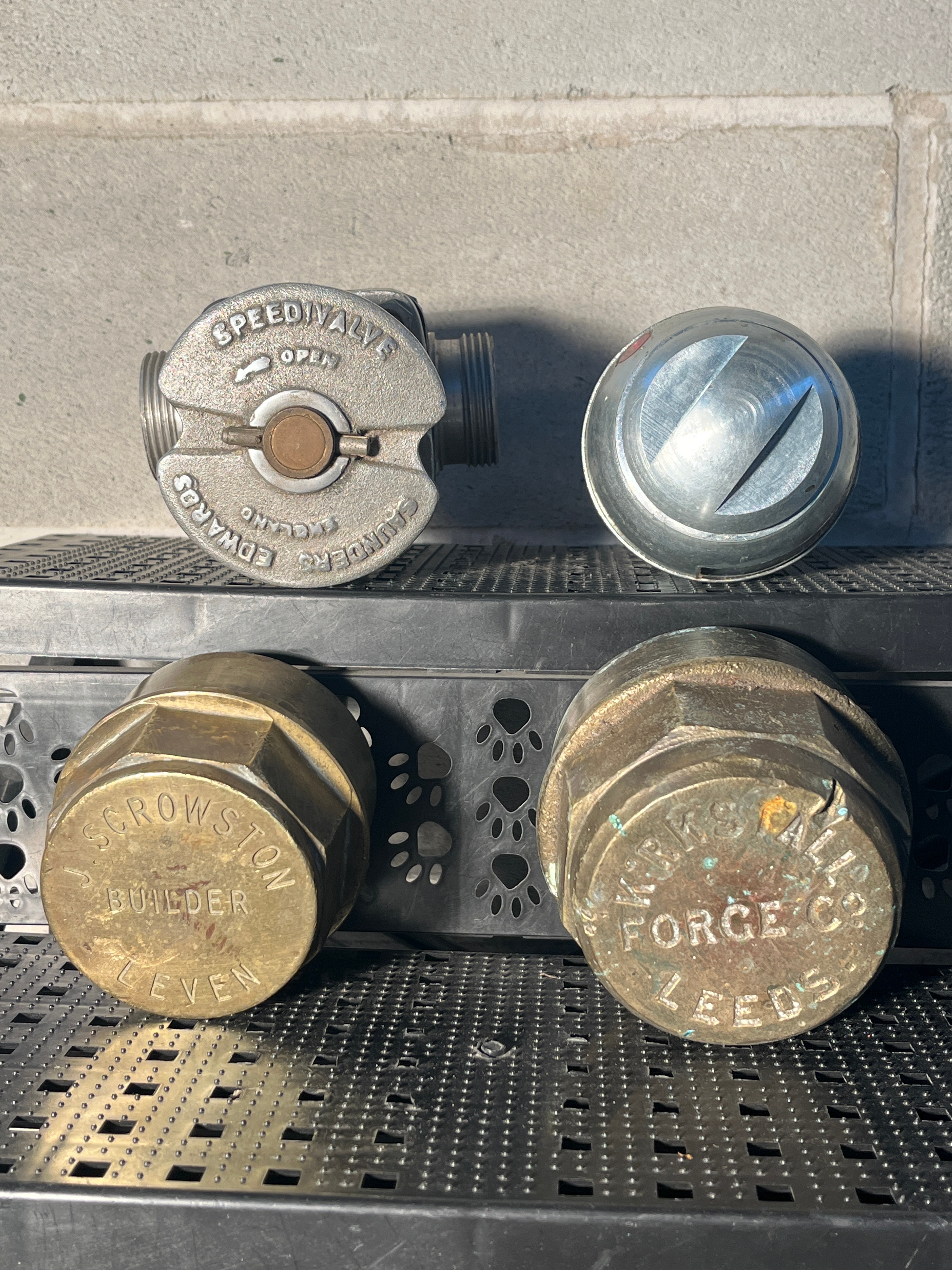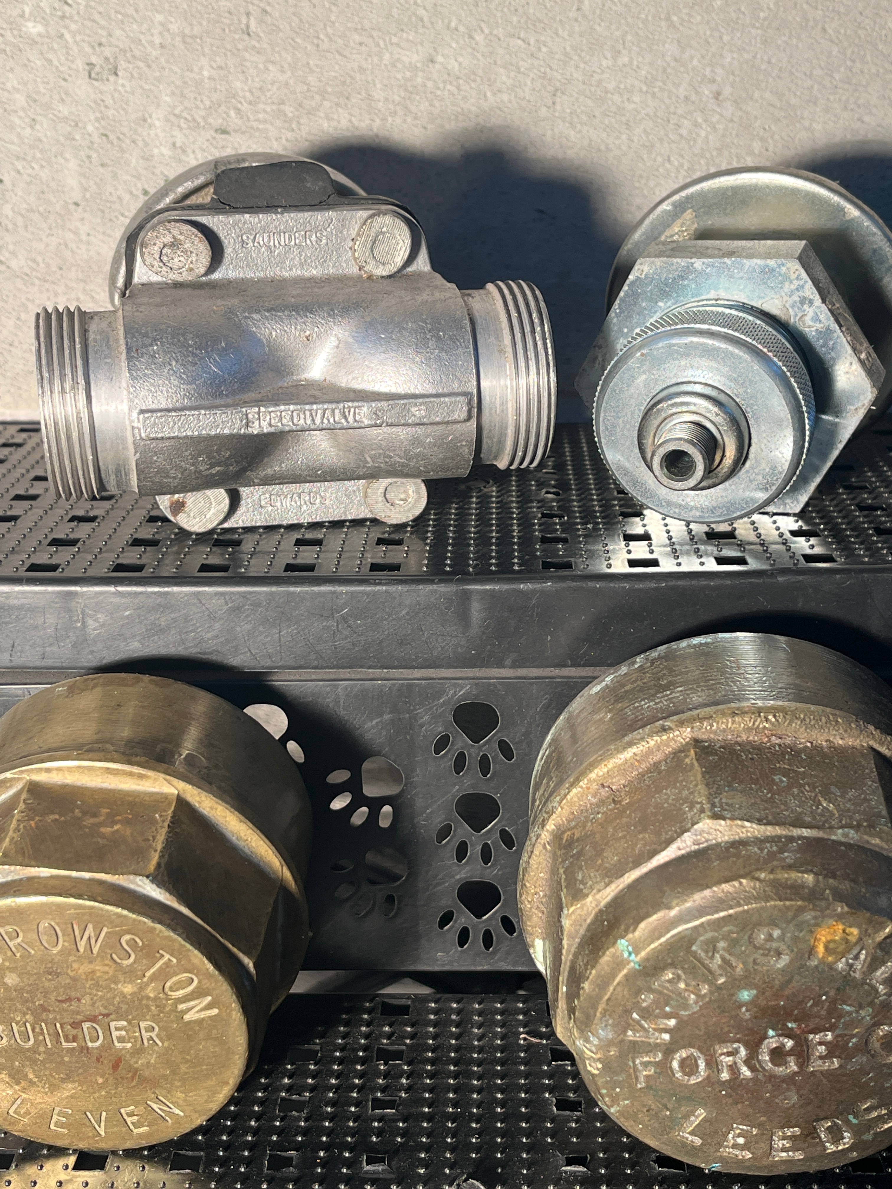 A group of four vintage industrial and automotive components. Comprising two heavy brass hexagonal caps or plugs, identified by web intelligence as vintage brass carriage wheel nuts or cart hub caps. One cap is inscribed “G. SCROWSTON,” “BUILDER,” and “LEVEN.” The second brass cap bears the markings “WORKS FALLS,” “FORGE CO,” and “LEEDS,” and is specifically identified as a brass cart hub cap for Kirkstall Forge Company. Also included is a silver-colored metal valve mechanism, likely cast aluminum or a similar alloy, featuring threaded connections and clearly marked “SPEEDVALVE,” “OPEN” with an arrow, “SAUNDERS,” “PAT. 411516,” “EDWARDS,” and “ENGLAND.” The fourth item is a silver-toned metal cap or plug, possibly steel or aluminum, characterized by a prominent flathead-style slot on its top surface and a knurled section visible on its side.