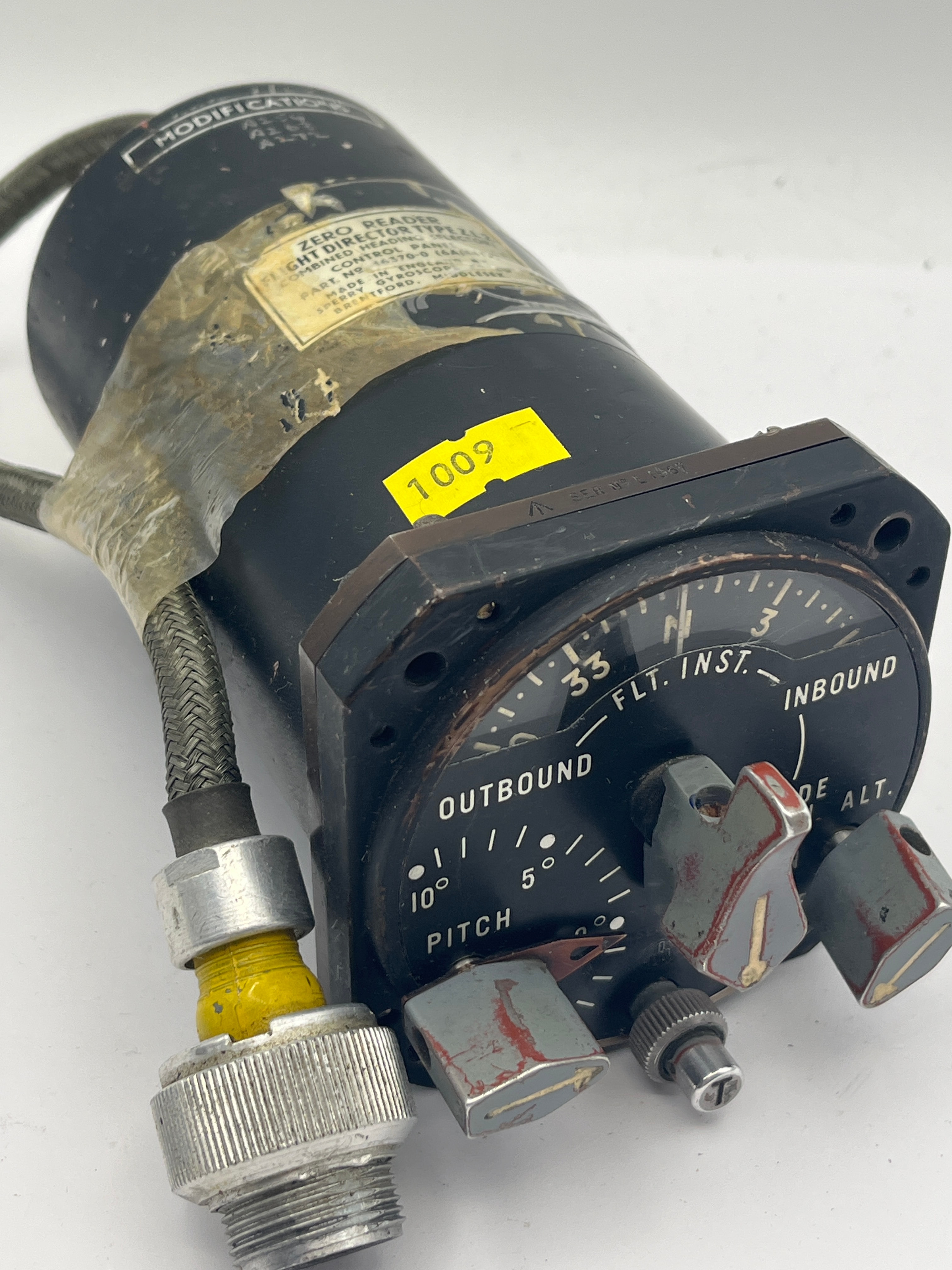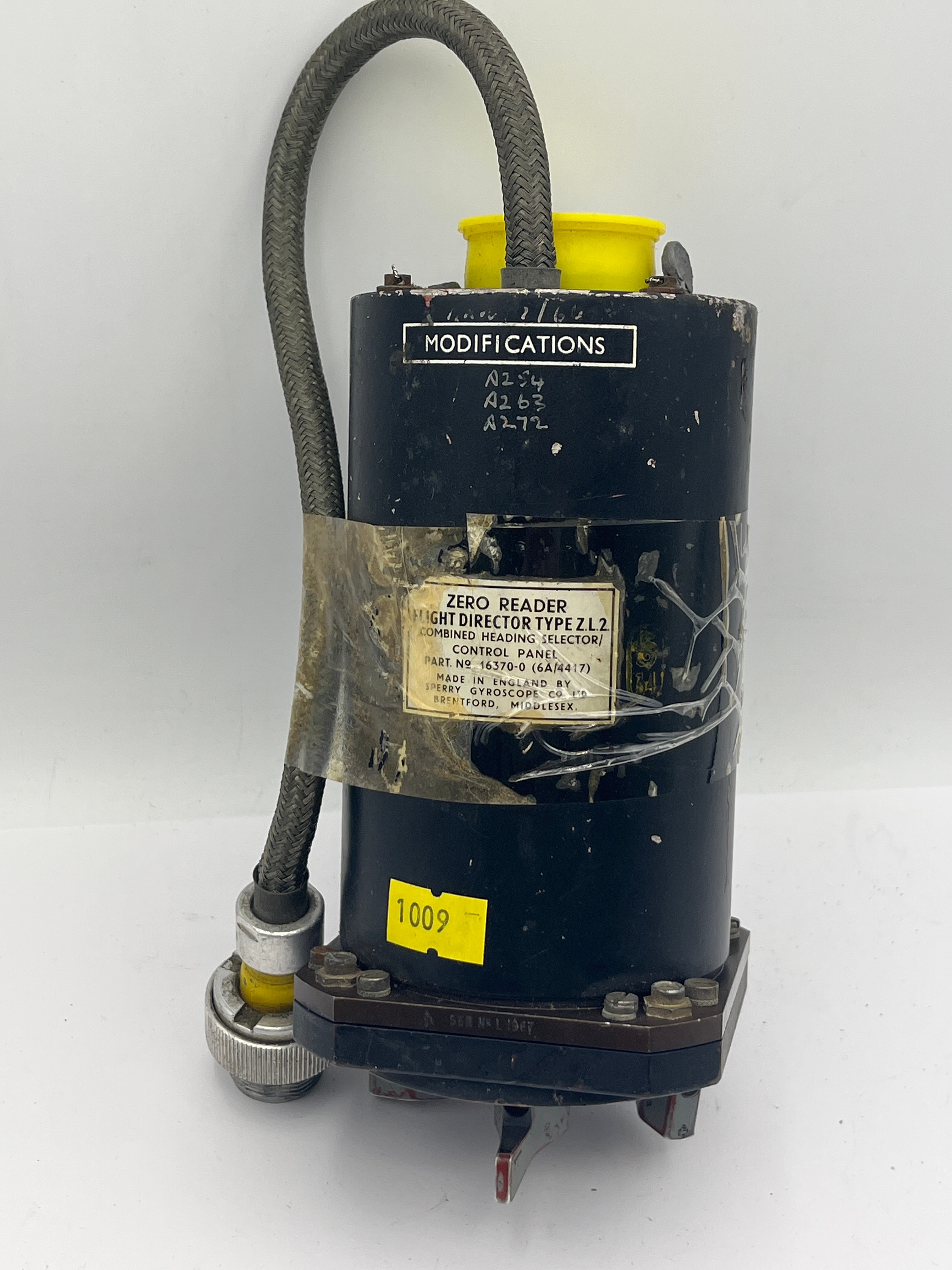 A vintage industrial-style electronic aviation instrument, identified by its label as a “ZERO READER FLIGHT DIRECTOR TYPE ZL 2” and a “COMBINED HEADING SELECTOR/CONTROL PANEL.” It was manufactured by “MINNEAPOLIS HONEYWELL REGULATOR CO., AERONAUTICAL DIVISION,” and bears the visible part number “P.R. NO. 16370-0 (6A/M417).” The instrument is primarily constructed of a black-painted cylindrical metal body, from which a flexible, braided hose extends to a threaded metal connector. A “MODIFICATIONS” label with handwritten numbers “A254, A263, A272” is present, alongside a yellow sticker marked “1009.” The lower section of the body transitions into a control panel featuring a circular dial marked with cardinal directions such as “N,” “33,” “3,” and operational indicators including “FLT. INST.,” “INBOUND,” “OUTBOUND,” “10°,” “5°,” and “PITCH.” The panel is further equipped with three toggle-style control knobs and one smaller knurled knob.