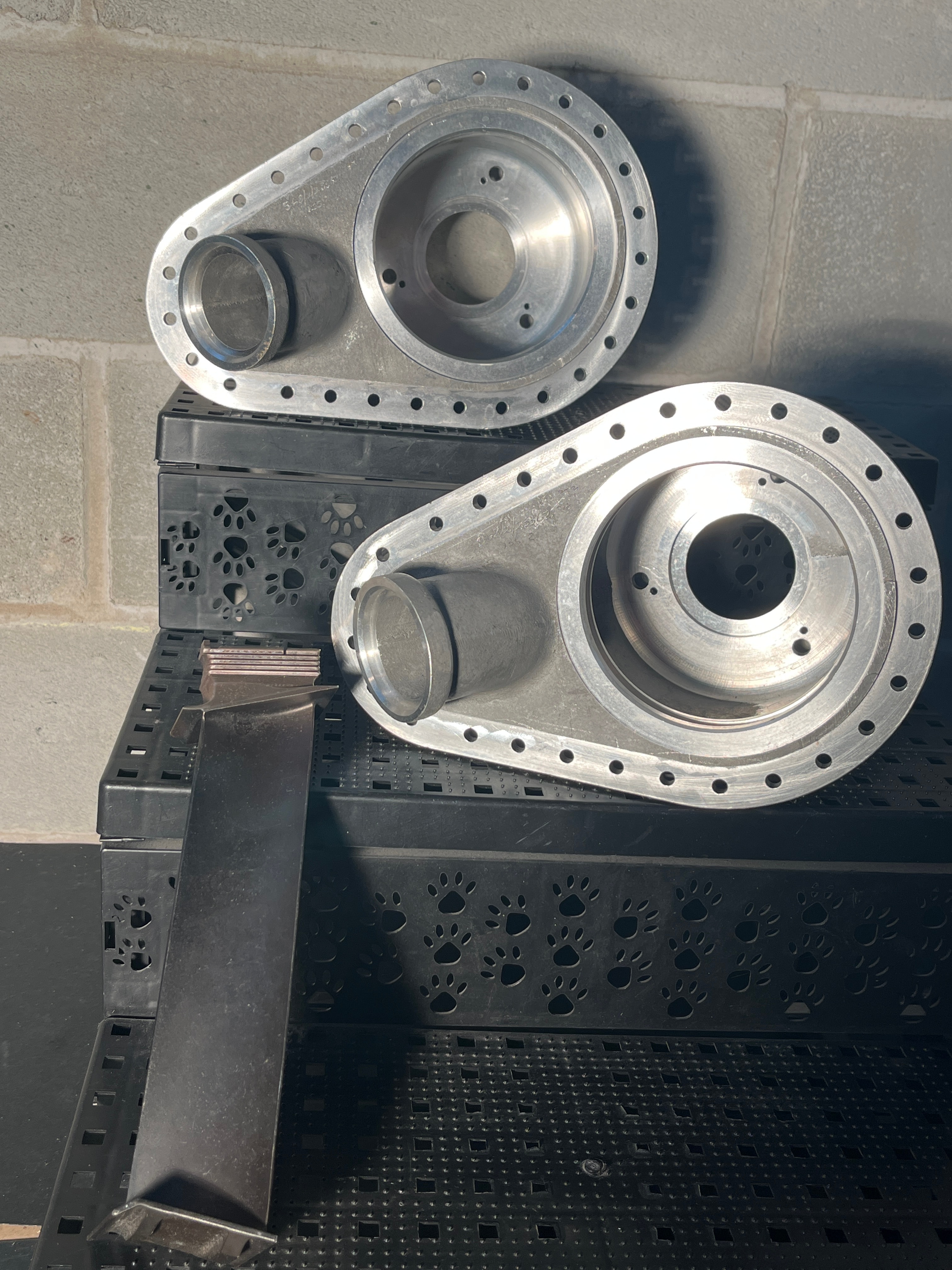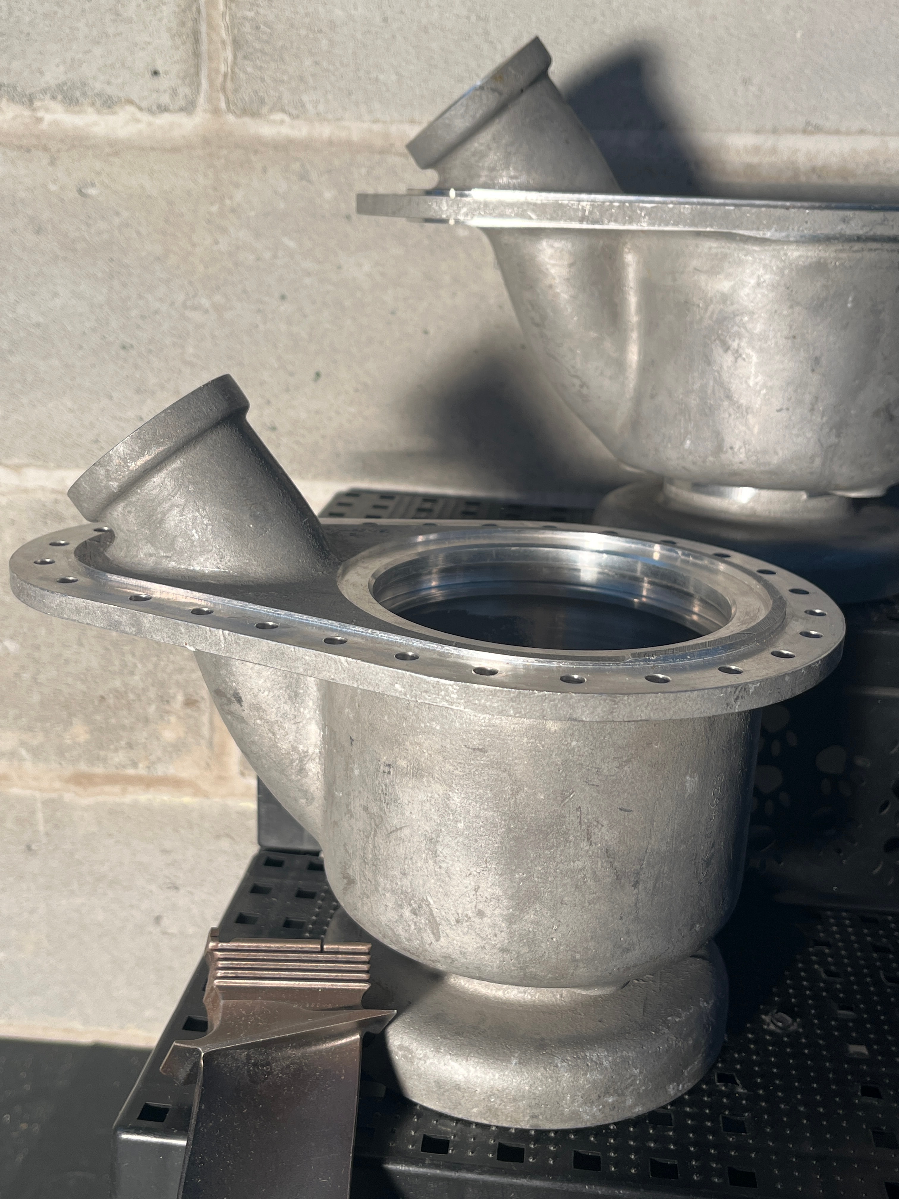 A pair of 89513 Combustion Air Blower Housing Units. Each unit is constructed from cast aluminum or an aluminum alloy. They feature a prominent circular flange with numerous bolt holes surrounding a large, precision-machined central opening, and an integral, angled cylindrical nozzle or pipe extending from one side. One unit bears the alphanumeric code ‘S-17189A’.