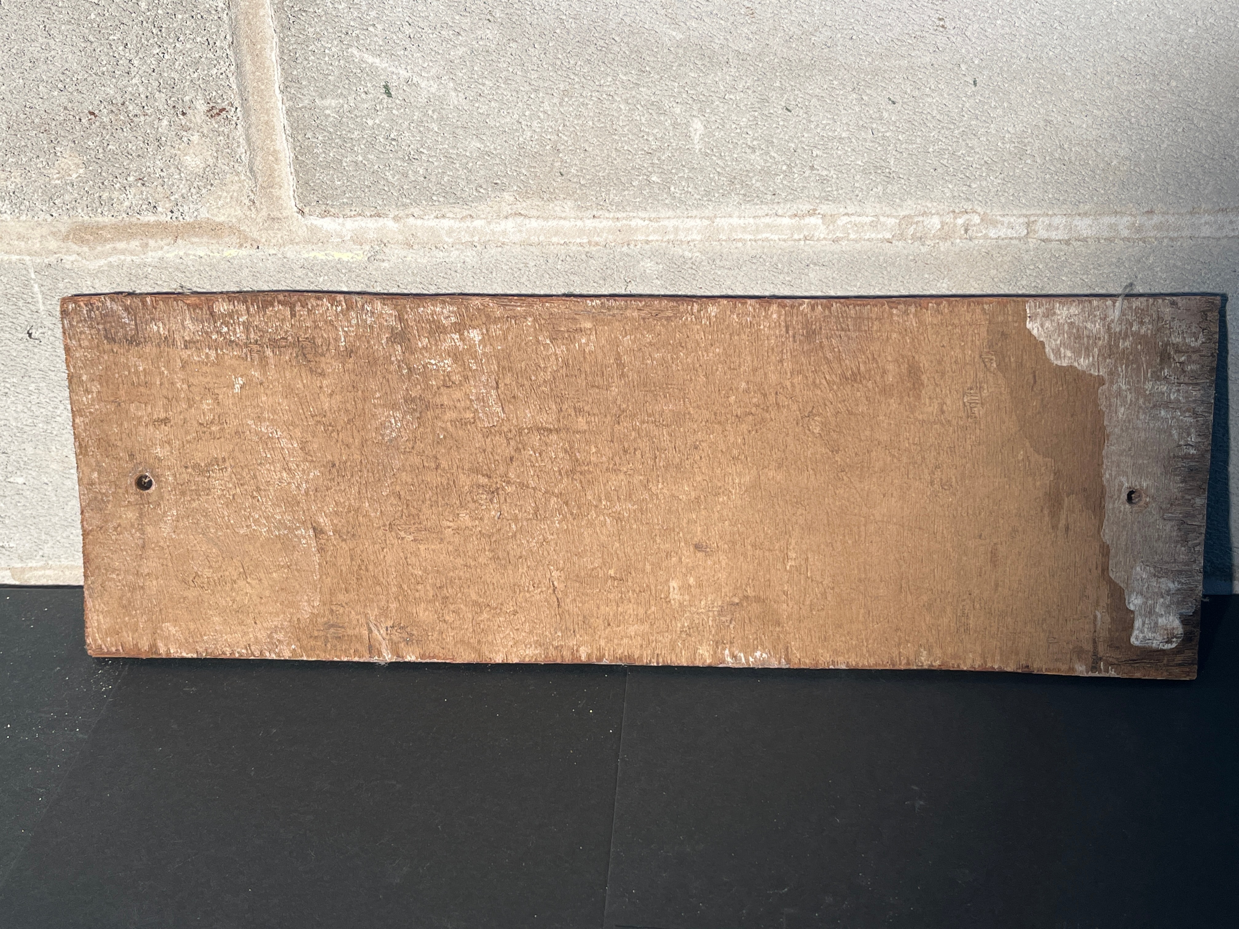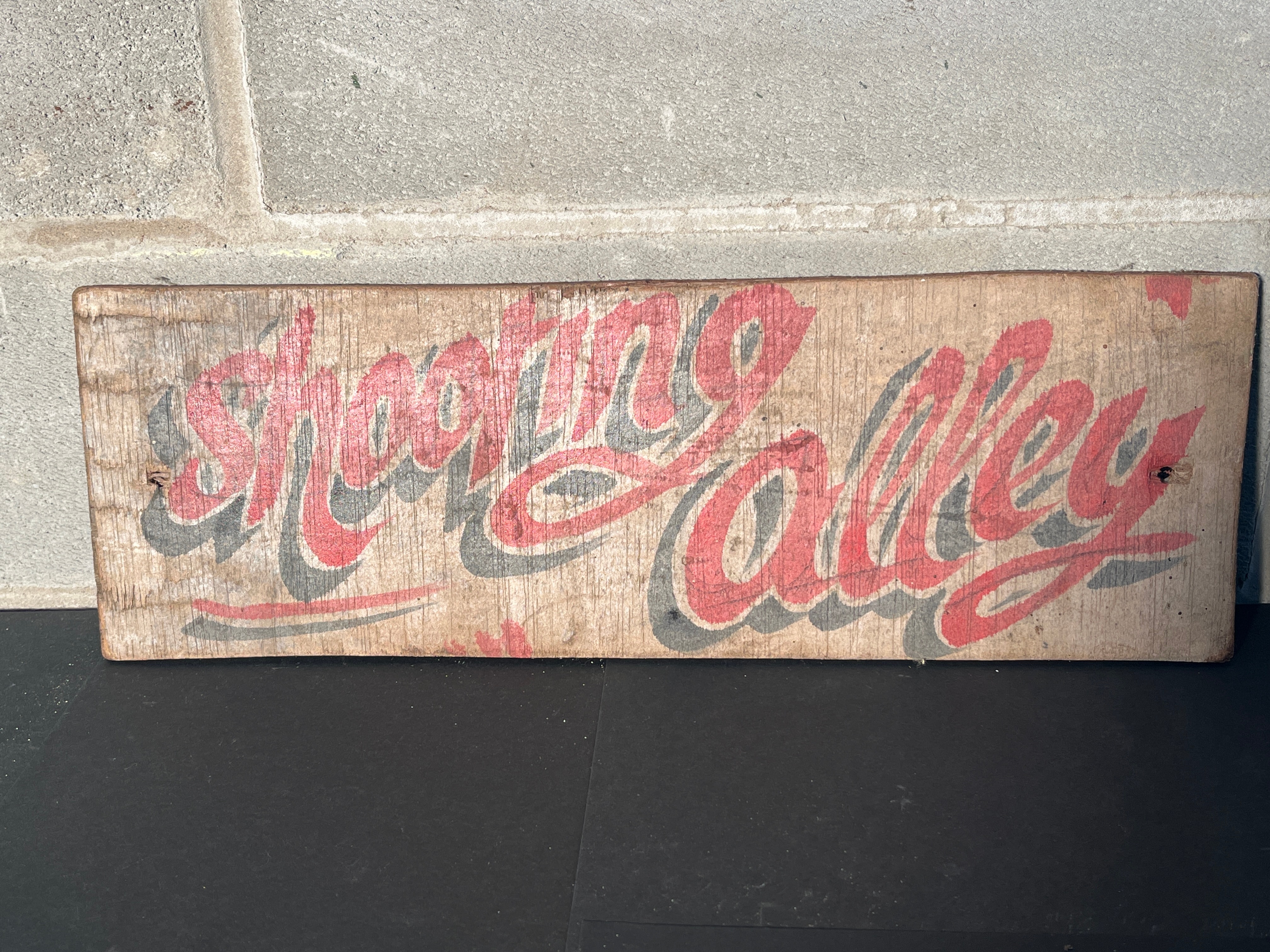 A rectangular, hand-painted wooden sign featuring the English text “Shooting Alley” rendered in a stylized red script with a gray drop shadow, indicative of a vintage, likely early to mid-20th-century carnival or arcade aesthetic. Constructed from a single plank of unfinished wood.