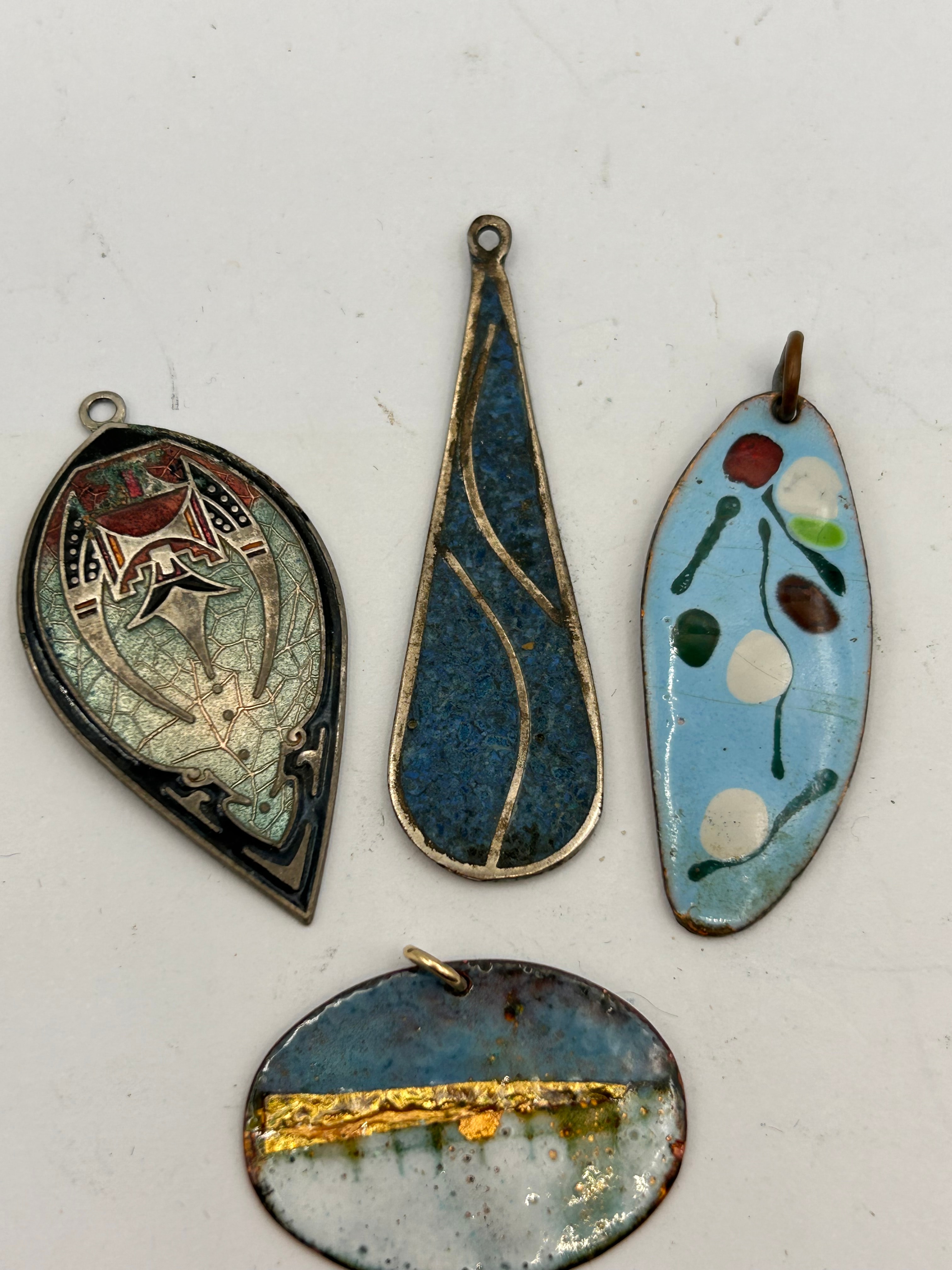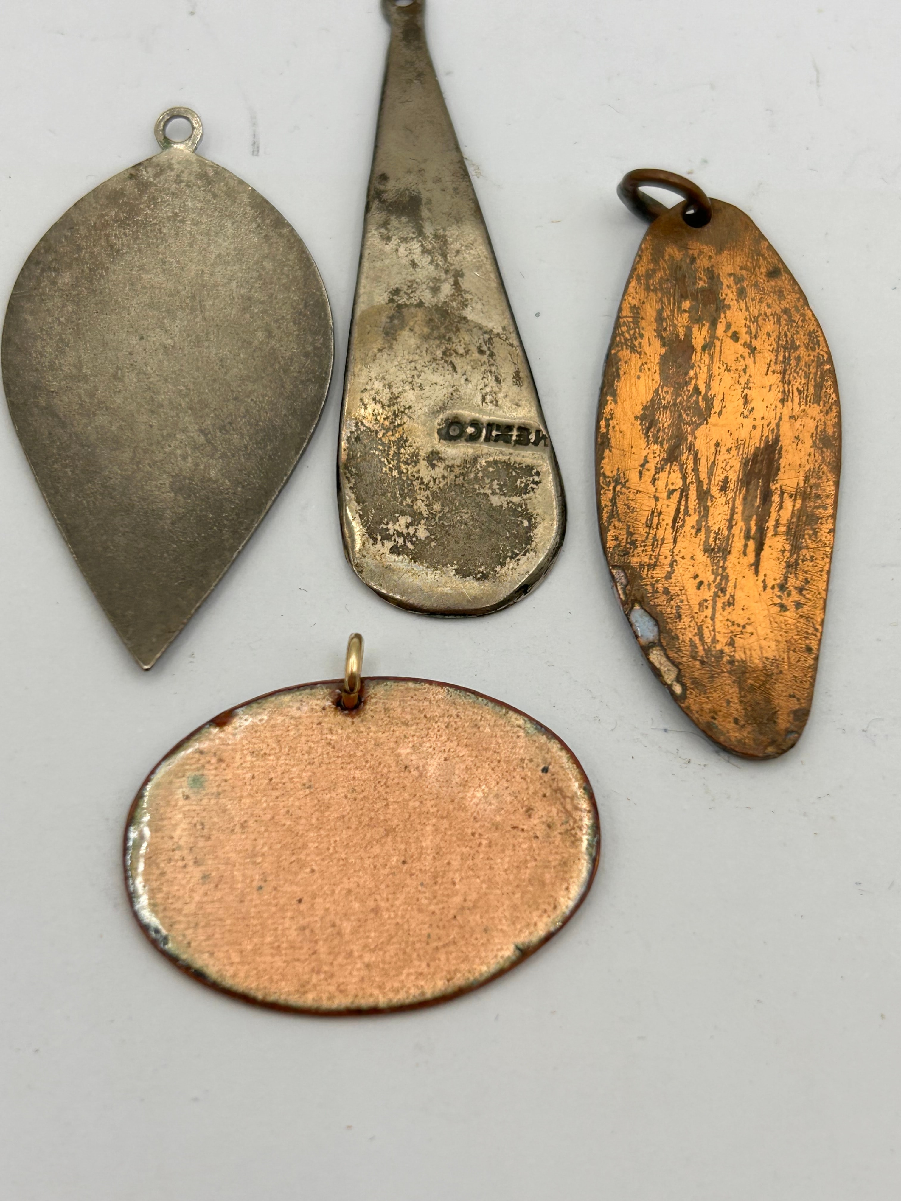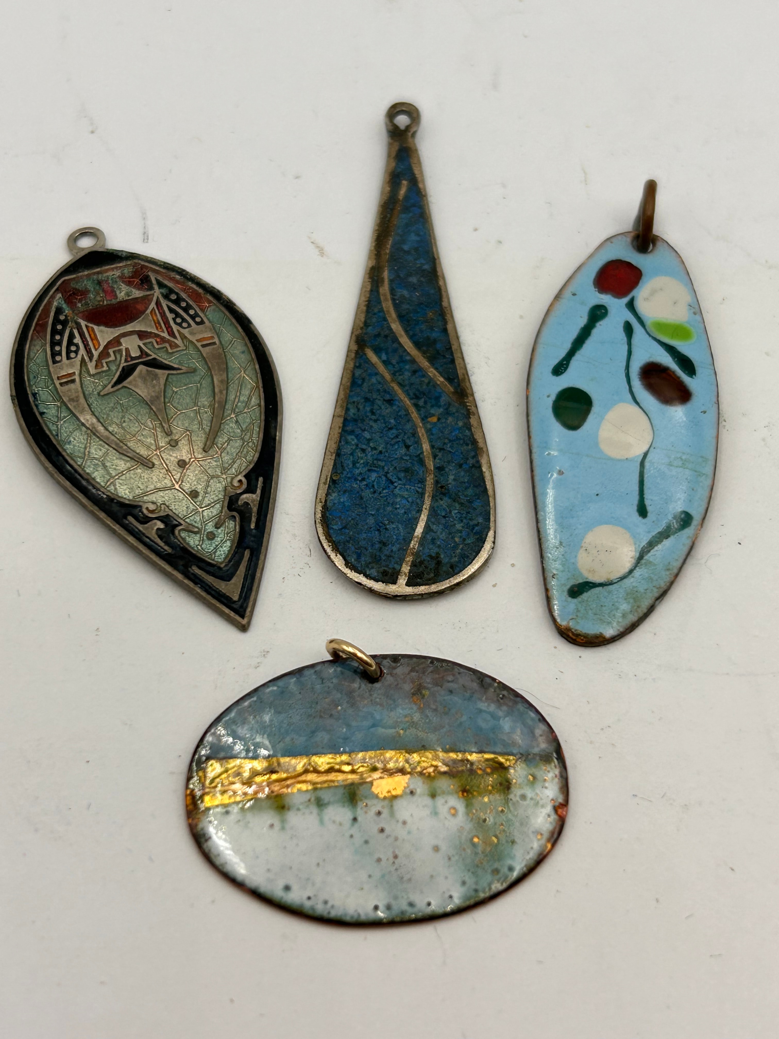 A group of four distinct metal pendants. The elongated teardrop pendant features sterling silver framing crushed blue turquoise material, marked ‘MEXICO’ on its reverse. The top-left teardrop-shaped pendant features cloisonné-style enamel depicting an abstract bird-like motif in teal, red, and black on a metallic ground. The oval-leaf shaped pendant has a light blue enamel base adorned with abstract red, green, white, and brown dots, with a copper reverse. The oval pendant displays an abstract design with a horizontal gold-tone metallic band over a gradient of white, blue, and rust-colored enamel, also revealing a copper reverse.